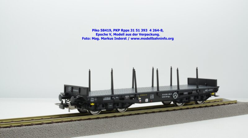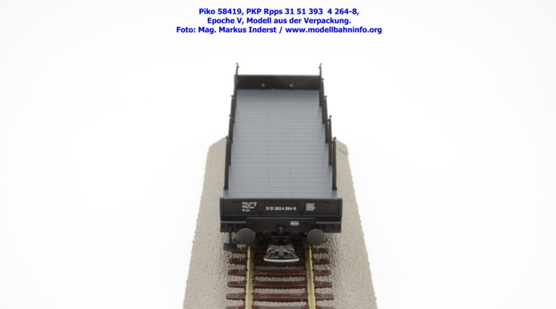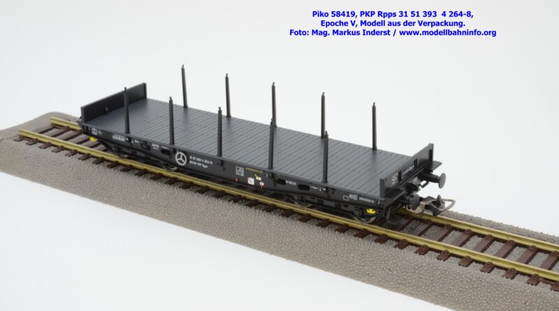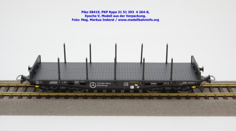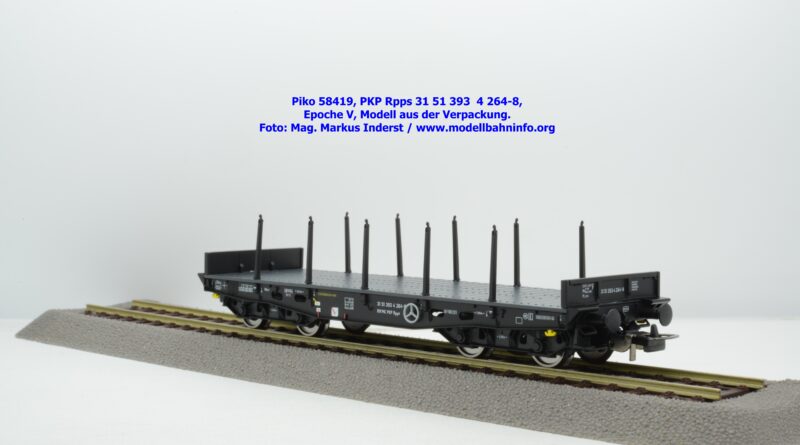Mit diesem Modell erscheint eine weitere Nummernwagen dieses PKP-Rungenwagens. Der als Rpps bezeichnete Vierachser ist mit der Wagennummer 31 51 393 4 264-8 bedruckt. Im Revisionsraster stehen die Angaben 3 REV L 04.12.95. Das Modell wird zum UVP von € 51,99 angeboten.
