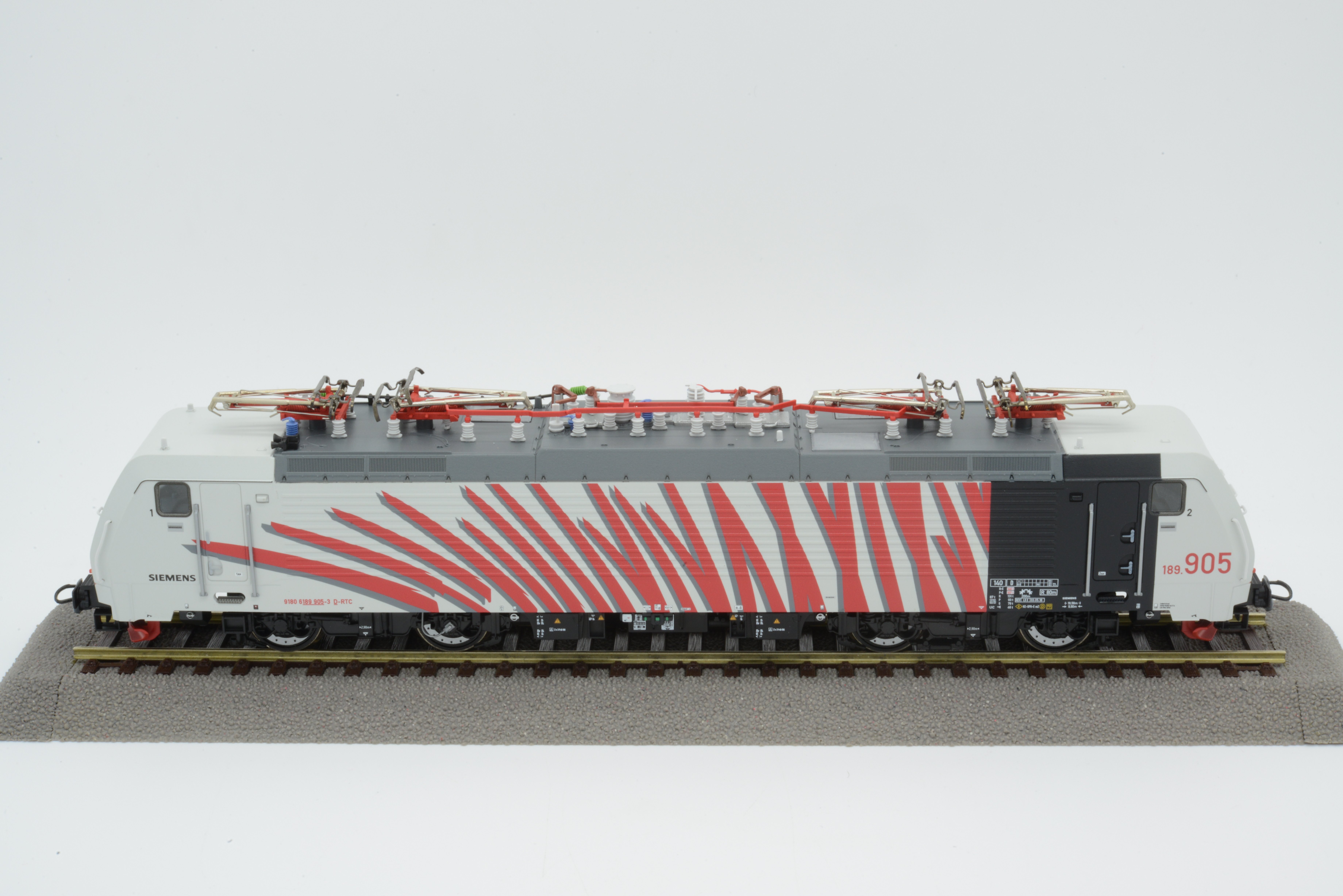Das gegenständliche Modell der 189 927 von Lomo ist sauber lackiert und bedruckt und fällt vor allem durch die aufgefächerten Zebra-Streifen an den Seitenwänden der Maschine auf. Diese sind in hellgrauer Farbgebung über die Sicken des Lokkasten tadellos ausgeführt. Die vollständige Lokanschrift besteht aus folgenden Angaben: 91 80 6189-927-7-D-DISPO Class 189-VD bzw. der LZB-Nummer 189-927-7. Die Revisionsanschriften der Lok lauten auf MH 20.07.12.