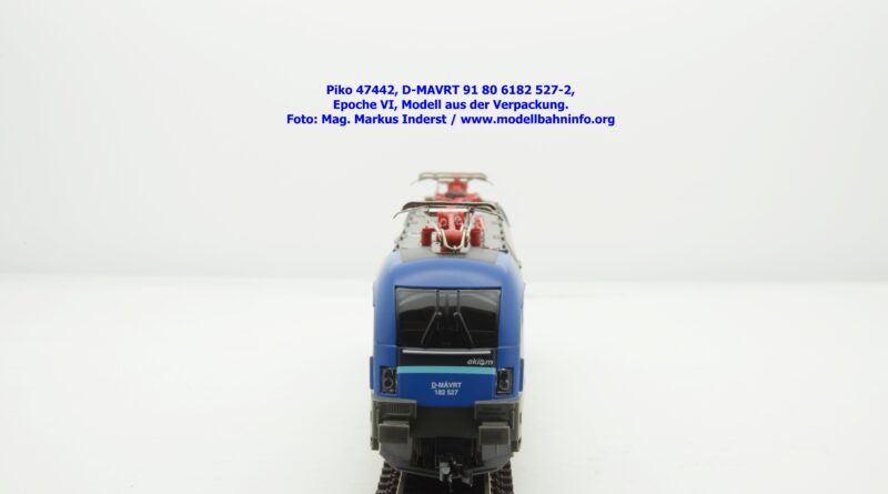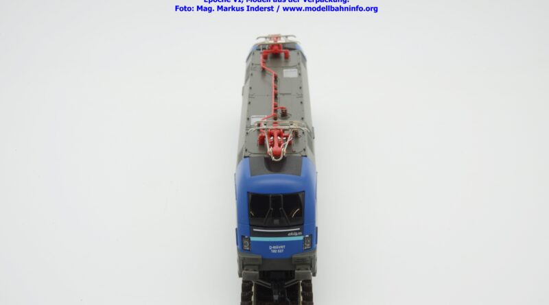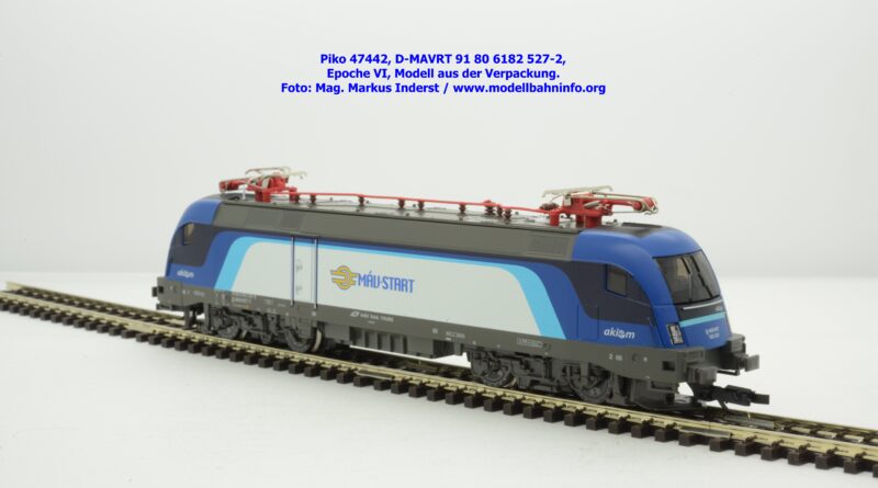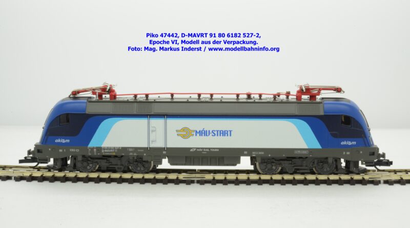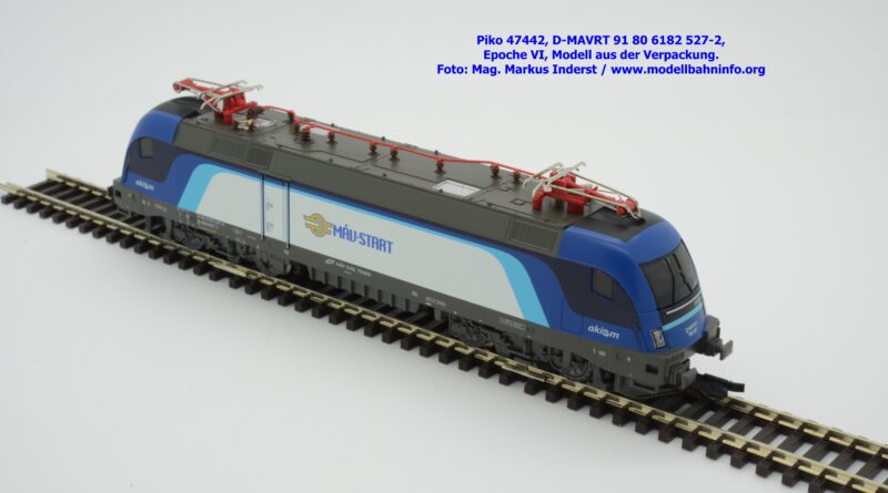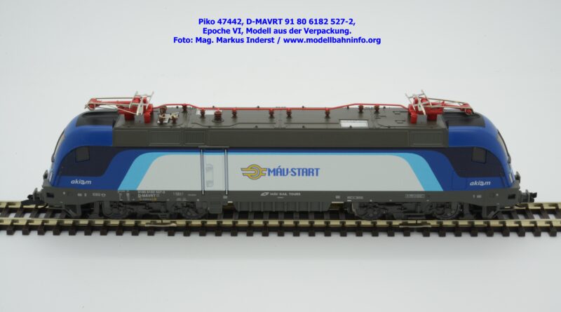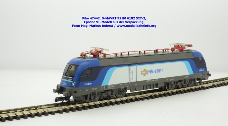 Die ungarische Staatsbahn MAV hat mehrere Tauri von AKIEM angemietet und setzt diese im grenzüberschreitenden Verkehr nach Österreich ein. Die Loks fallen durch das neue Design von MAV START mit den Farben Dunkelblau, Schwarz, hellblau und weiß auf, wobei der Rahmen, das Dach und die Drehgestelle auch weiterhin umbragrau lackiert sind. Das neue Modell von MAV START ist mit den Fahrzeuganschriften D-MAVRT 91 80 6182 527-2 und mit den Revisionsanschriften REV Lz 20.07.02. bedruckt, wobei das Jahr 2002 wohl nicht korrekt sein kann. Das Modell ist mit der TT-Kurzkupplung ausgestattet. Der UVP beträgt € 123,–.