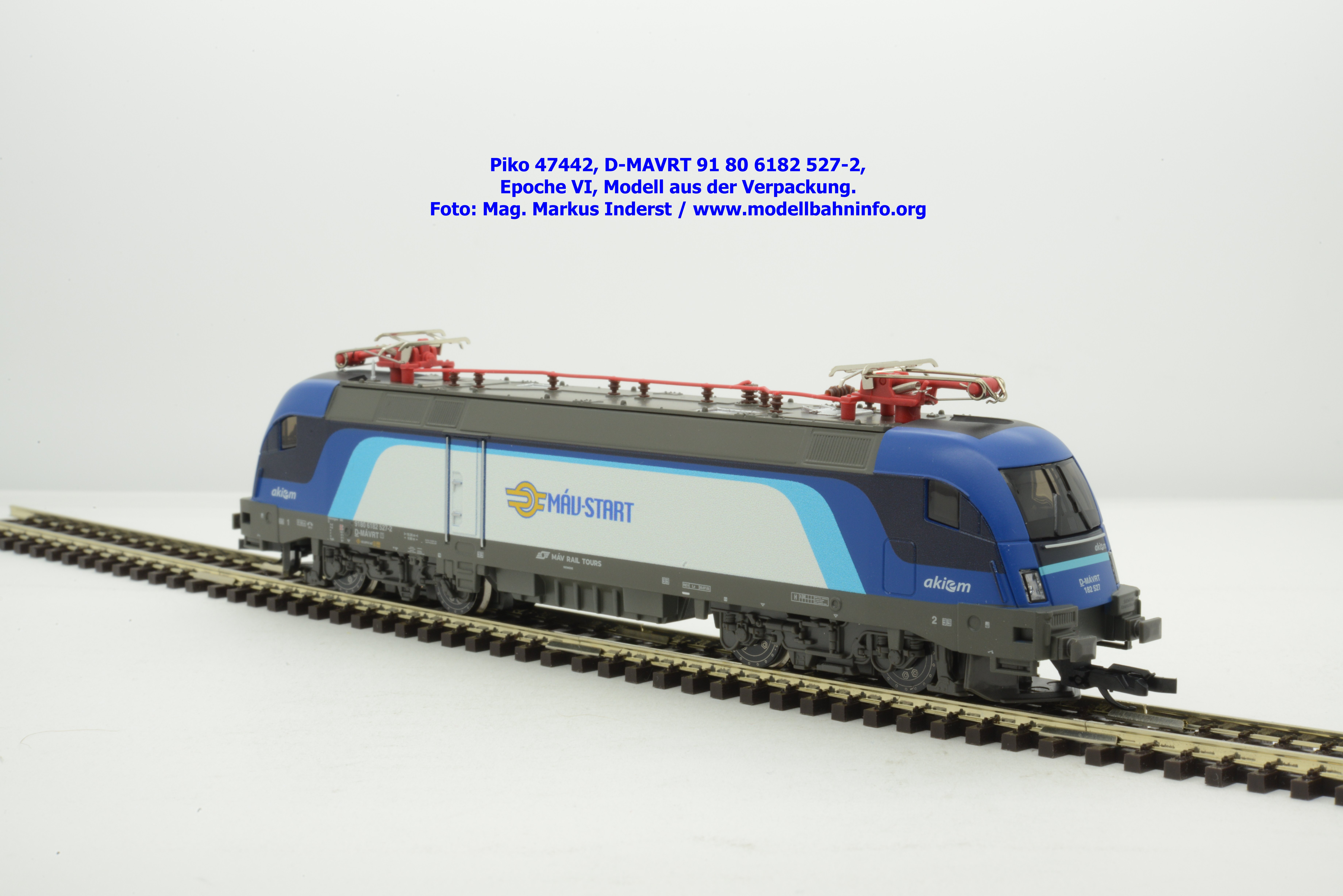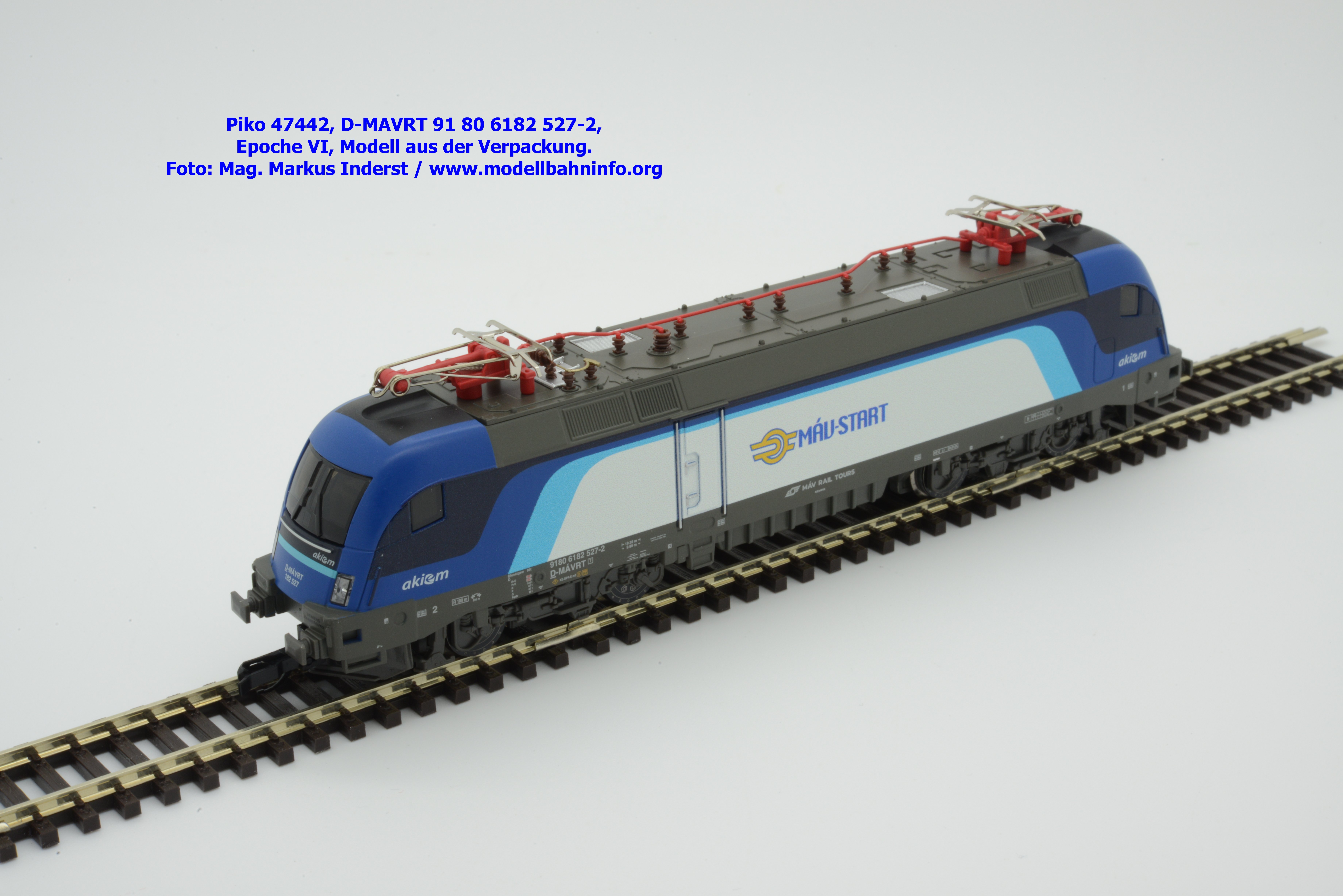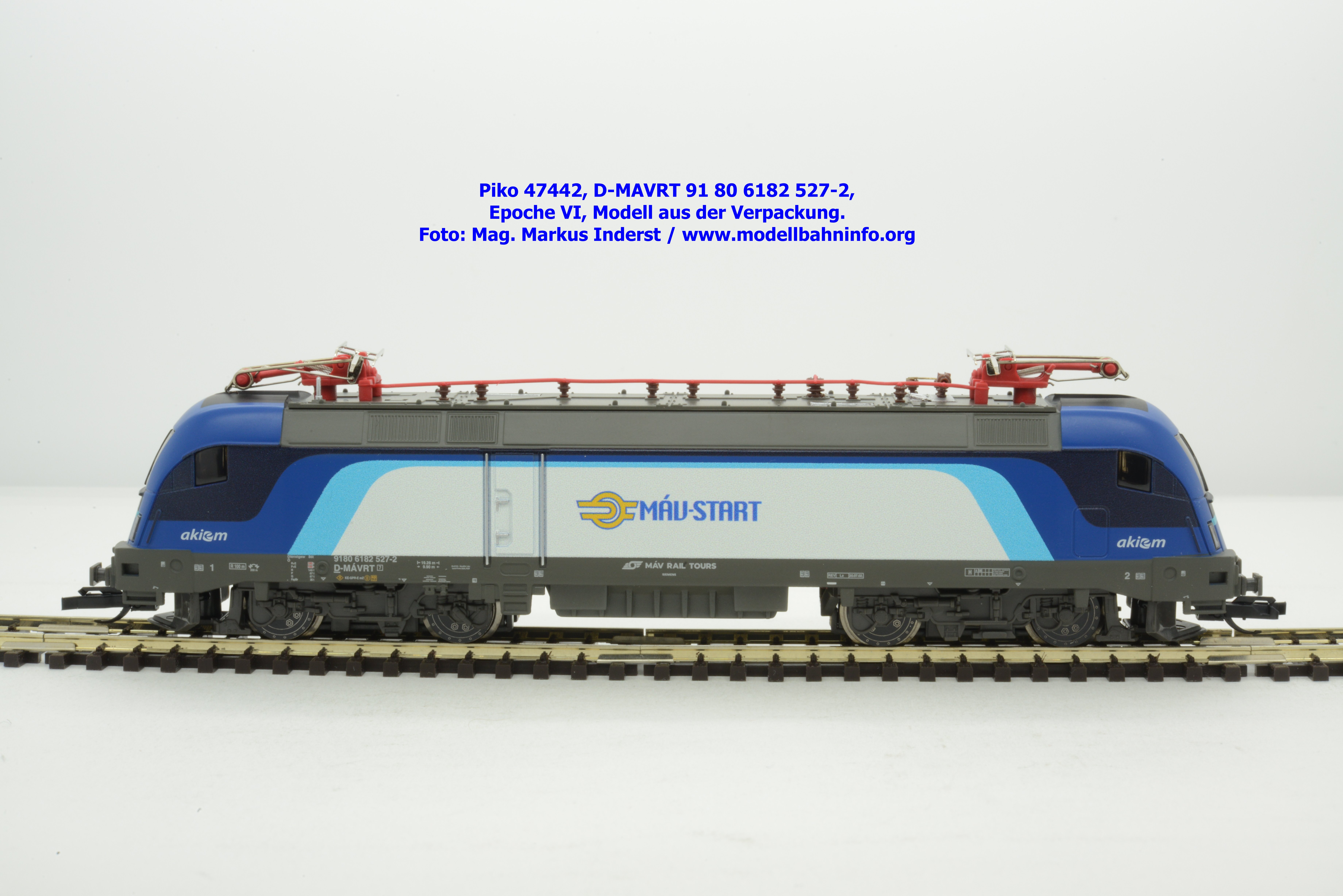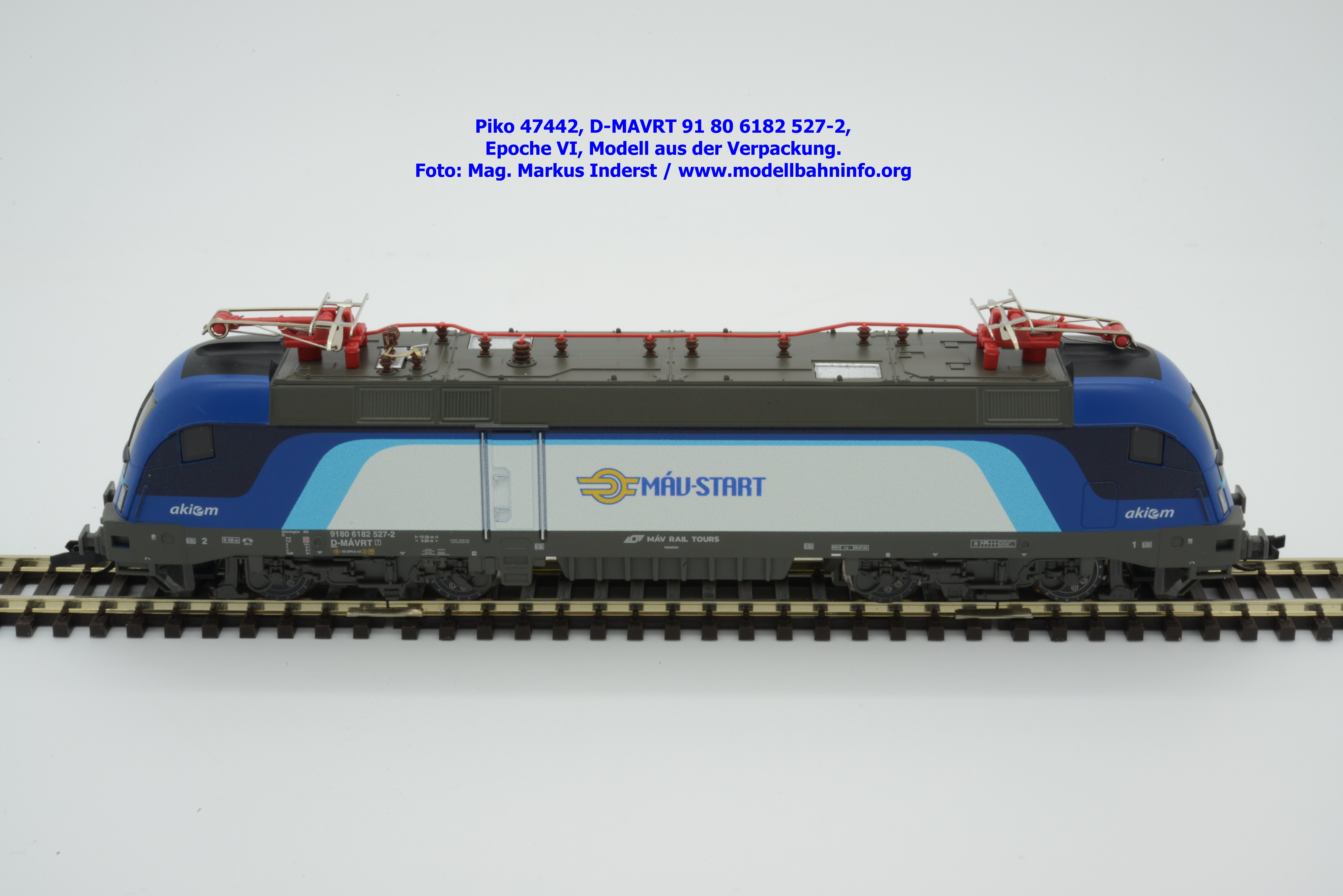 Die ungarische Staatsbahn MAV hat mehrere Tauri von AKIEM angemietet und setzt diese im grenzüberschreitenden Verkehr nach Österreich ein. Die Loks fallen durch das neue Design von MAV START mit den Farben Dunkelblau, Schwarz, hellblau und weiß auf, wobei der Rahmen, das Dach und die Drehgestelle auch weiterhin umbragrau lackiert sind. Das neue Modell von MAV START ist mit den Fahrzeuganschriften D-MAVRT 91 80 6182 527-2 und mit den Revisionsanschriften REV Lz 20.07.02. bedruckt, wobei das Jahr 2002 wohl nicht korrekt sein kann. Das Modell ist mit der TT-Kurzkupplung ausgestattet. Der UVP beträgt € 123,–.