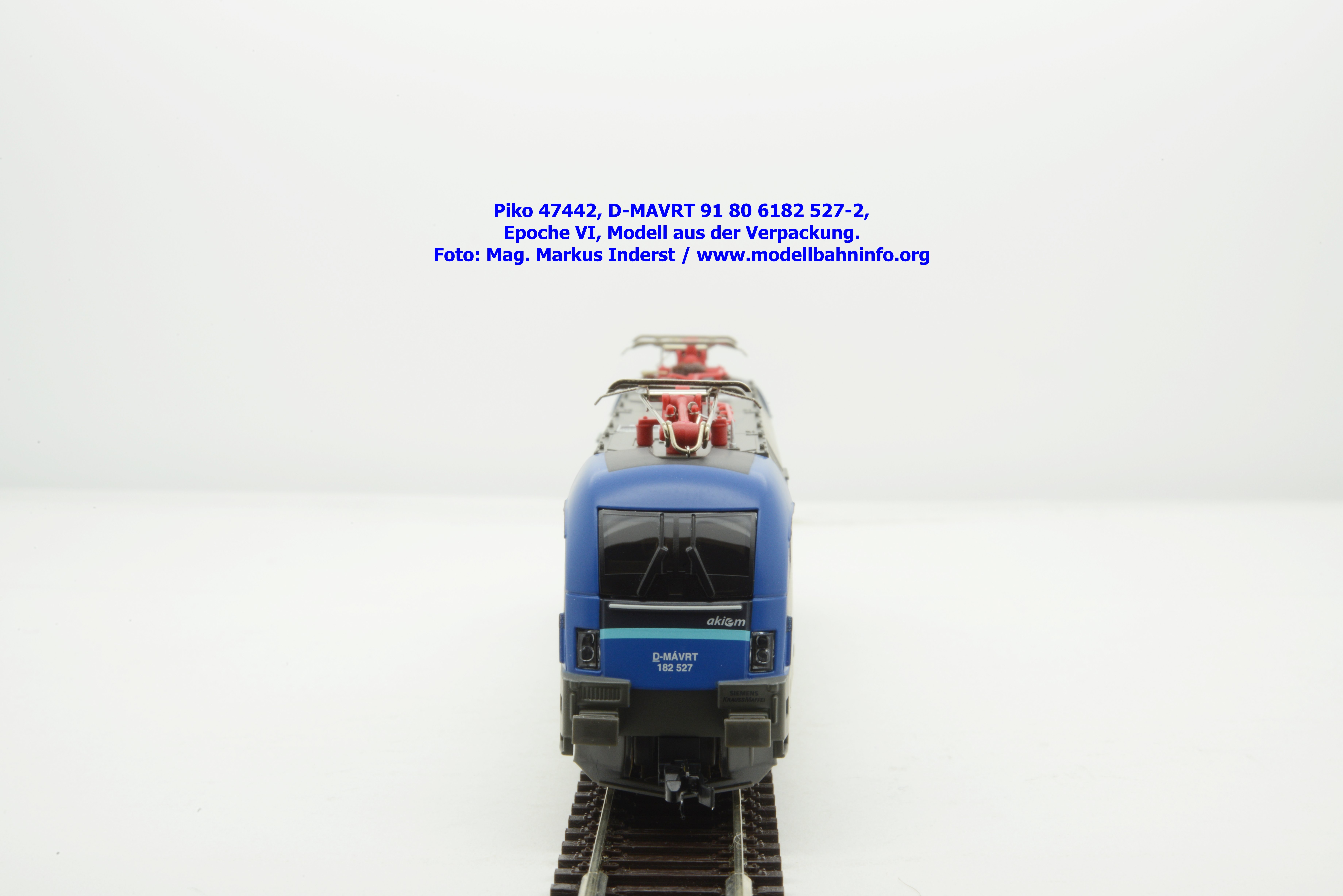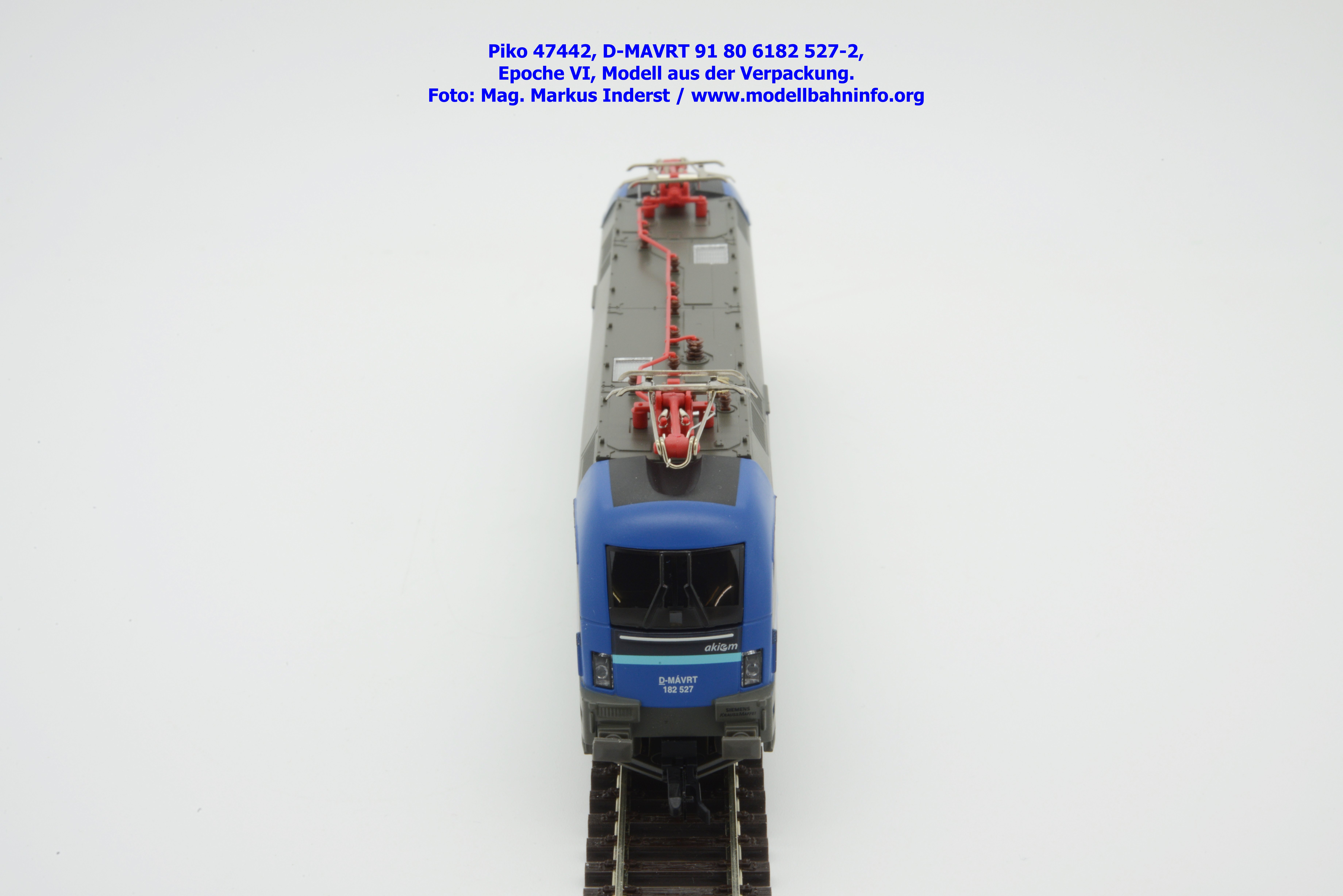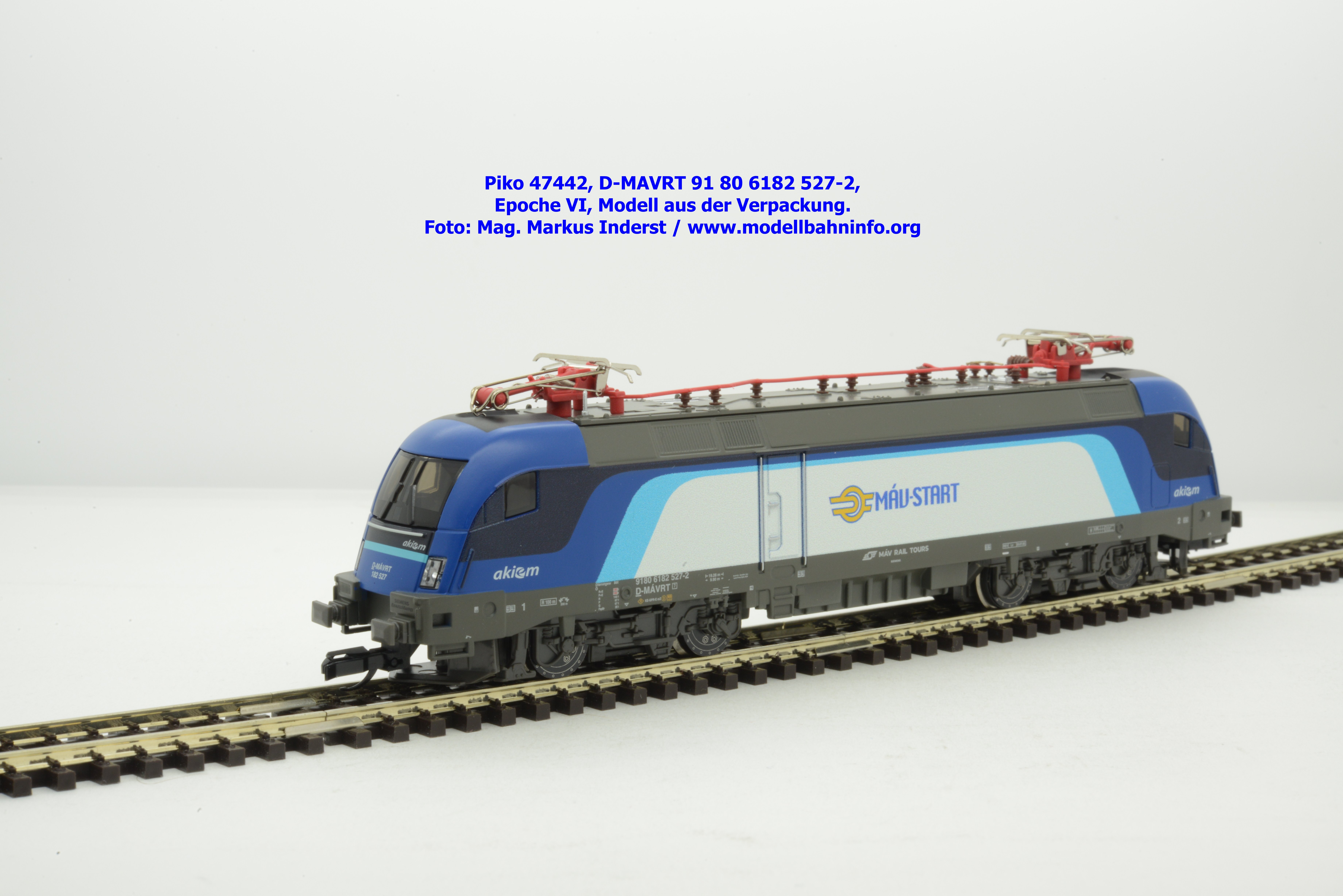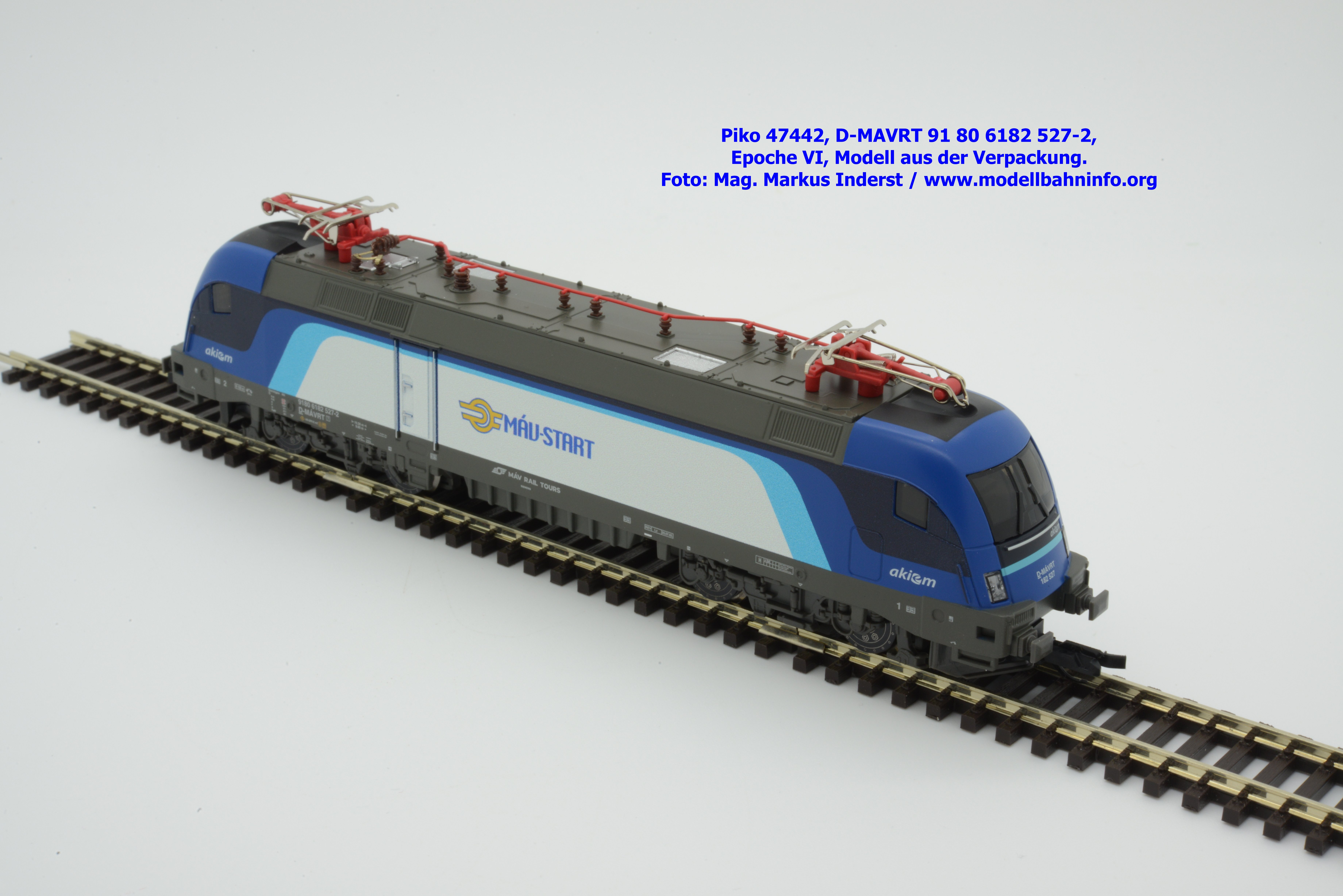Die ungarische Staatsbahn MAV hat mehrere Tauri von AKIEM angemietet und setzt diese im grenzüberschreitenden Verkehr nach Österreich ein. Die Loks fallen durch das neue Design von MAV START mit den Farben Dunkelblau, Schwarz, hellblau und weiß auf, wobei der Rahmen, das Dach und die Drehgestelle auch weiterhin umbragrau lackiert sind. Das neue Modell von MAV START ist mit den Fahrzeuganschriften D-MAVRT 91 80 6182 527-2 und mit den Revisionsanschriften REV Lz 20.07.02. bedruckt, wobei das Jahr 2002 wohl nicht korrekt sein kann. Das Modell ist mit der TT-Kurzkupplung ausgestattet. Der UVP beträgt € 123,–.