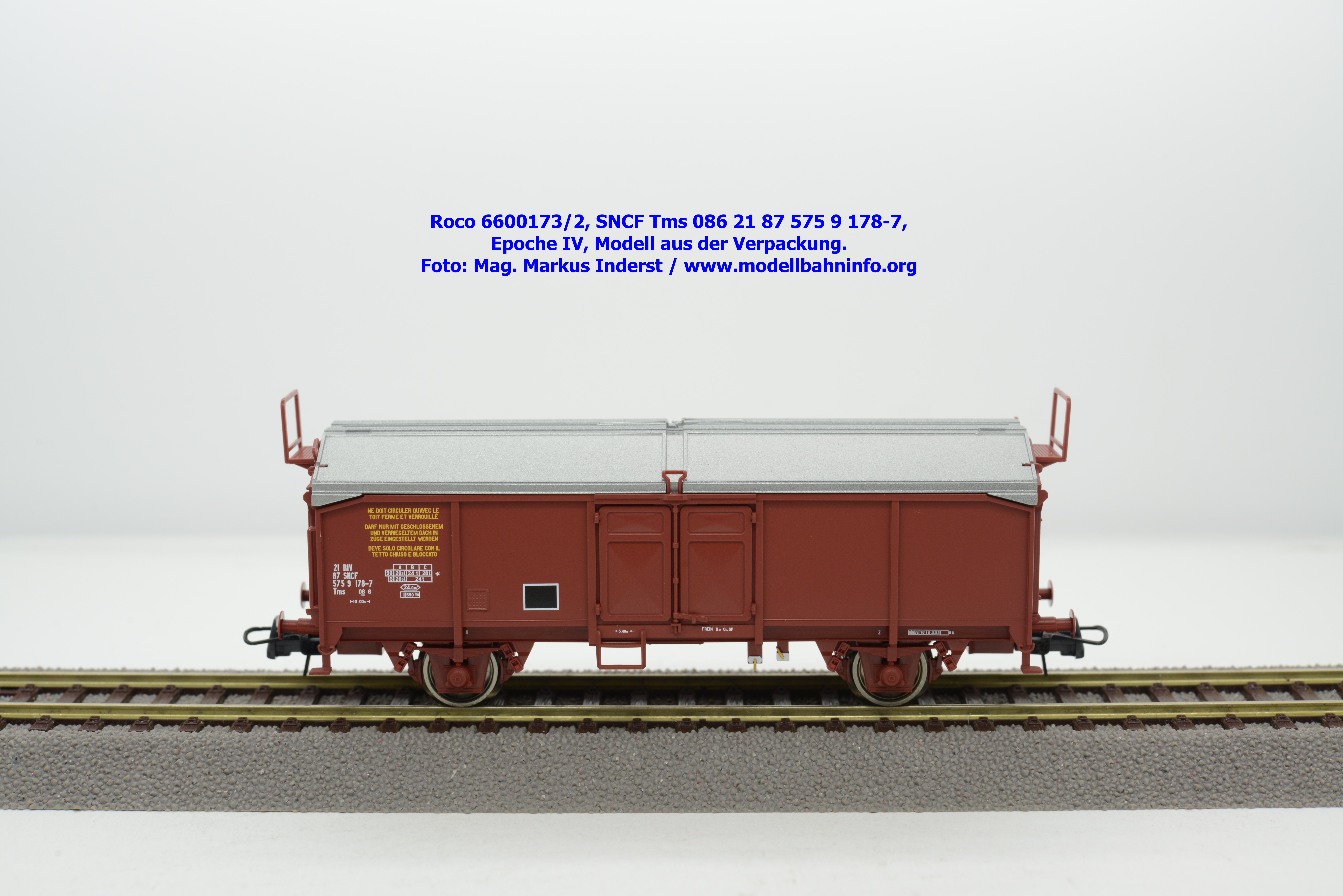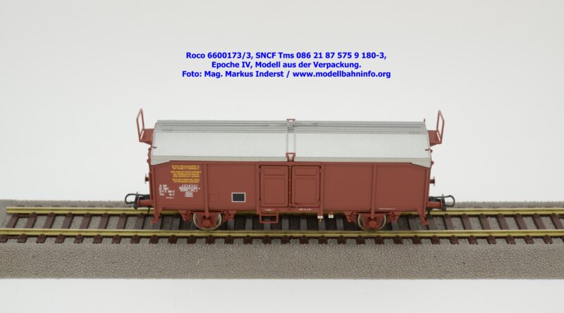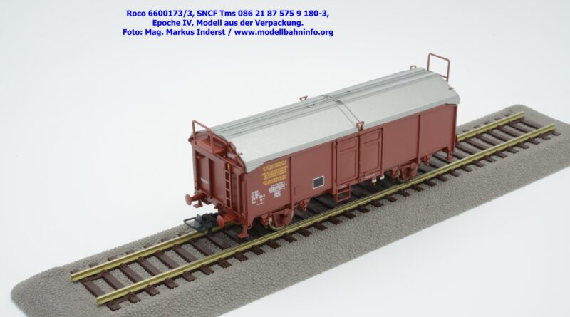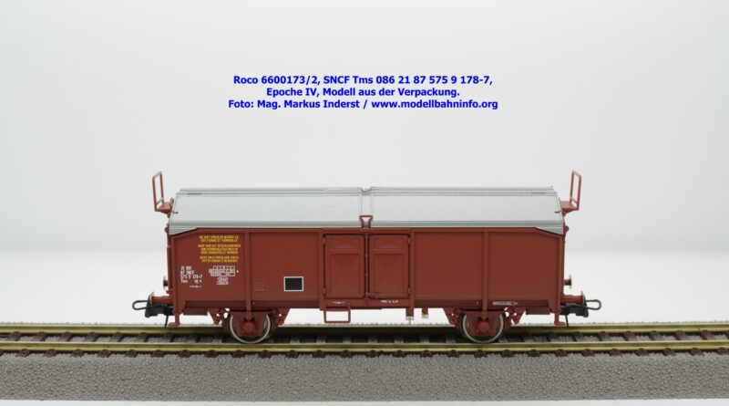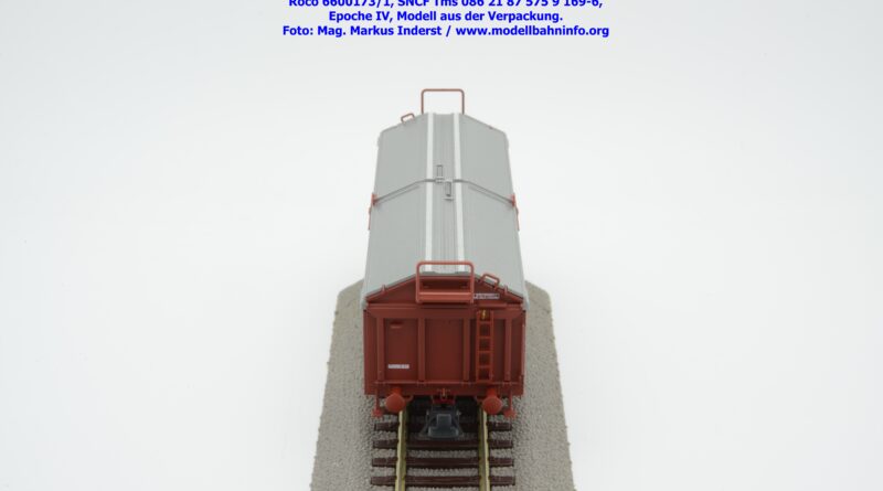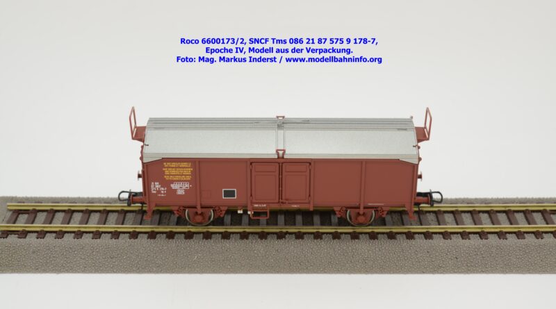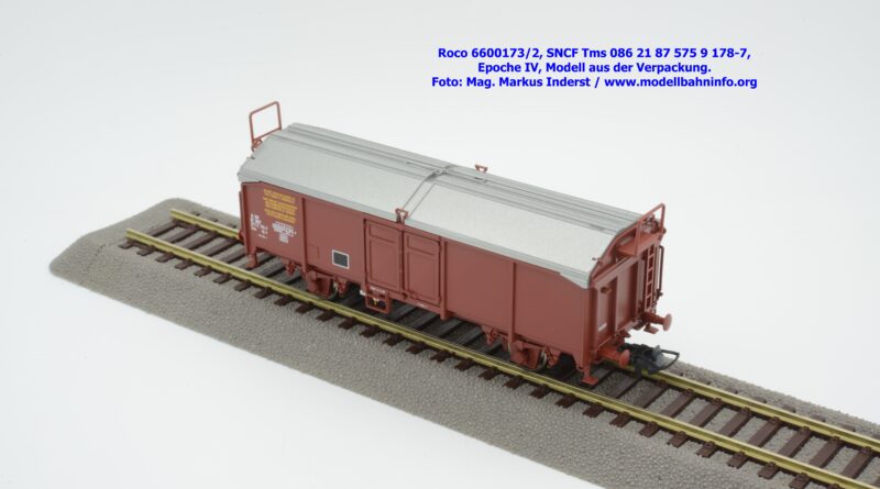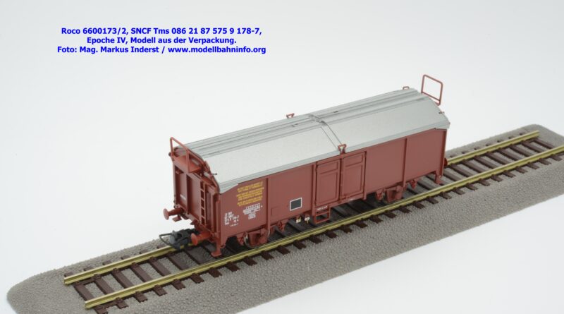Roco liefert das gegenständliche Modell in der bekannten Fleischmann-Blisterbox aus. Der Wagen trägt die vollständige Wagennummer: 01 82 075 7 116-9, als Wagengattung ist Tms angeschrieben. Das Revisionsdatum stammt vom 12.04.74. Dem Modell liegen keine Zurüstteile bei.