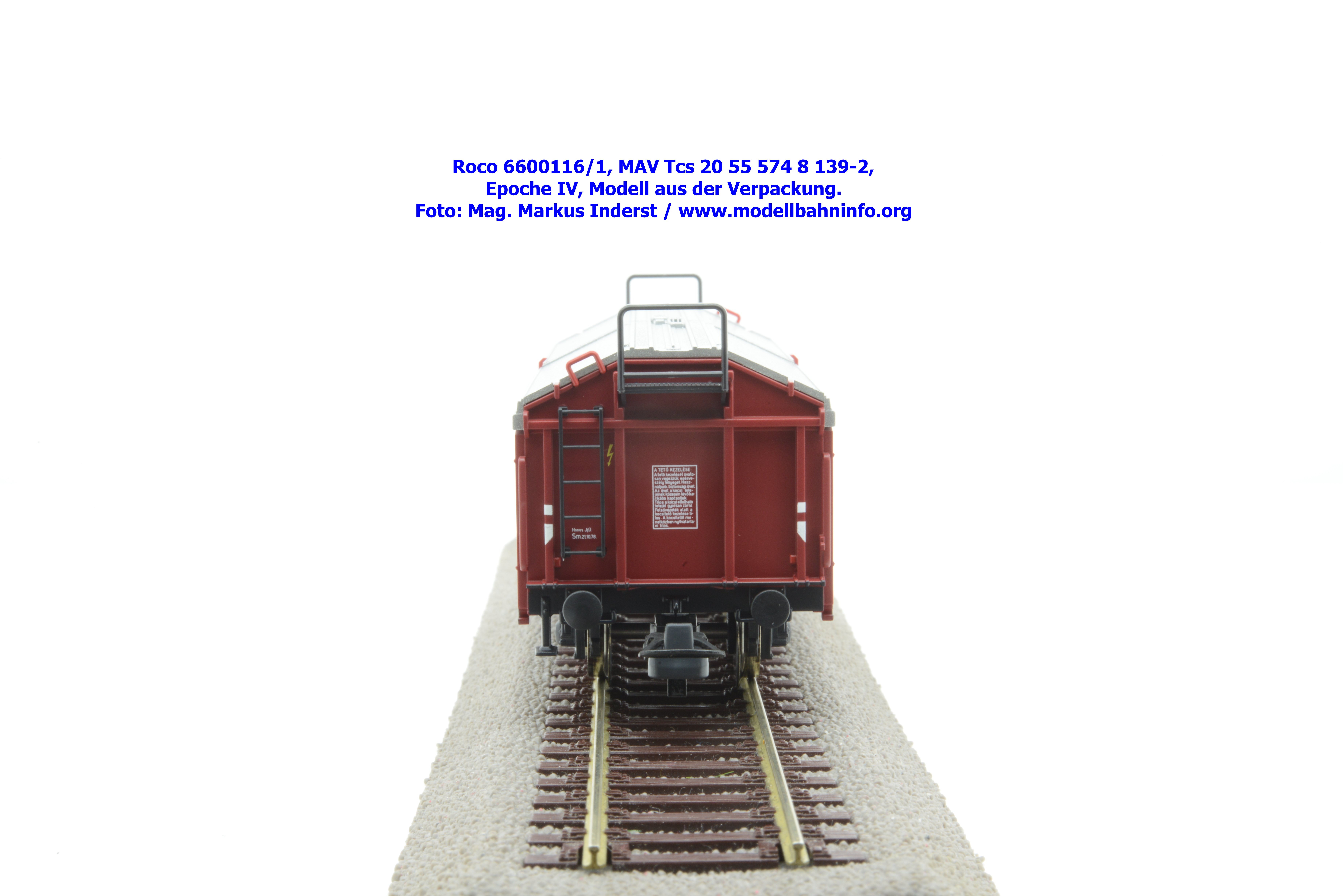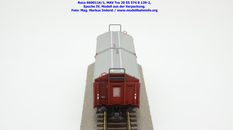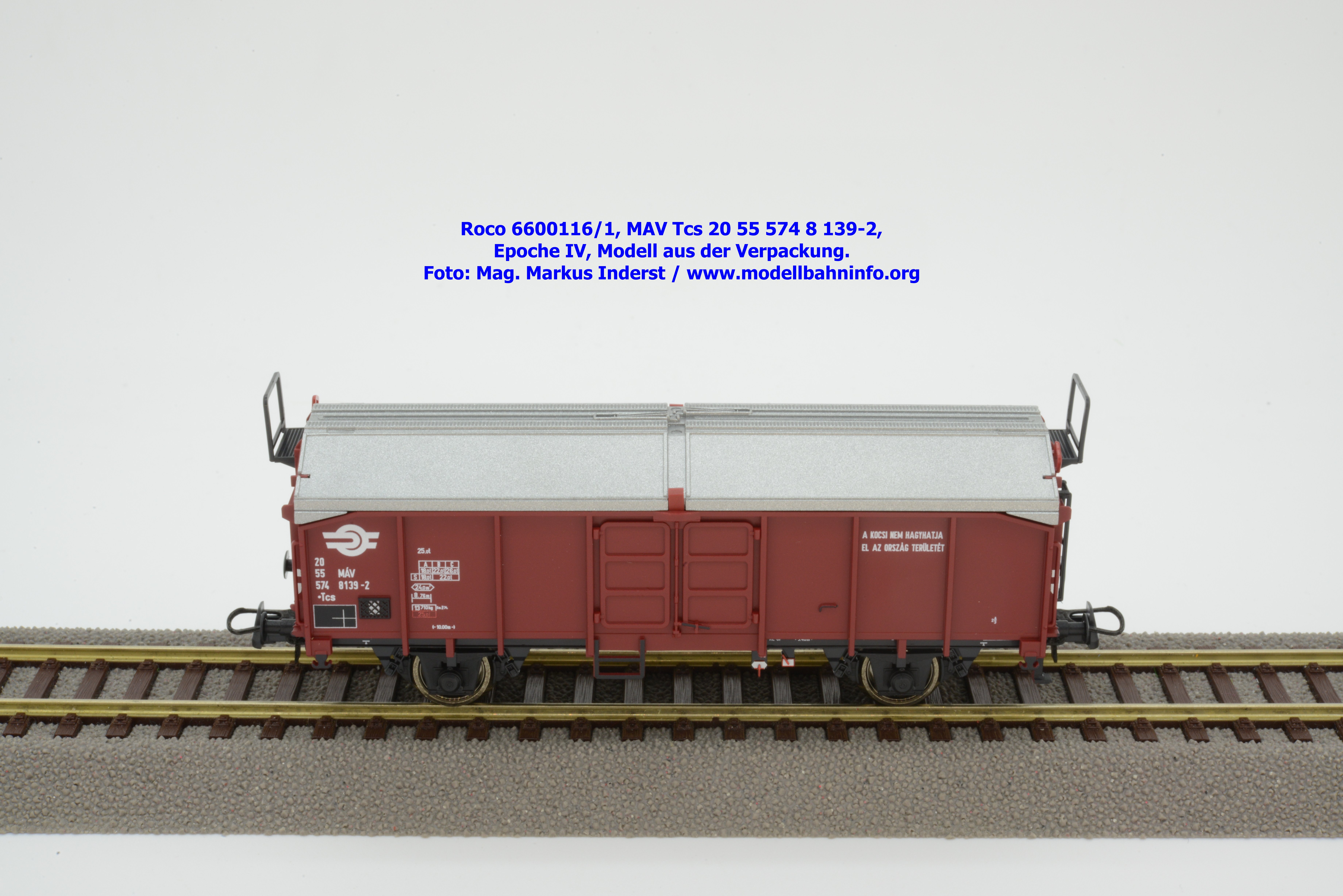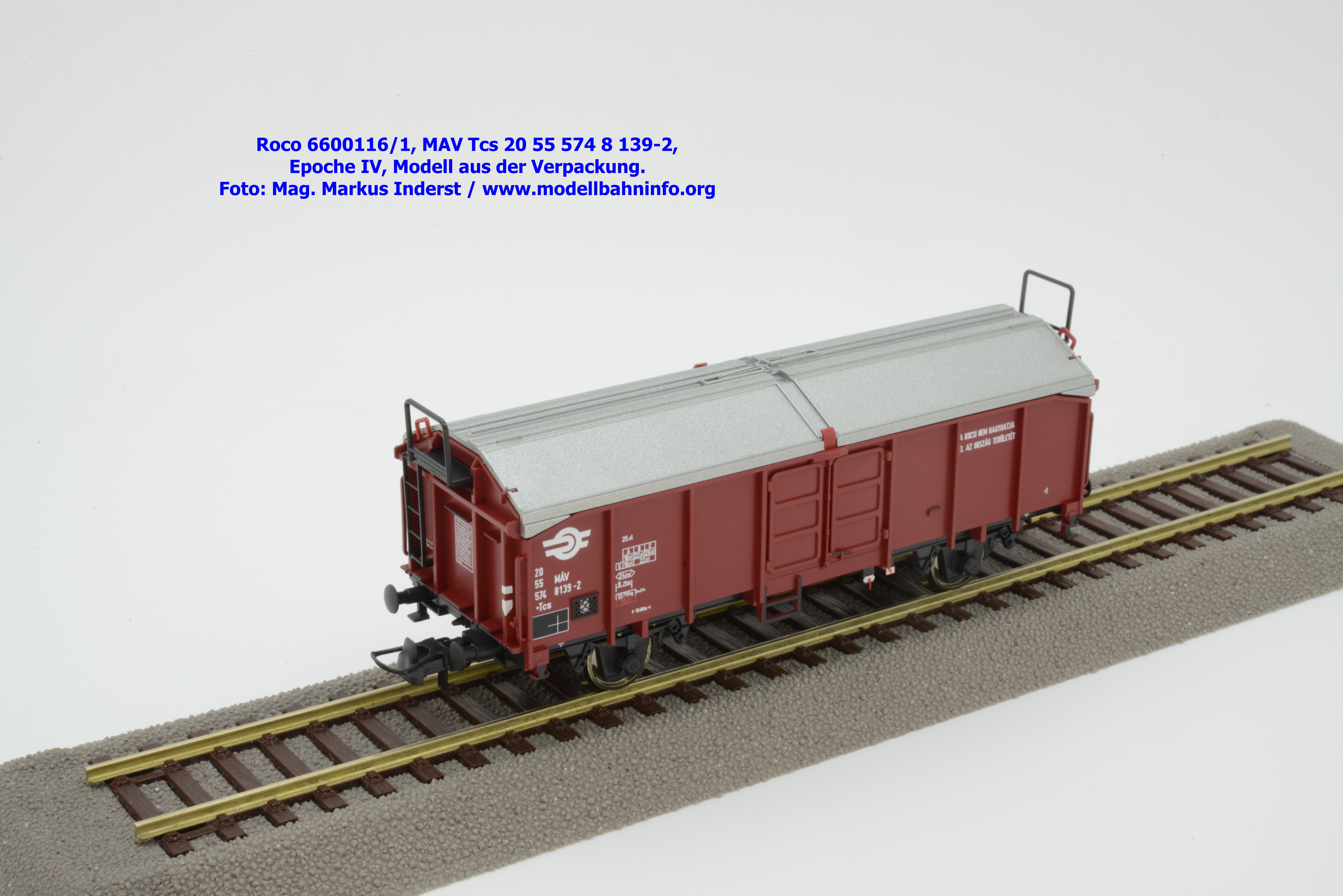 Das erste Modell fällt optisch sofort durch das silberne Dach auf. Wenn man allerdings das Modell näher betrachtet, kommt zur Vorfreude sogleich die Ernüchterung. Roco hat das Modell als Inlandswagen ausgeführt, was auch durch das fehlende RIV-Symbol dokumentiert ist. Der Tcs der MAV wurde mit der Wagennummer 20 55 574 8 139-2 bedruckt. Passend zur Epoche IV ist auch der schwarze Fahrzeugrahmen. Im Revisionsraster stehen die Angaben 4 REV Sm 21.10.74.