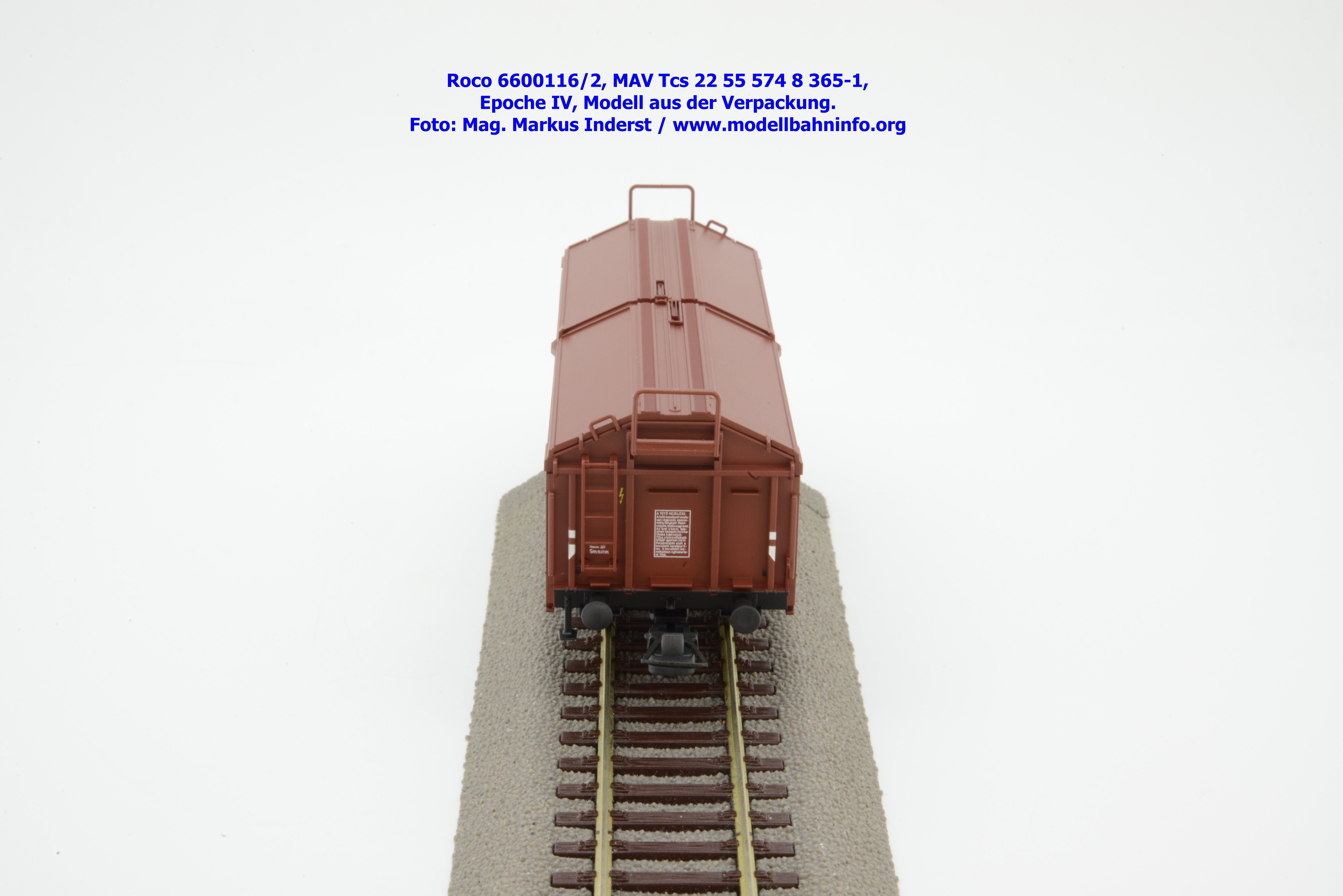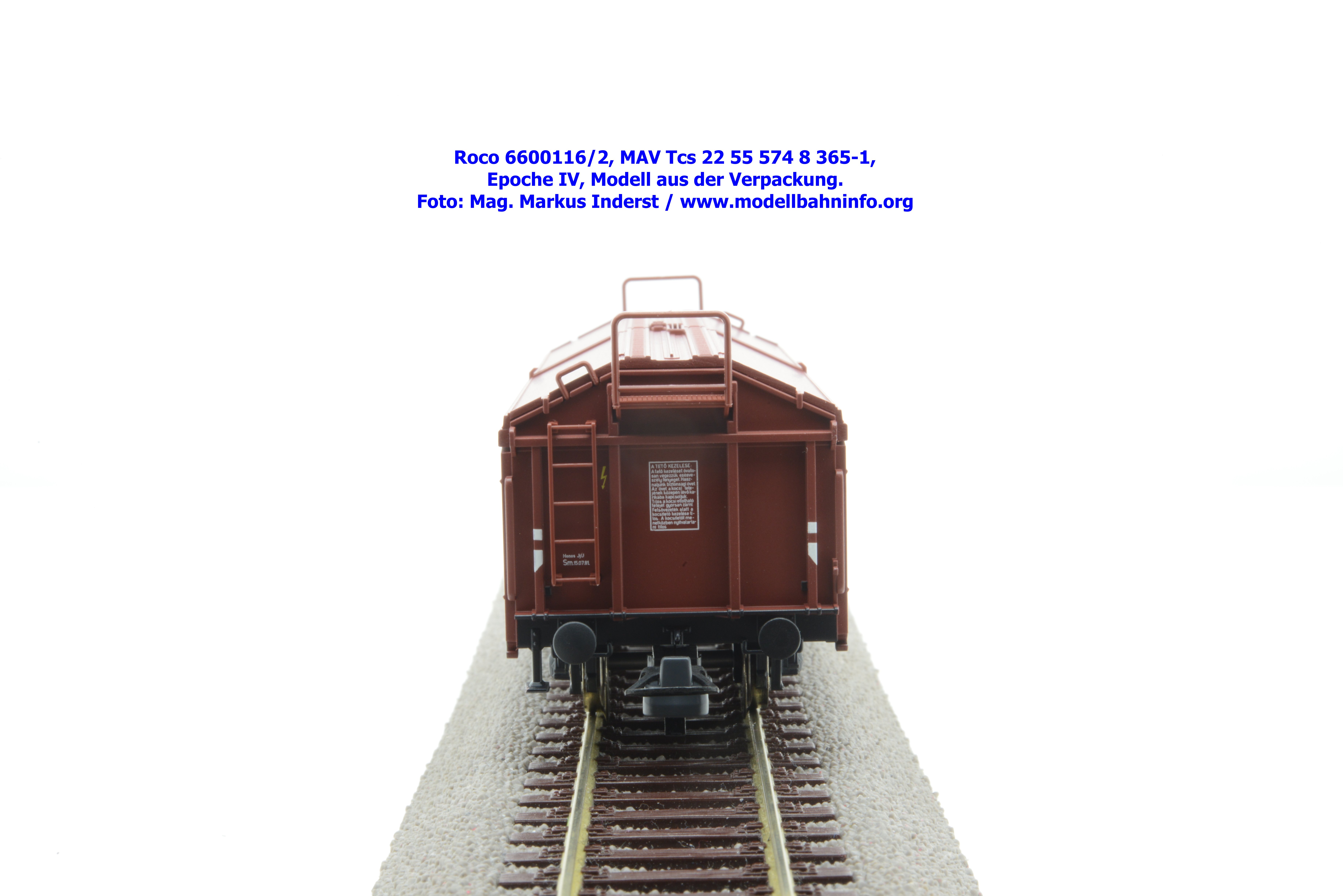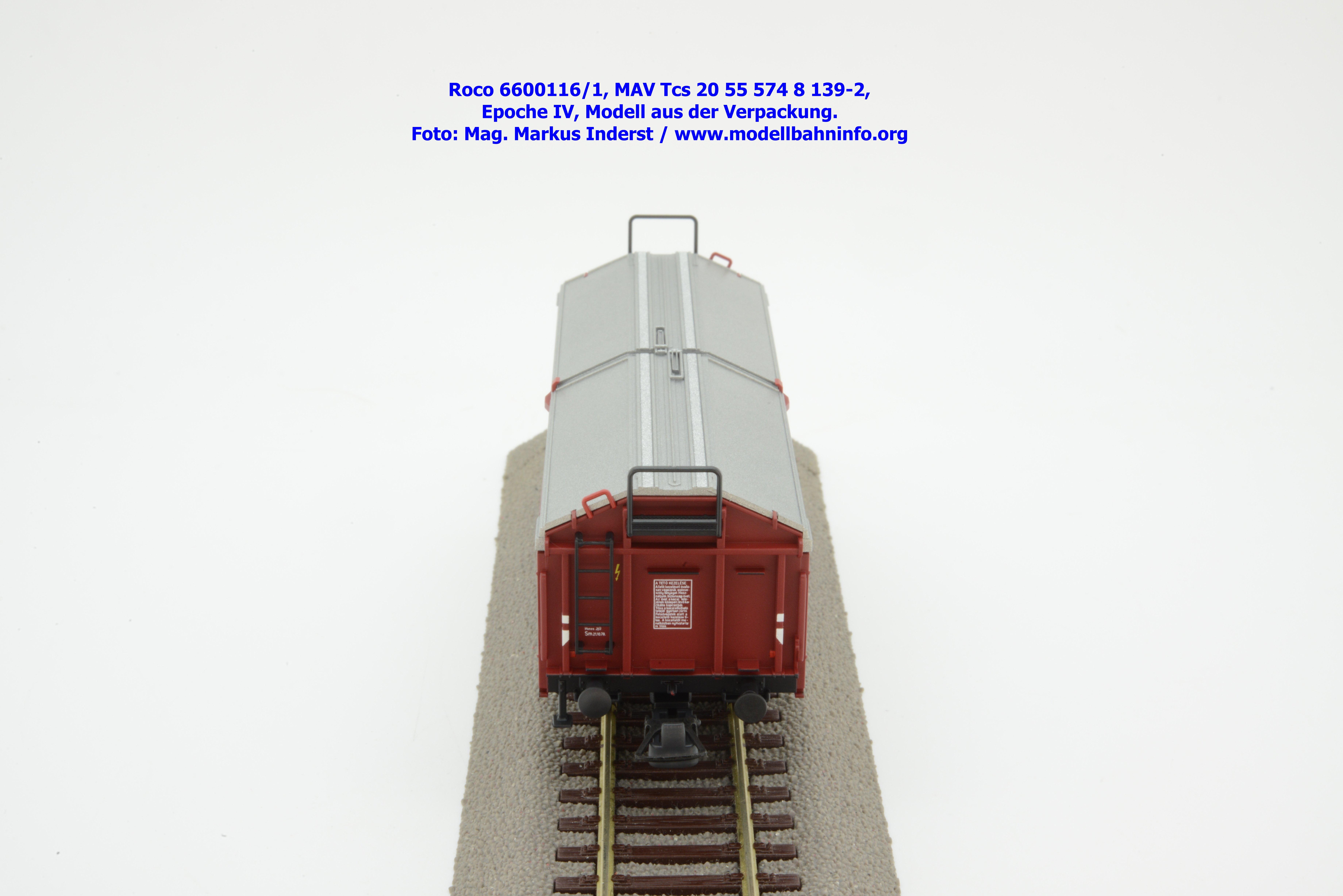 Das erste Modell fällt optisch sofort durch das silberne Dach auf. Wenn man allerdings das Modell näher betrachtet, kommt zur Vorfreude sogleich die Ernüchterung. Roco hat das Modell als Inlandswagen ausgeführt, was auch durch das fehlende RIV-Symbol dokumentiert ist. Der Tcs der MAV wurde mit der Wagennummer 20 55 574 8 139-2 bedruckt. Passend zur Epoche IV ist auch der schwarze Fahrzeugrahmen. Im Revisionsraster stehen die Angaben 4 REV Sm 21.10.74.