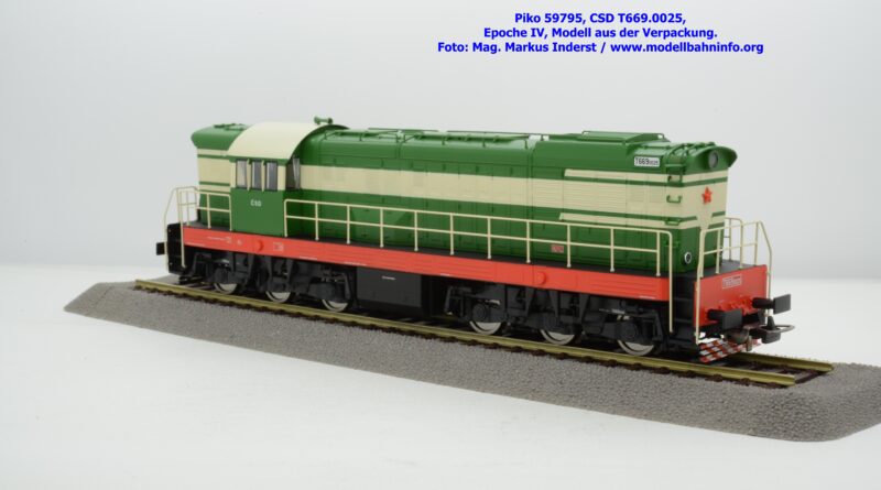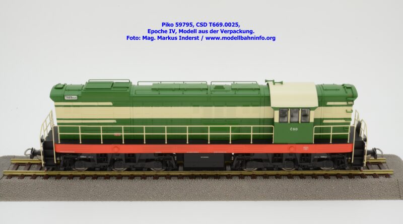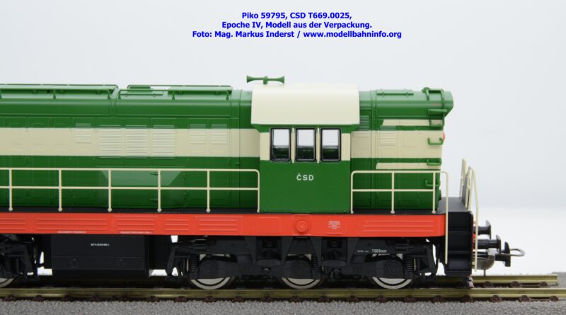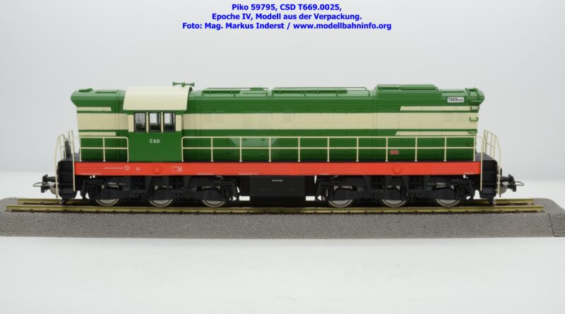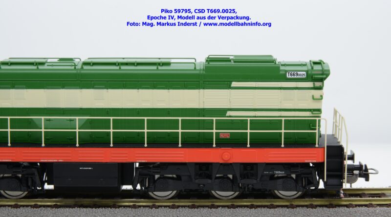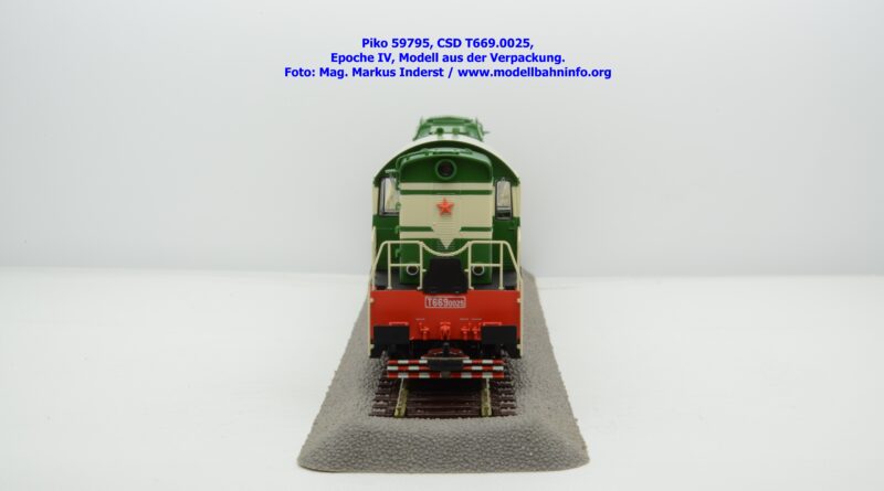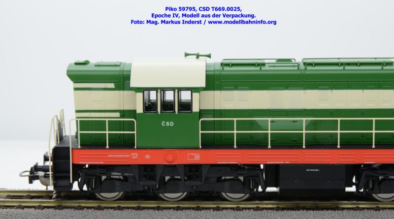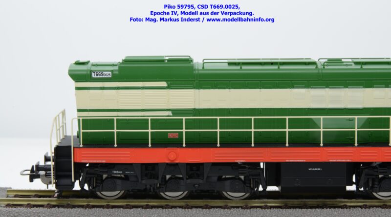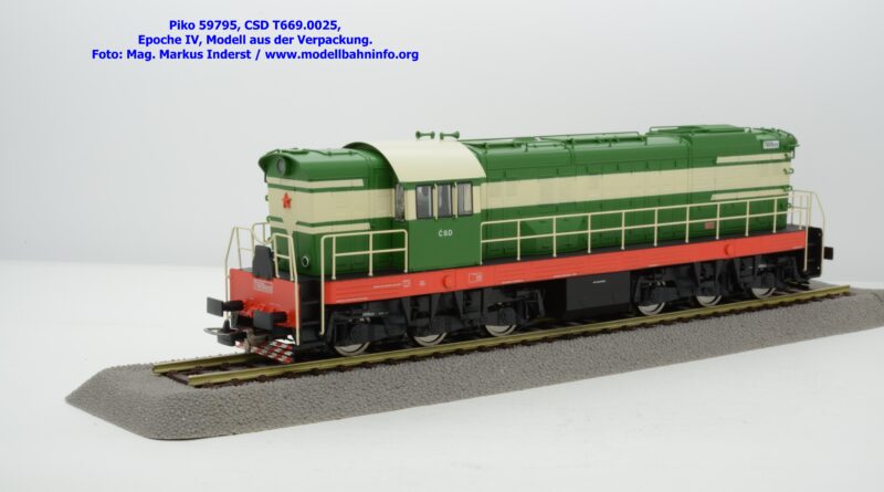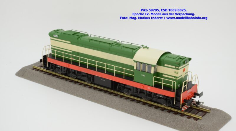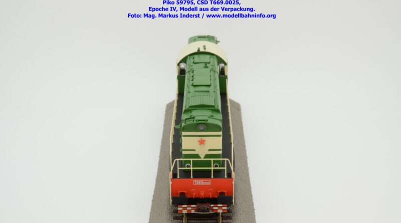 Diese Modellvariante der T669 der CSD findet sich als Herbstneuheit 2025 im zweiten Teil der Piko-Jahresneuheiten. Die in den Farben hellgrün/beige ausführten Aufbauten werden von einem rot lackierten Rahmen bei schwarzen Drehgestellen getragen. Das Modell ist mit der ursprünglichen Betriebsnummer T 669.0025 bedruckt, wobei an den Stirnfronten auch der Rote Stern zu sehen ist. Am Fahrzeugrahmen findet sich ein Revisionsdatum mit der Anschrift SMZ 11.67. Eine Heimatdienststelle scheint offenbar nicht angeführt zu sein. Jedenfalls ist das Modell mit zahlreichen Anschriften am Lokrahmen sowie auf den Drehgestellen versehen, selbst die Fabrikschilder sind mehrfarbig ausgeführt. Die Geländer sind im Farbton der beigen Zierstreifen gehalten, ebenso das abgerundete Führerhausdach. Piko offeriert die T669.0025 der CSD nur in zwei Gleichstrom-Ausführungen an. Die analoge Modellvariante ist zum UVP von € 184,– erhältlich; unter der Artikelnummer 59796 ist das digitale Zweileiter-Gleichstrommodell zum UVP von € 294,– erhältlich.