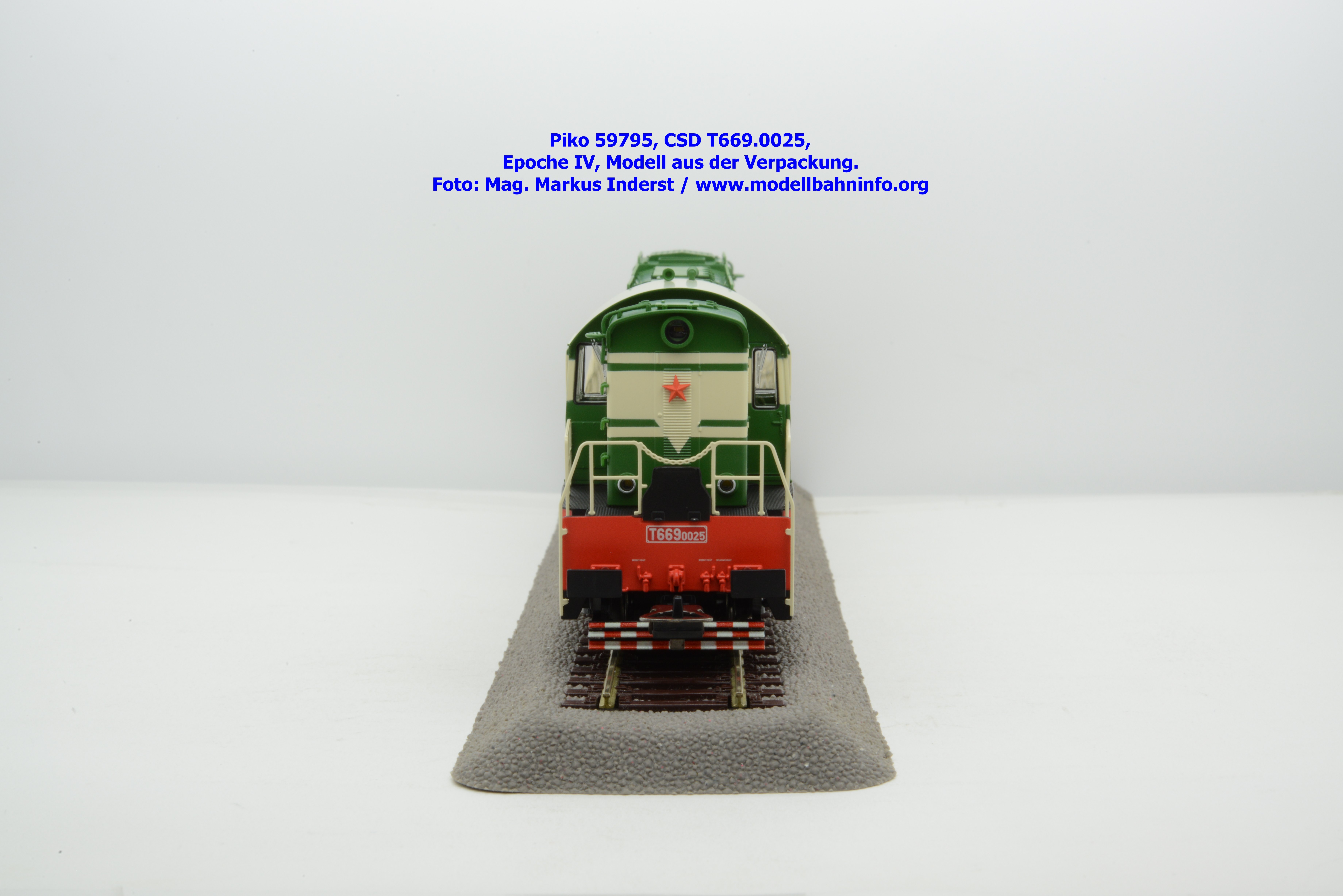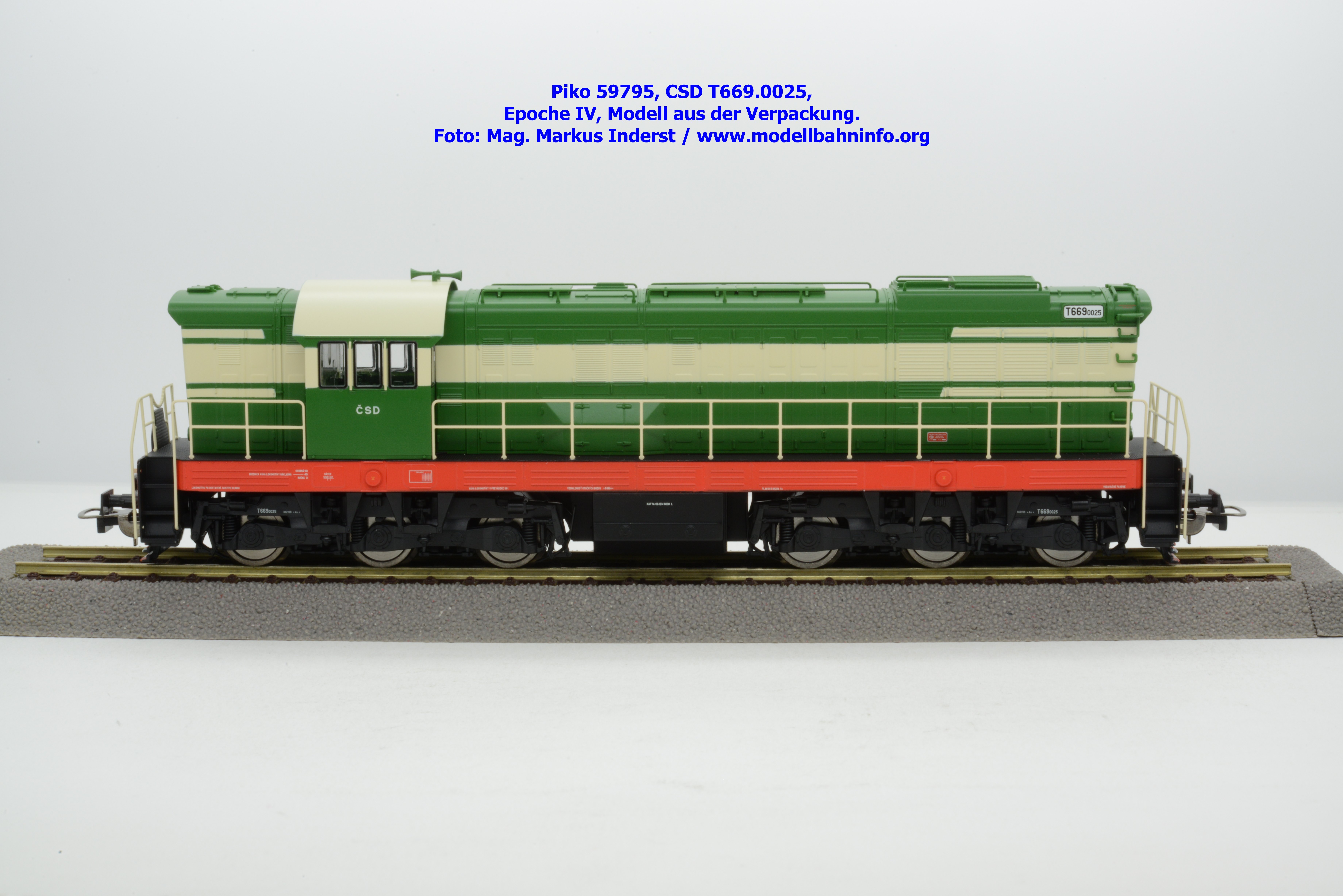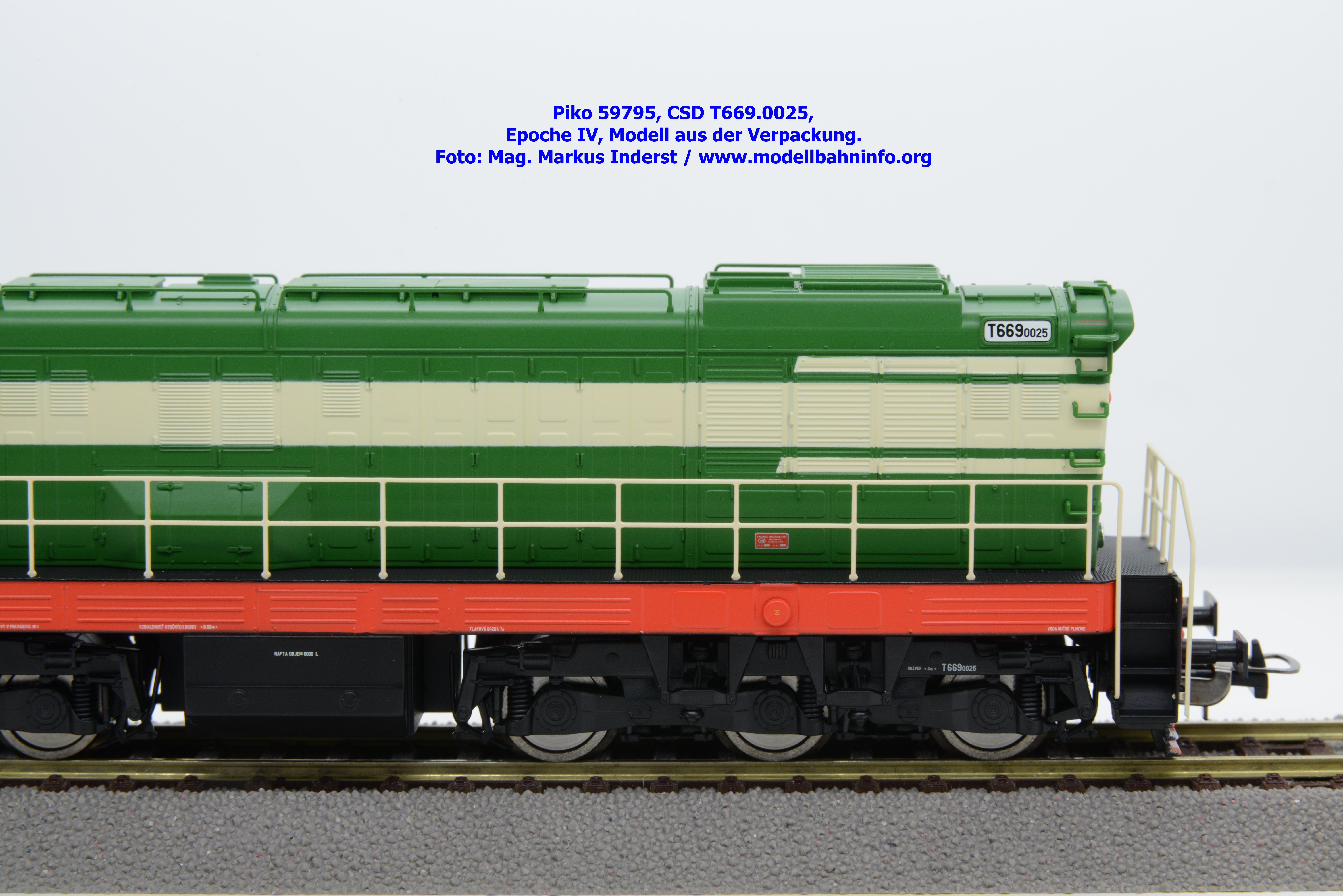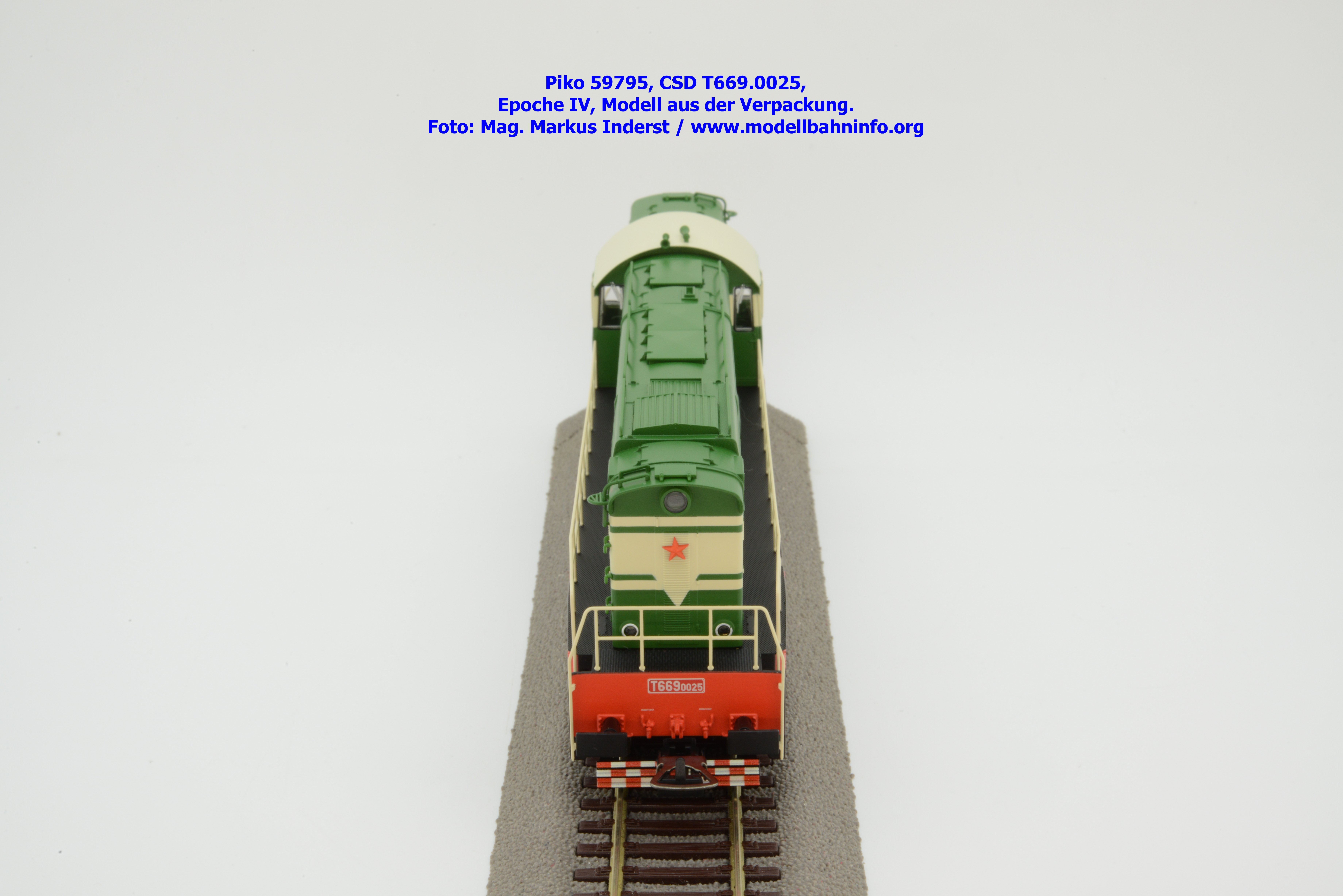 Diese Modellvariante der T669 der CSD findet sich als Herbstneuheit 2025 im zweiten Teil der Piko-Jahresneuheiten. Die in den Farben hellgrün/beige ausführten Aufbauten werden von einem rot lackierten Rahmen bei schwarzen Drehgestellen getragen. Das Modell ist mit der ursprünglichen Betriebsnummer T 669.0025 bedruckt, wobei an den Stirnfronten auch der Rote Stern zu sehen ist. Am Fahrzeugrahmen findet sich ein Revisionsdatum mit der Anschrift SMZ 11.67. Eine Heimatdienststelle scheint offenbar nicht angeführt zu sein. Jedenfalls ist das Modell mit zahlreichen Anschriften am Lokrahmen sowie auf den Drehgestellen versehen, selbst die Fabrikschilder sind mehrfarbig ausgeführt. Die Geländer sind im Farbton der beigen Zierstreifen gehalten, ebenso das abgerundete Führerhausdach. Piko offeriert die T669.0025 der CSD nur in zwei Gleichstrom-Ausführungen an. Die analoge Modellvariante ist zum UVP von € 184,– erhältlich; unter der Artikelnummer 59796 ist das digitale Zweileiter-Gleichstrommodell zum UVP von € 294,– erhältlich.
