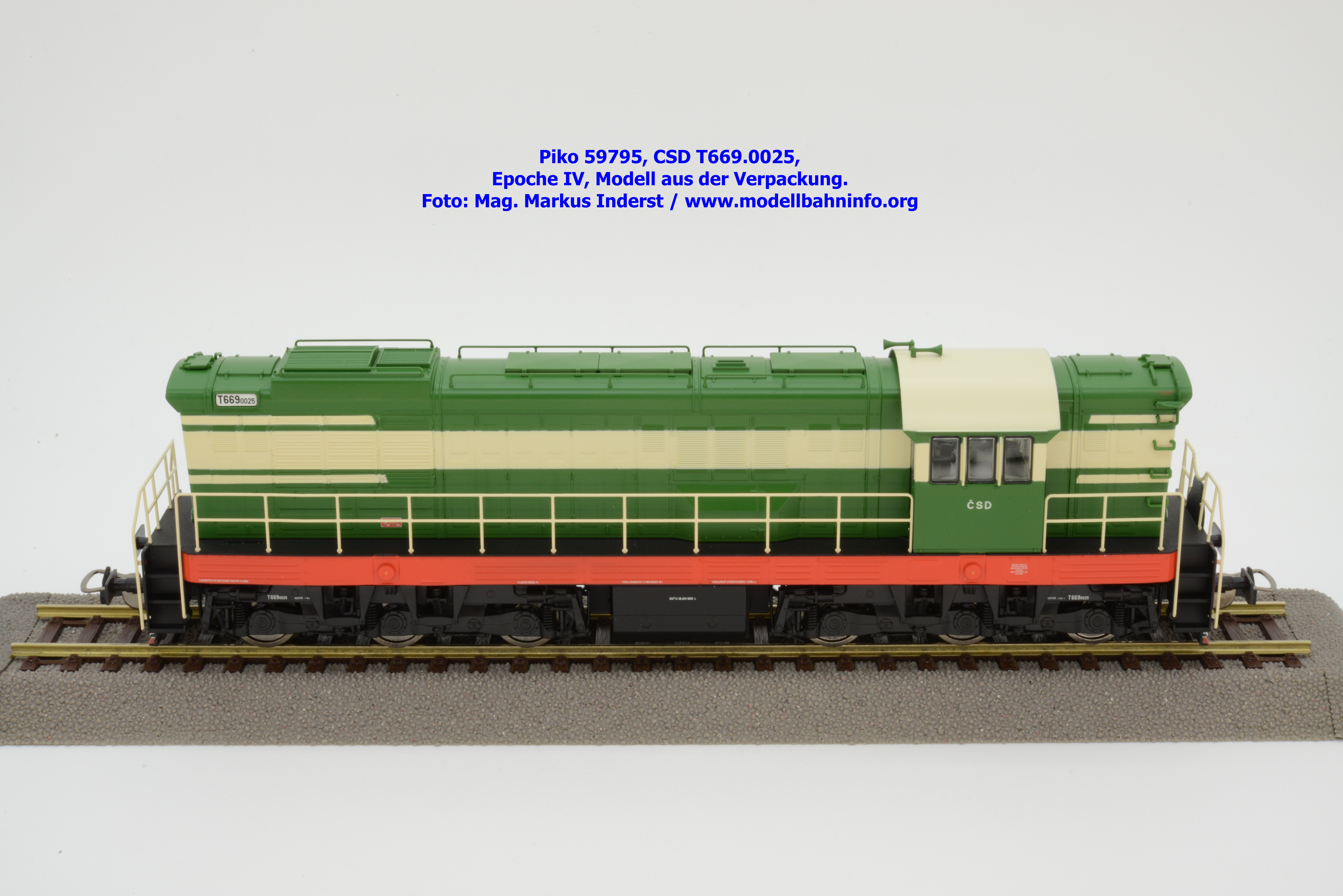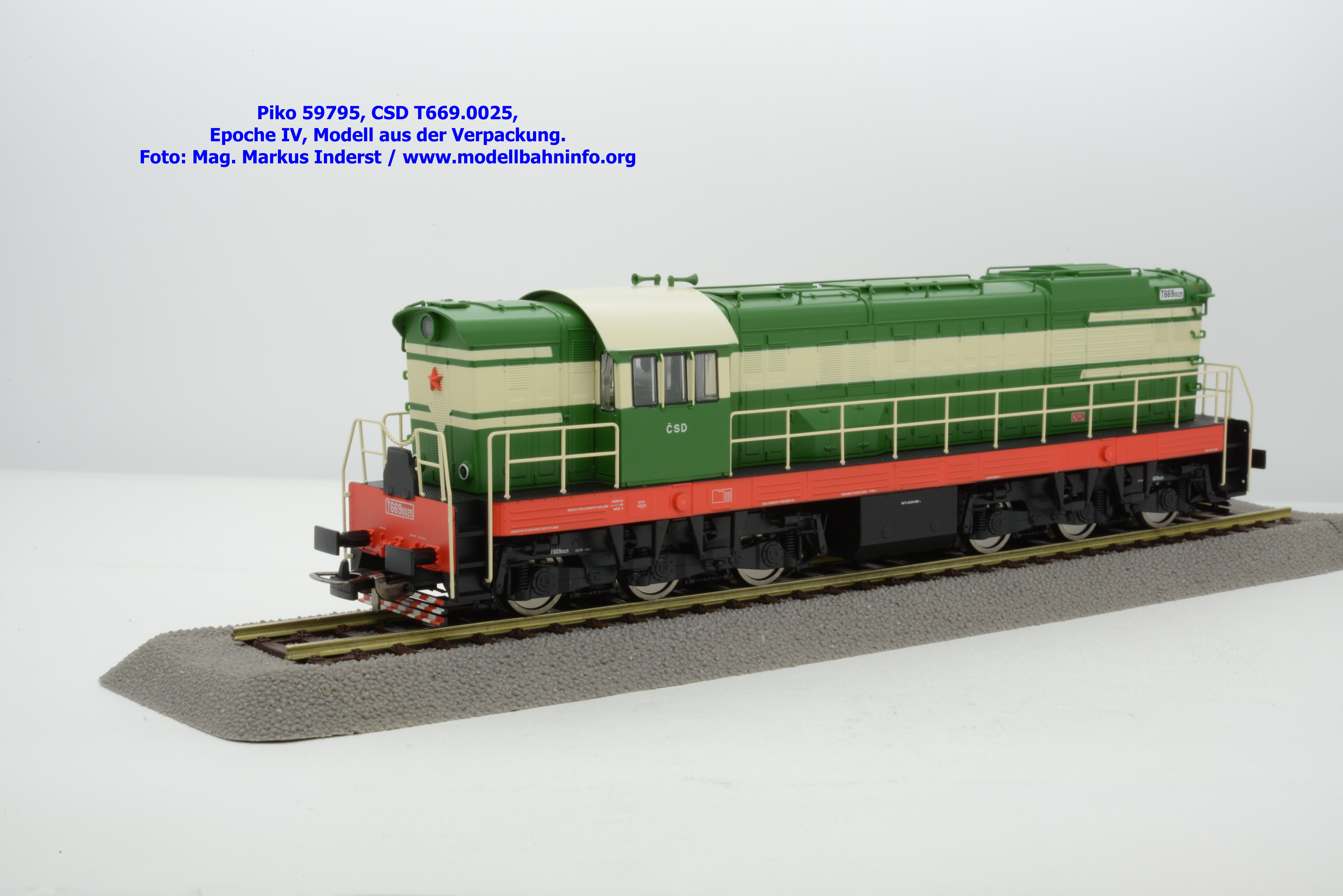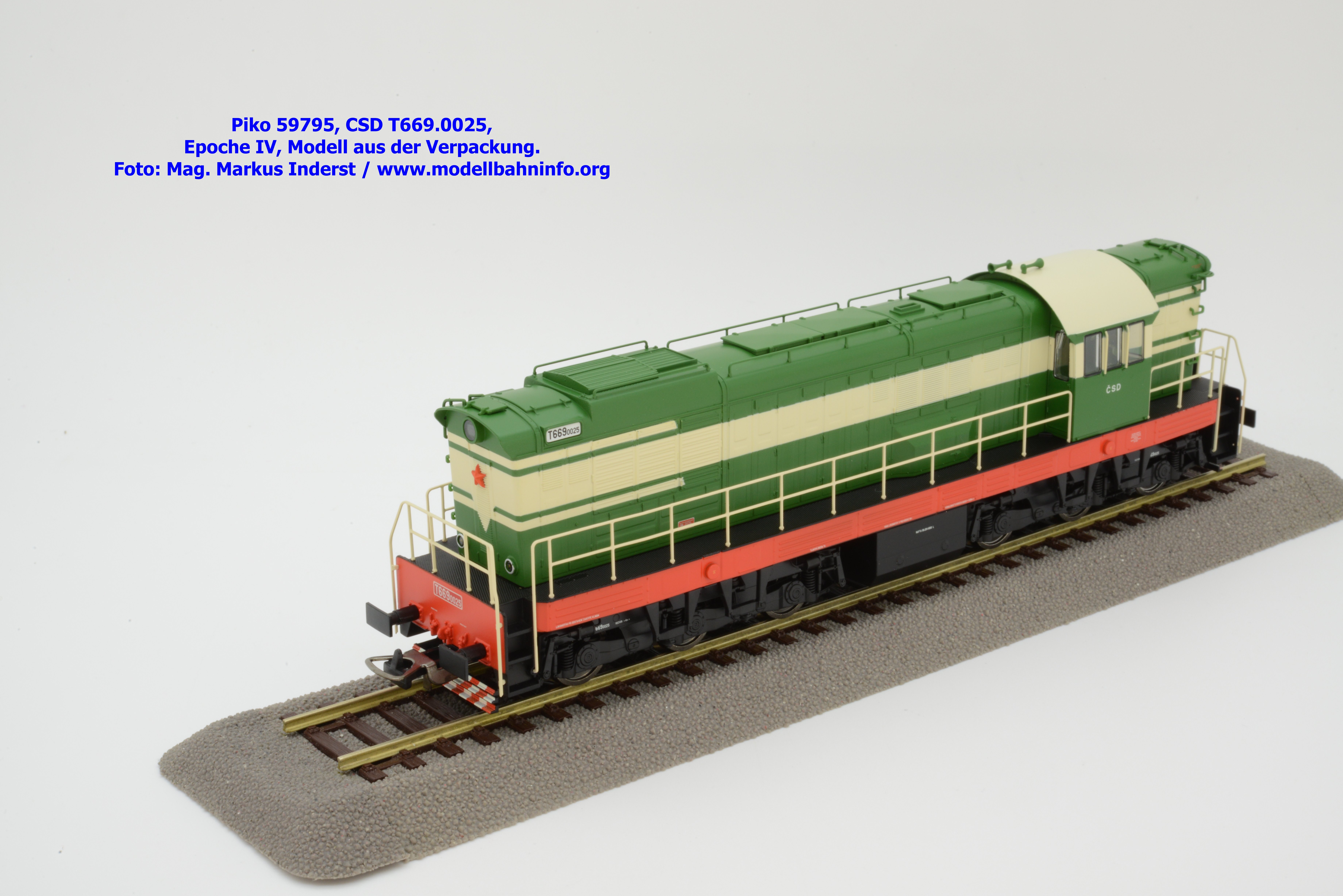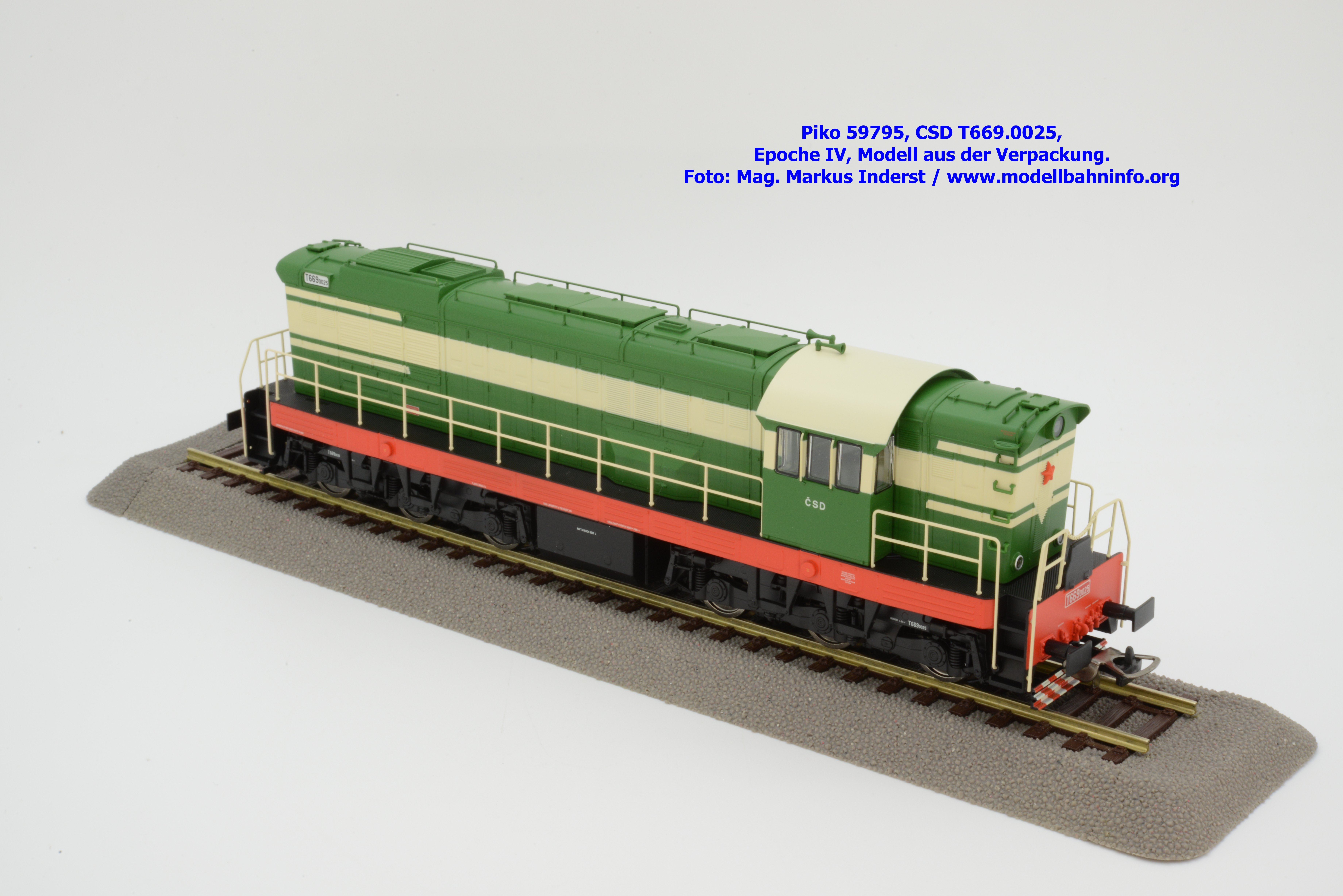 Diese Modellvariante der T669 der CSD findet sich als Herbstneuheit 2025 im zweiten Teil der Piko-Jahresneuheiten. Die in den Farben hellgrün/beige ausführten Aufbauten werden von einem rot lackierten Rahmen bei schwarzen Drehgestellen getragen. Das Modell ist mit der ursprünglichen Betriebsnummer T 669.0025 bedruckt, wobei an den Stirnfronten auch der Rote Stern zu sehen ist. Am Fahrzeugrahmen findet sich ein Revisionsdatum mit der Anschrift SMZ 11.67. Eine Heimatdienststelle scheint offenbar nicht angeführt zu sein. Jedenfalls ist das Modell mit zahlreichen Anschriften am Lokrahmen sowie auf den Drehgestellen versehen, selbst die Fabrikschilder sind mehrfarbig ausgeführt. Die Geländer sind im Farbton der beigen Zierstreifen gehalten, ebenso das abgerundete Führerhausdach. Piko offeriert die T669.0025 der CSD nur in zwei Gleichstrom-Ausführungen an. Die analoge Modellvariante ist zum UVP von € 184,– erhältlich; unter der Artikelnummer 59796 ist das digitale Zweileiter-Gleichstrommodell zum UVP von € 294,– erhältlich.