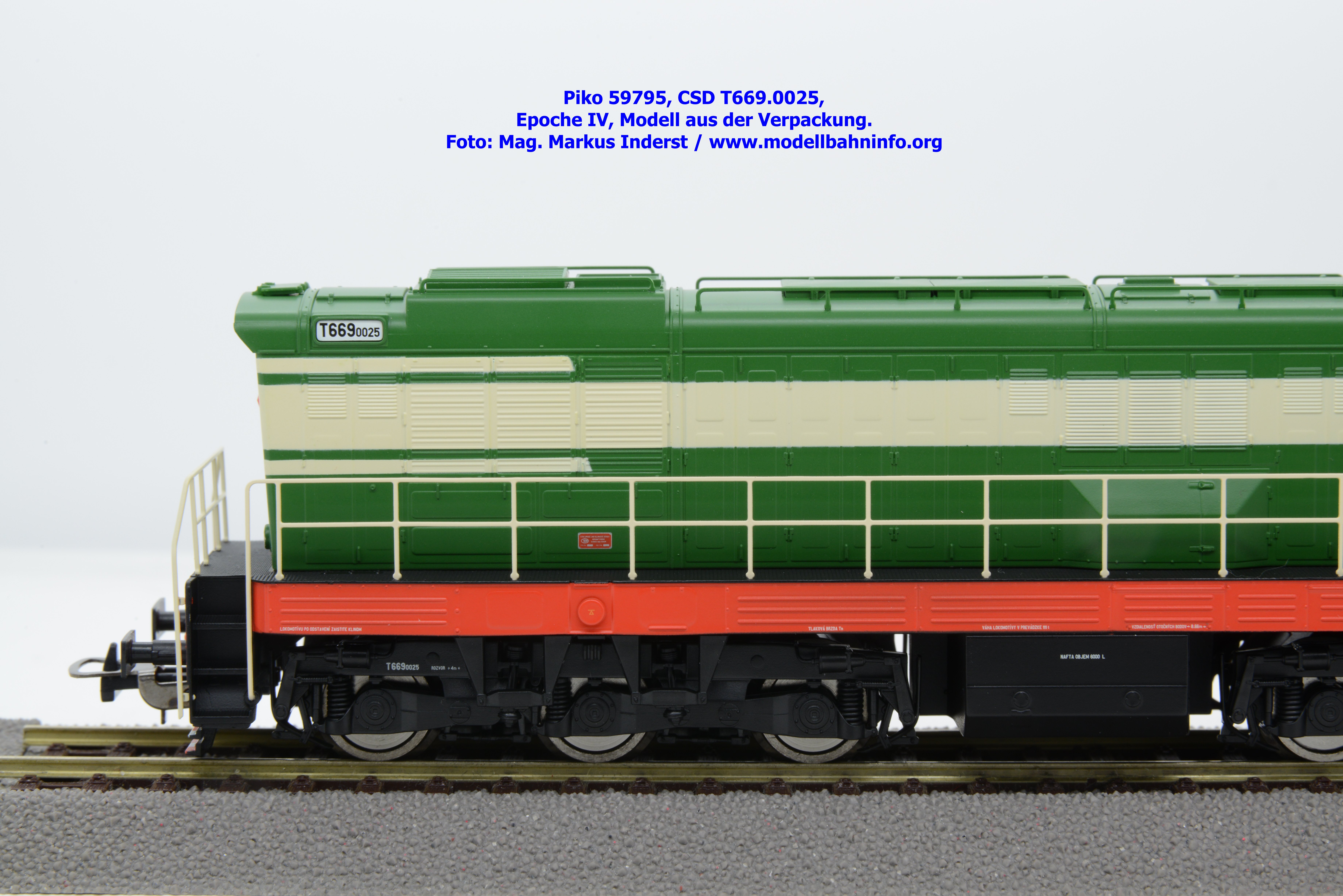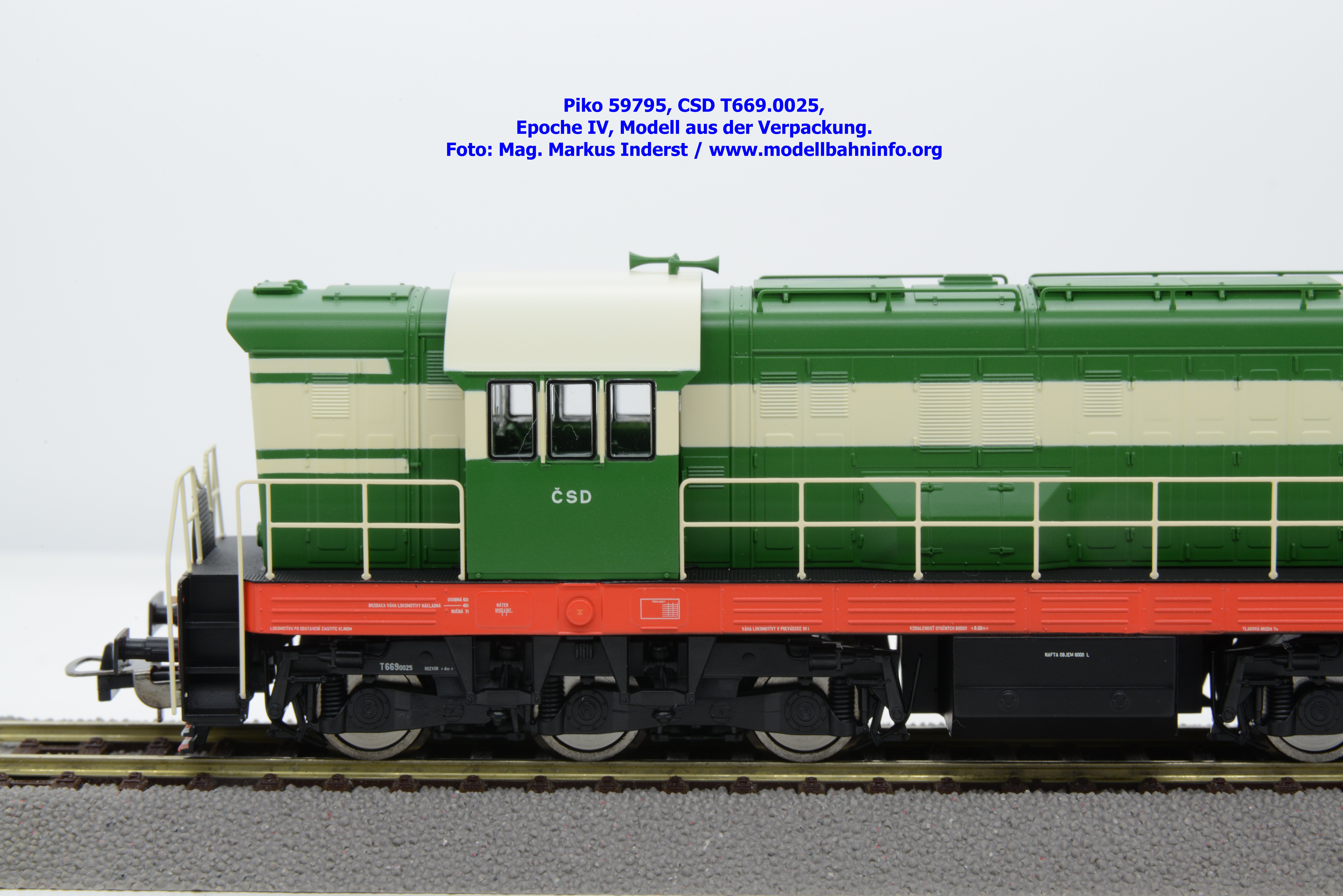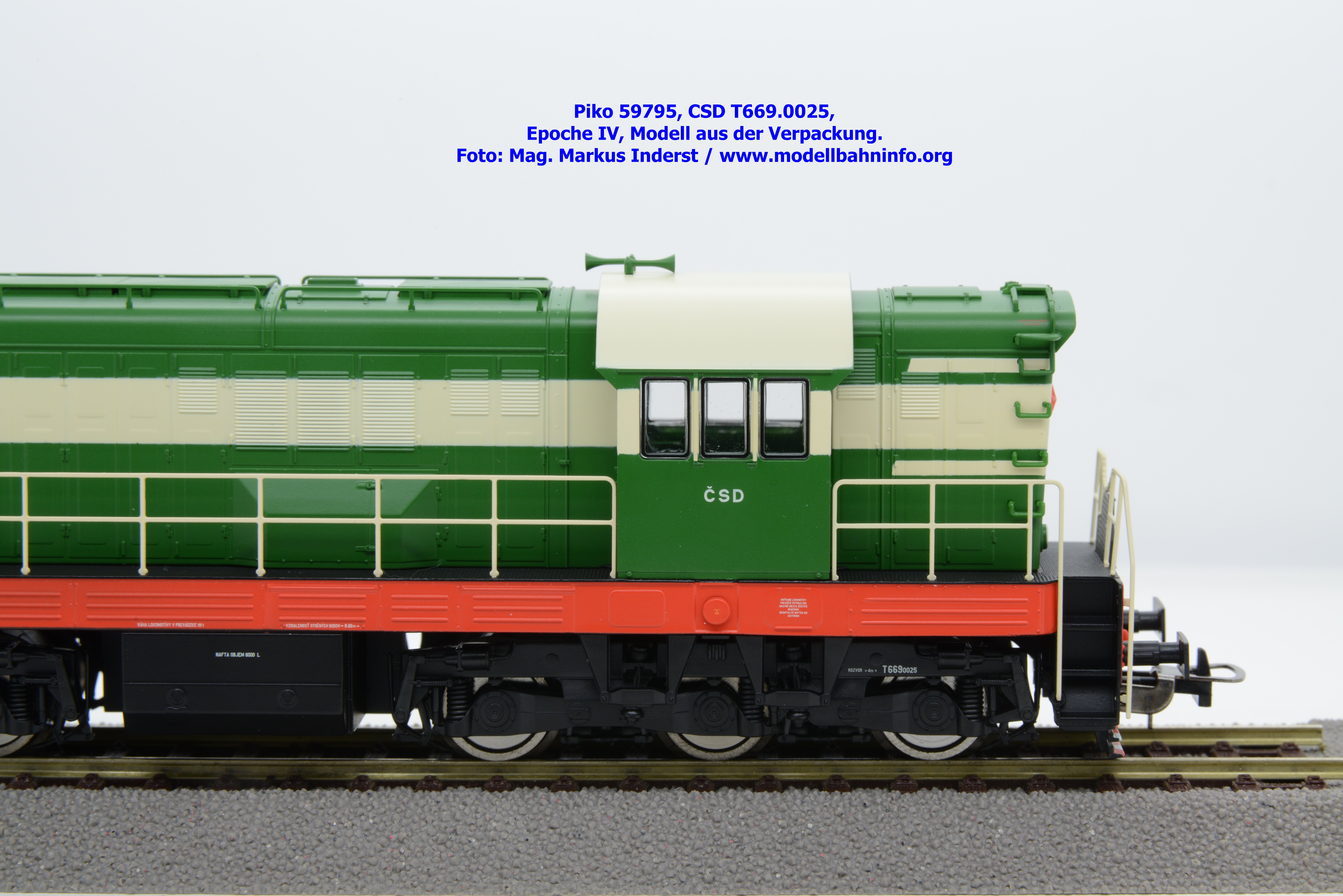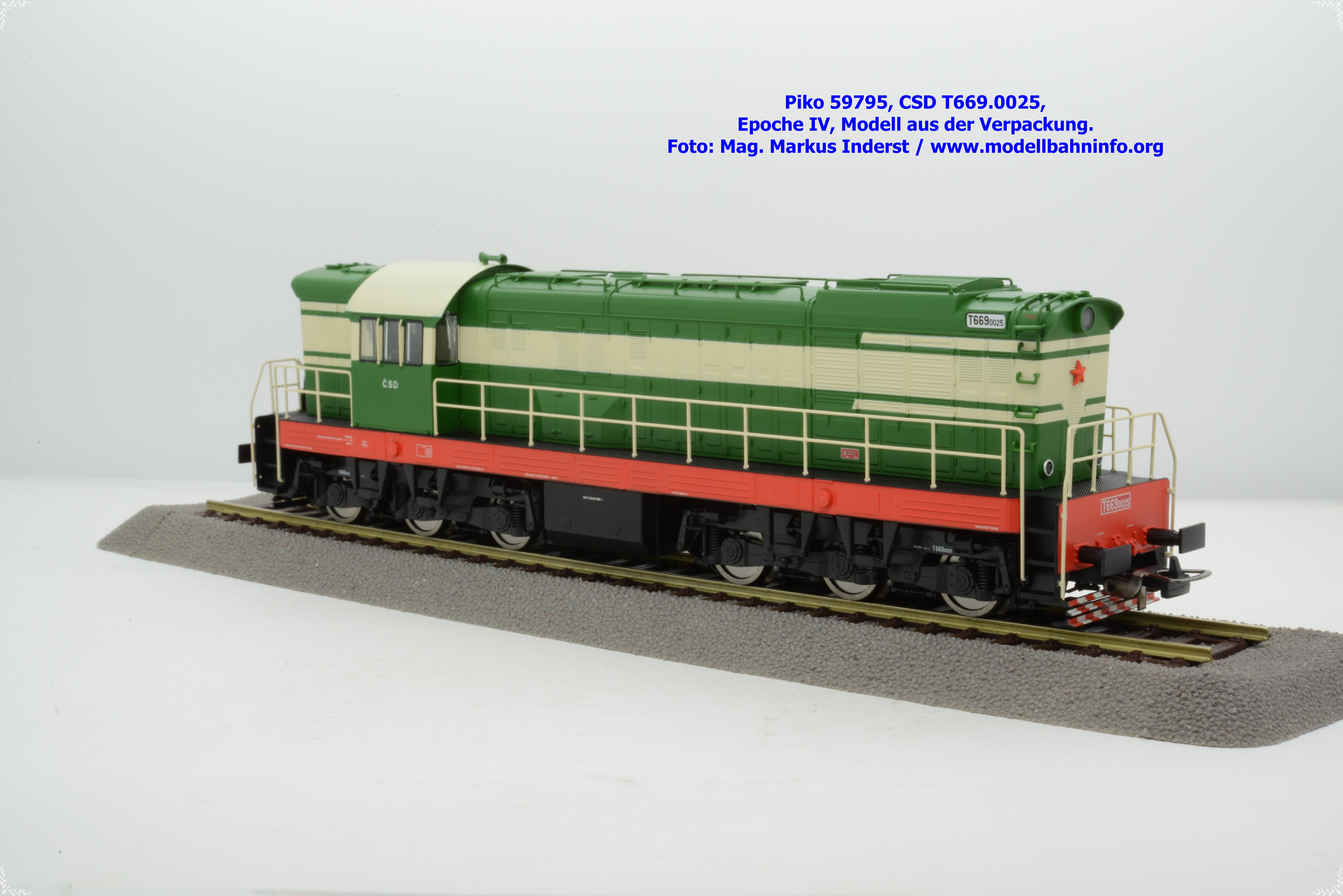 Diese Modellvariante der T669 der CSD findet sich als Herbstneuheit 2025 im zweiten Teil der Piko-Jahresneuheiten. Die in den Farben hellgrün/beige ausführten Aufbauten werden von einem rot lackierten Rahmen bei schwarzen Drehgestellen getragen. Das Modell ist mit der ursprünglichen Betriebsnummer T 669.0025 bedruckt, wobei an den Stirnfronten auch der Rote Stern zu sehen ist. Am Fahrzeugrahmen findet sich ein Revisionsdatum mit der Anschrift SMZ 11.67. Eine Heimatdienststelle scheint offenbar nicht angeführt zu sein. Jedenfalls ist das Modell mit zahlreichen Anschriften am Lokrahmen sowie auf den Drehgestellen versehen, selbst die Fabrikschilder sind mehrfarbig ausgeführt. Die Geländer sind im Farbton der beigen Zierstreifen gehalten, ebenso das abgerundete Führerhausdach. Piko offeriert die T669.0025 der CSD nur in zwei Gleichstrom-Ausführungen an. Die analoge Modellvariante ist zum UVP von € 184,– erhältlich; unter der Artikelnummer 59796 ist das digitale Zweileiter-Gleichstrommodell zum UVP von € 294,– erhältlich.