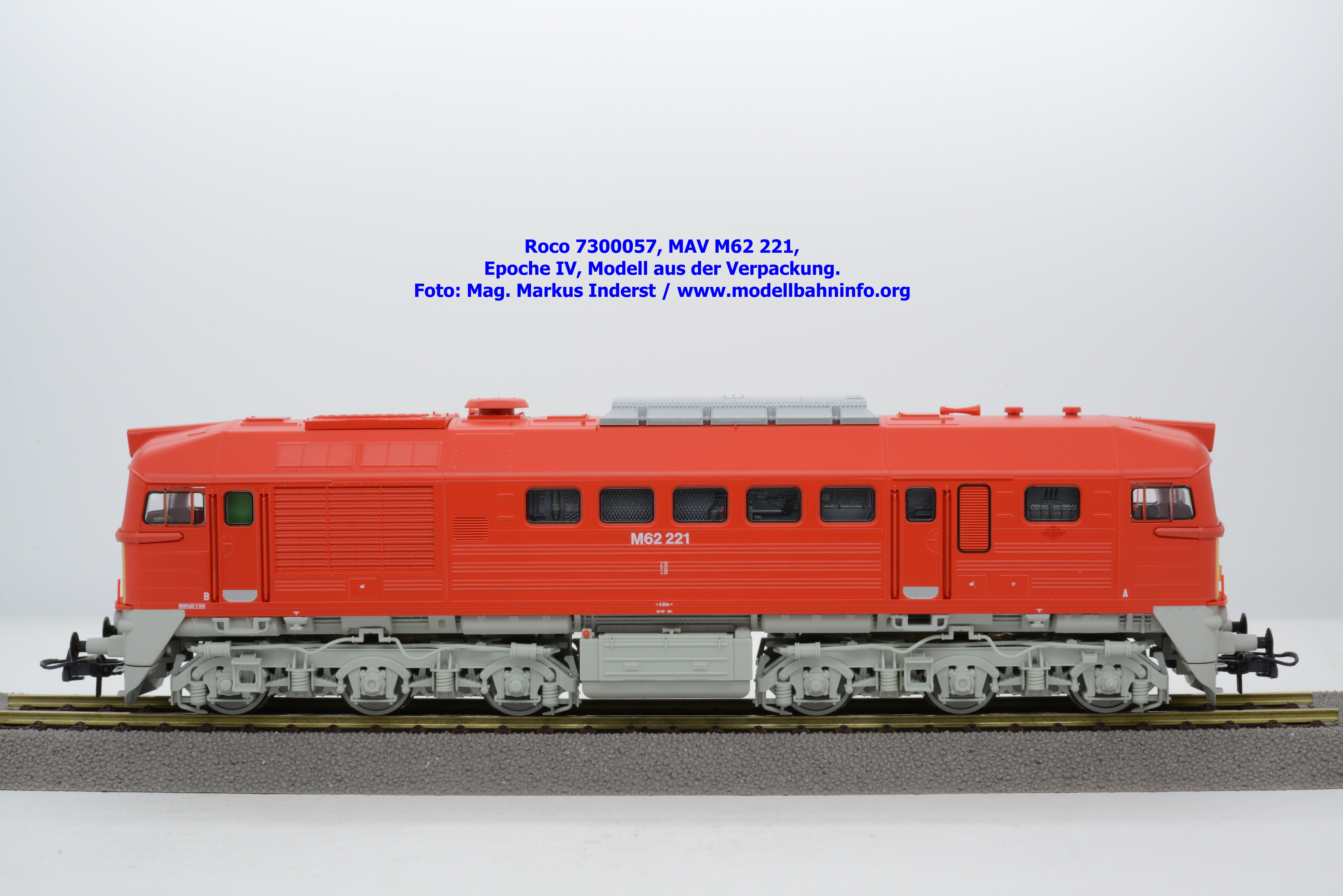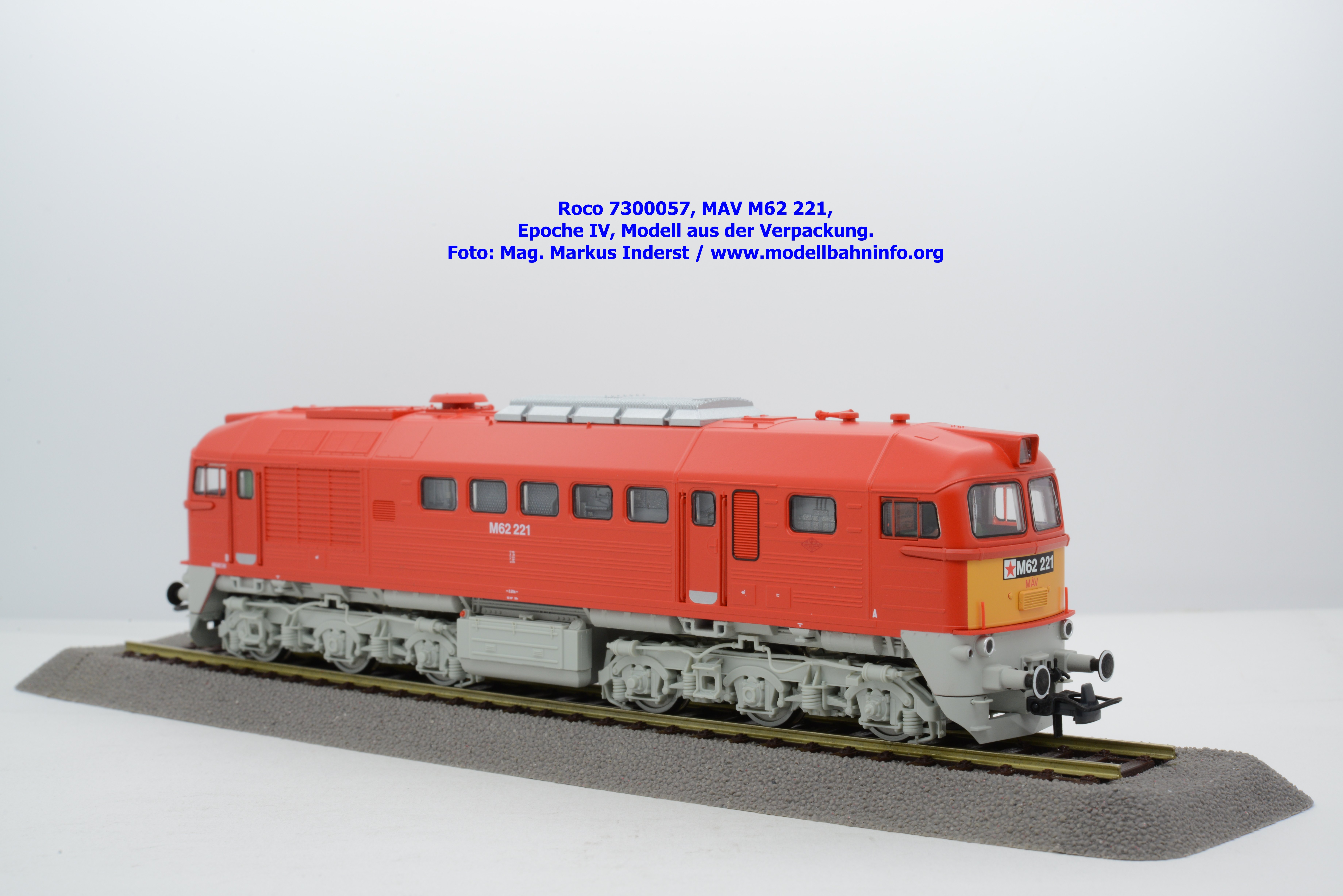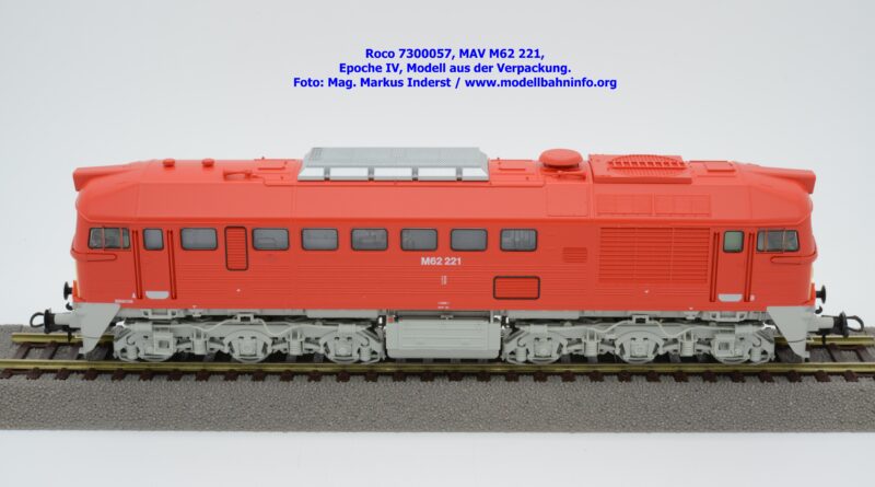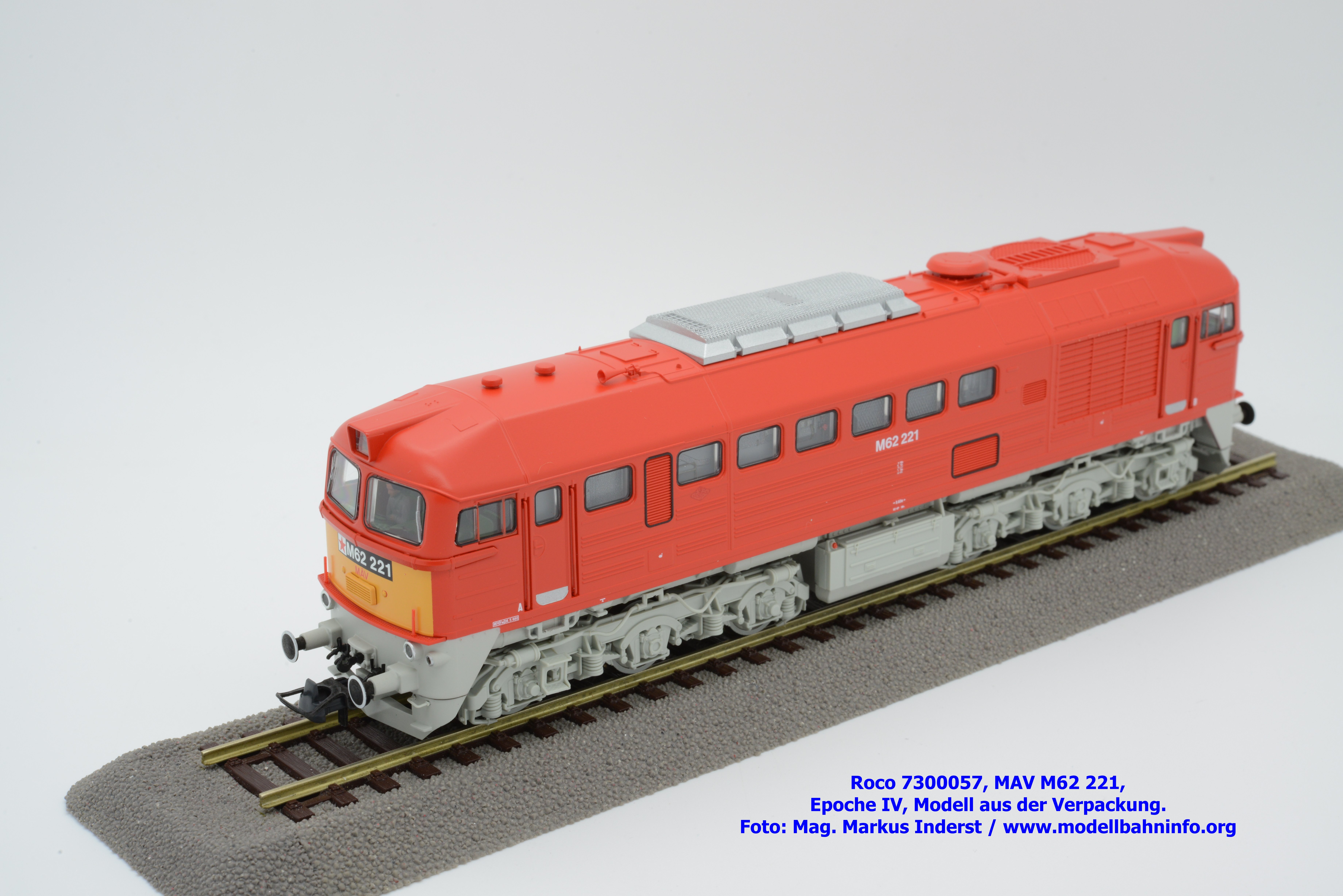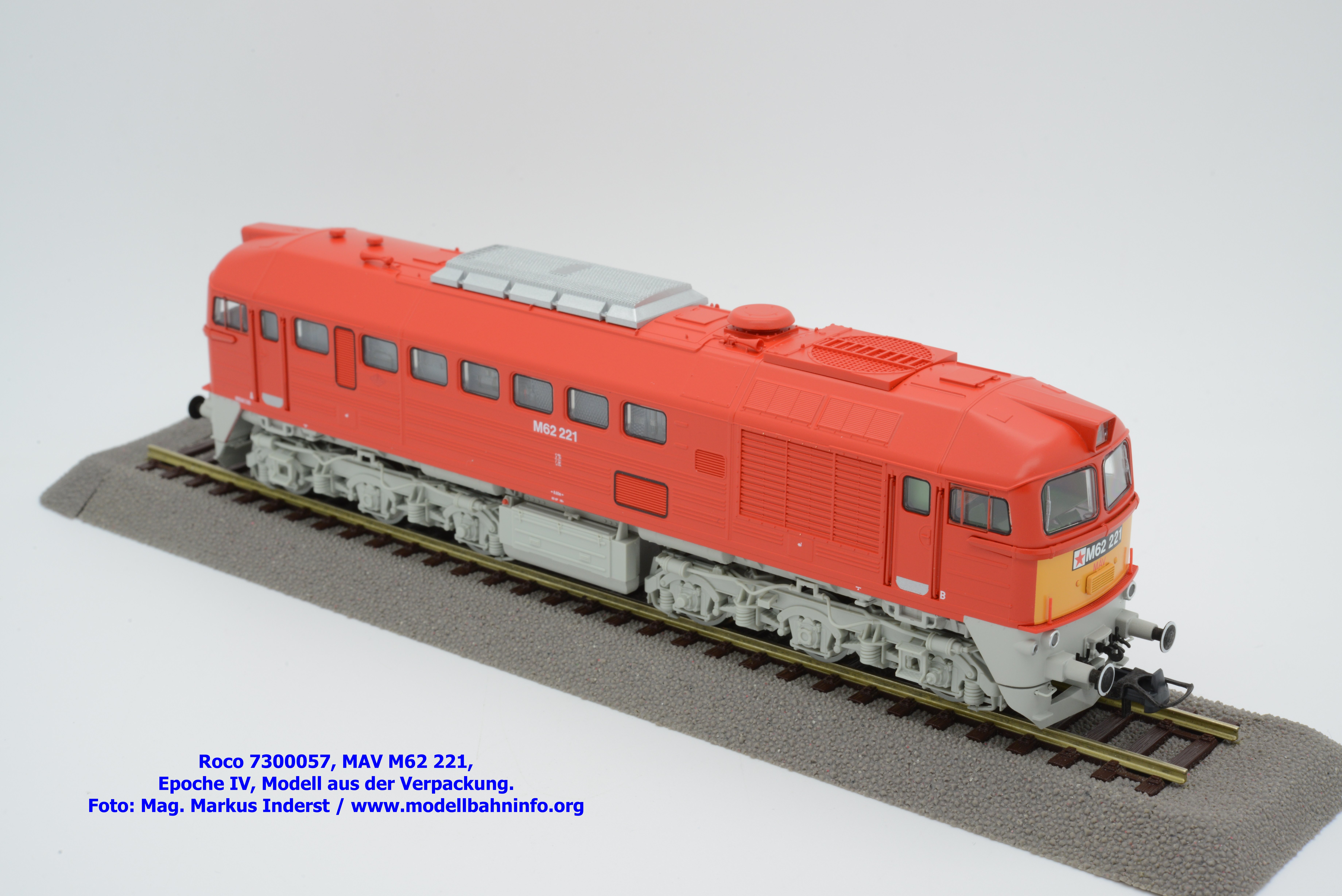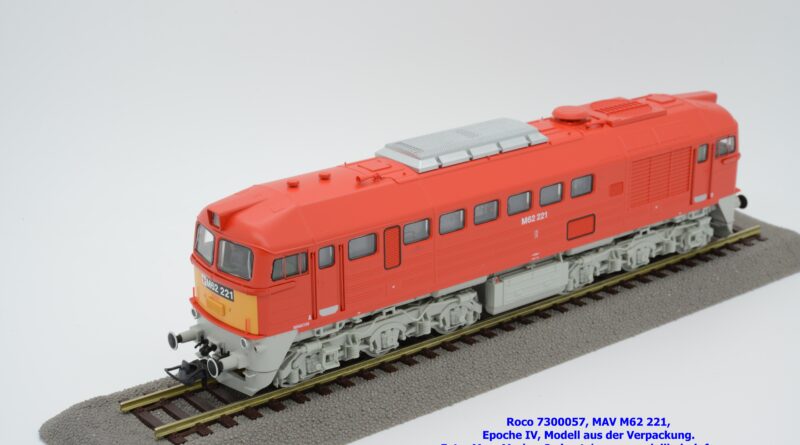 Die Ungarischen Staatsbahnen MAV haben ab dem Jahr 1965 insgesamt 289 Lokomotiven aus Lugansk übernommen und als Baureihe M62 eingereiht. 15 Lokomotiven sind in der Breitspurausführung im Betrieb genommen worden. Die in Ungarn als „Szergej“ bekannten Loks, welche im Jahr der Modellankündigung den 60. Geburtstag in Ungarn feierten, wurden im schweren Güterverkehr eingesetzt und ersetzten somit viele ältere Dampflokbauarten. Die Loks sind heute noch im Betriebseinsatz zu finden und dienten Roco als Vorbild für die aktuelle Modellnachbildung des als M62.221 ausgeführten Modells. Am Modell sind die Untersuchungsdaten mit REV Fm 26. 5.980 angeschrieben. Die Angabe einer Heimatdienststelle fehlt. Roco hat die Szergej nur für das Zweileiter-Gleichstrom-System gefertigt. Die analoge Modellausführung ist zum UVP von € 254,90 erhältlich, wiewohl die digitale Gleichstrom-Lok mit Loksound unter der Artikelnummer 7310057 zum UVP von € 354,90 lieferbar ist. Roco hat hierfür auch ein günstiges Wagenset mit fünf MAV-Güterwagen aus unterschiedlichen Wagentypen (Artikelnummer 6600126, UVP € 149,90) ins Sortiment genommen.