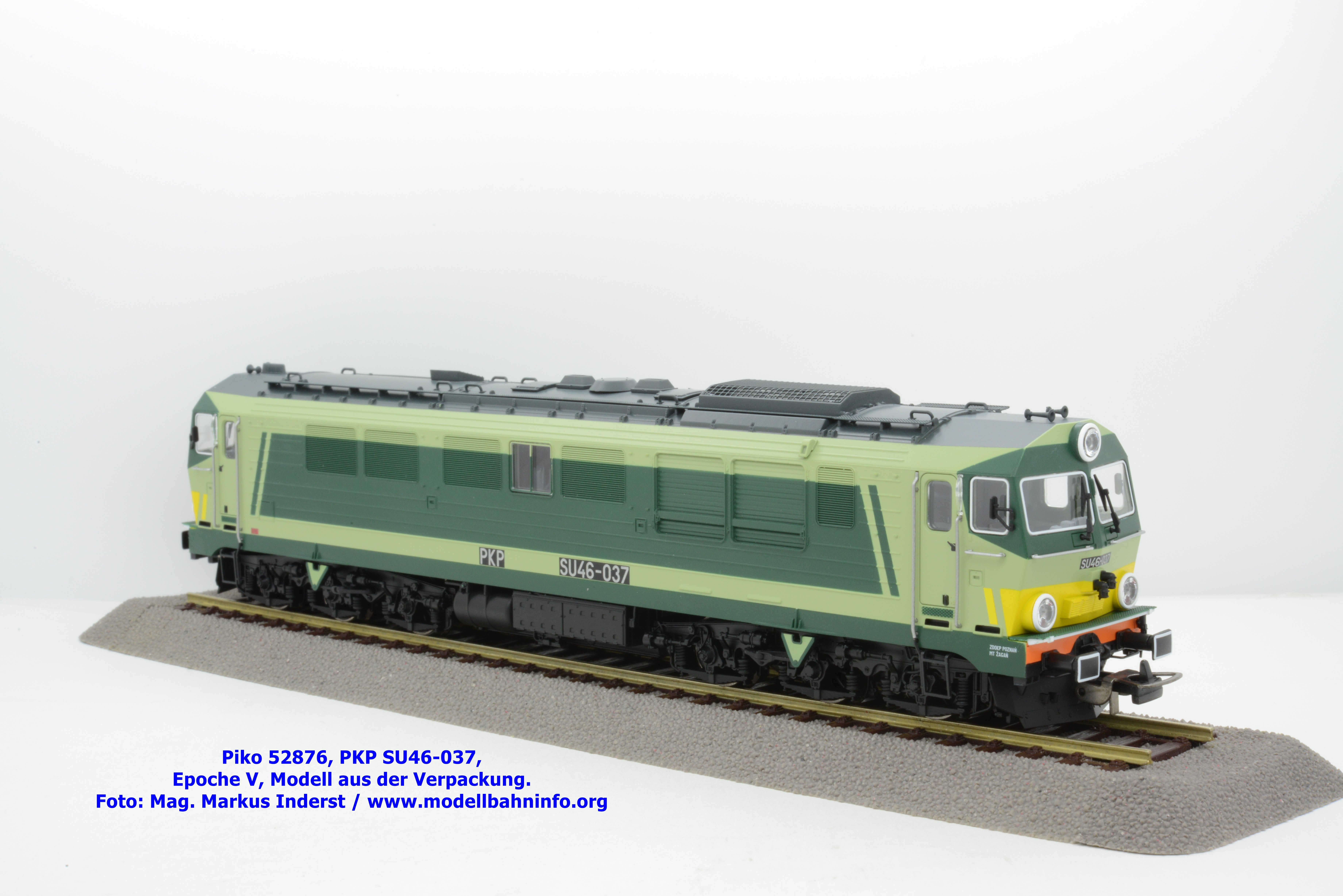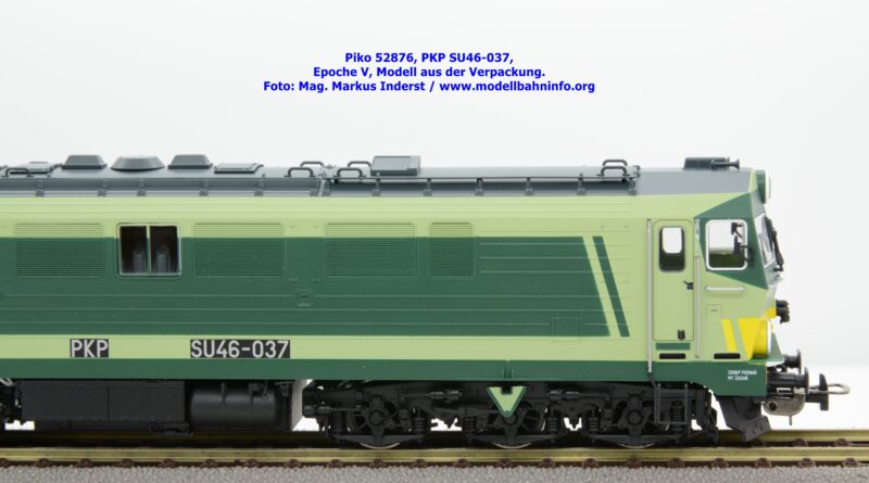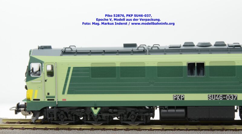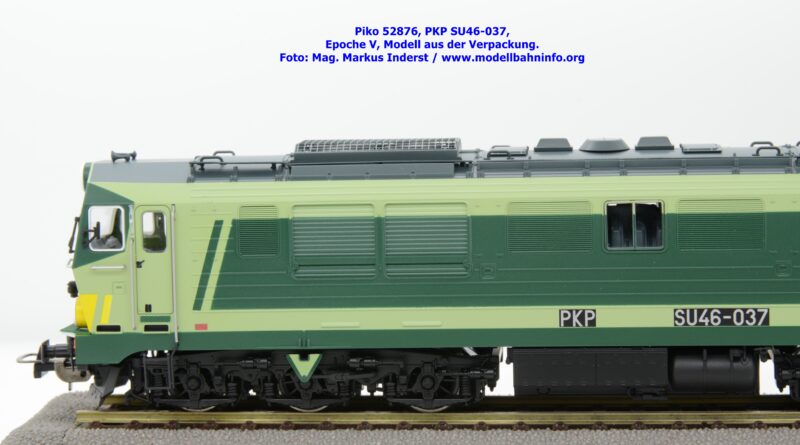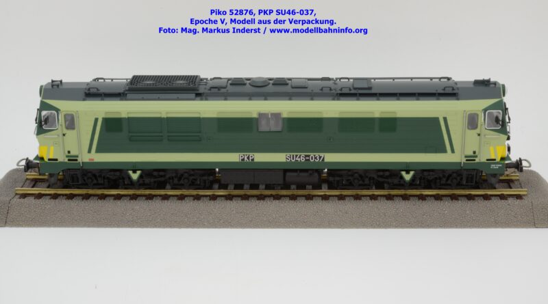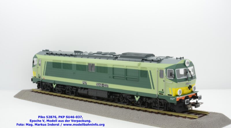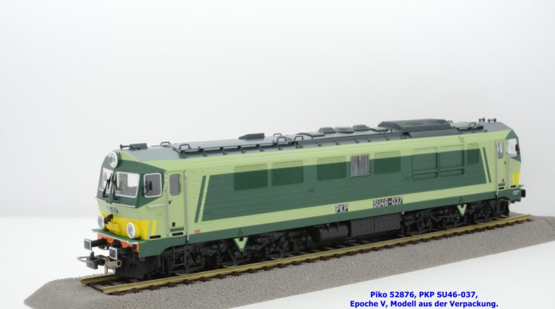 Die vielen Farbdesign bei den Lokomotiven der PKP gestattet Piko auch bei der SU 46 eine weitere Designvariante dieser Diesellok aufzulegen. Das gegenwärtige Modell ist mit den bekannten hellen und dunklen Grüntönen lackiert, wobei auf den Seitenwänden und um die Stirnfenster entsprechende Kontrastflächen lackiert sind. Zusätzlich finden sich an der Stirnfront bei den Scheinwerfern noch gelbe Warnflächen. Das gegenständliche Modell von Piko wurde mit der Betriebsnummer SU46-037 bedruckt, jedoch fehlen konkrete Angaben zur Wartung. Am rechten Rahmenende findet sich lediglich ein Hinweis auf die Heimatdienststelle ZDOKP Poznan MT Zagan. Das neue Modell der SU46-037 ist in zwei Gleichstrom-Ausführungen erhältlich. Die analoge Modellausführung wird unter der Artikelnummer 52876 und zum UVP von € 229,– geführt, die digitale Modellausführung weist die Artikelnummer 52877 und den UVP von € 339,– auf.