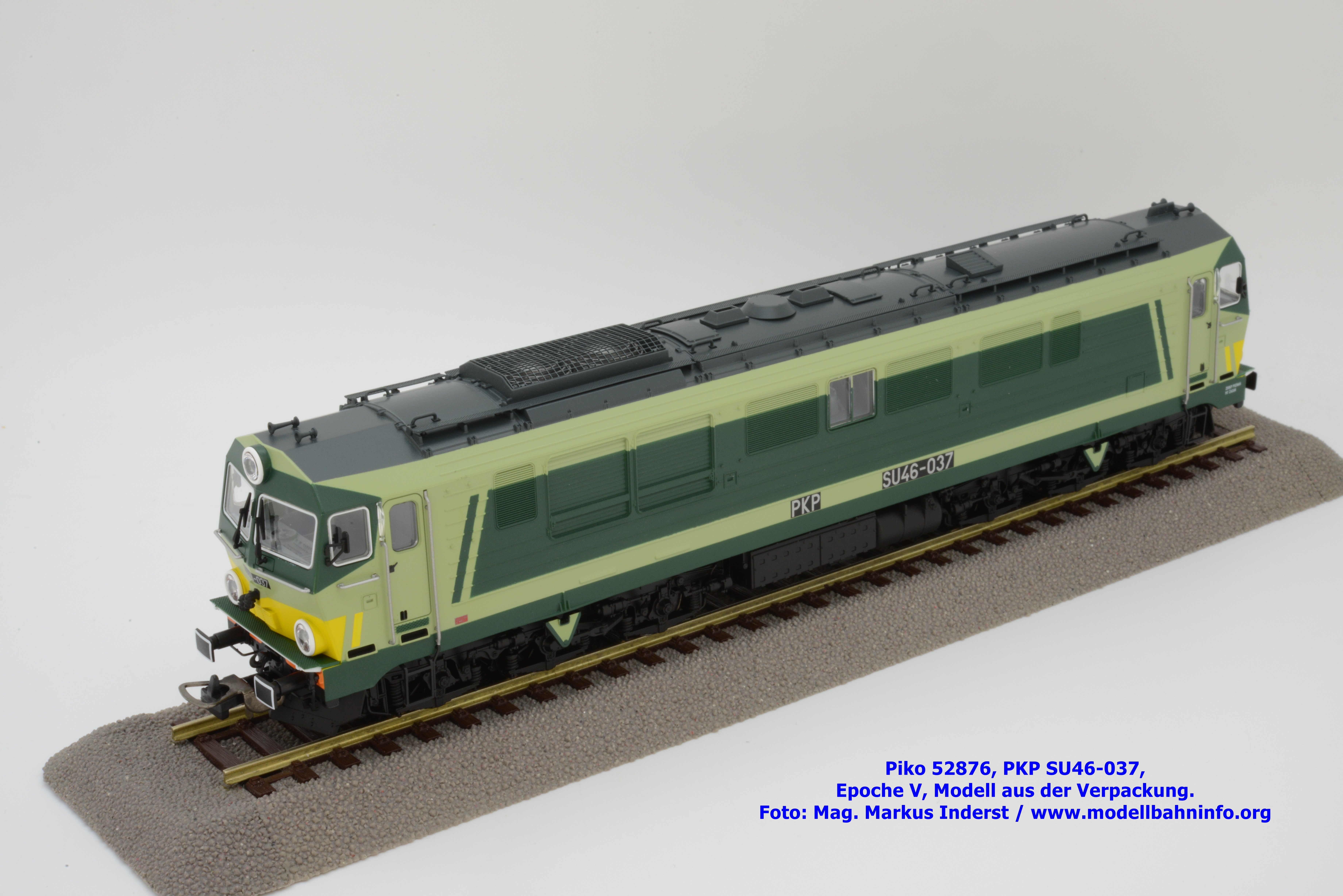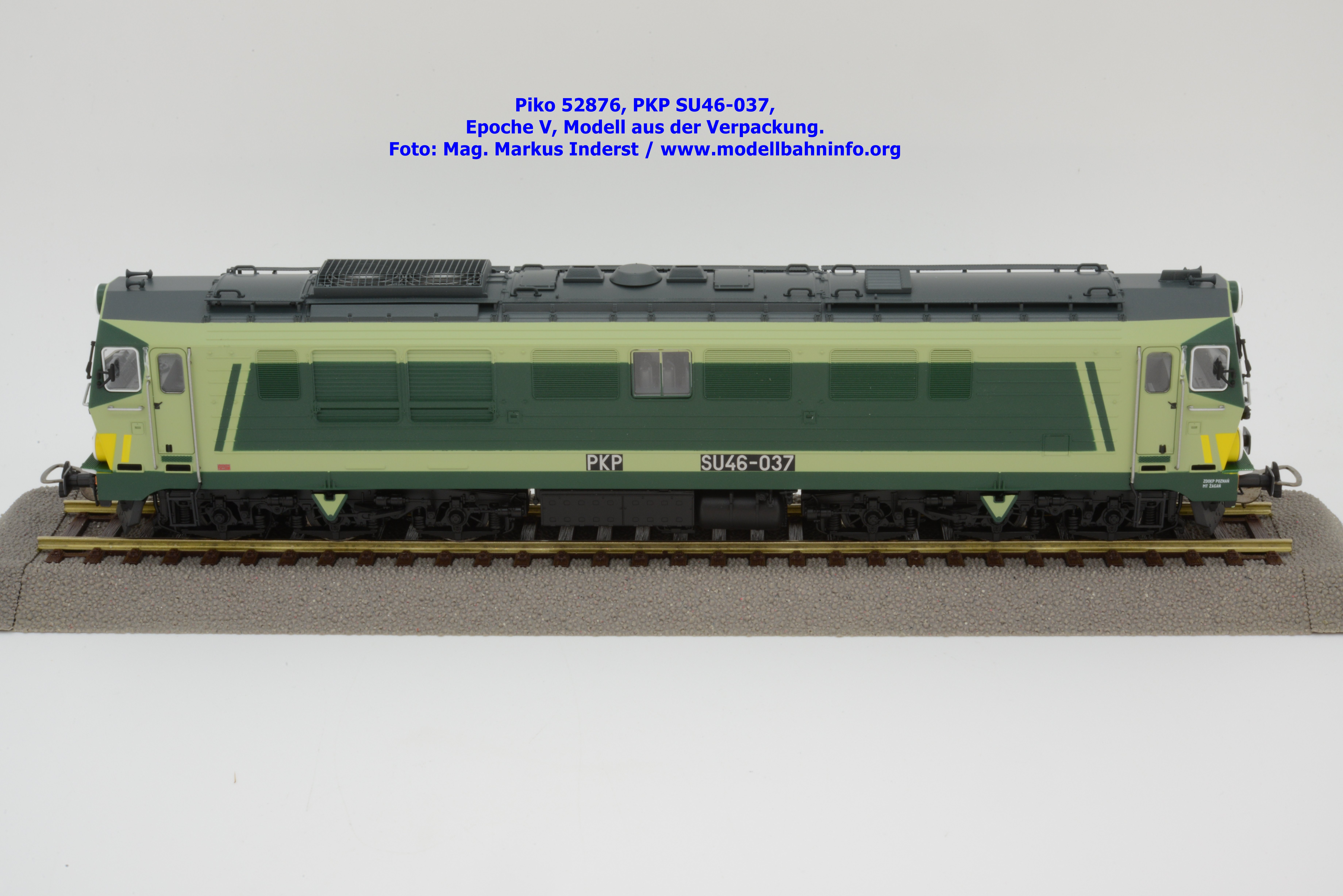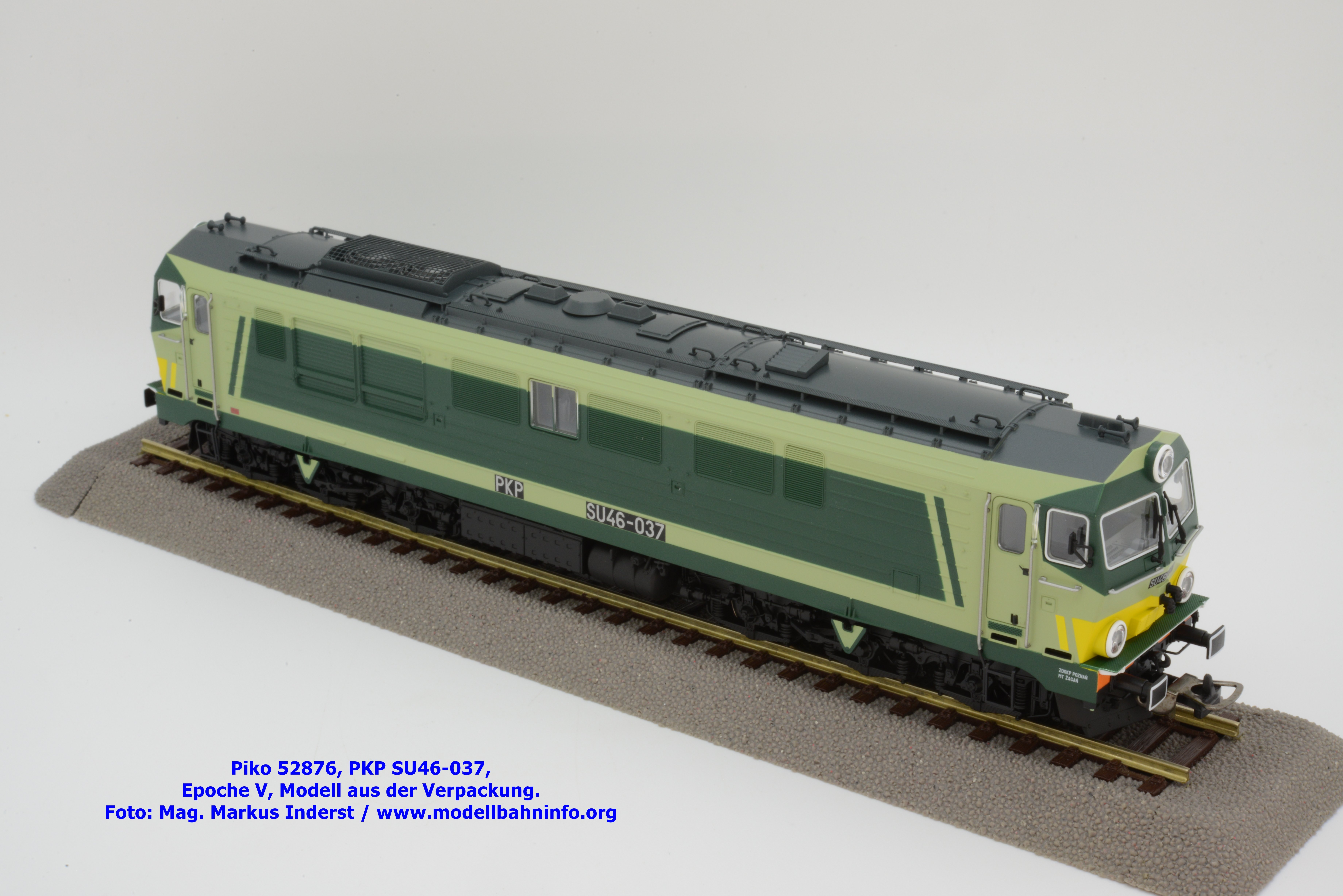 Die vielen Farbdesign bei den Lokomotiven der PKP gestattet Piko auch bei der SU 46 eine weitere Designvariante dieser Diesellok aufzulegen. Das gegenwärtige Modell ist mit den bekannten hellen und dunklen Grüntönen lackiert, wobei auf den Seitenwänden und um die Stirnfenster entsprechende Kontrastflächen lackiert sind. Zusätzlich finden sich an der Stirnfront bei den Scheinwerfern noch gelbe Warnflächen. Das gegenständliche Modell von Piko wurde mit der Betriebsnummer SU46-037 bedruckt, jedoch fehlen konkrete Angaben zur Wartung. Am rechten Rahmenende findet sich lediglich ein Hinweis auf die Heimatdienststelle ZDOKP Poznan MT Zagan. Das neue Modell der SU46-037 ist in zwei Gleichstrom-Ausführungen erhältlich. Die analoge Modellausführung wird unter der Artikelnummer 52876 und zum UVP von € 229,– geführt, die digitale Modellausführung weist die Artikelnummer 52877 und den UVP von € 339,– auf.