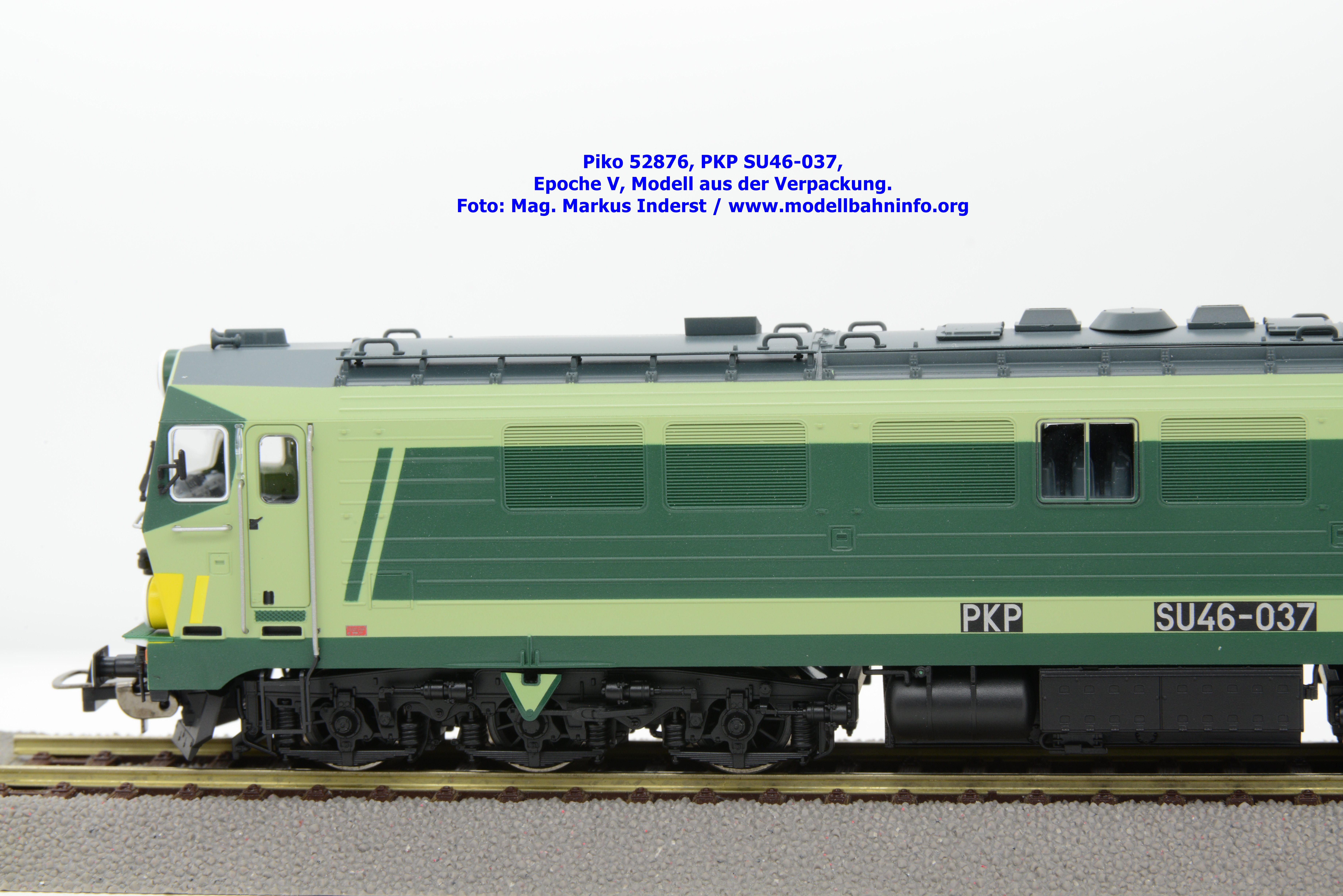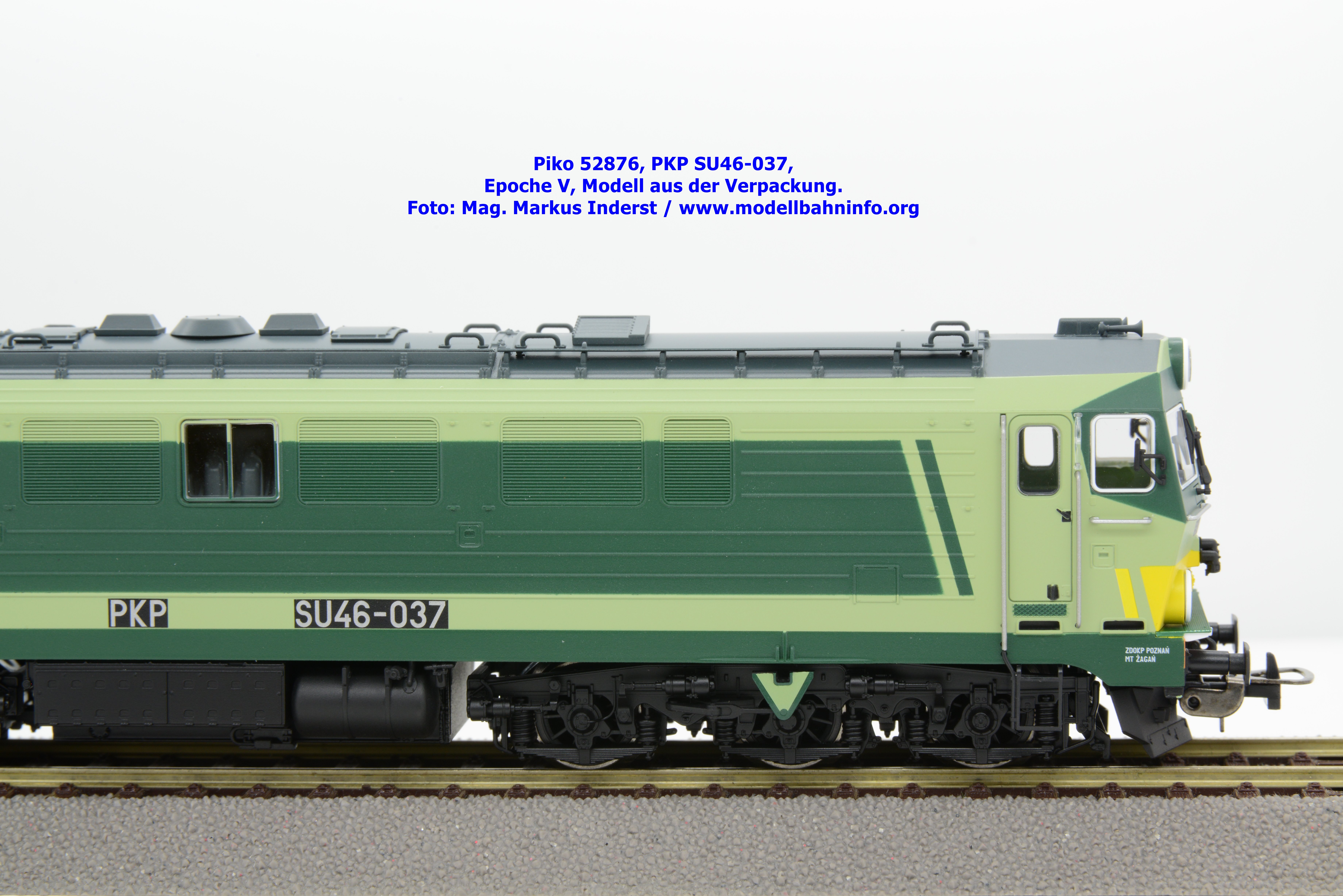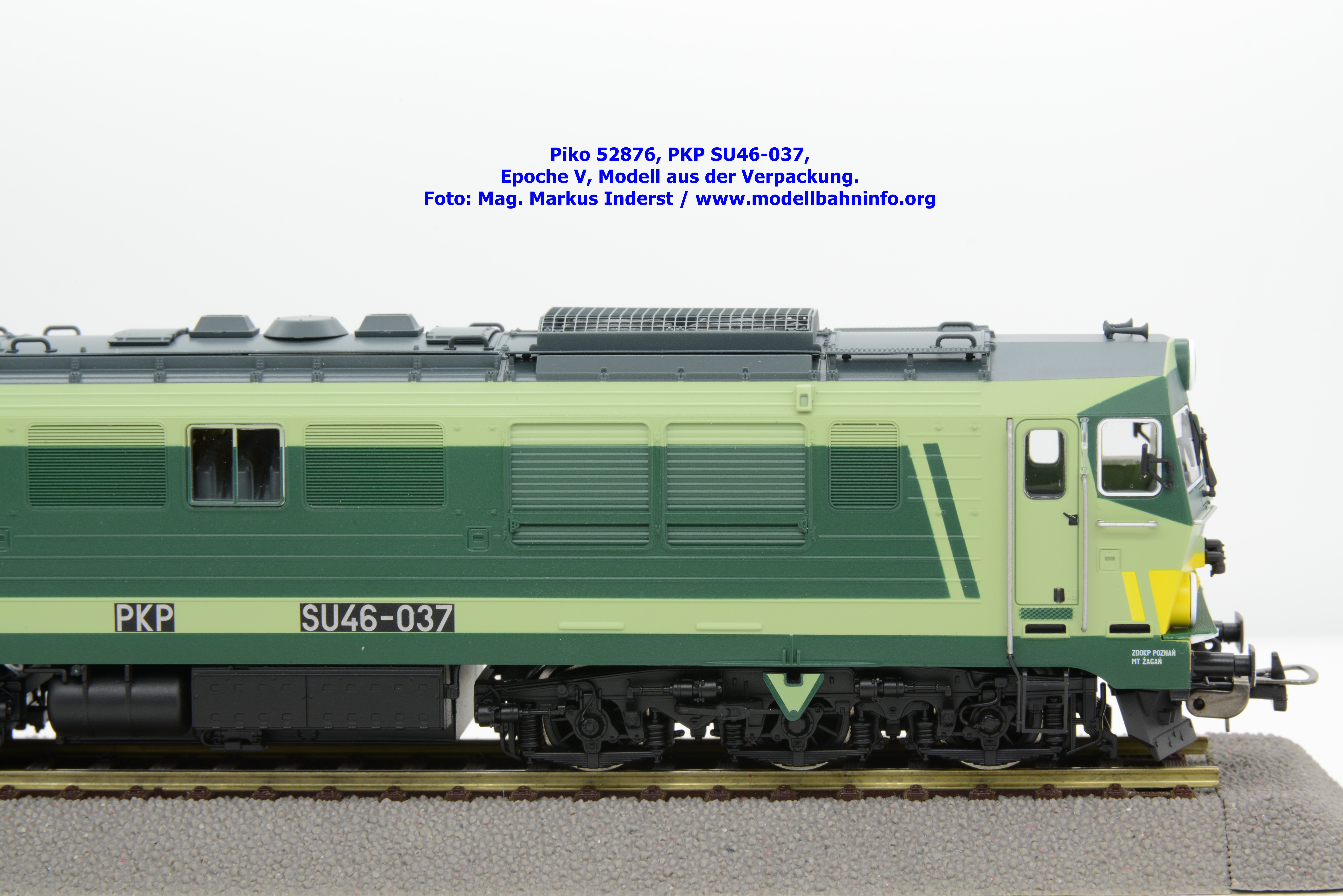 Diese Modellvariante stelle eine Farb- und Beschriftungsvariante zur SU46-012 der PKP dar, welche Piko unter der Artikelnummer 52867 vor zwei Jahren vertrieben hat. Das gegenständliche Modell der SU 46-009 verfügt über die gleiche Farbaufteilung, ist allerdings in den Farben hellgrün/dunkelgrün lackiert und gilt somit als Vertreterin der Epoche V. Im Piko-Neuheitenkatalog wird die epochenmäßigen Einstufung mit IV angegeben, aber aufgrund der Fahrzeuganschriften ist diese eindeutig der späteren Epoche V nach der Jahrtausendwechsel einzustufen. Die SU 46-009 ist mit dem Untersuchungsdatum vom 06.09.2004 am Fahrzeugrahmen bedruckt, beheimatet ist die Maschine in Zaklad Taboru w Gdyni. Unter der Artikelnummer 52870 ist das Modell ohne Loksound erschienen, welches nunmehr bei Auslieferung zum UVP von € 199,– vertrieben wird, währenddessen das Modell mit Loksound mit der Artikelnummer 52871 zum UVP € 315,– angeboten wird.