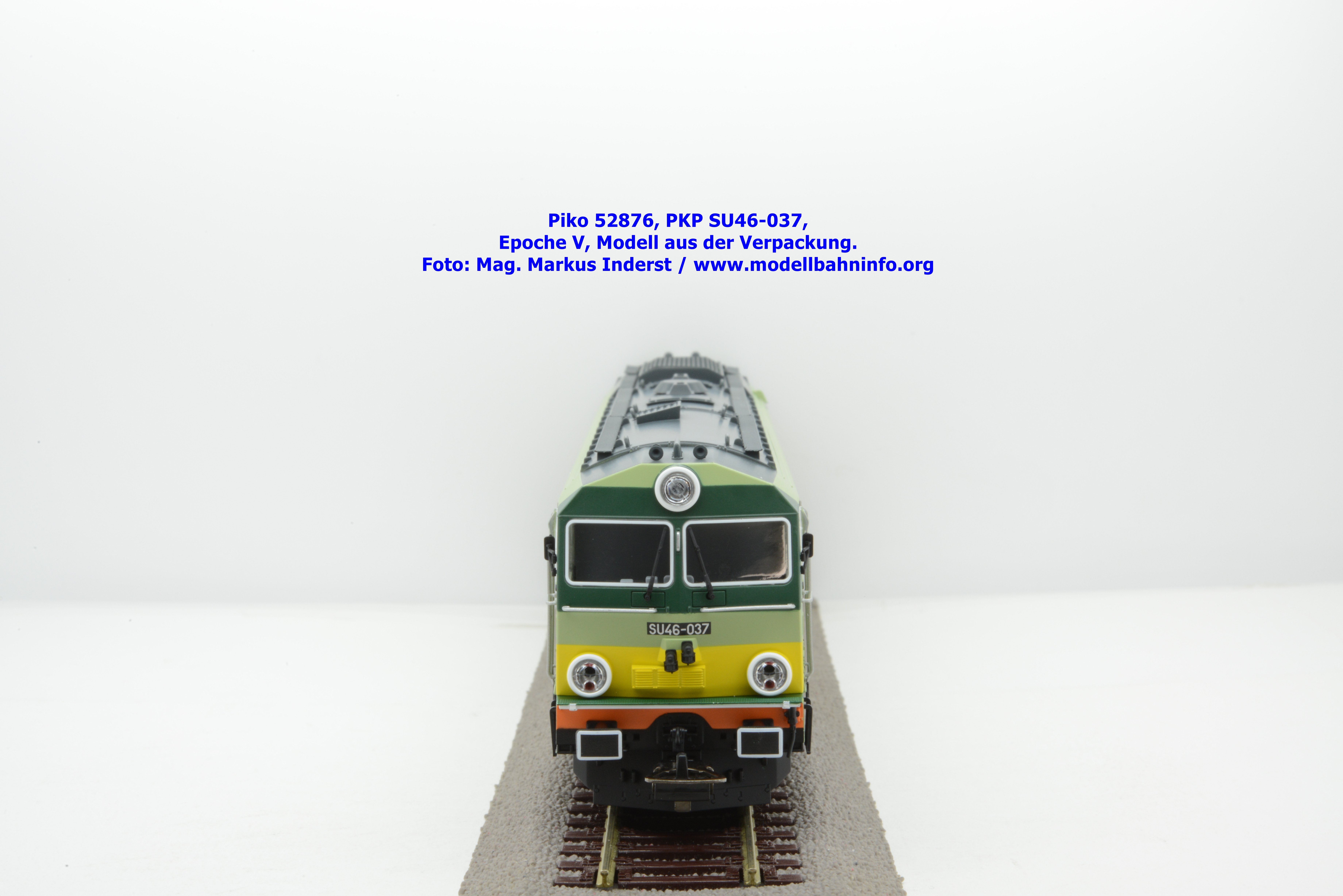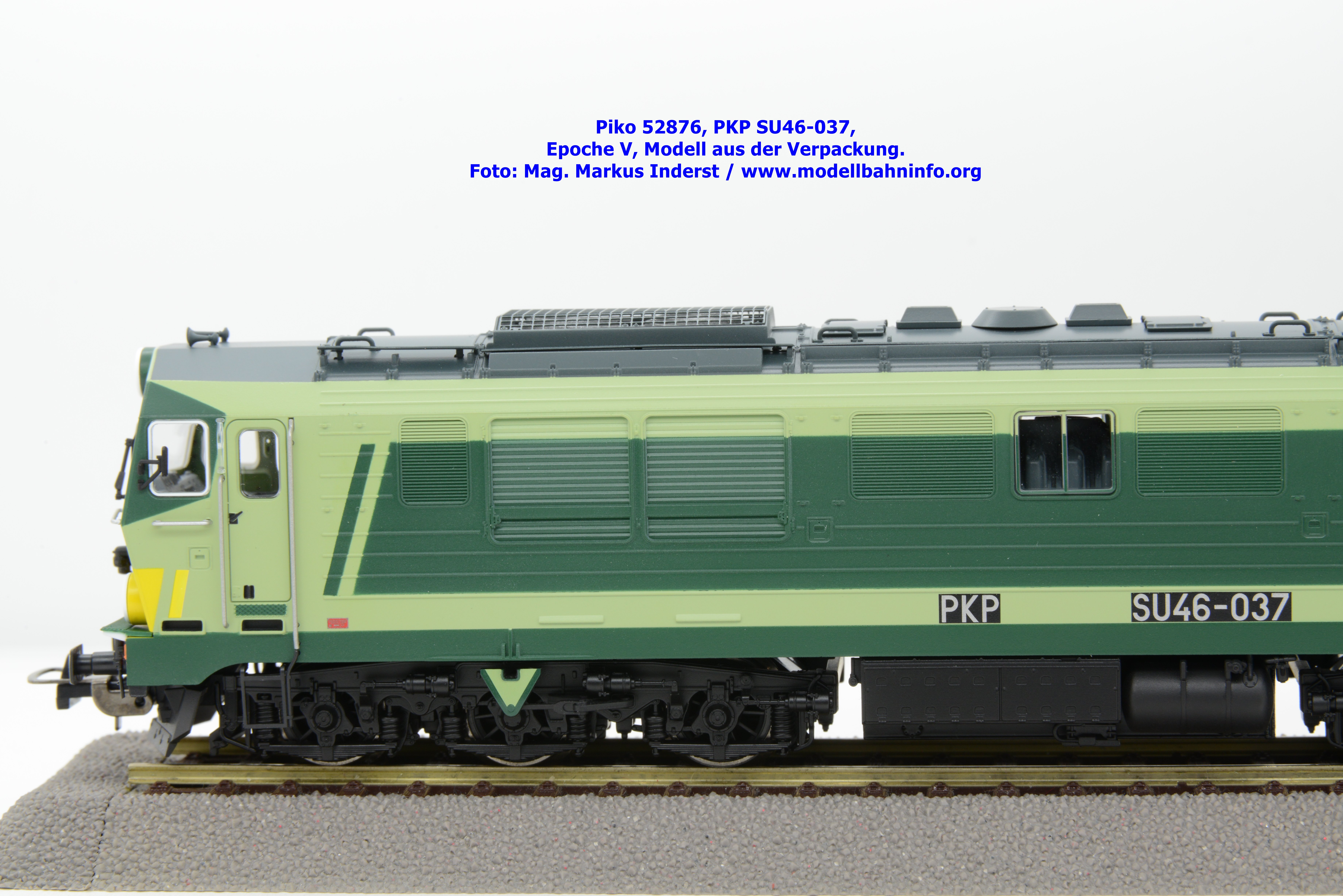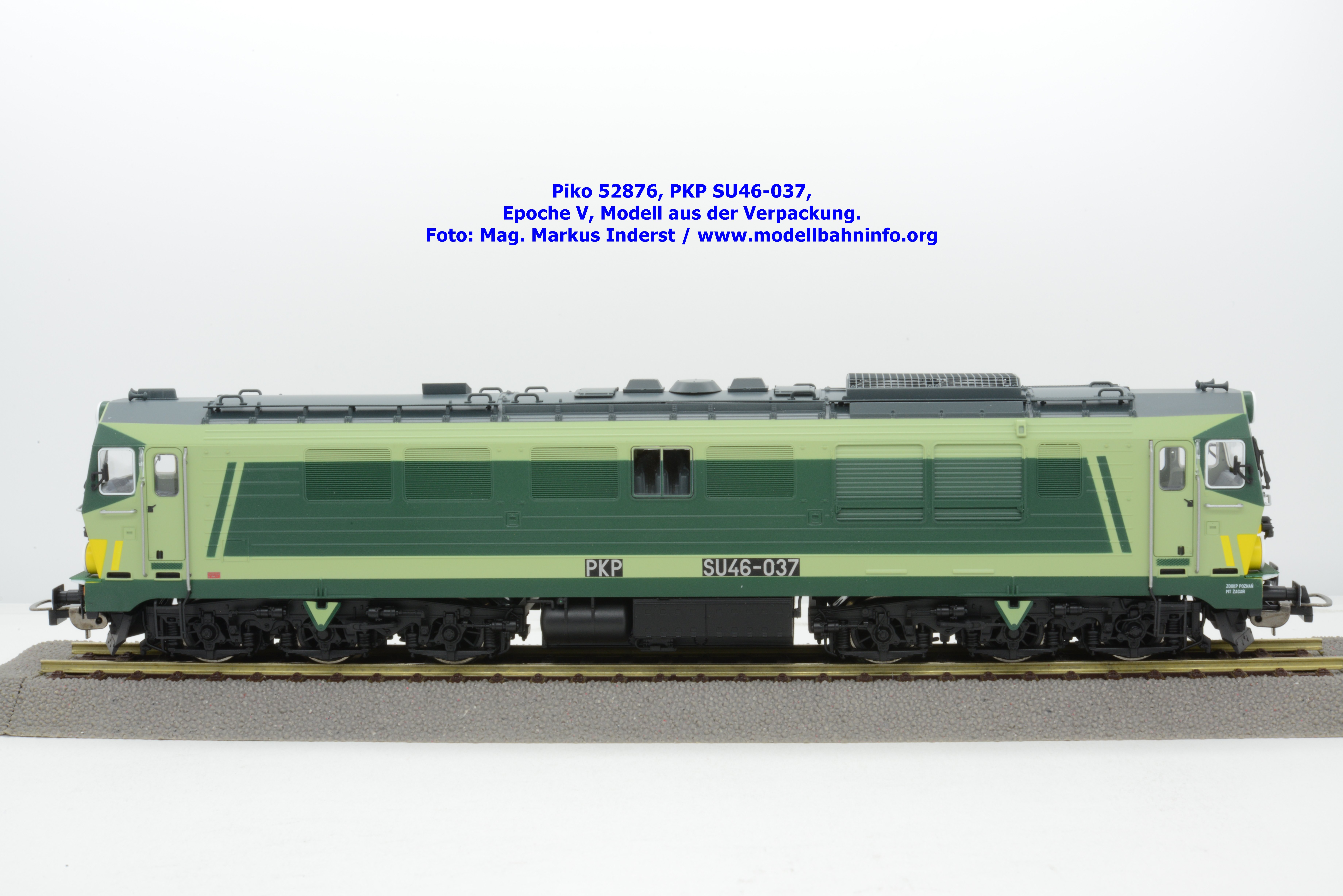 Diese Modellvariante stelle eine Farb- und Beschriftungsvariante zur SU46-012 der PKP dar, welche Piko unter der Artikelnummer 52867 vor zwei Jahren vertrieben hat. Das gegenständliche Modell der SU 46-009 verfügt über die gleiche Farbaufteilung, ist allerdings in den Farben hellgrün/dunkelgrün lackiert und gilt somit als Vertreterin der Epoche V. Im Piko-Neuheitenkatalog wird die epochenmäßigen Einstufung mit IV angegeben, aber aufgrund der Fahrzeuganschriften ist diese eindeutig der späteren Epoche V nach der Jahrtausendwechsel einzustufen. Die SU 46-009 ist mit dem Untersuchungsdatum vom 06.09.2004 am Fahrzeugrahmen bedruckt, beheimatet ist die Maschine in Zaklad Taboru w Gdyni. Unter der Artikelnummer 52870 ist das Modell ohne Loksound erschienen, welches nunmehr bei Auslieferung zum UVP von € 199,– vertrieben wird, währenddessen das Modell mit Loksound mit der Artikelnummer 52871 zum UVP € 315,– angeboten wird.