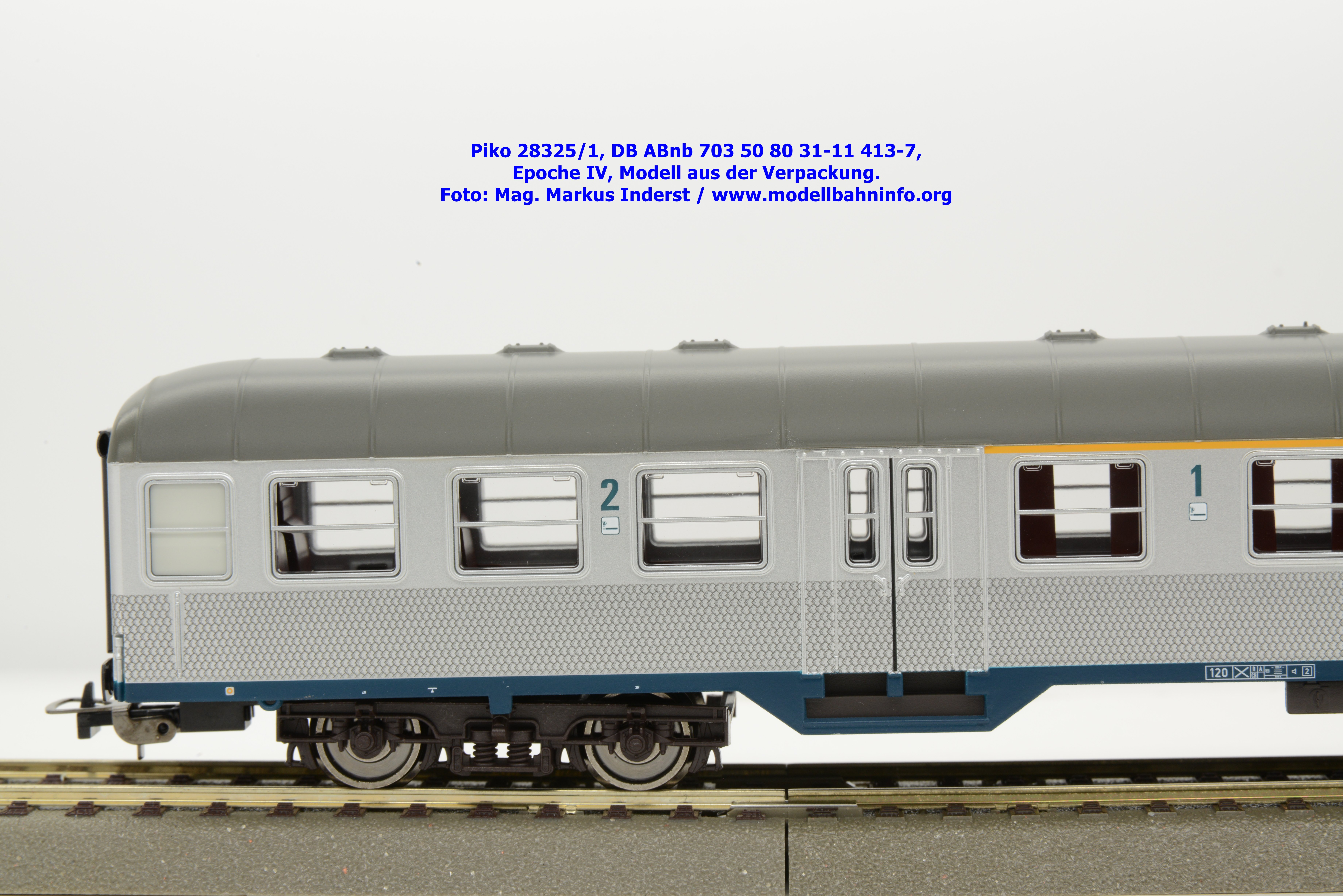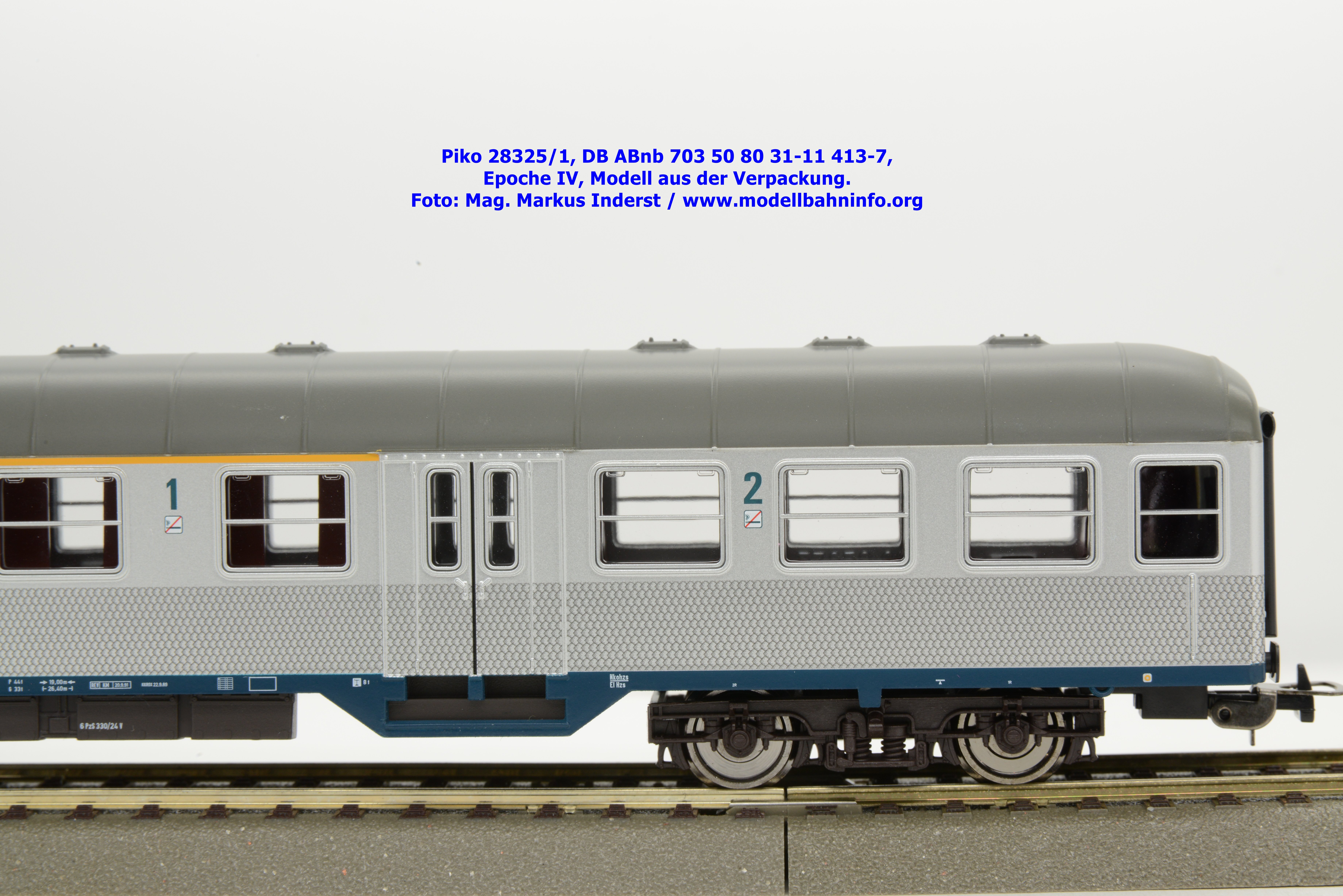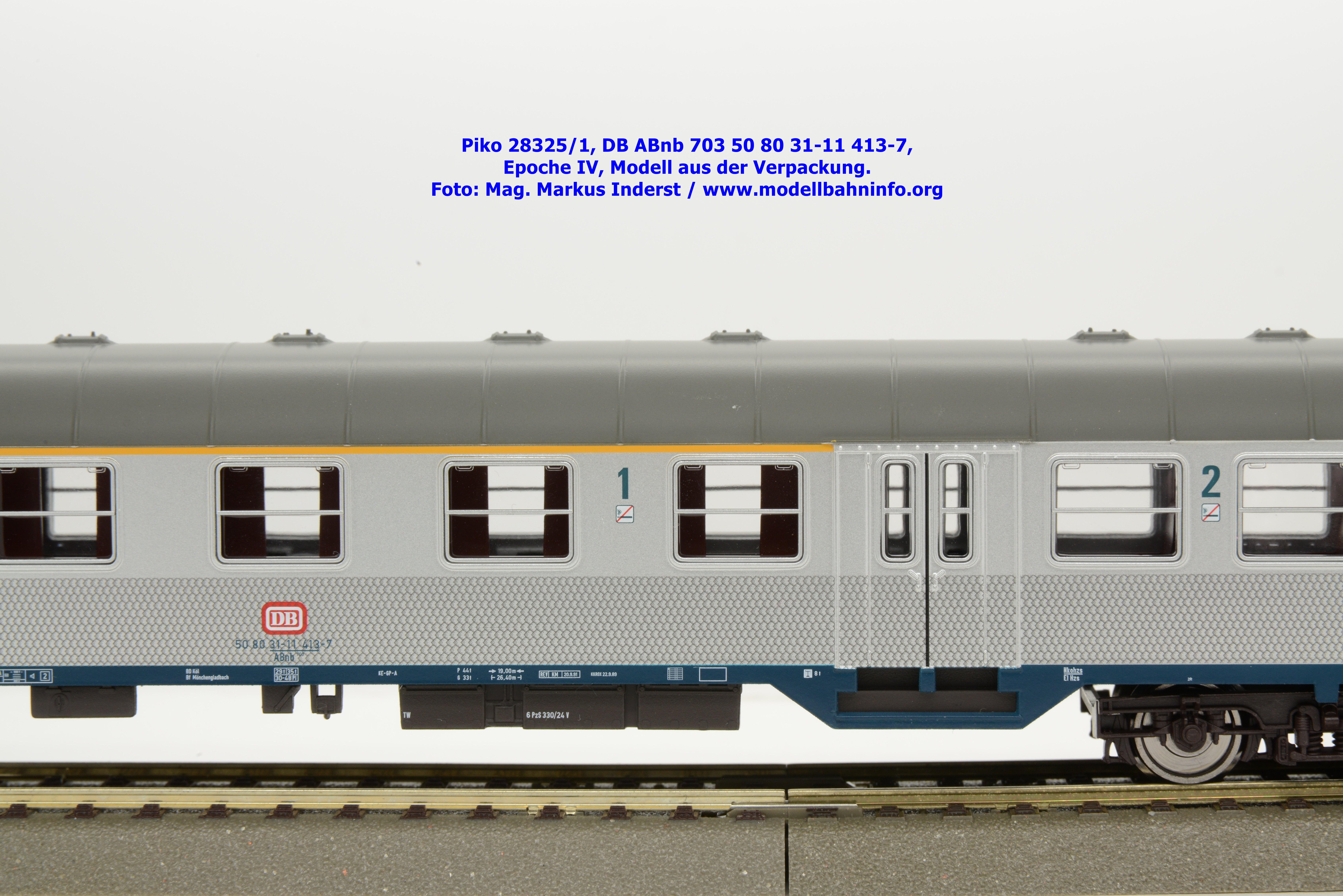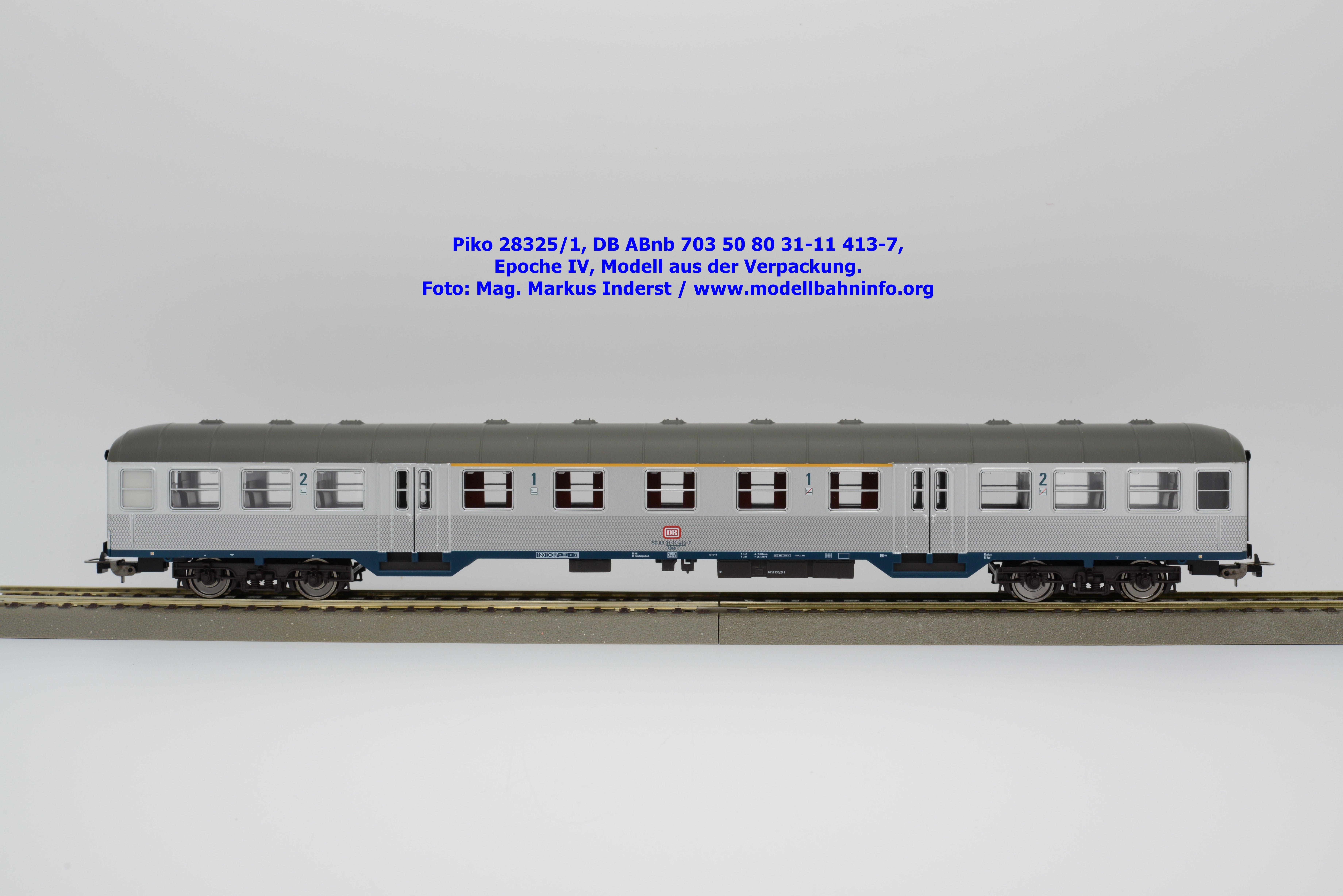 Der bestehende Formenschatz des Sonneberger Herstellers ermöglicht die Fertigung dieses zweiteiligen Wagensets. Dieses besteht aus einem 1./2. Klasse Silberling mit der Gattungsbezeichnung ABnb 703 und einem 2. Klasse Schnellzugwagen Bm 232 in ozeanblau/beiger Farbgebung. Doch eines haben beide Modelle gemeinsam, und zwar den roten DB-Keks als Eigentumskennung. Der ABnb 703 ist mit der Wagennummer 50 80 31-11 413-7 bedruckt und gehört somit der Epoche IV an. Die Heimatdienststelle ist Mönchengladbach, der Zur BD Köln gehört. Im Revisionsraster stehen die Untersuchungsdaten REV KM 20. 9.91 bzw. KKROX 22. 9.89. Nachdem dieser Wagen Teil eines zweiteiligen Wagensets ist, beträgt der UVP € 129,–.
