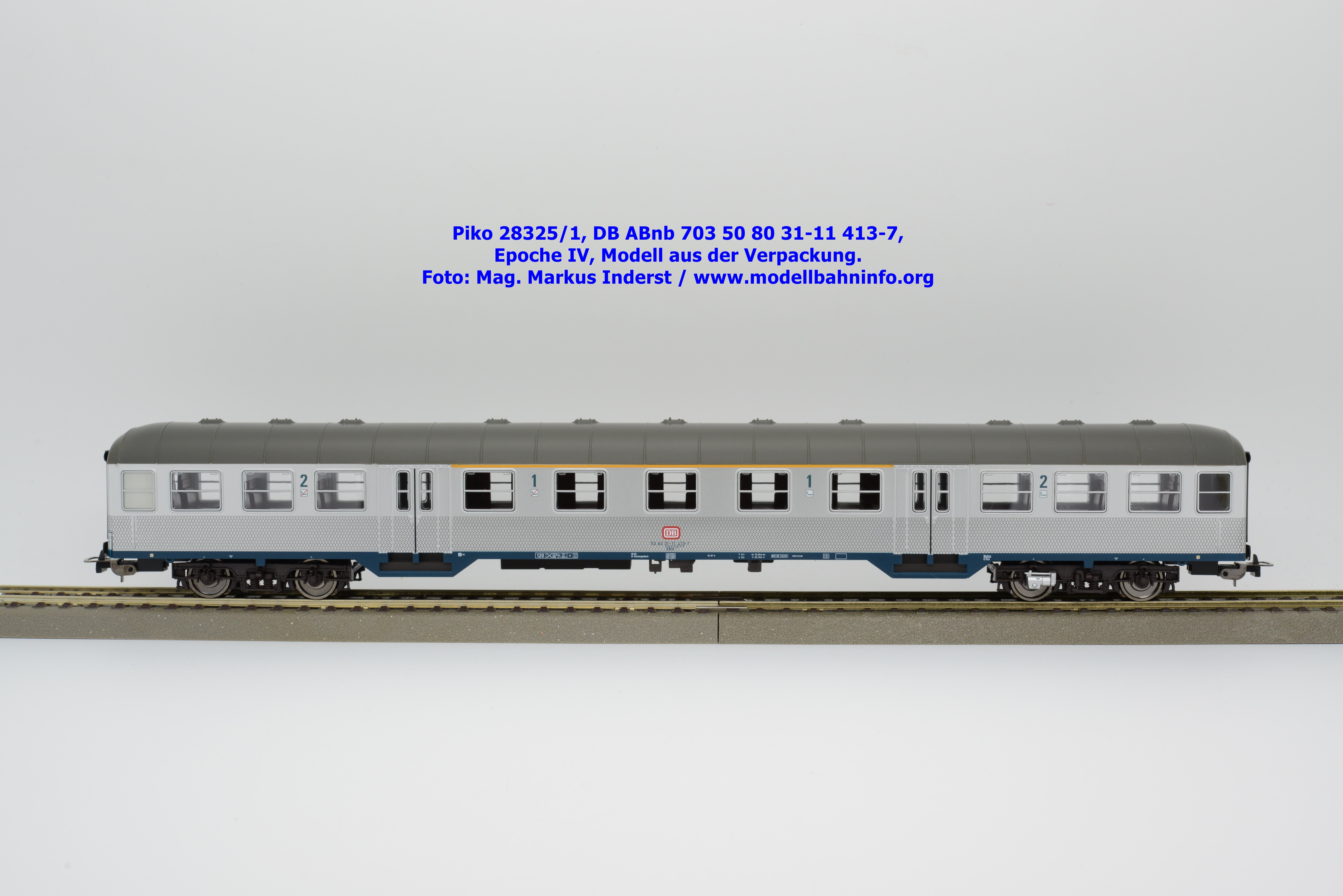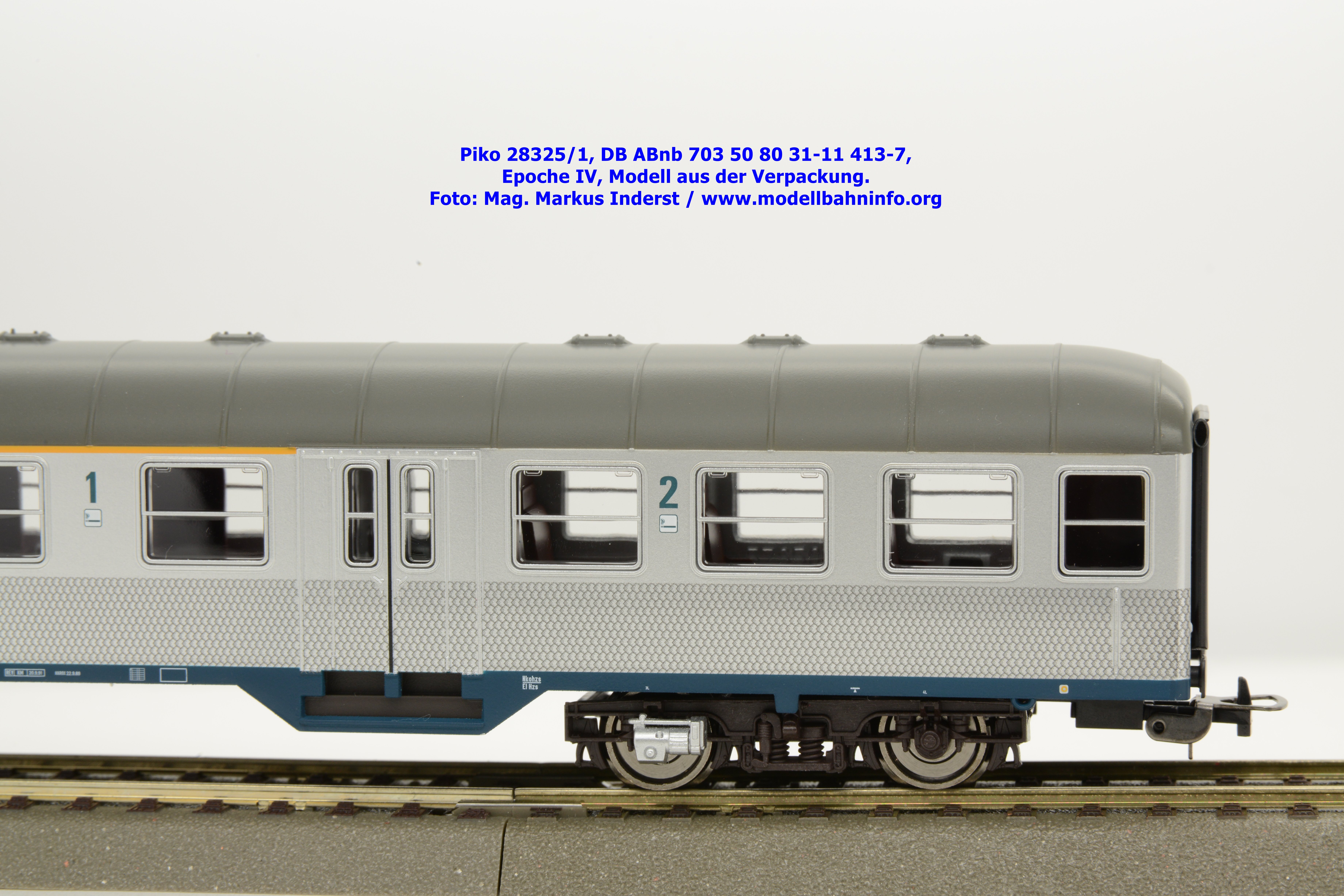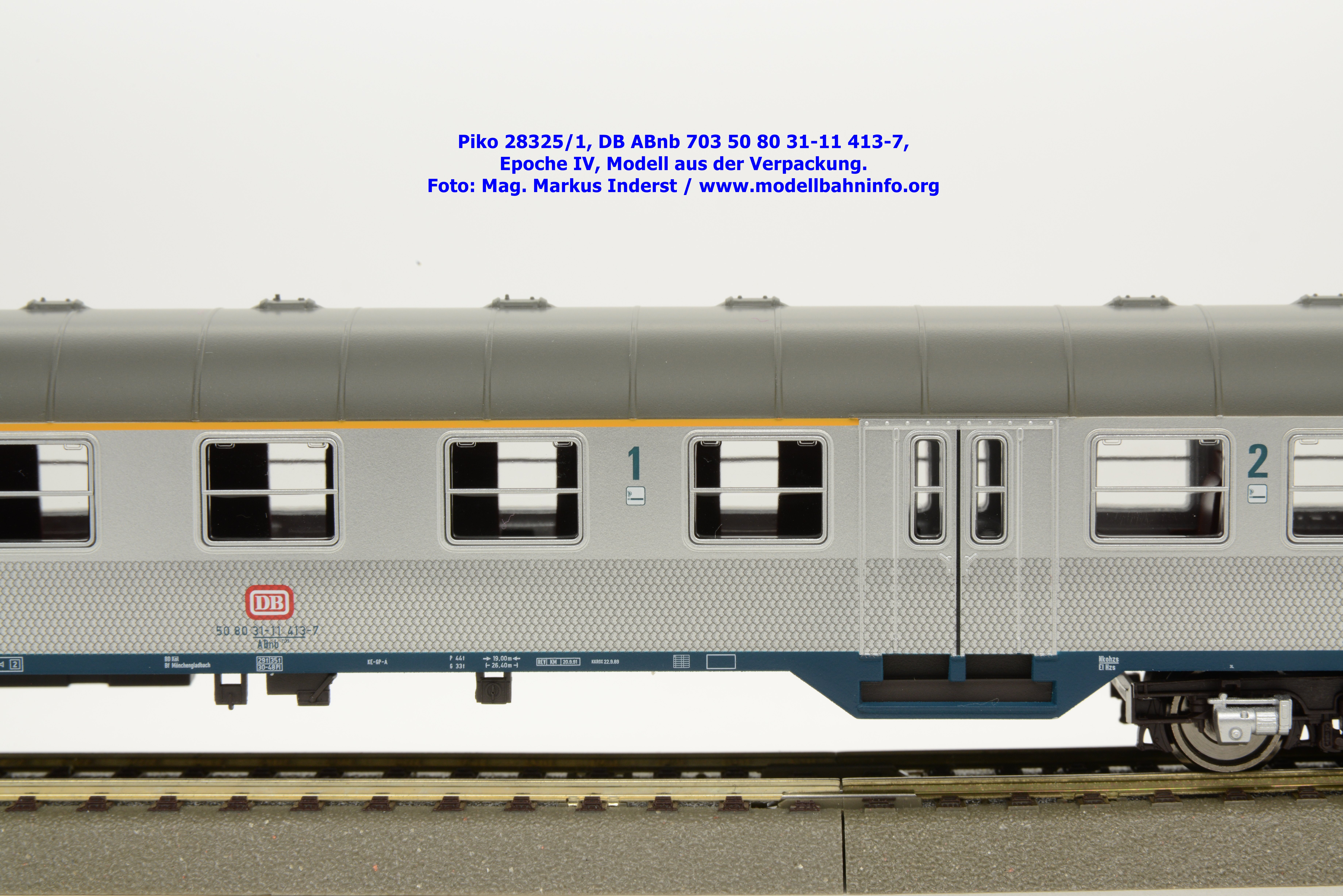 Der bestehende Formenschatz des Sonneberger Herstellers ermöglicht die Fertigung dieses zweiteiligen Wagensets. Dieses besteht aus einem 1./2. Klasse Silberling mit der Gattungsbezeichnung ABnb 703 und einem 2. Klasse Schnellzugwagen Bm 232 in ozeanblau/beiger Farbgebung. Doch eines haben beide Modelle gemeinsam, und zwar den roten DB-Keks als Eigentumskennung. Der ABnb 703 ist mit der Wagennummer 50 80 31-11 413-7 bedruckt und gehört somit der Epoche IV an. Die Heimatdienststelle ist Mönchengladbach, der Zur BD Köln gehört. Im Revisionsraster stehen die Untersuchungsdaten REV KM 20. 9.91 bzw. KKROX 22. 9.89. Nachdem dieser Wagen Teil eines zweiteiligen Wagensets ist, beträgt der UVP € 129,–.