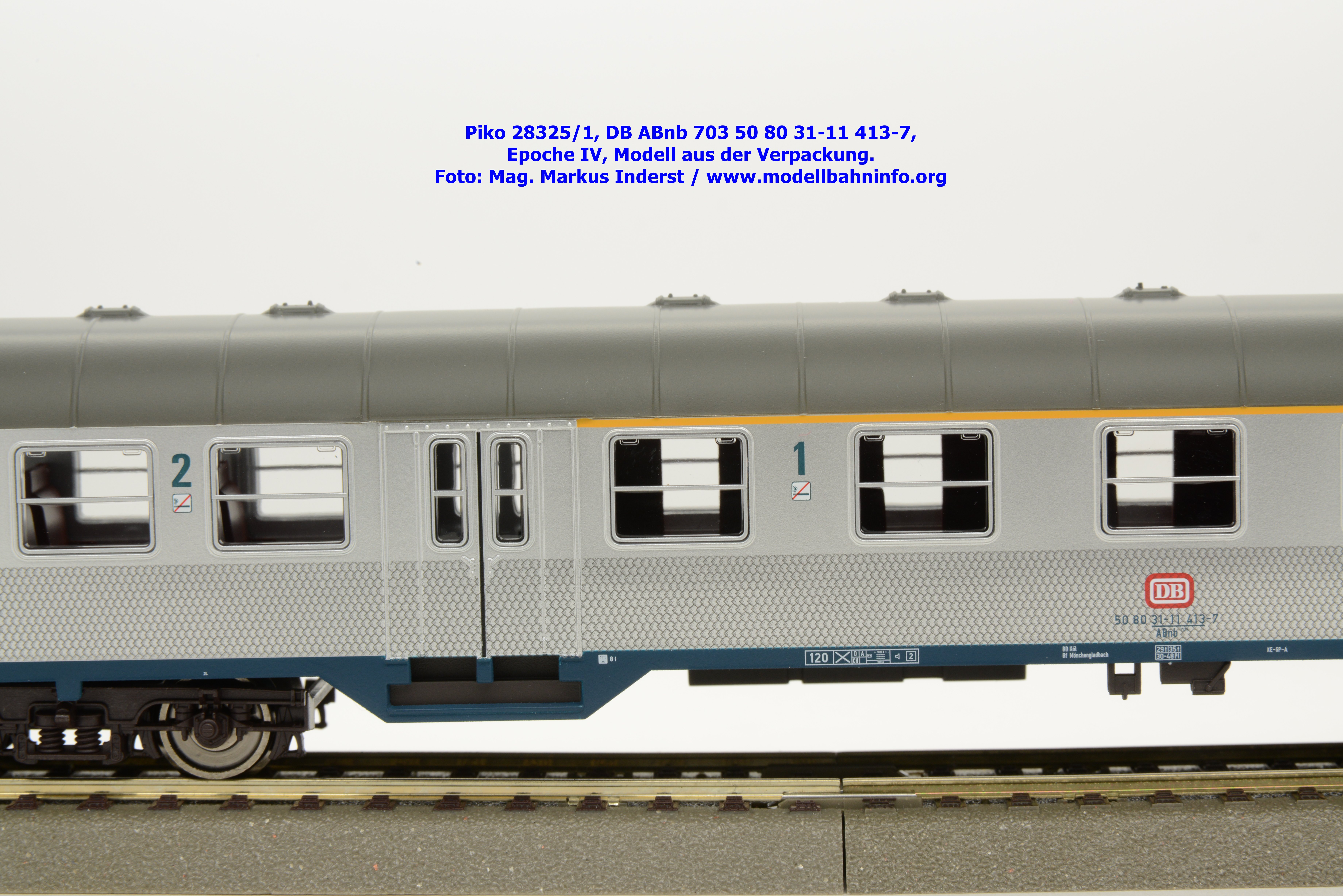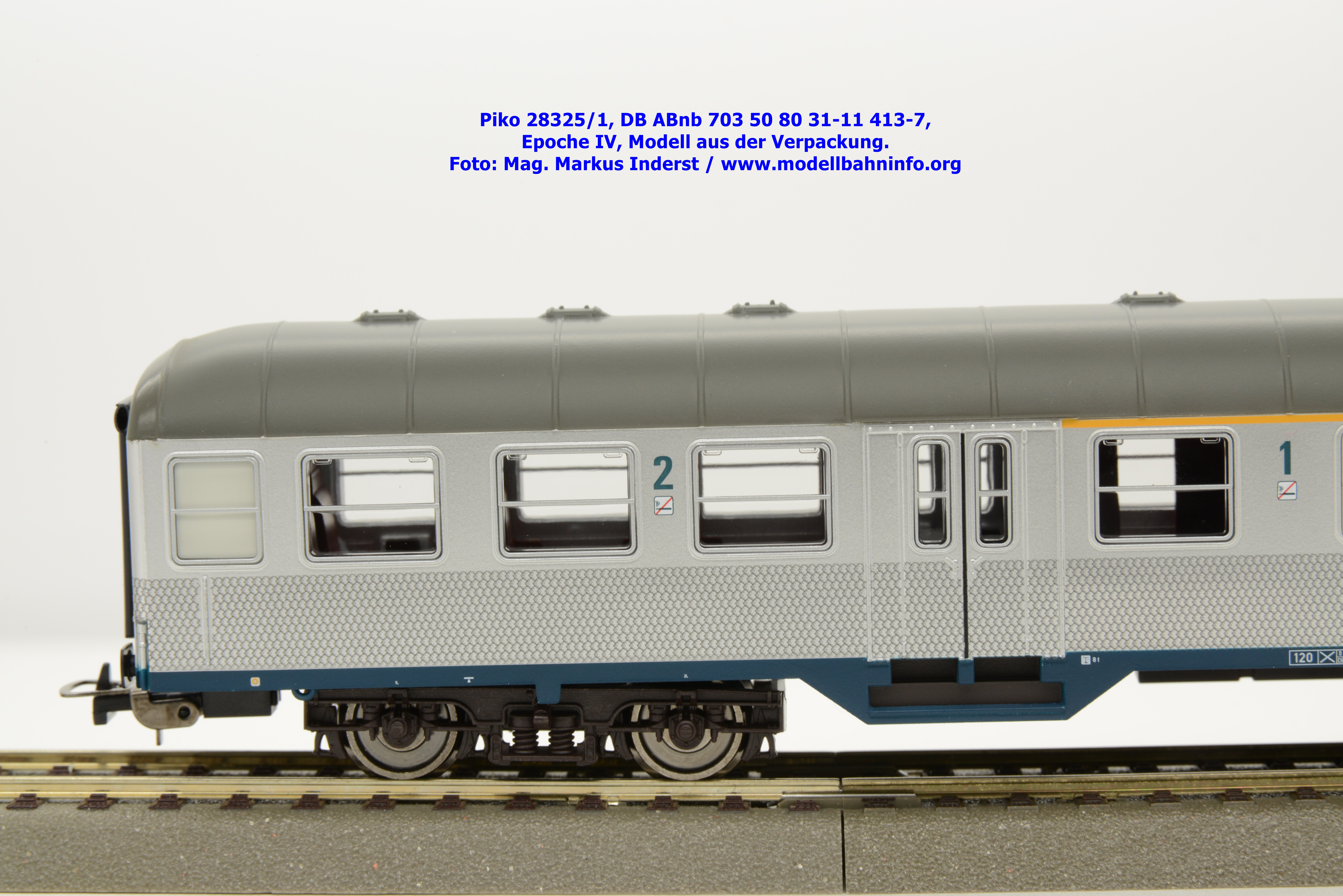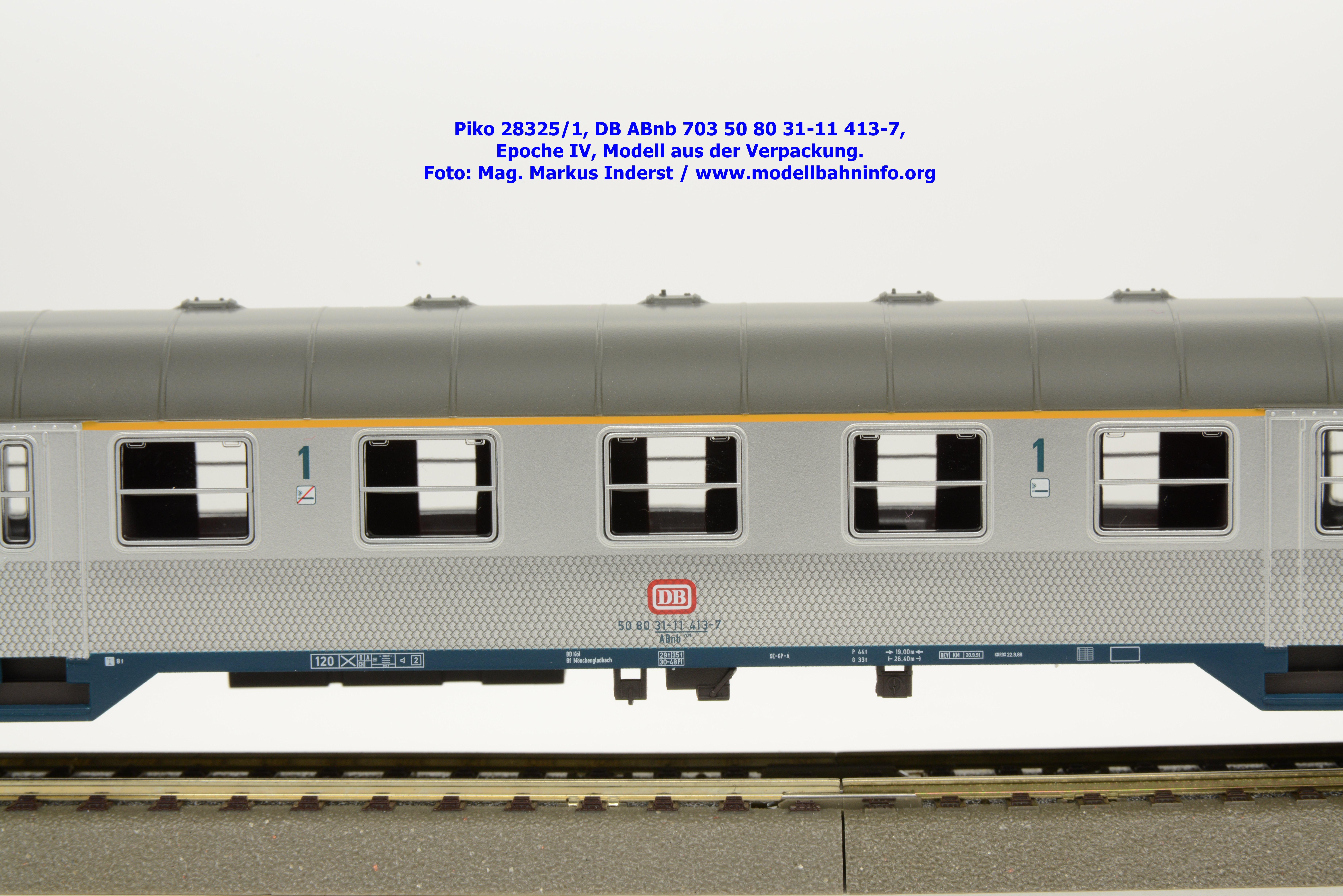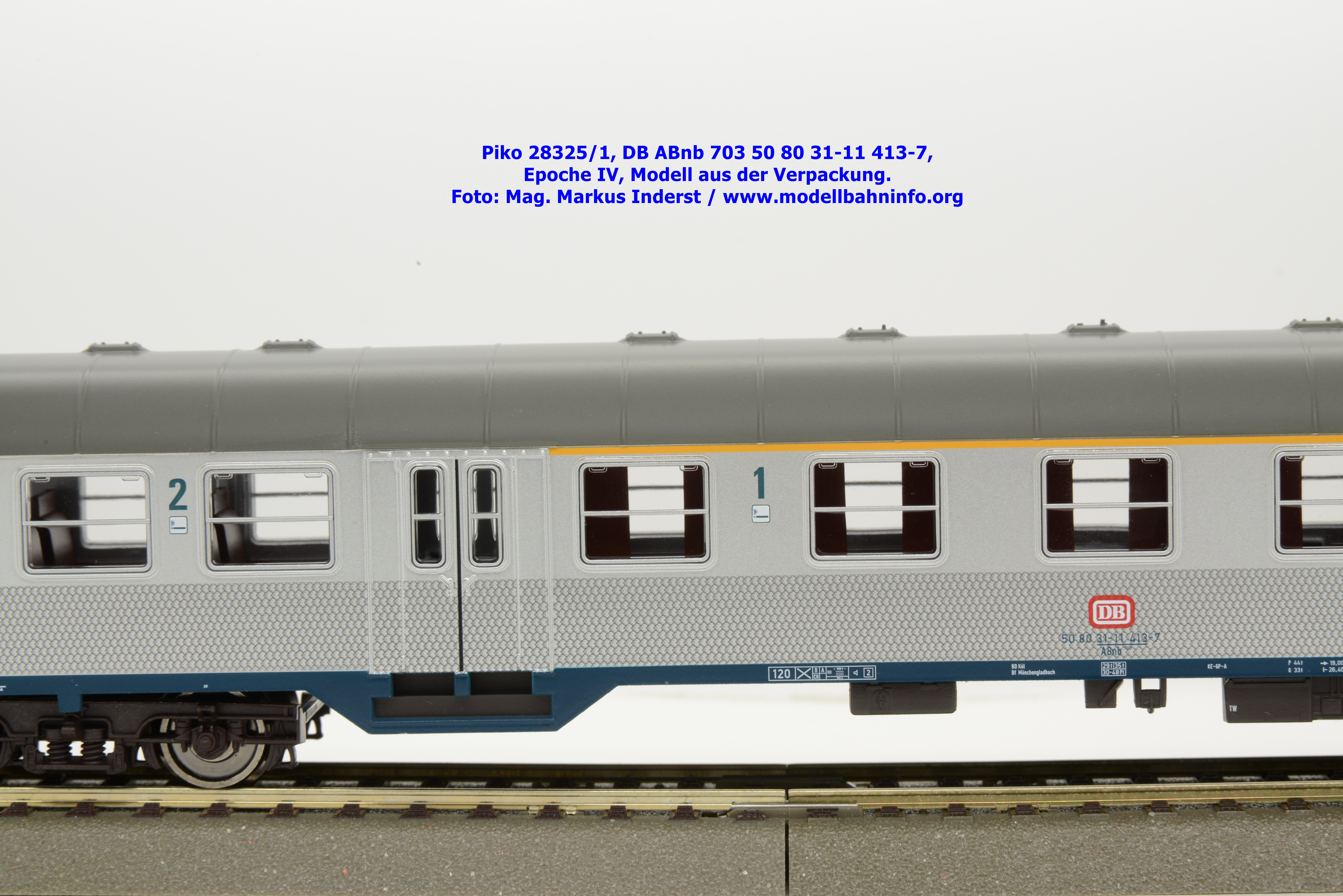 Der bestehende Formenschatz des Sonneberger Herstellers ermöglicht die Fertigung dieses zweiteiligen Wagensets. Dieses besteht aus einem 1./2. Klasse Silberling mit der Gattungsbezeichnung ABnb 703 und einem 2. Klasse Schnellzugwagen Bm 232 in ozeanblau/beiger Farbgebung. Doch eines haben beide Modelle gemeinsam, und zwar den roten DB-Keks als Eigentumskennung. Der ABnb 703 ist mit der Wagennummer 50 80 31-11 413-7 bedruckt und gehört somit der Epoche IV an. Die Heimatdienststelle ist Mönchengladbach, der Zur BD Köln gehört. Im Revisionsraster stehen die Untersuchungsdaten REV KM 20. 9.91 bzw. KKROX 22. 9.89. Nachdem dieser Wagen Teil eines zweiteiligen Wagensets ist, beträgt der UVP € 129,–.