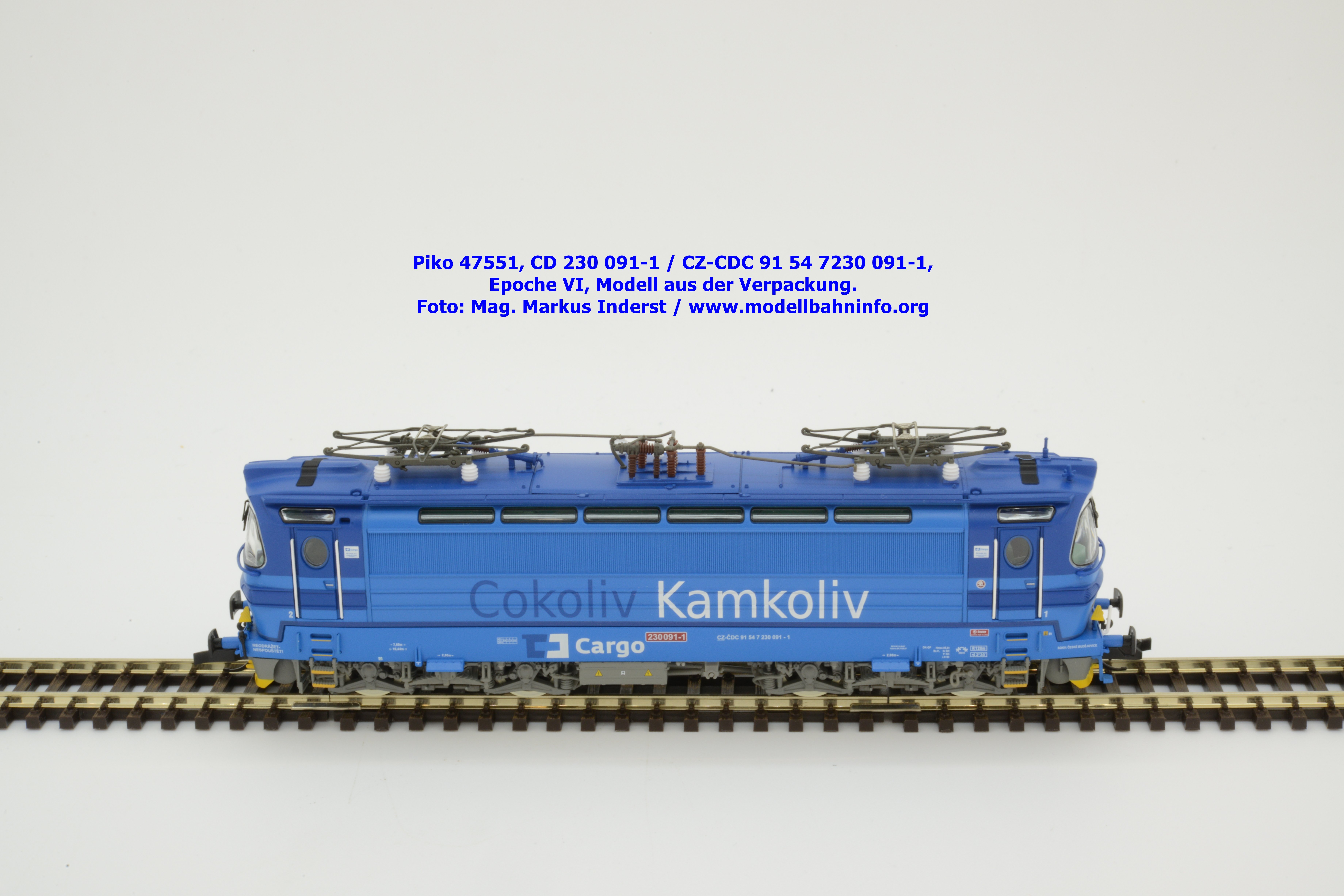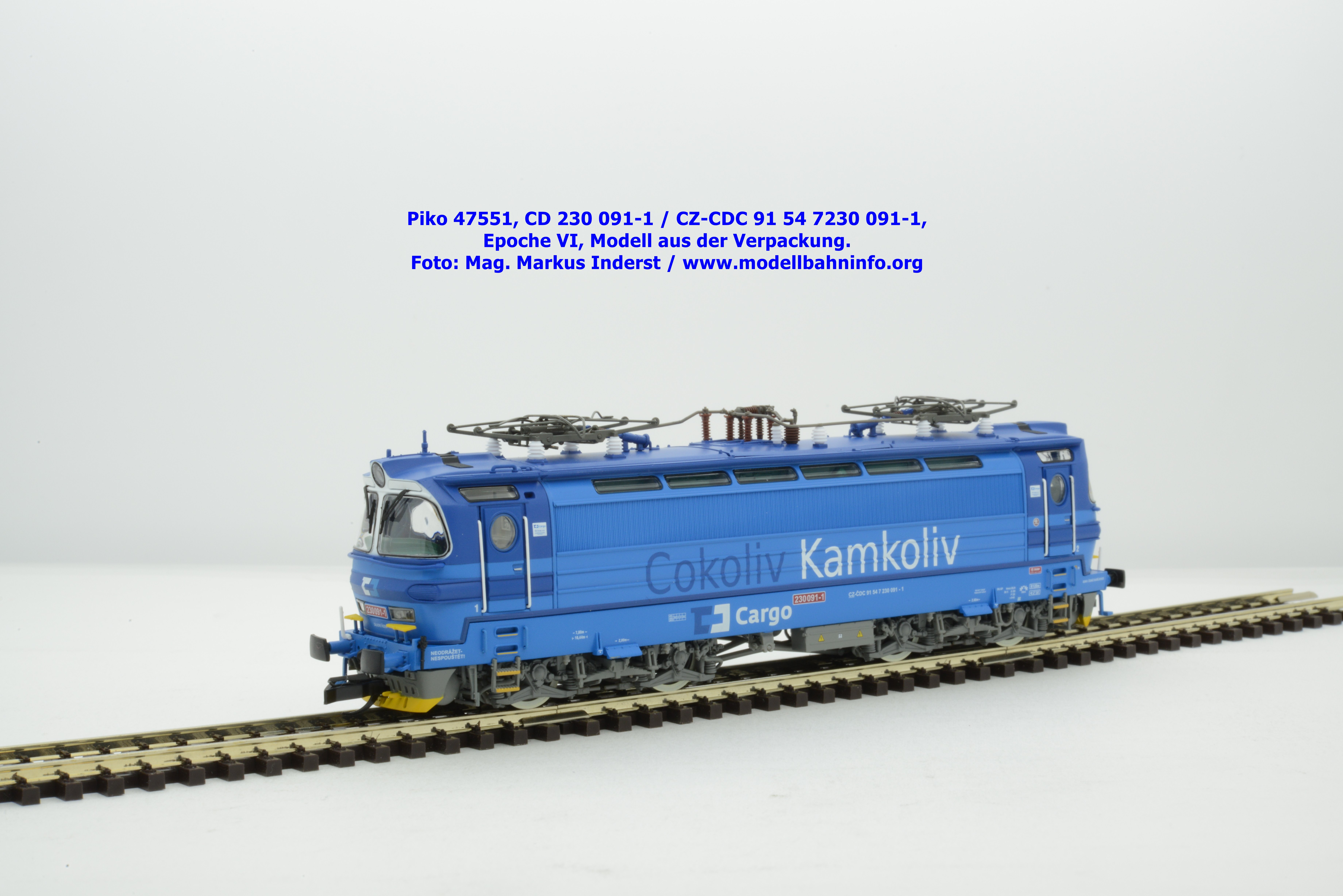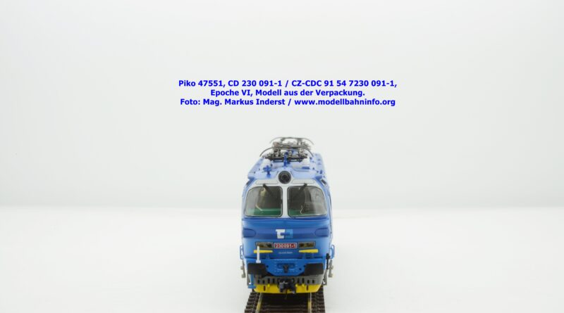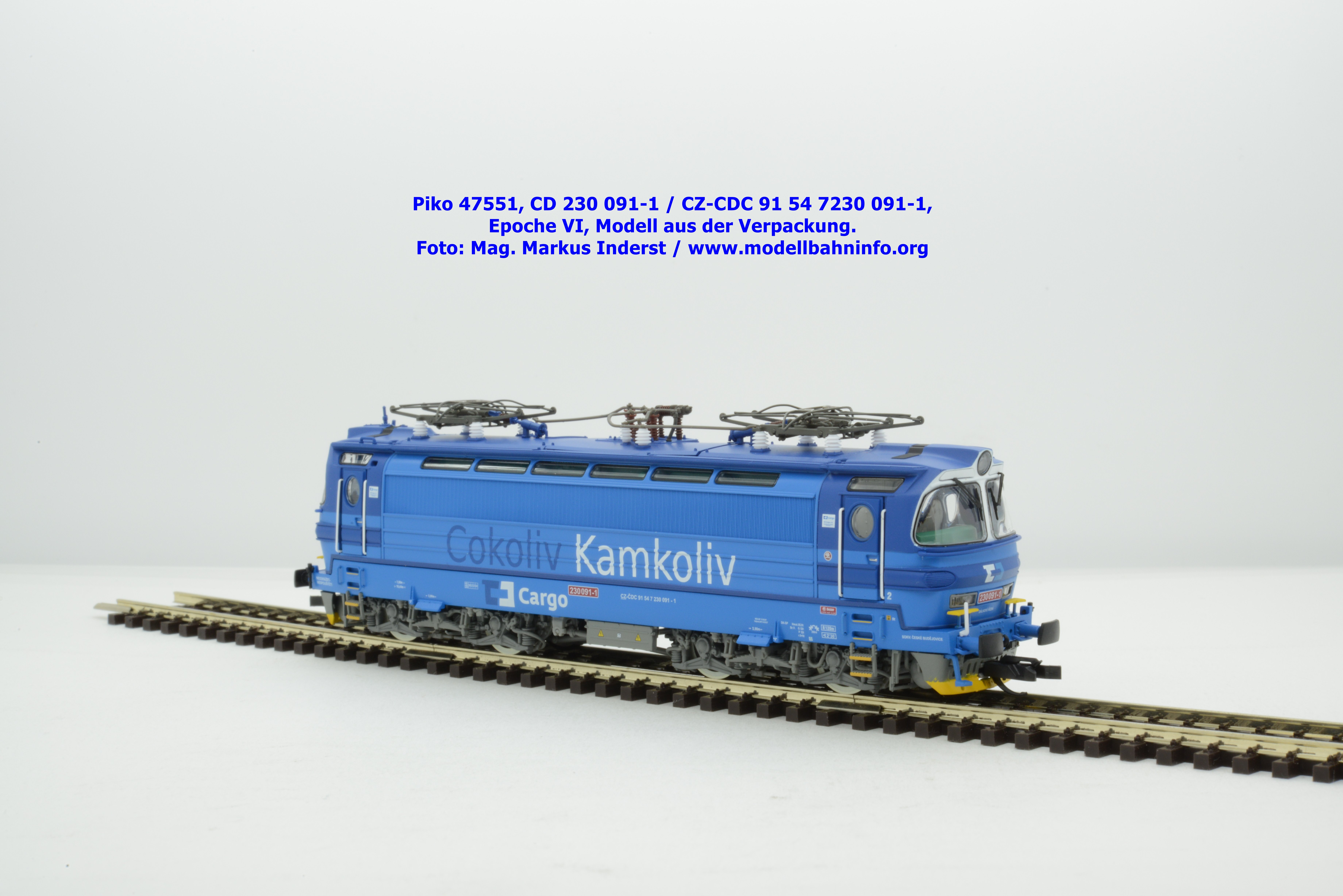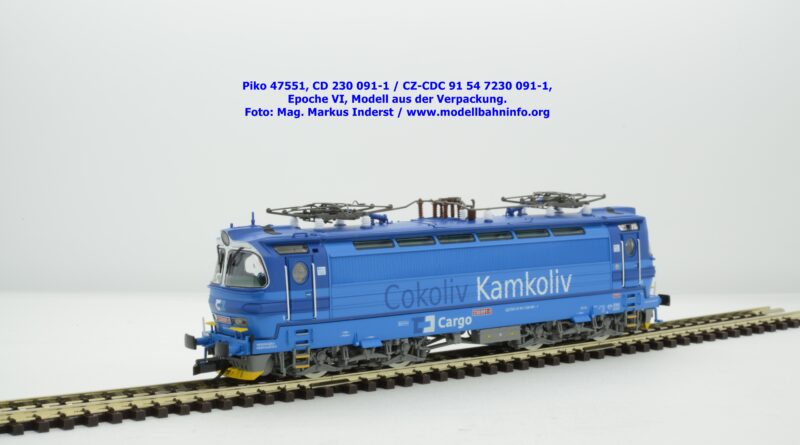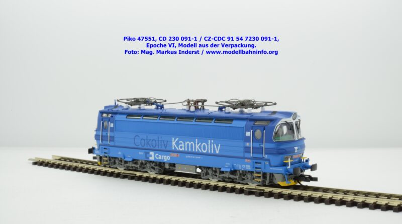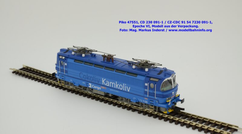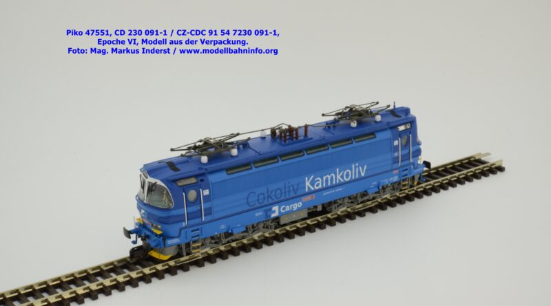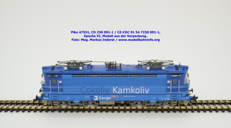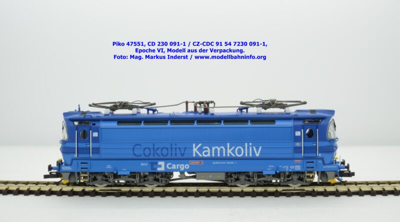 Mit diesem Modell erscheint eine weitere Vertreterin der Laminatka in blauer Farbgebung von CD Cargo, wobei sich das gegenständliche Modell von der vorigen Variante optisch schon unterscheidet. Die Firmenanschrift CD Cargo ist auf den Fahrzeugrahmen gewandert, am Lokkasten ist nun der Schriftzug „Cokoliv Kamkoliv“ in dunkelblauer/weißer Farbe zu lesen. Was damit zum Ausdruck gebracht werden will, ist unbekannt. Die Lok befindet sich im Erscheinungsbild der Epoche VI. Sie ist weiterhin mit der alten CD-Nummer 230 091-1 und der NVR-Nummer CZ-CDC 91 54 7230 091-1 bedruckt. Sie ist beim Depot Ceské Budéjovice beheimatet. Die letzten Untersuchungsdaten werden mit REV SP 15.09.07 bzw. Vázano SP 14.09.07 angegeben. Piko liefert das Modell nur als analoges Gleichstrommodell zum UVP von € 262,– aus.