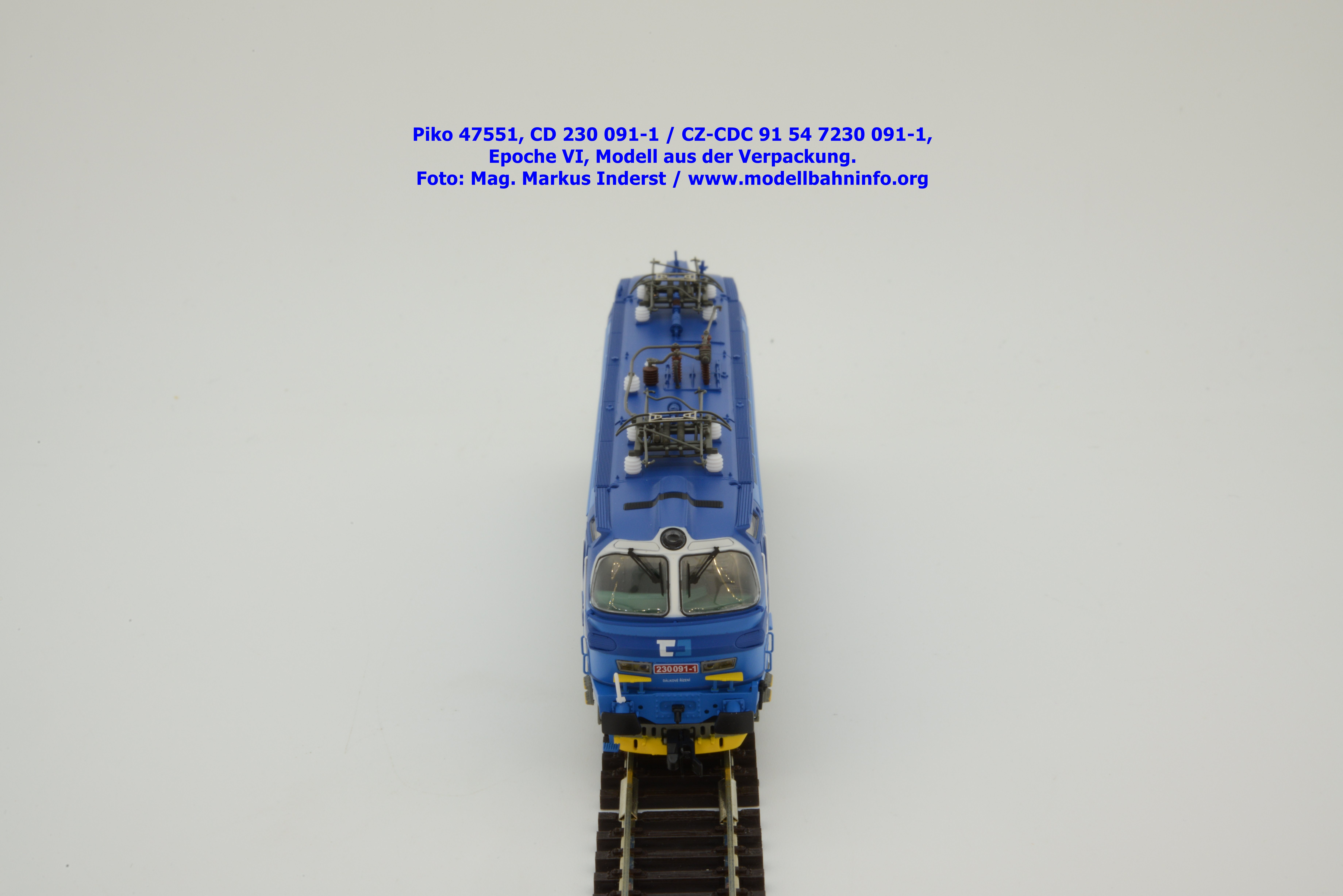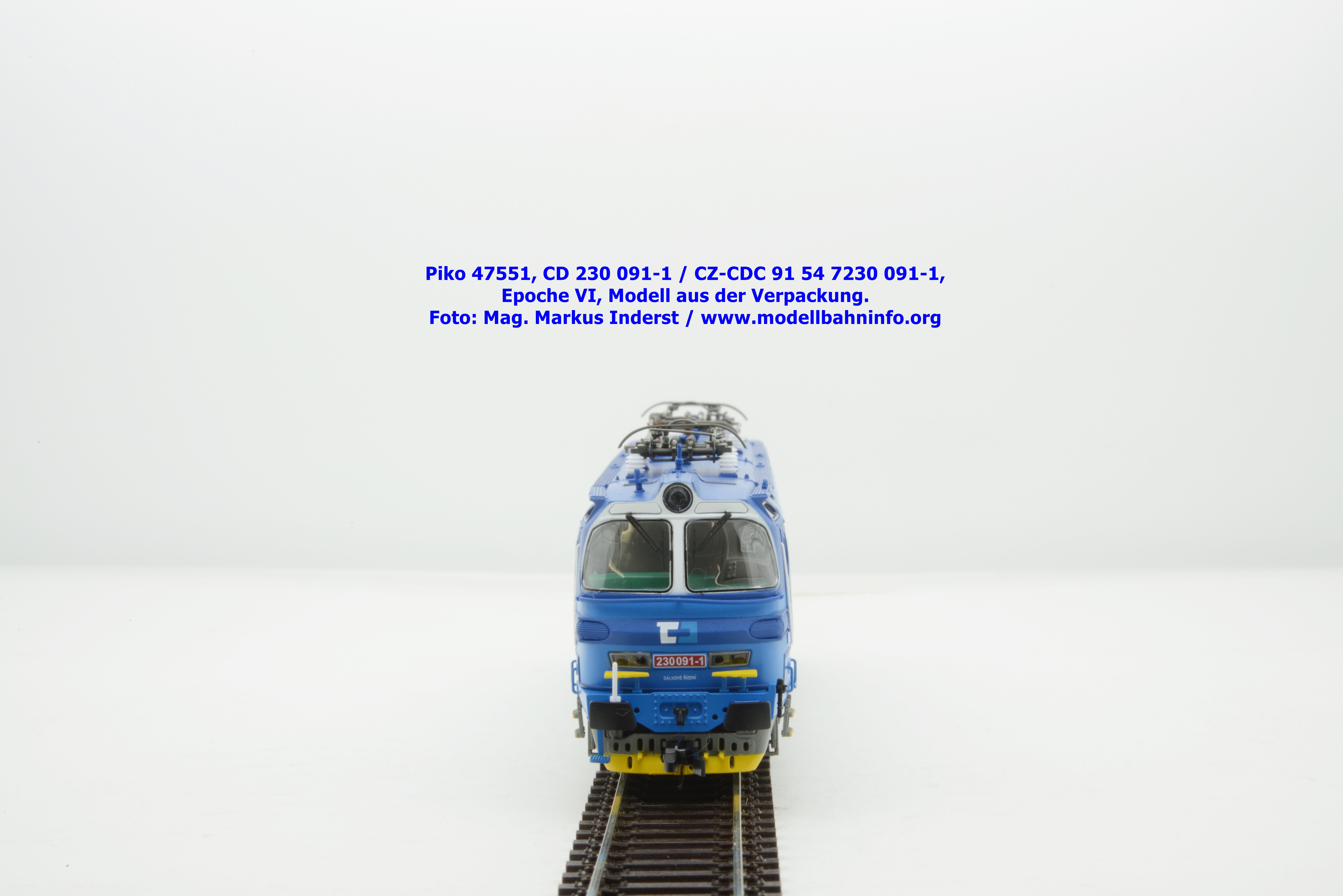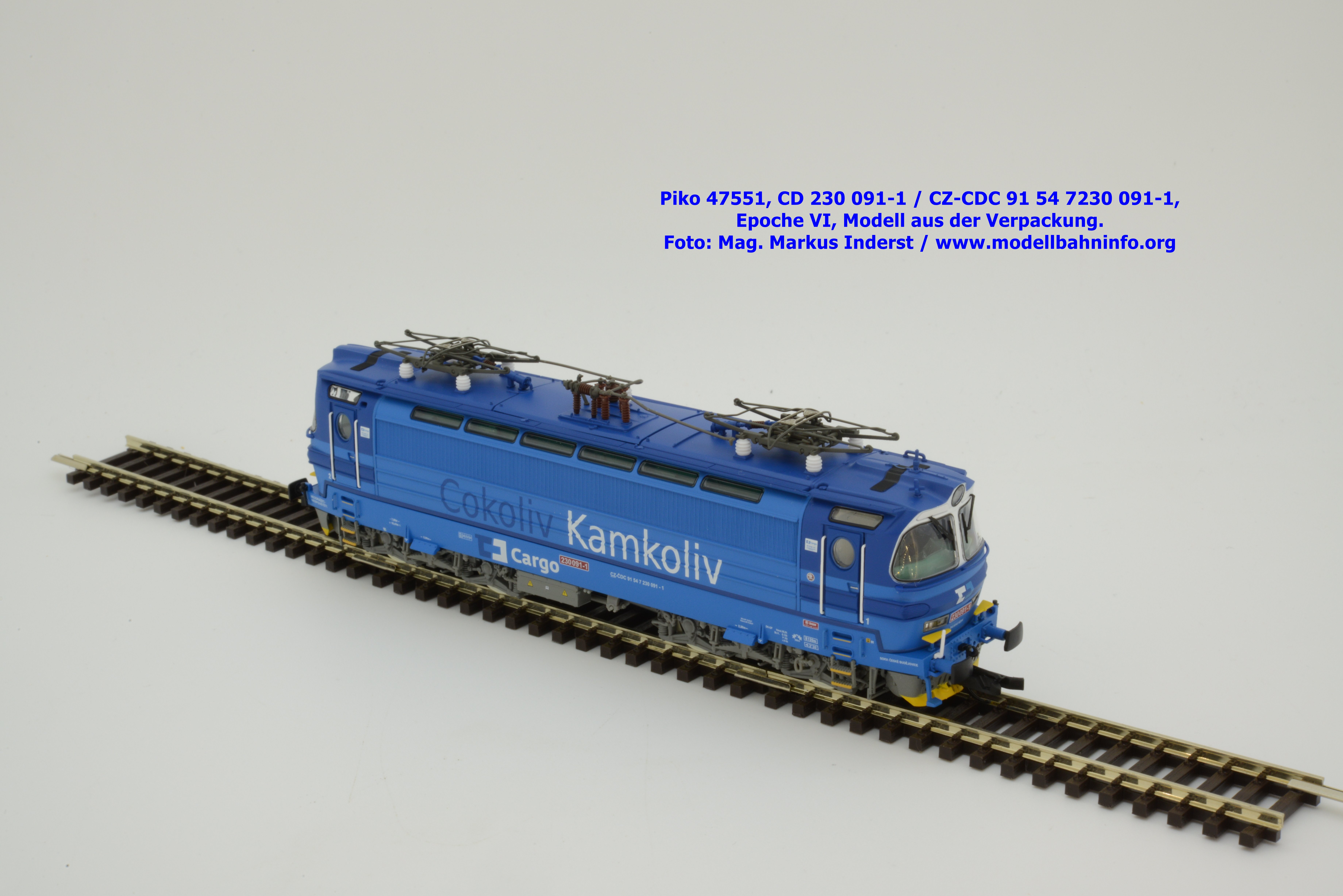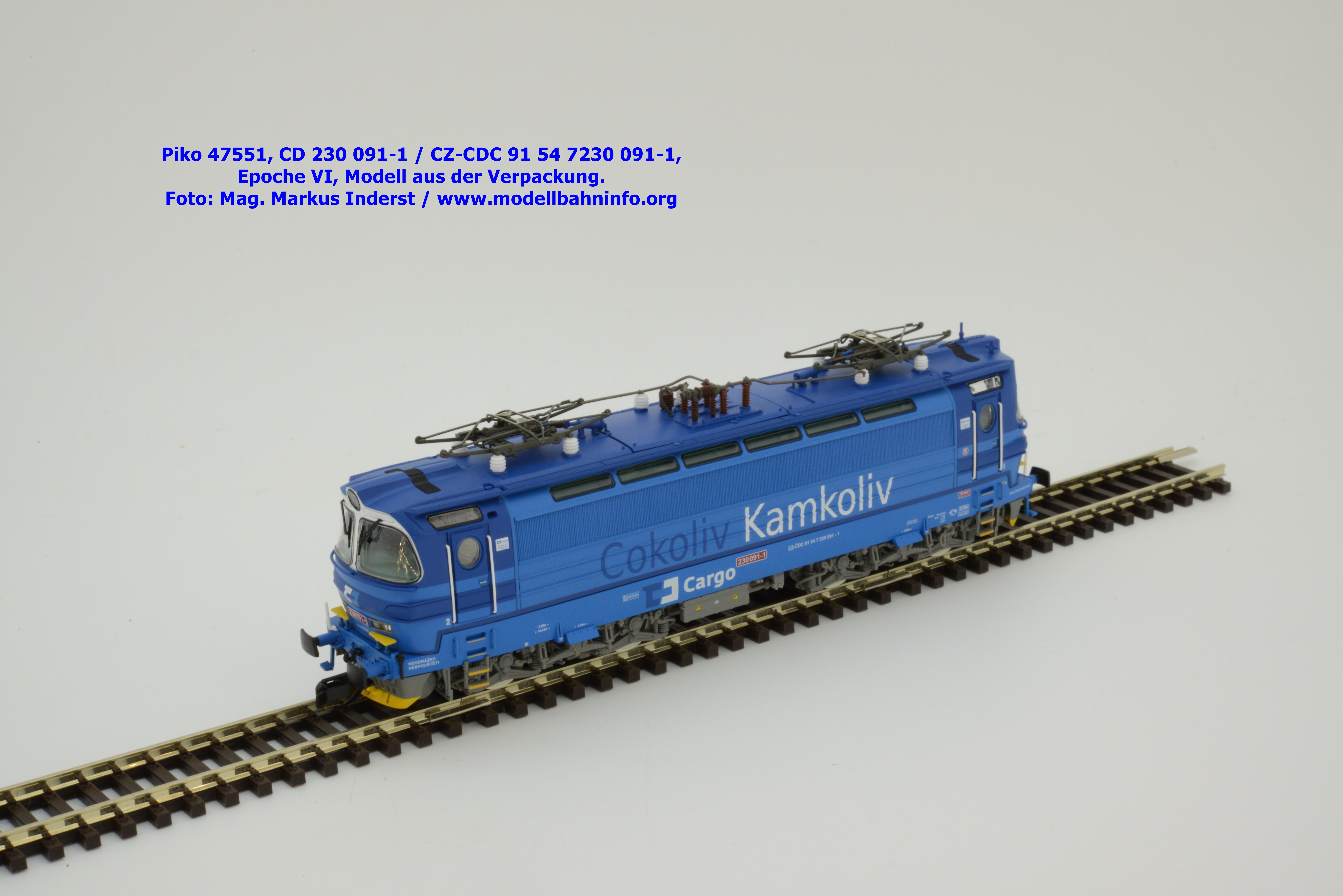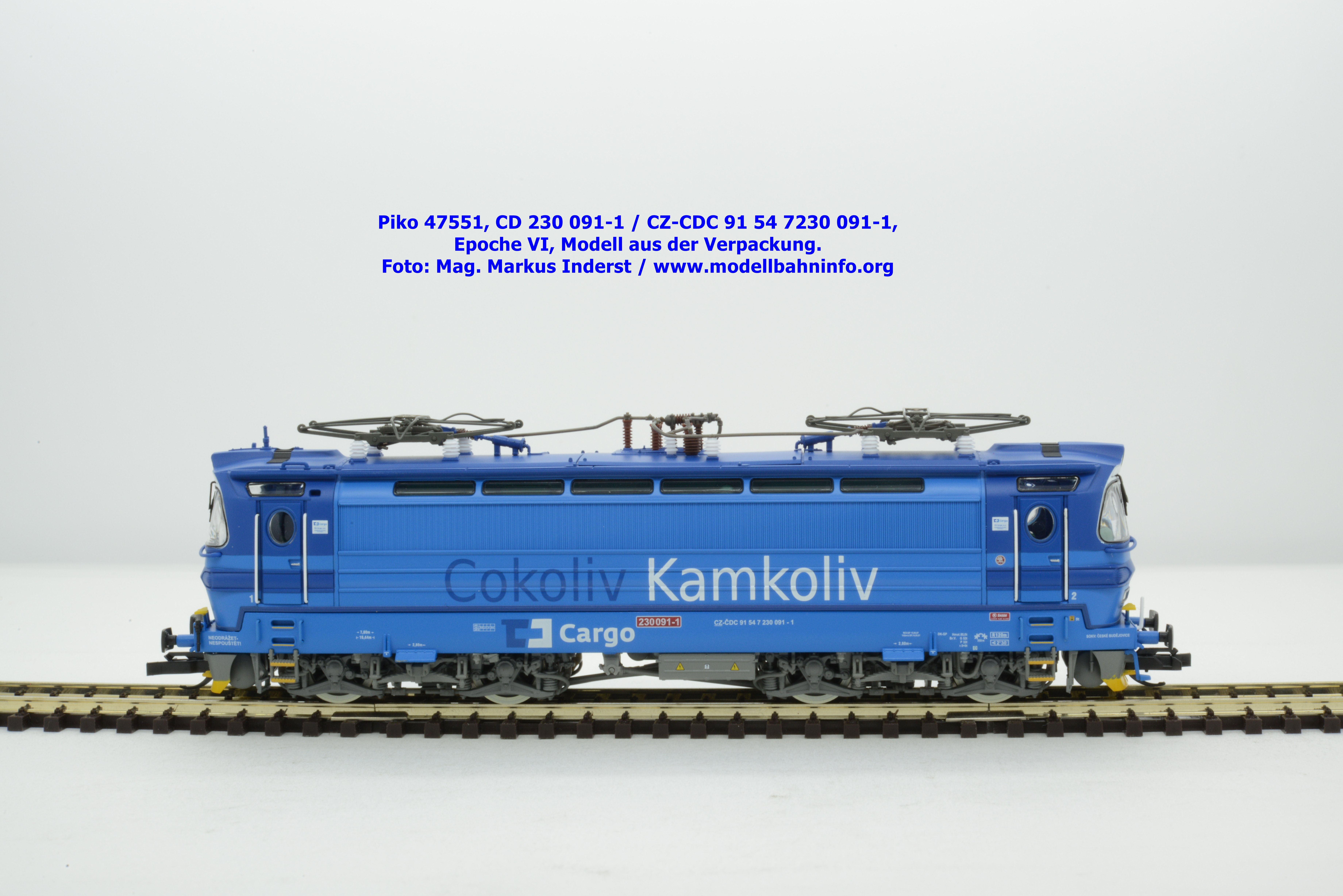 Mit diesem Modell erscheint eine weitere Vertreterin der Laminatka in blauer Farbgebung von CD Cargo, wobei sich das gegenständliche Modell von der vorigen Variante optisch schon unterscheidet. Die Firmenanschrift CD Cargo ist auf den Fahrzeugrahmen gewandert, am Lokkasten ist nun der Schriftzug „Cokoliv Kamkoliv“ in dunkelblauer/weißer Farbe zu lesen. Was damit zum Ausdruck gebracht werden will, ist unbekannt. Die Lok befindet sich im Erscheinungsbild der Epoche VI. Sie ist weiterhin mit der alten CD-Nummer 230 091-1 und der NVR-Nummer CZ-CDC 91 54 7230 091-1 bedruckt. Sie ist beim Depot Ceské Budéjovice beheimatet. Die letzten Untersuchungsdaten werden mit REV SP 15.09.07 bzw. Vázano SP 14.09.07 angegeben. Piko liefert das Modell nur als analoges Gleichstrommodell zum UVP von € 262,– aus.