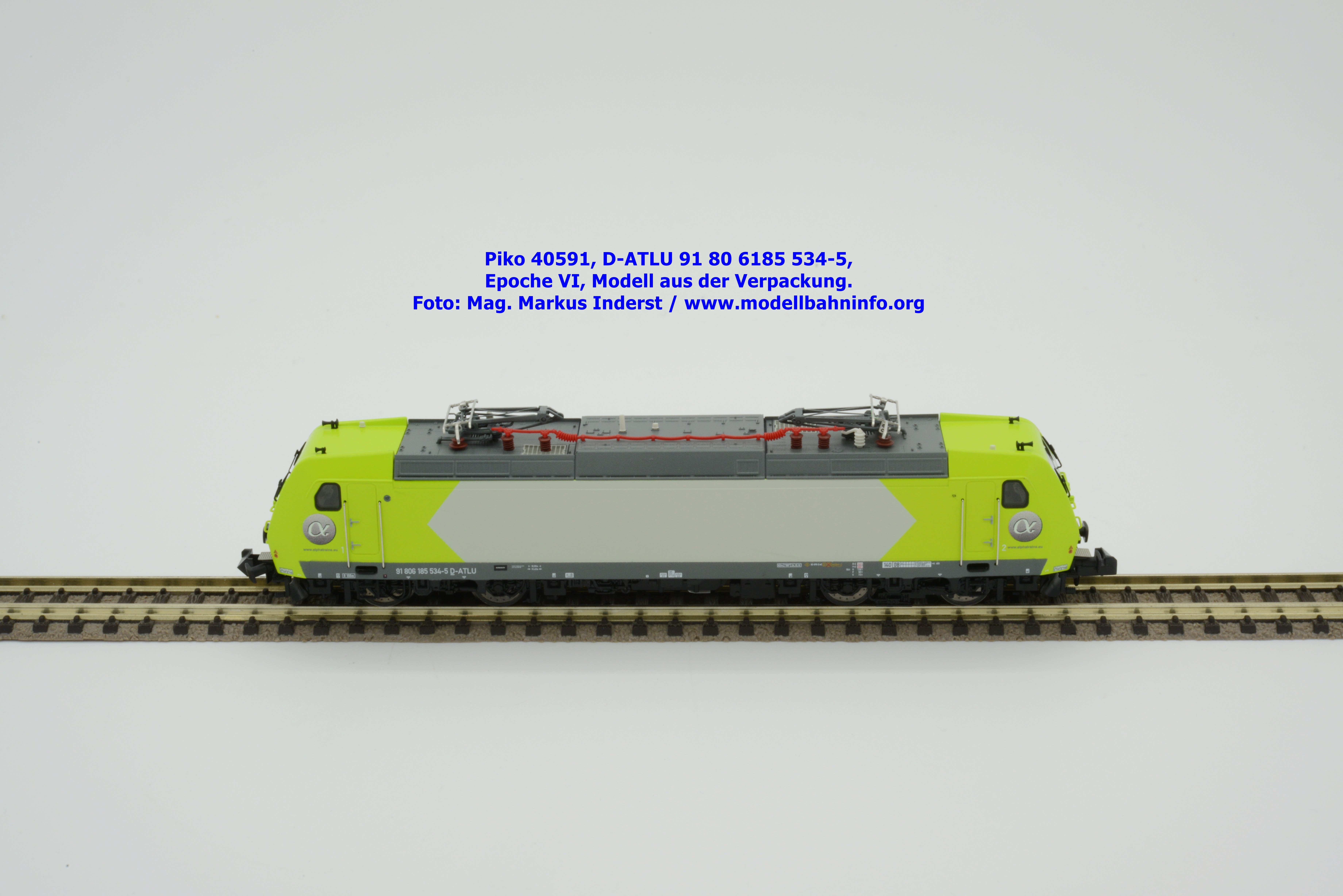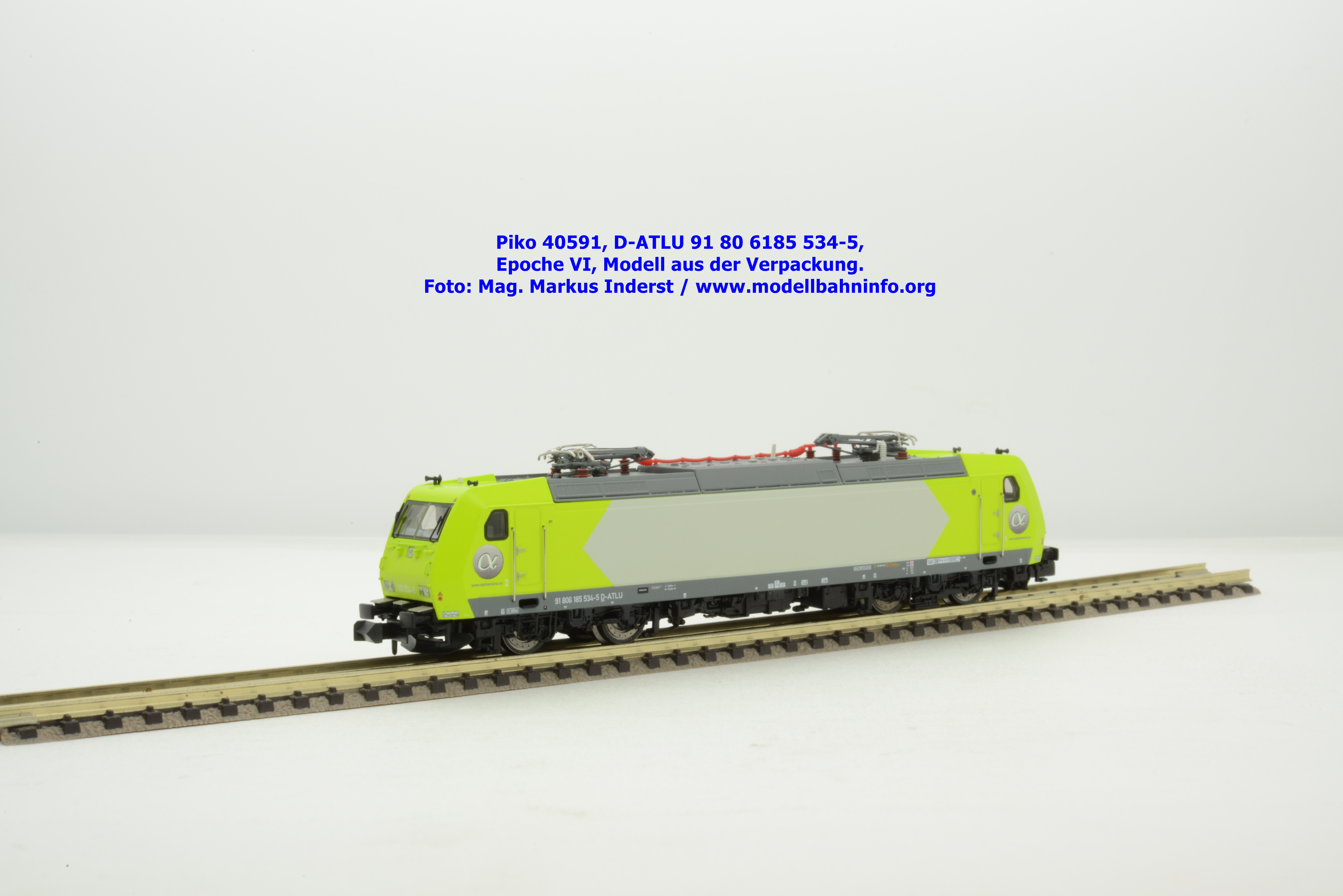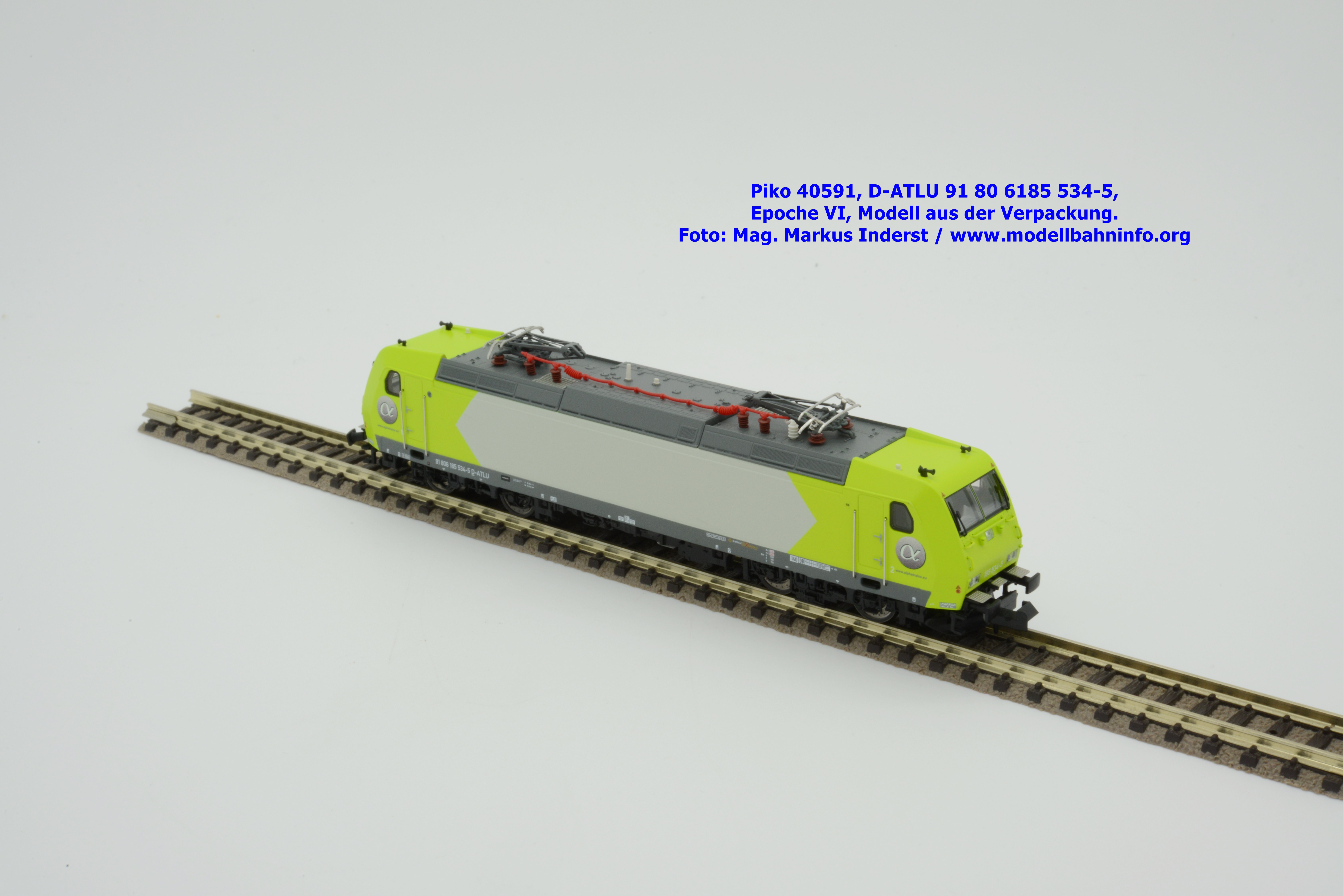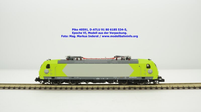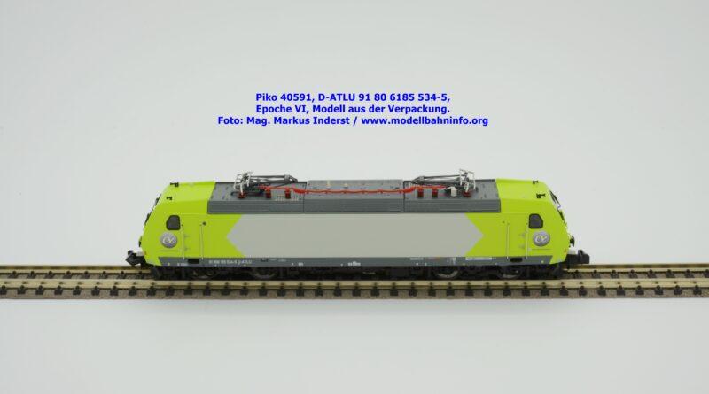 Neben den 400 Lokomotiven der Baureihe 185 der DB AG existieren eine Vielzahl an Leasing-Lokomotiven, die von mehreren Finanzierungsgesellschaften beschafft wurden und an die interessierten Eisenbahnverkehrsunternehmen kurz- bis langfristig vermietet sind. Alpha Trains ist eine dieser Leasinggesellschaften, die ihre Lok in den Farben hellgrün/silber lackiert, wobei die hellgrüne Farbe zur Kennzeichnung der „Köpfe“ dient. Piko hat ein derartiges Modell im Neuheitenprogramm 2025 vorgesehen und als D-ATLU 91 80 6185 534-5 aufgelegt, wobei als weitere Eigentumskennung noch das Firmensignet jeweils unter den Führerstandfenstern zu nennen ist. Im Revisionsraster stehen die Angaben 8 Unt km-abh. 24.10.19. Piko fertigte das Modell in der analogen Modellausführung zum UVP von € 180,–; aber auch als digitales Gleichstrommodell mit Loksound mit der Artikelnummer 40592 und zum UVP von € 309,–.