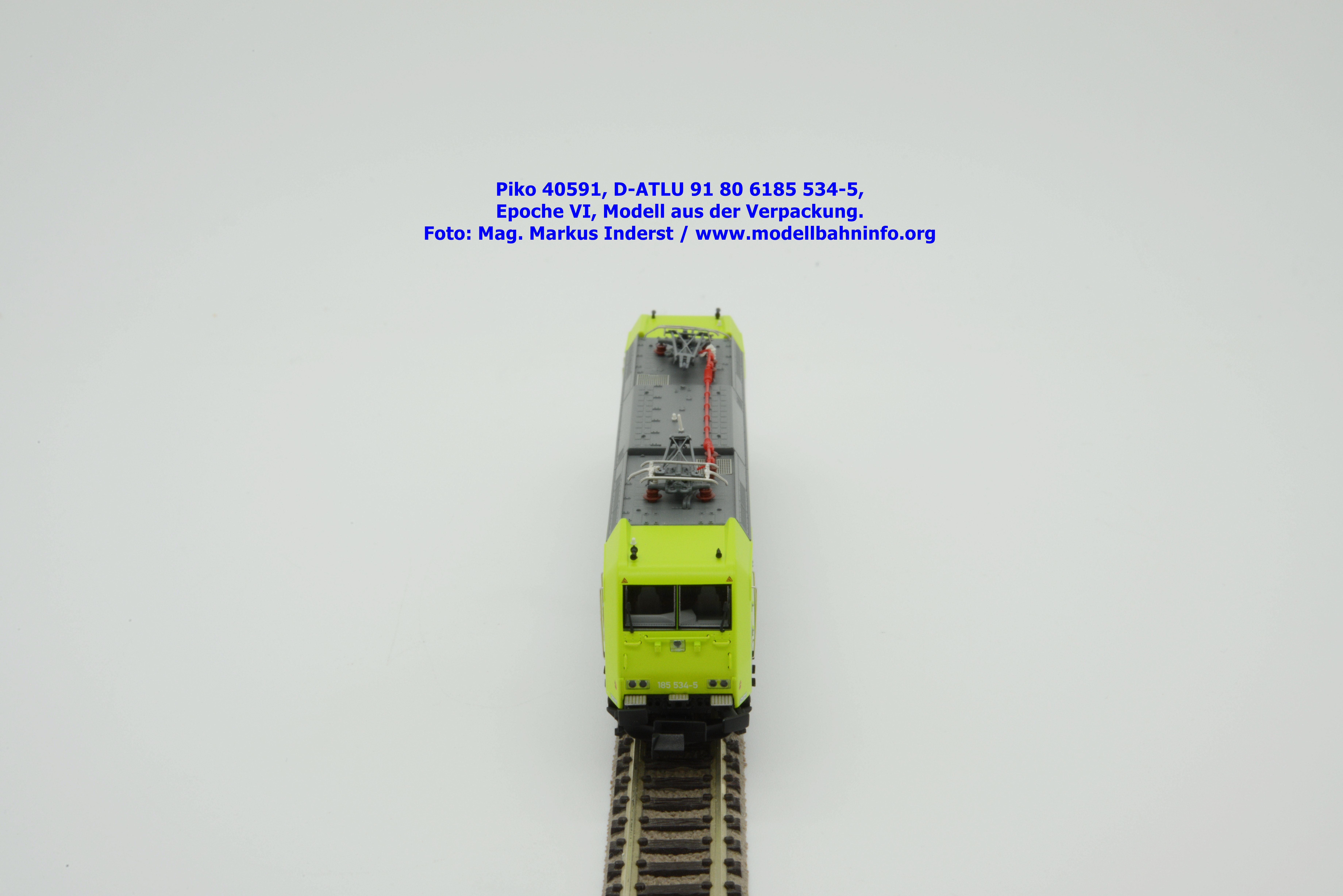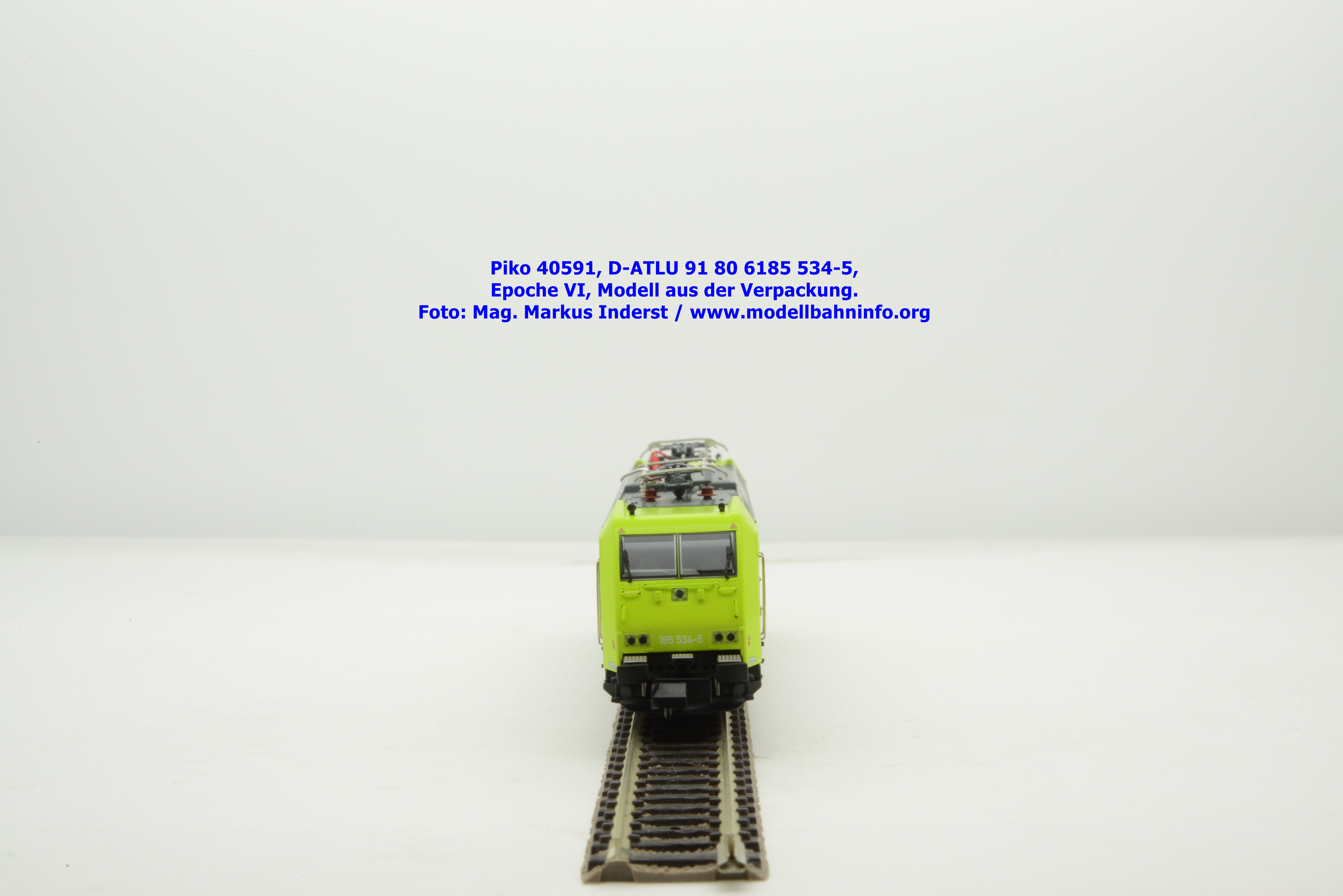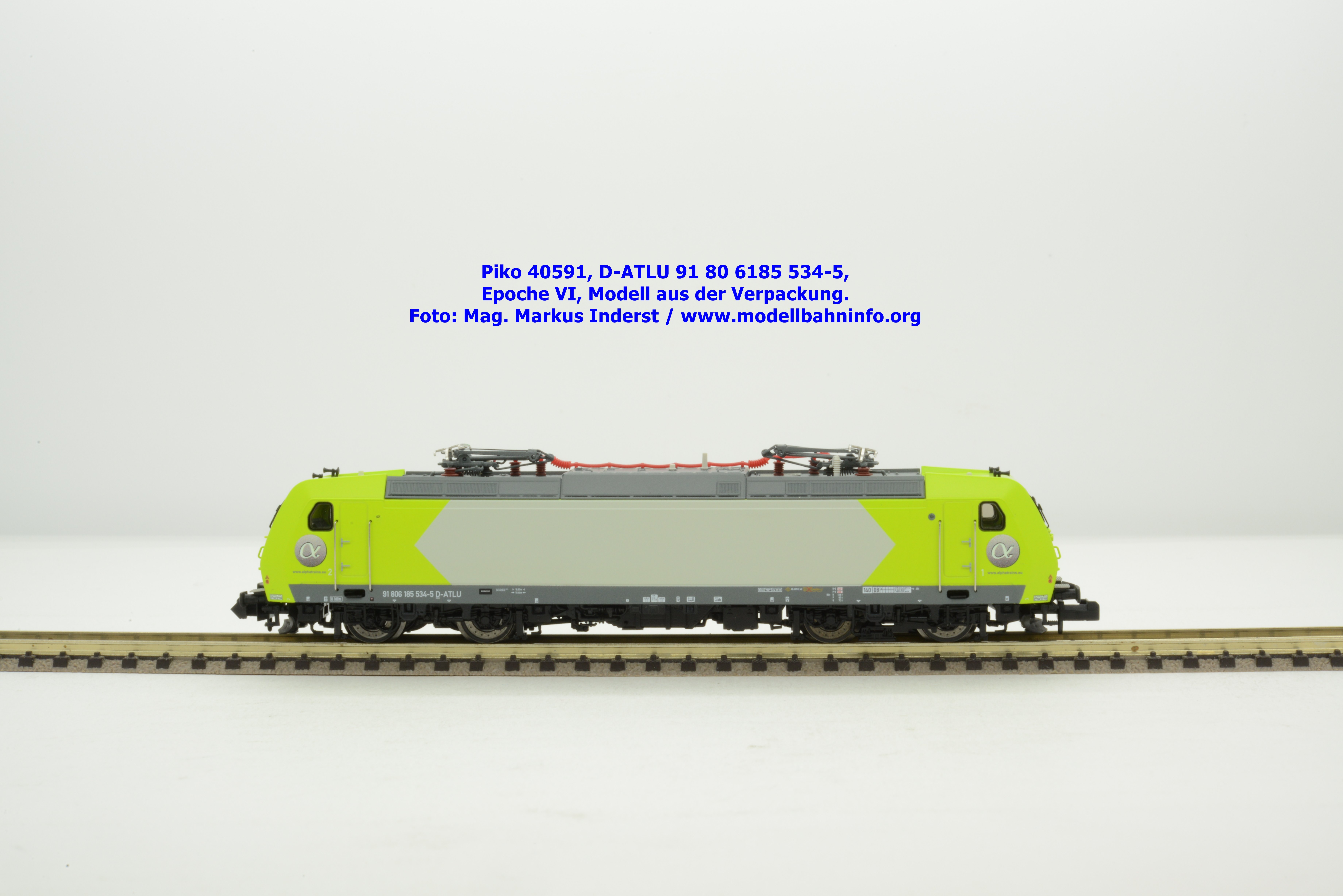 Neben den 400 Lokomotiven der Baureihe 185 der DB AG existieren eine Vielzahl an Leasing-Lokomotiven, die von mehreren Finanzierungsgesellschaften beschafft wurden und an die interessierten Eisenbahnverkehrsunternehmen kurz- bis langfristig vermietet sind. Alpha Trains ist eine dieser Leasinggesellschaften, die ihre Lok in den Farben hellgrün/silber lackiert, wobei die hellgrüne Farbe zur Kennzeichnung der „Köpfe“ dient. Piko hat ein derartiges Modell im Neuheitenprogramm 2025 vorgesehen und als D-ATLU 91 80 6185 534-5 aufgelegt, wobei als weitere Eigentumskennung noch das Firmensignet jeweils unter den Führerstandfenstern zu nennen ist. Im Revisionsraster stehen die Angaben 8 Unt km-abh. 24.10.19. Piko fertigte das Modell in der analogen Modellausführung zum UVP von € 180,–; aber auch als digitales Gleichstrommodell mit Loksound mit der Artikelnummer 40592 und zum UVP von € 309,–.