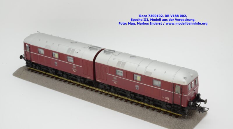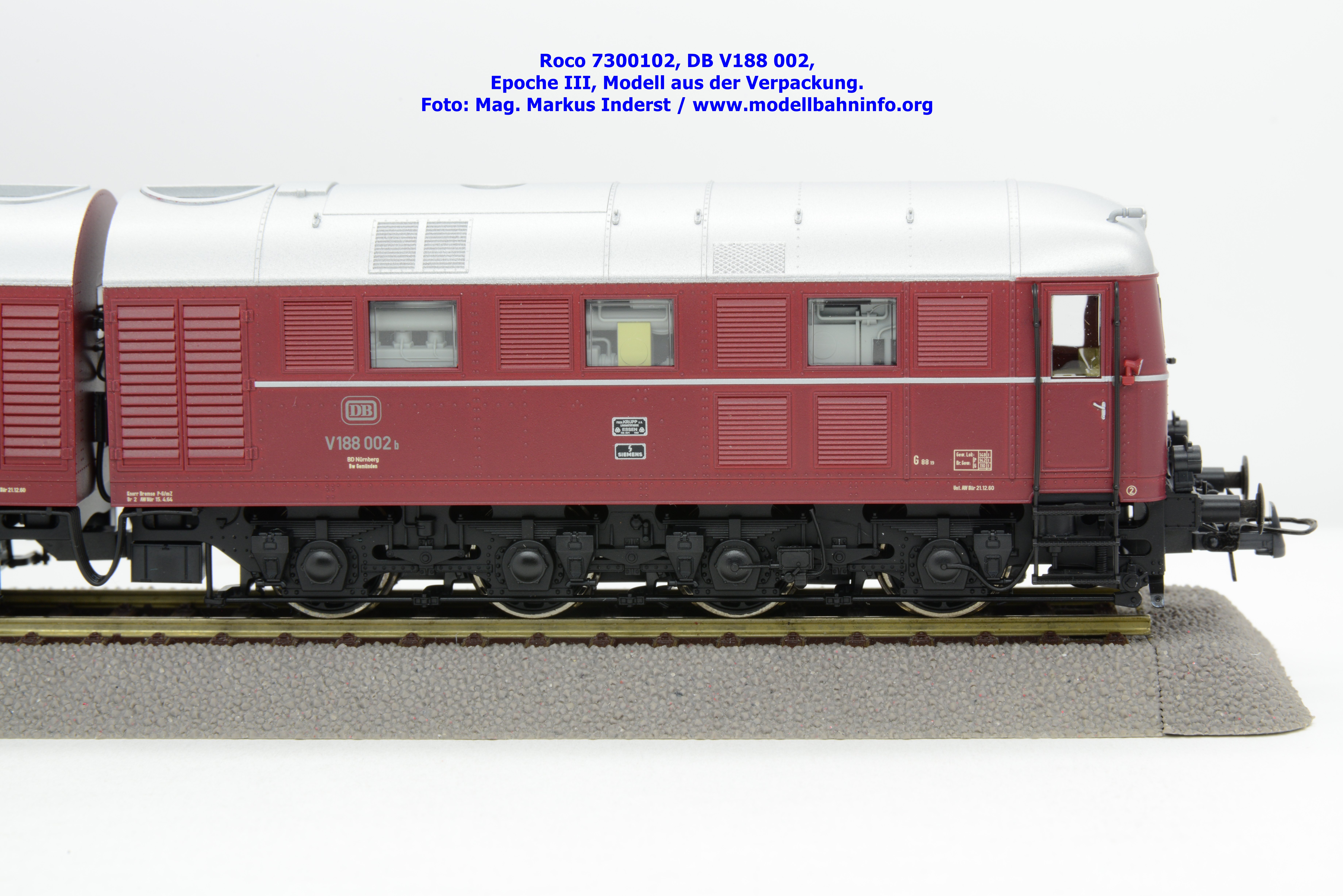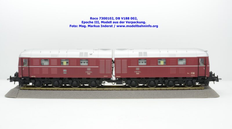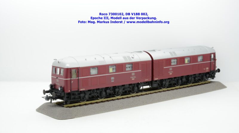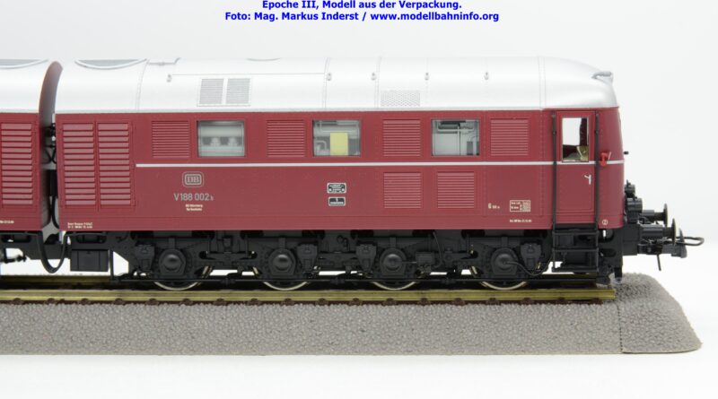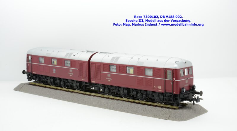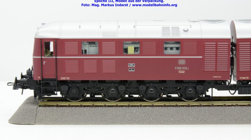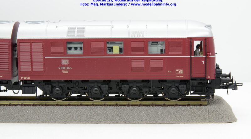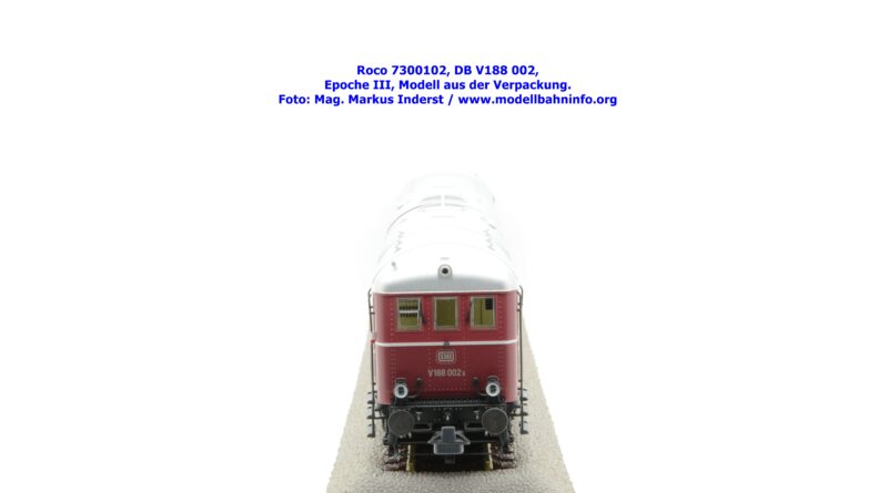 Die V 188 002 geht nun in die dritte Rund als H0-Modell. Roco hat diese Betriebsnummer nochmals als weitere Formvariante in weinroter Farbgebung in den Herbstneuheiten 2025 angekündigt, indem diesmal die Ausführung für die Epoche IIIb an der Reihe ist. Die weinrot lackierte Lokomotive verfügt über ein zusätzliches Entlüftungsbauteil am Dach sowie ein Rohr mit pilzförmiger Abdeckung. Zudem ist bei diesem Modell jeweils ein Batteriekasten rechts hinten auf jeder Lokhälfte montiert. Ansonsten orientiert sich die Modellausführung an den bisherigen Konstruktionen. Die weinrot lackierte Lok mit der Betriebsnummer V 188 002 ist beim Bw Gemünden in der BD Nürnberg stationiert und weist die Untersuchungsanschriften Unt. AW Nür 21.12.60 auf. Zudem ist am Rahmen noch die Anschrift Br2 AW Nür 15. 4.64 zu lesen. Das Modell wird wiederum in drei technisch unterschiedlichen Ausführungen produziert. Unter der Artikelnummer 7300102 ist die analoge Zweileiter-Gleichstrom-Ausführung vorzufinden, die im Fachhandel den UVP von € 399,90 aufweist. Die Zweileiter-Gleichstrom-Ausführung mit Digitaldecoder und „Dynamic Sound“-Paket ist unter der Artikelnummer 7310102 und dem UVP von € 599,90 erwerbbar, ebenso die Dreileiter-Wechselstrom-Ausführung mit der Artikelnummer 7320102.