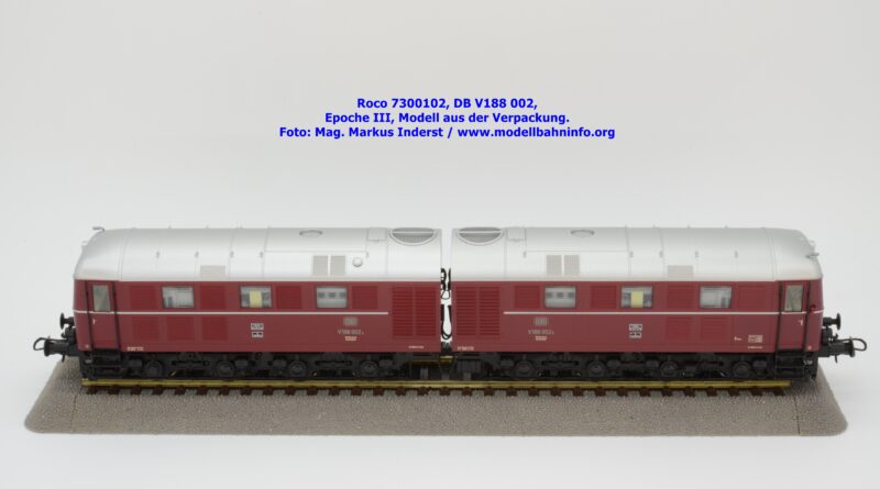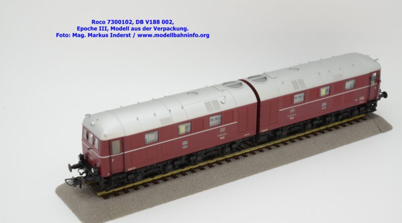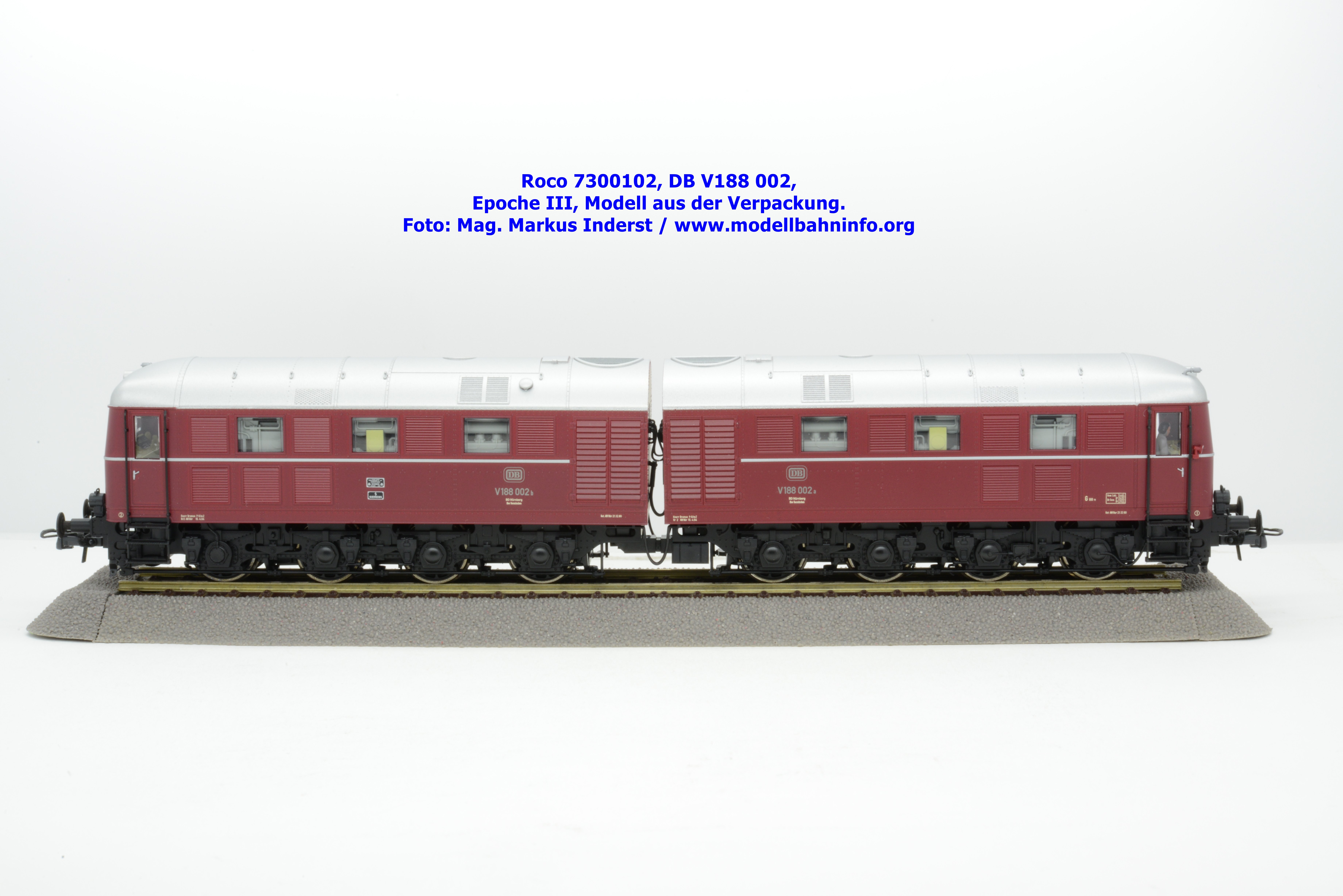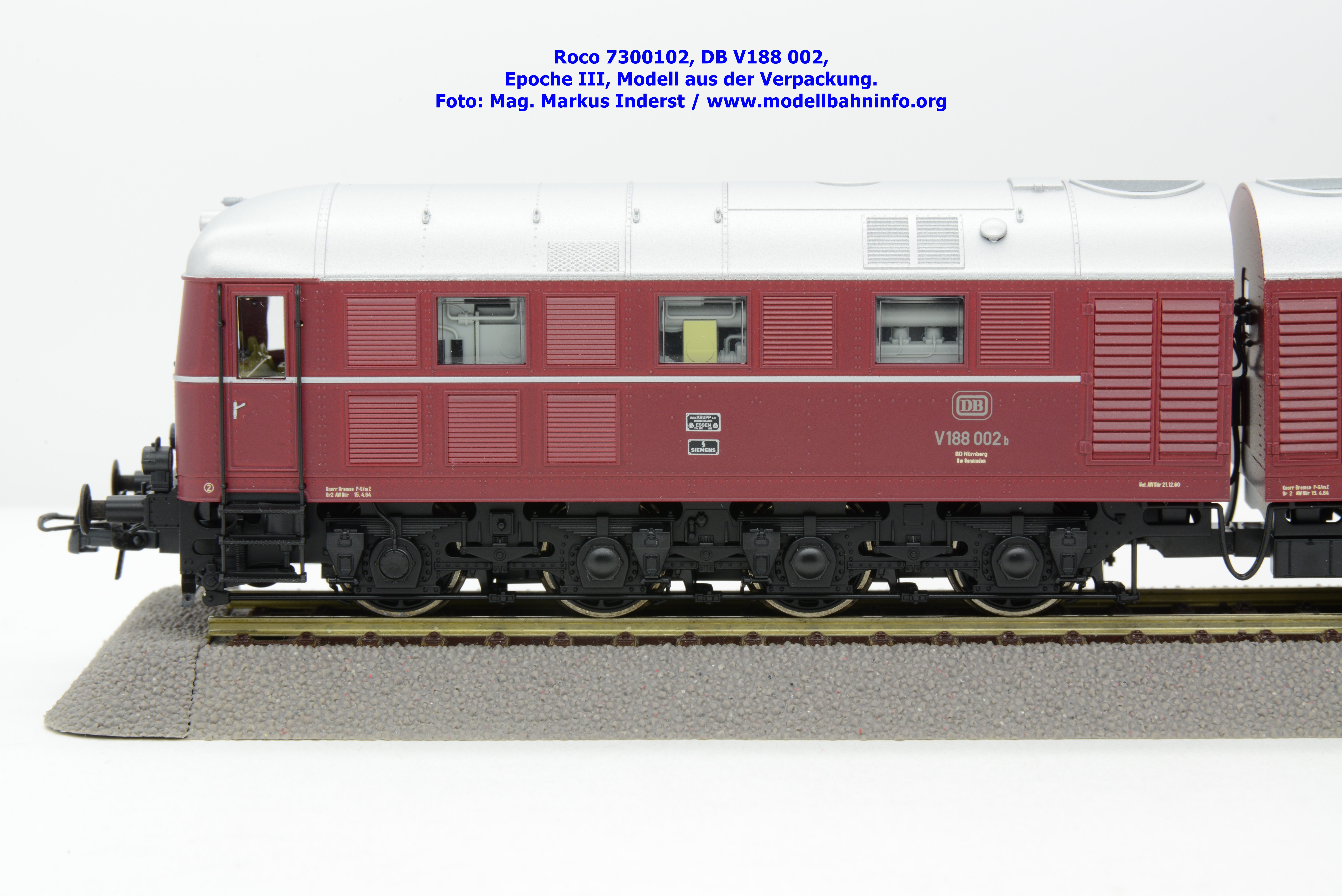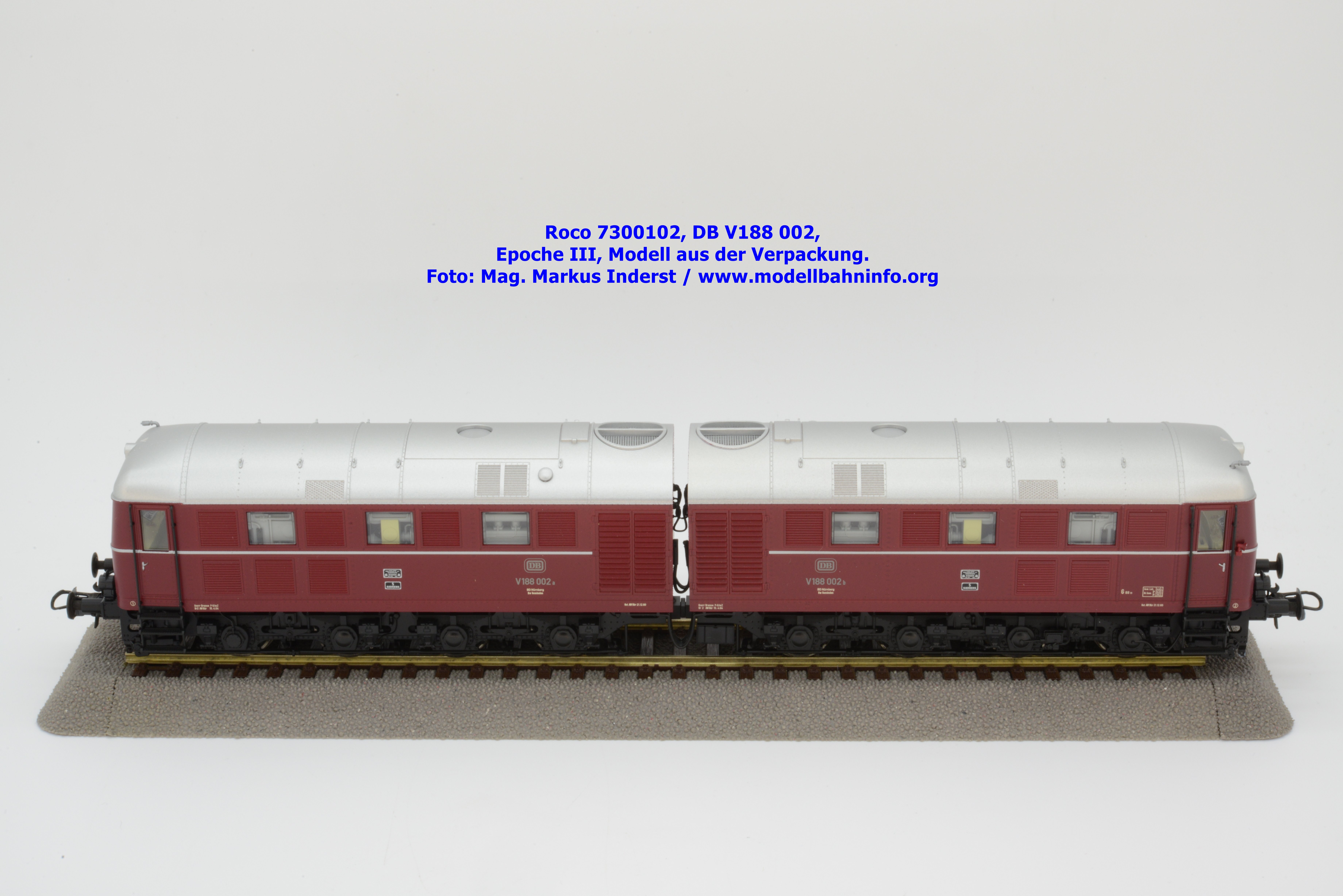 Die V 188 002 geht nun in die dritte Rund als H0-Modell. Roco hat diese Betriebsnummer nochmals als weitere Formvariante in weinroter Farbgebung in den Herbstneuheiten 2025 angekündigt, indem diesmal die Ausführung für die Epoche IIIb an der Reihe ist. Die weinrot lackierte Lokomotive verfügt über ein zusätzliches Entlüftungsbauteil am Dach sowie ein Rohr mit pilzförmiger Abdeckung. Zudem ist bei diesem Modell jeweils ein Batteriekasten rechts hinten auf jeder Lokhälfte montiert. Ansonsten orientiert sich die Modellausführung an den bisherigen Konstruktionen. Die weinrot lackierte Lok mit der Betriebsnummer V 188 002 ist beim Bw Gemünden in der BD Nürnberg stationiert und weist die Untersuchungsanschriften Unt. AW Nür 21.12.60 auf. Zudem ist am Rahmen noch die Anschrift Br2 AW Nür 15. 4.64 zu lesen. Das Modell wird wiederum in drei technisch unterschiedlichen Ausführungen produziert. Unter der Artikelnummer 7300102 ist die analoge Zweileiter-Gleichstrom-Ausführung vorzufinden, die im Fachhandel den UVP von € 399,90 aufweist. Die Zweileiter-Gleichstrom-Ausführung mit Digitaldecoder und „Dynamic Sound“-Paket ist unter der Artikelnummer 7310102 und dem UVP von € 599,90 erwerbbar, ebenso die Dreileiter-Wechselstrom-Ausführung mit der Artikelnummer 7320102.