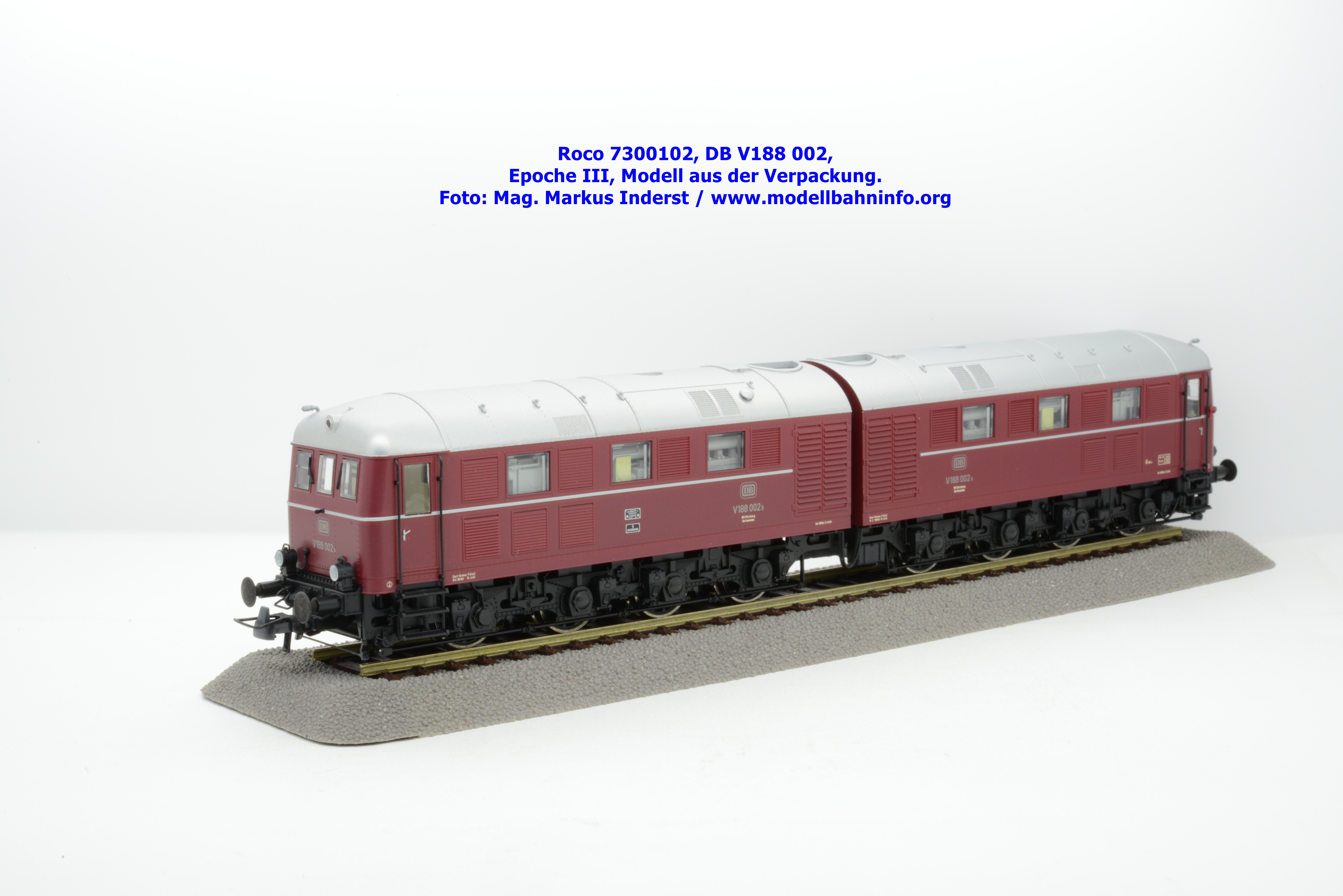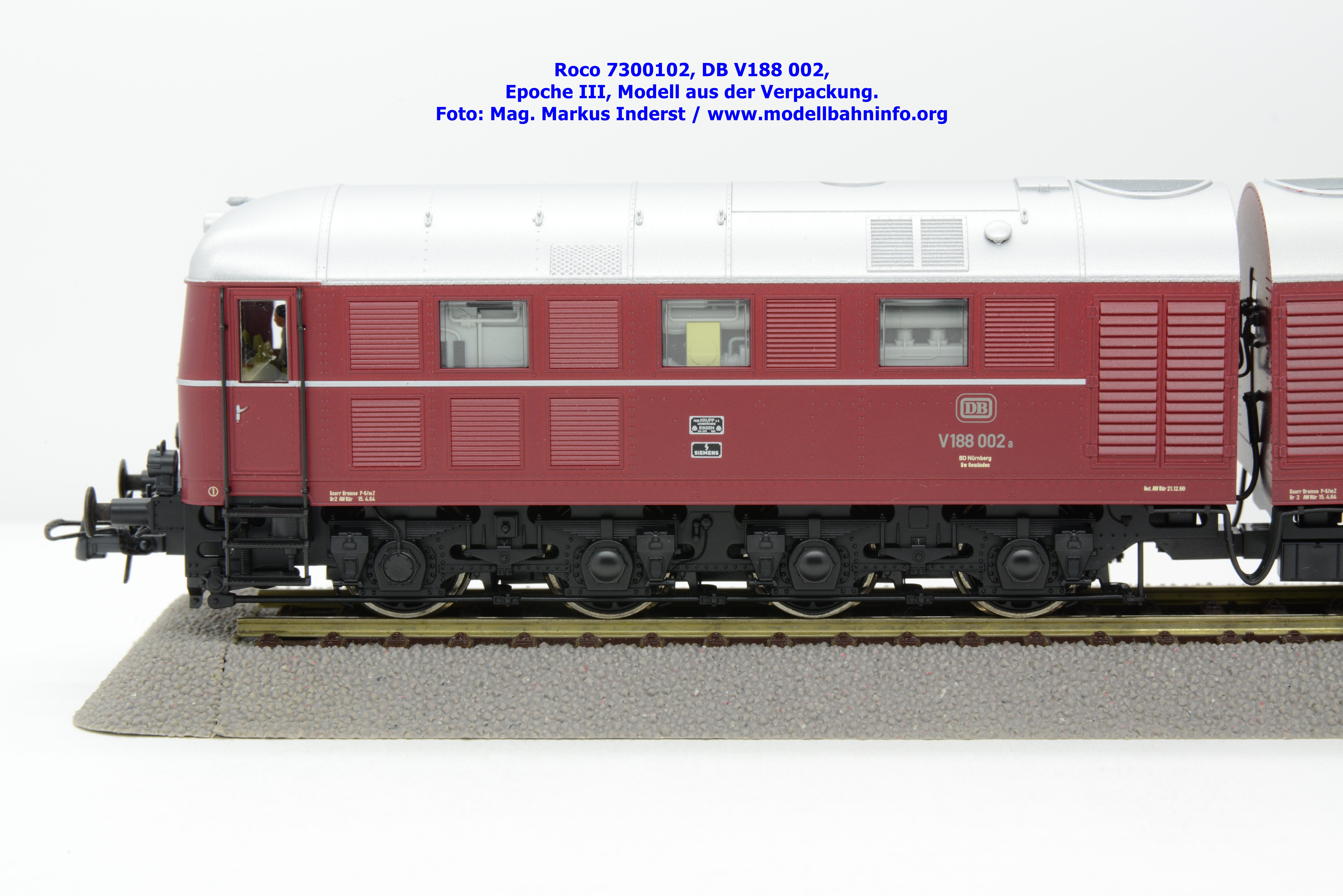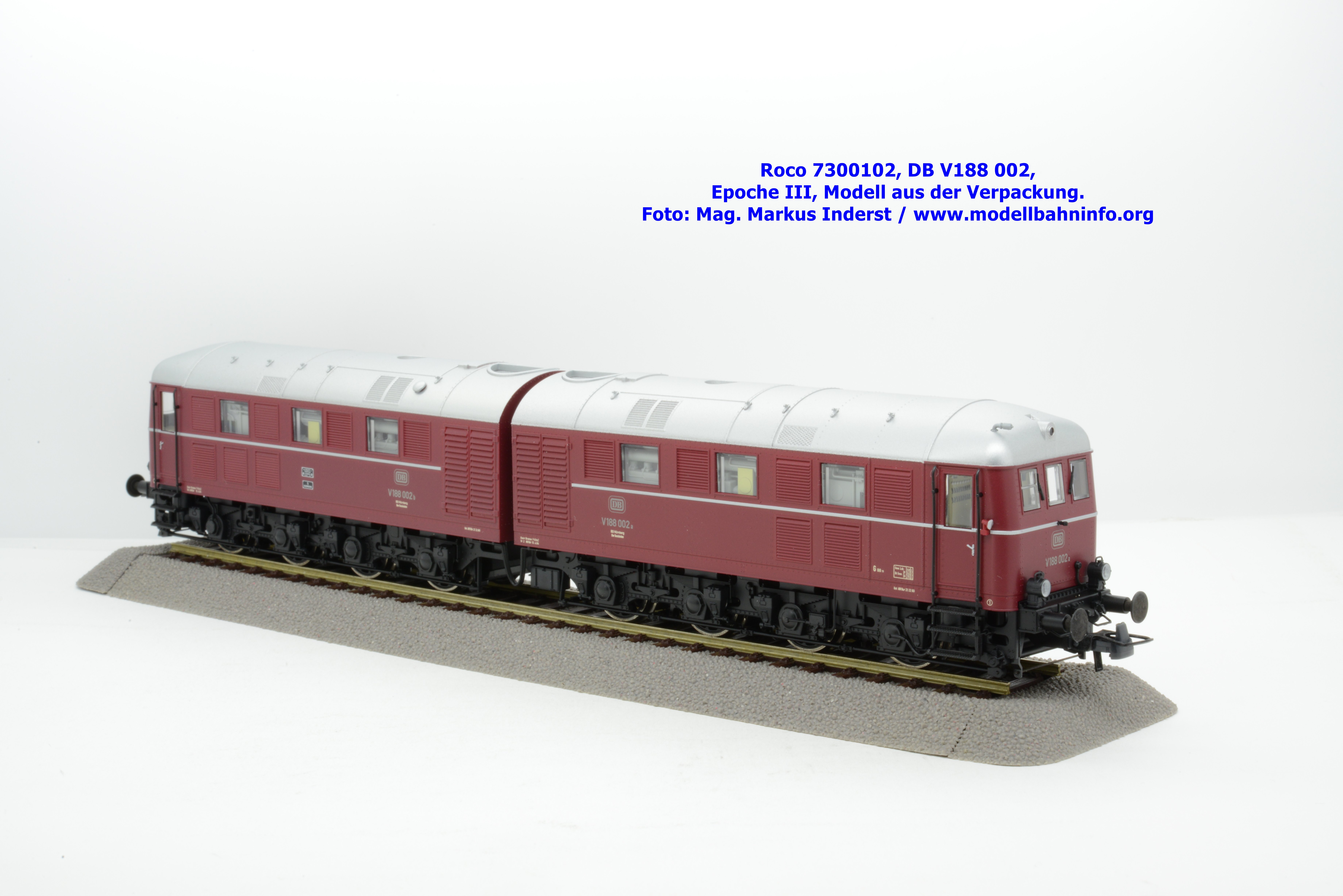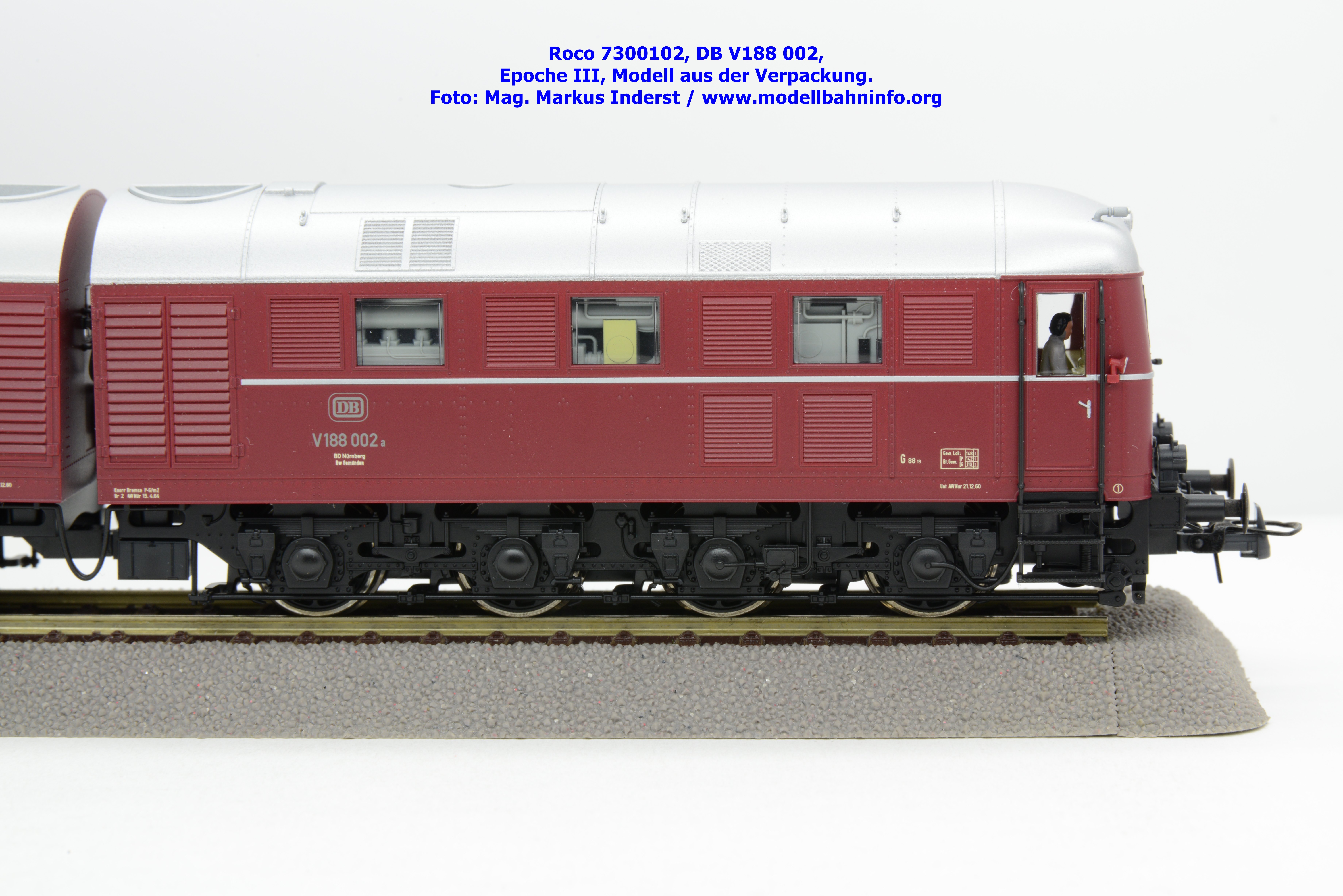 Die V 188 002 geht nun in die dritte Rund als H0-Modell. Roco hat diese Betriebsnummer nochmals als weitere Formvariante in weinroter Farbgebung in den Herbstneuheiten 2025 angekündigt, indem diesmal die Ausführung für die Epoche IIIb an der Reihe ist. Die weinrot lackierte Lokomotive verfügt über ein zusätzliches Entlüftungsbauteil am Dach sowie ein Rohr mit pilzförmiger Abdeckung. Zudem ist bei diesem Modell jeweils ein Batteriekasten rechts hinten auf jeder Lokhälfte montiert. Ansonsten orientiert sich die Modellausführung an den bisherigen Konstruktionen. Die weinrot lackierte Lok mit der Betriebsnummer V 188 002 ist beim Bw Gemünden in der BD Nürnberg stationiert und weist die Untersuchungsanschriften Unt. AW Nür 21.12.60 auf. Zudem ist am Rahmen noch die Anschrift Br2 AW Nür 15. 4.64 zu lesen. Das Modell wird wiederum in drei technisch unterschiedlichen Ausführungen produziert. Unter der Artikelnummer 7300102 ist die analoge Zweileiter-Gleichstrom-Ausführung vorzufinden, die im Fachhandel den UVP von € 399,90 aufweist. Die Zweileiter-Gleichstrom-Ausführung mit Digitaldecoder und „Dynamic Sound“-Paket ist unter der Artikelnummer 7310102 und dem UVP von € 599,90 erwerbbar, ebenso die Dreileiter-Wechselstrom-Ausführung mit der Artikelnummer 7320102.