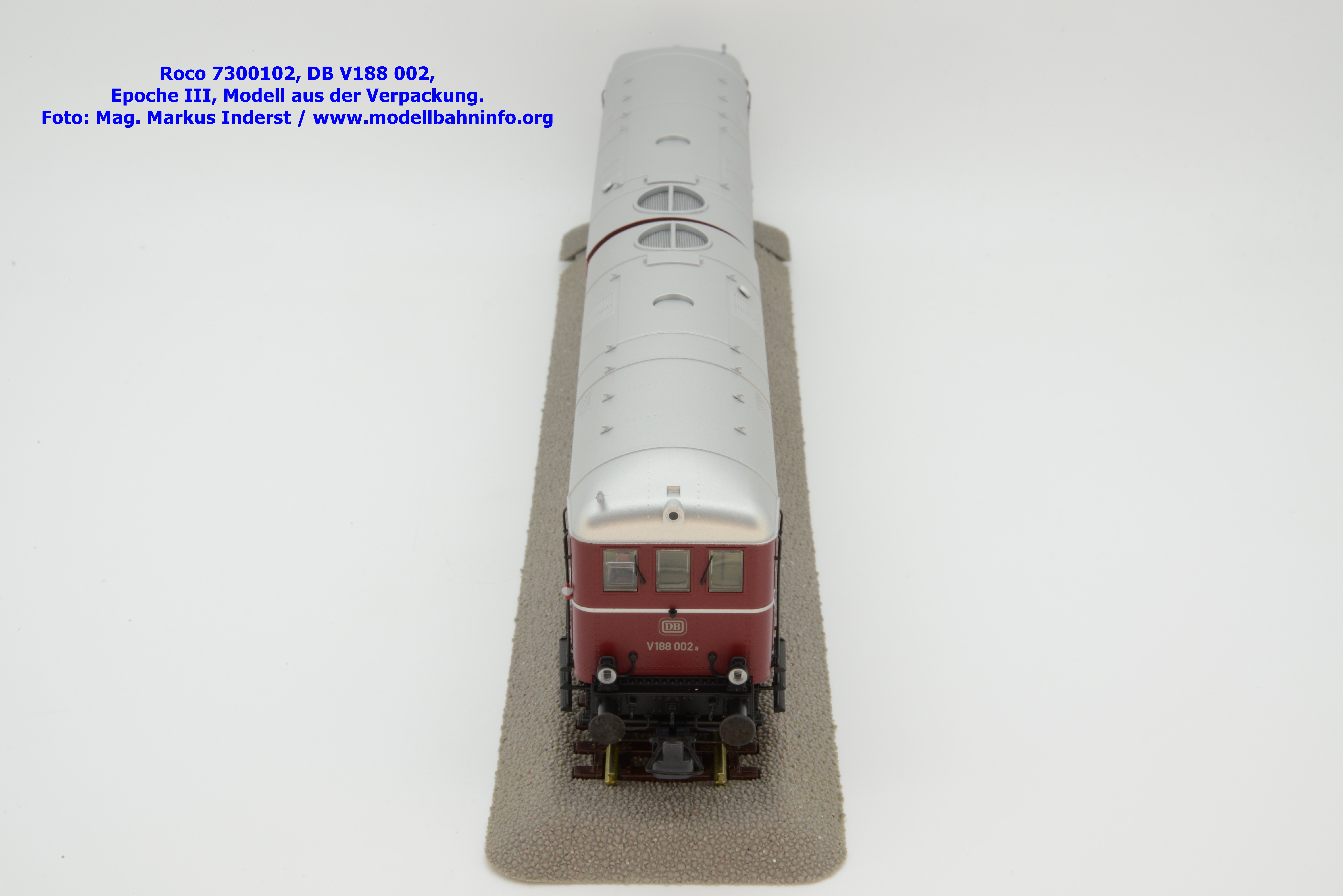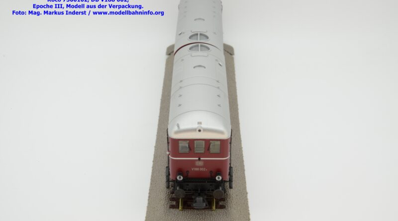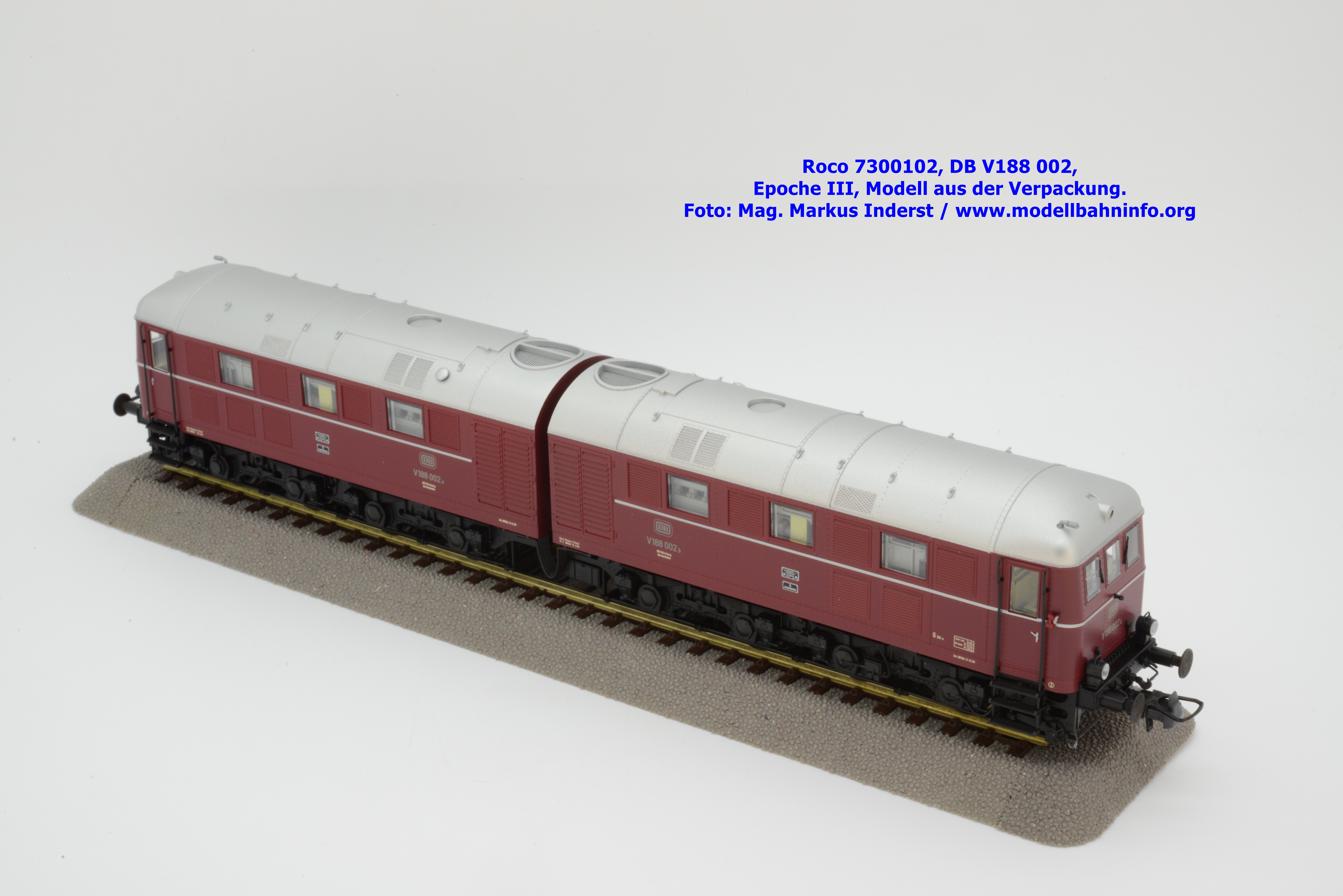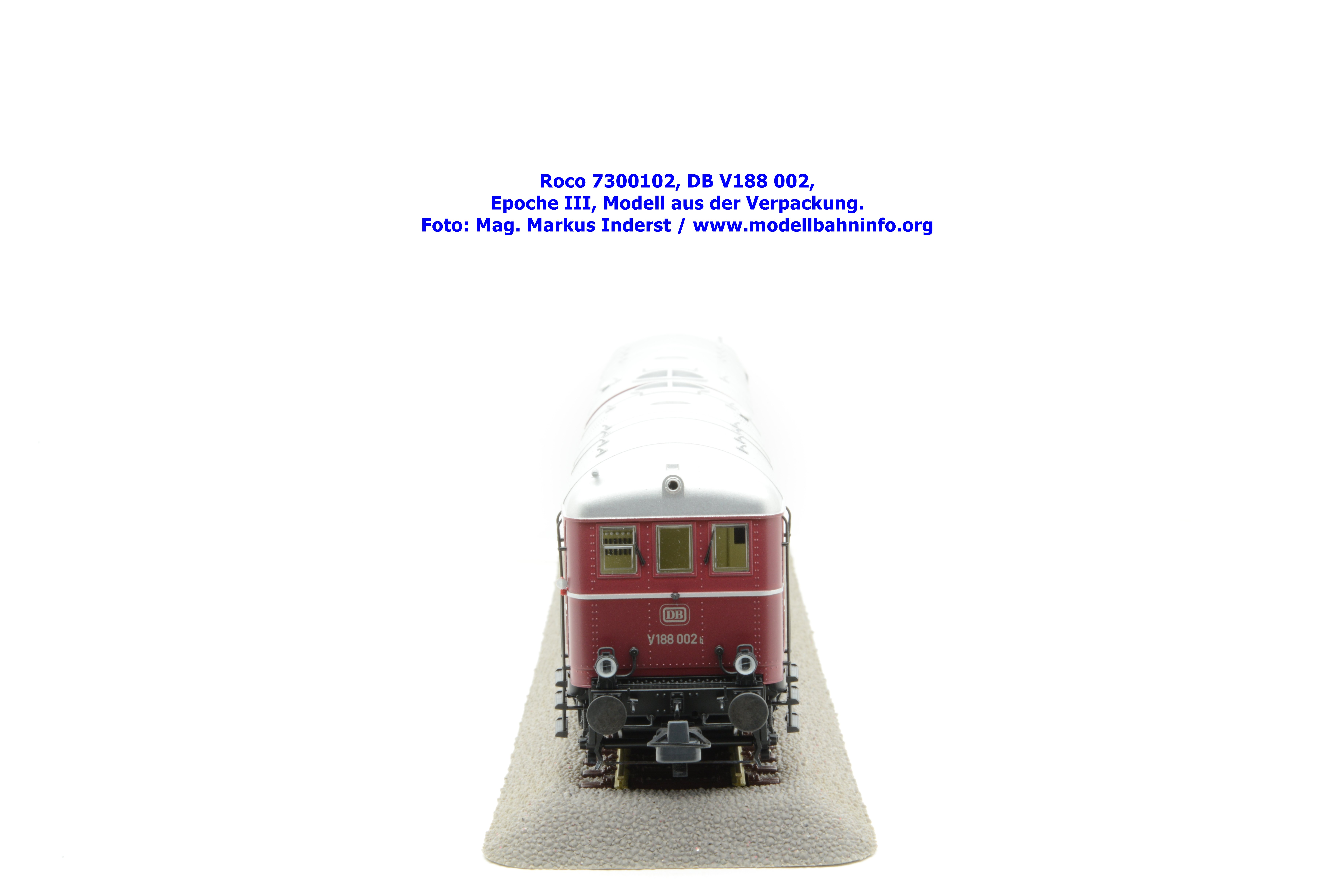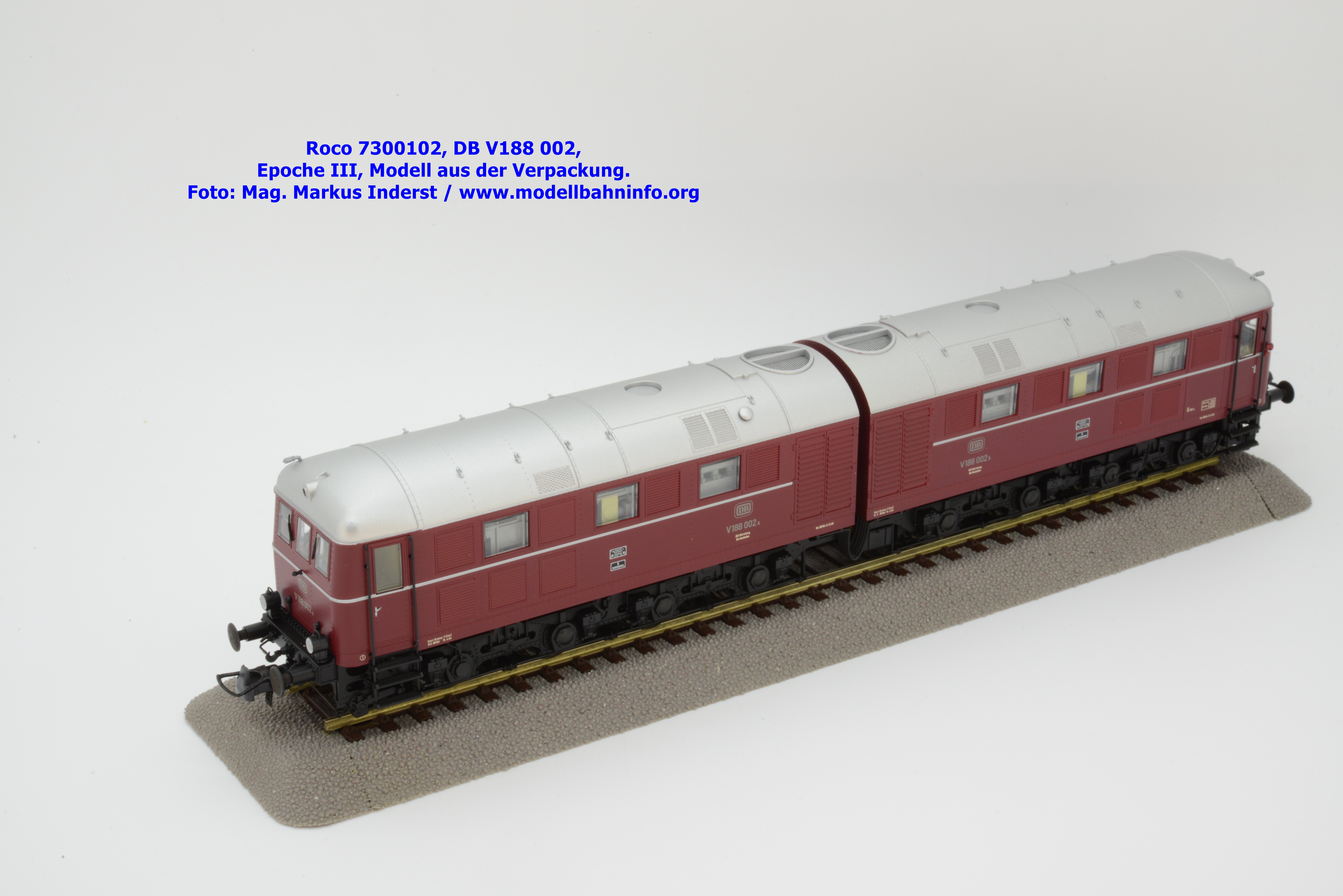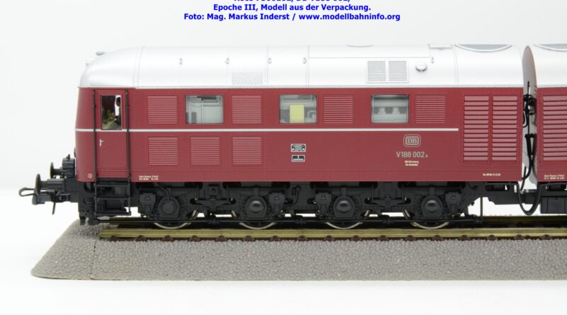 Das vorliegende Modell der grünen V 188 002 der DB wurde seitens des Herstellers als Formvariante angekündigt. Die wesentlichen Änderungen betreffen die Dachaufbauten im jeweils hinteren Bereich, aber auch die Ausführung der Drehgestellrahmen mit je vier Sandkästen. Das Modell entspricht in dieser Ausführung der Epoche III. Wie auch schon beim obigen Modell wurde wiederum eine hochwertige Verpackungsform verwendet. Die Lok ist mit den Fahrzeuganschriften V 188 002a bzw. V 188 002b beschriftet. Sie ist beim Bw Aschaffenburg der BD Nürnberg beheimatet. Die letzte Fahrzeuguntersuchung fand mit den Anschriften „Unt. AW Nür 8. 5.55“ statt. Die grüne Wehrmachtslok wurde in drei verschiedenen Ausführungen angekündigt. Unter der Artikelnummer 70117 ist die analoge Zweileiter-Gleichstrom-Ausführung zum UVP von € 379,90 erhältlich. Die Zweileiter-Wechselstrom-Ausführung wird unter der Artikelnummer 70118 und zum UVP von € 629,90 geführt. Die Dreileiter-Wechselstrom-Ausführung wird unter der Artikelnummer 78118 und ebenfalls zum UVP von € 629,90 vertrieben.