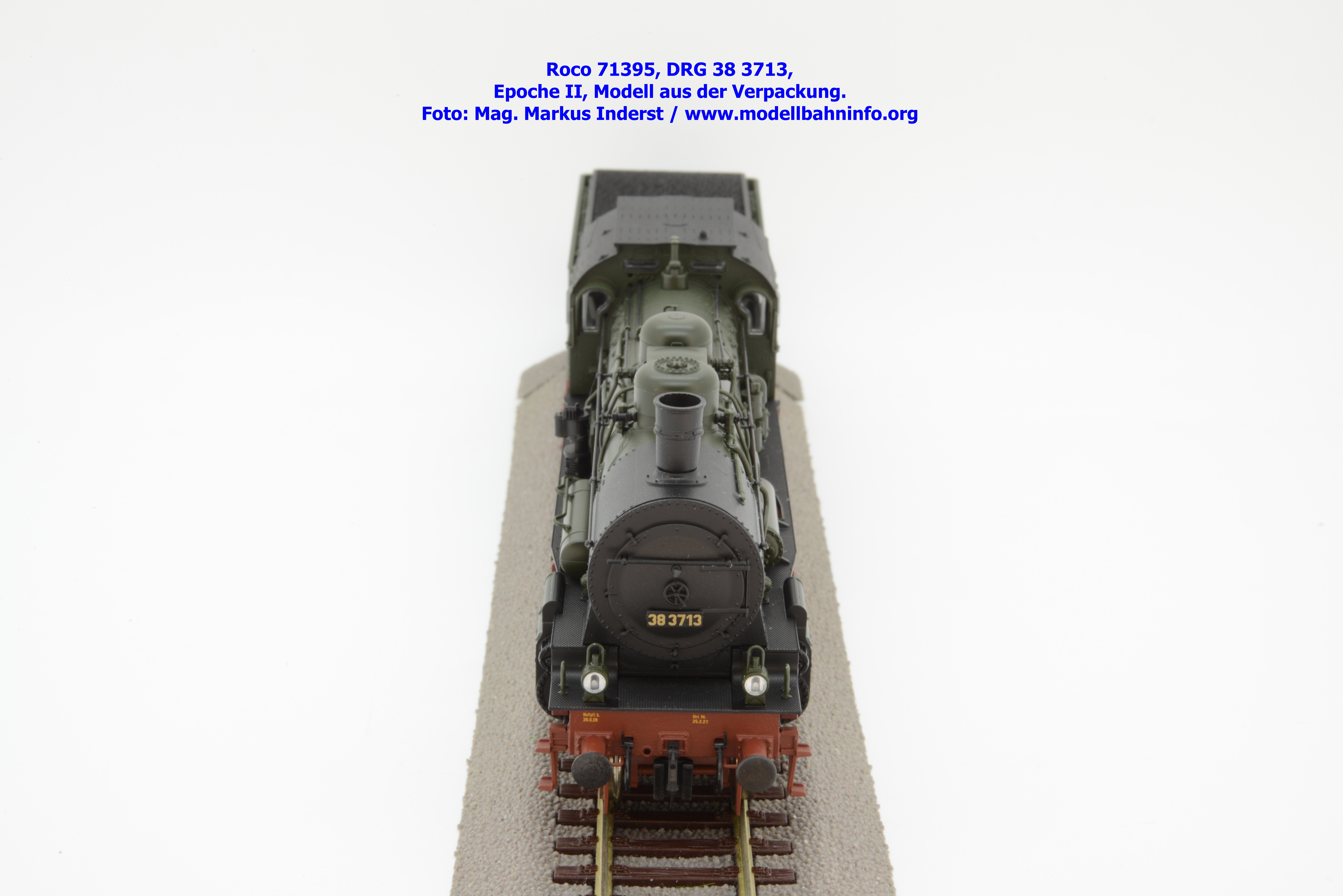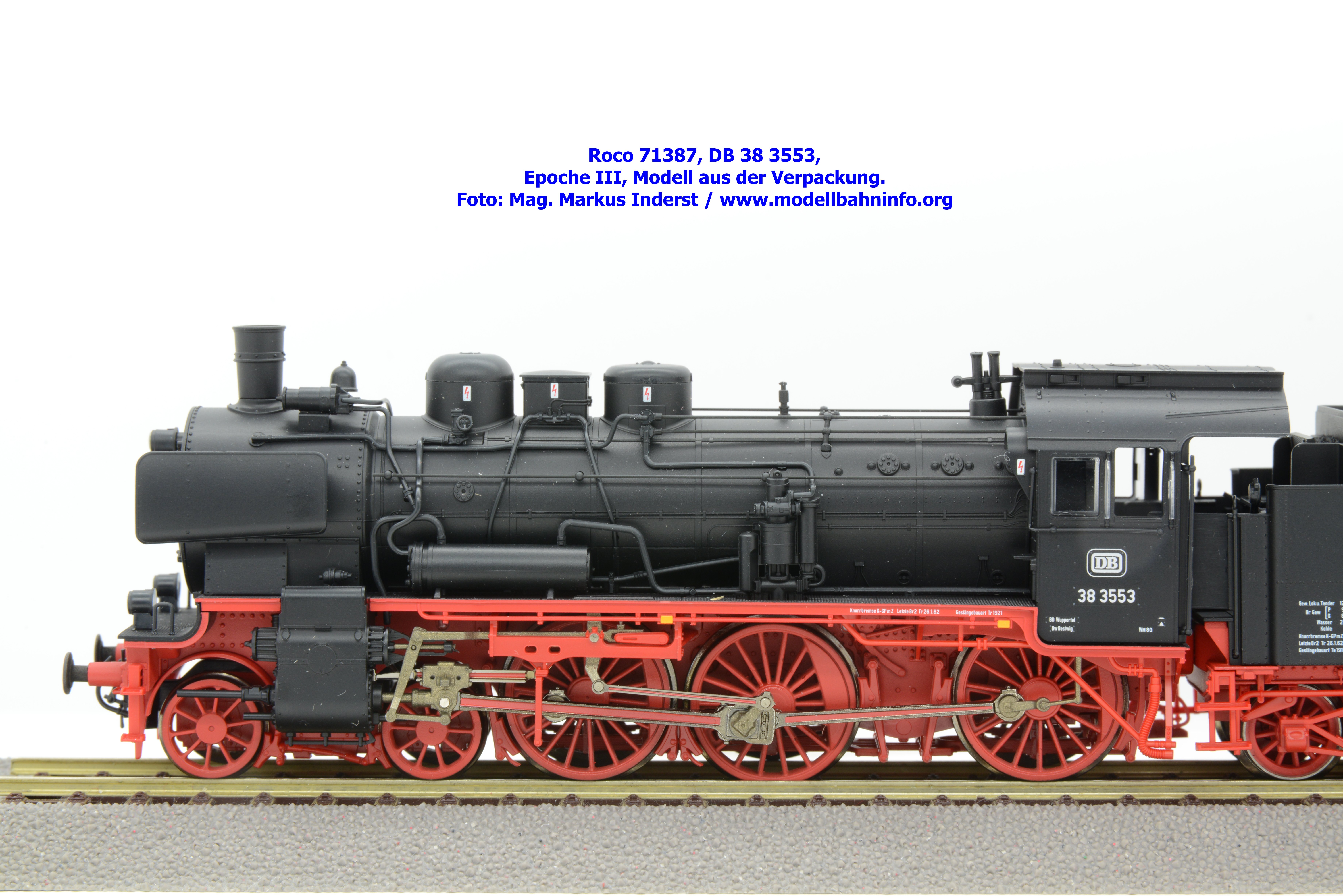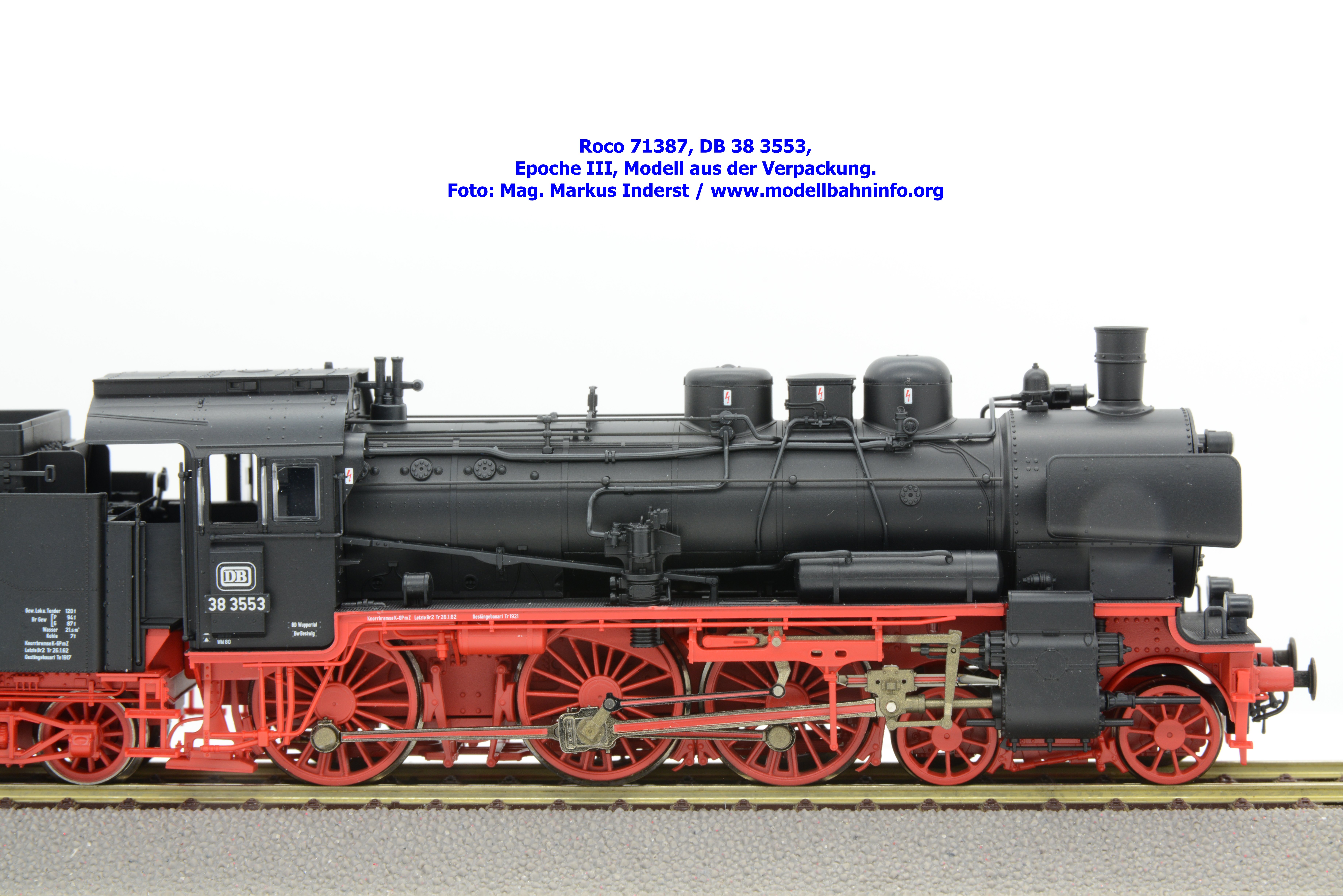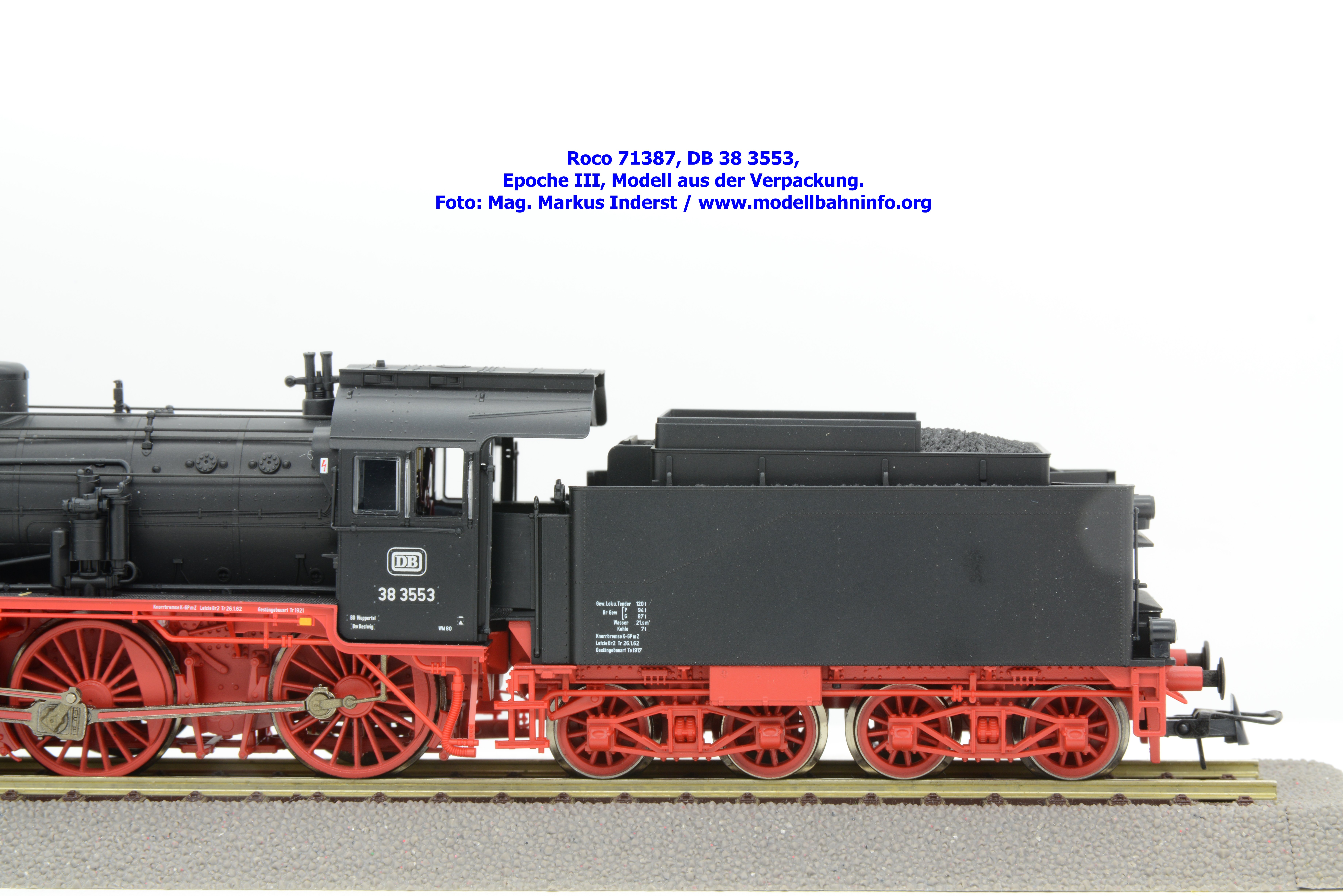 Dampflokomotiven sind von der Farbgebung sehr einfach zu realisieren, sofern es sich nicht um Farblackierungen der Länderbahnzeit handelt. Das Modell ist in den Farbtönen Schwarz bzw. Rot gehalten und seidenmatt lackiert. Die Beschriftung ist lupenrein aufgetragen und besteht neben den Anschriften am Führerhaus auch verschiedene Anschriften am Lokkessel, an der Rauchkammertüre sowie auf der Tenderrückwand. Roco hat bei der DR-Lokomotive die Loknummer 38 2471-1 angeschrieben. Die Maschine ist beim Bw Roßlau in der Rbd Magdeburg stationiert. Die letzten Revisionsdaten sind mit den Angaben Letzte Br Unt Mei 12.10.70 vermerkt. Auf der Pufferbrust steht hingegen die Angabe „H Unt Mei 14.10.66“. Die Anschriften sind sauber, trennscharf und mehrfarbig aufgetragen. Zudem besteht die Möglichkeit, die beiliegenden und lackierten Schildersätze am Modell anzubringen.