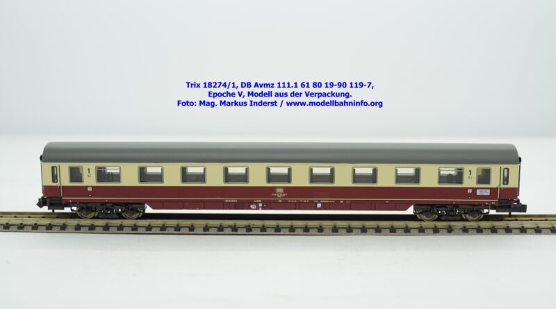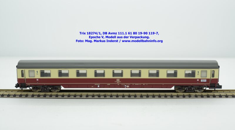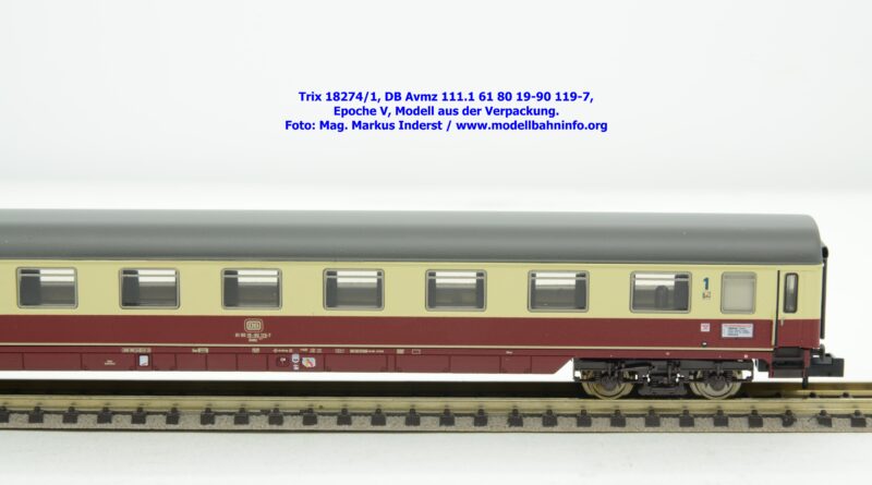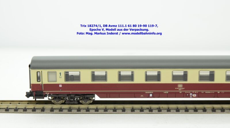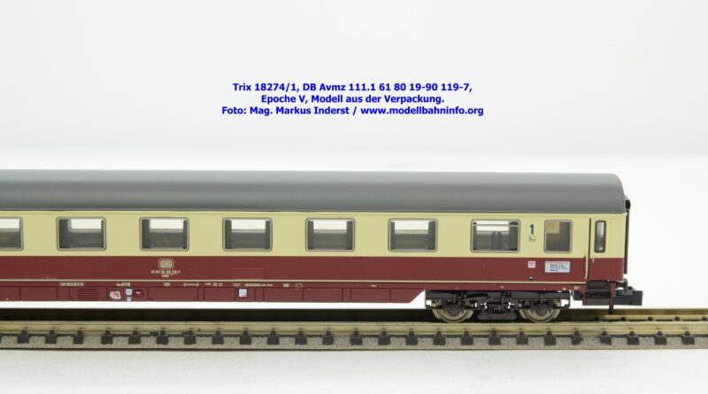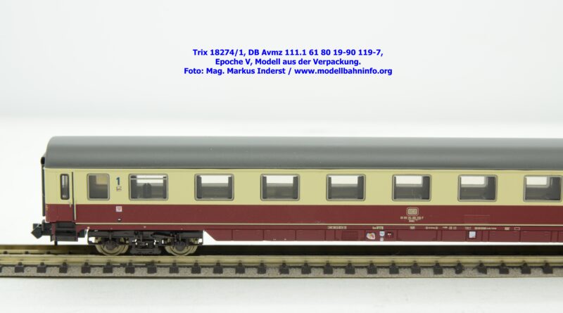 Der 1. Klasse Abteilwagen in den TEE-Farben gehört wie schon vorhin angegeben der Bauart Avmz 111.1 an. Am Modell ist die Ordnungsnummer 28 angeschrieben, die Wagennummer lautet hierbei auf 61 80 19-90 119-7. Der Wagen ist mit dem Heimatbahnhof Dortmund angeschrieben. Die Untersuchungsdaten werden mit REV AN X 27.10.88 bzw. Unt ANX 27.10.88 angegeben.