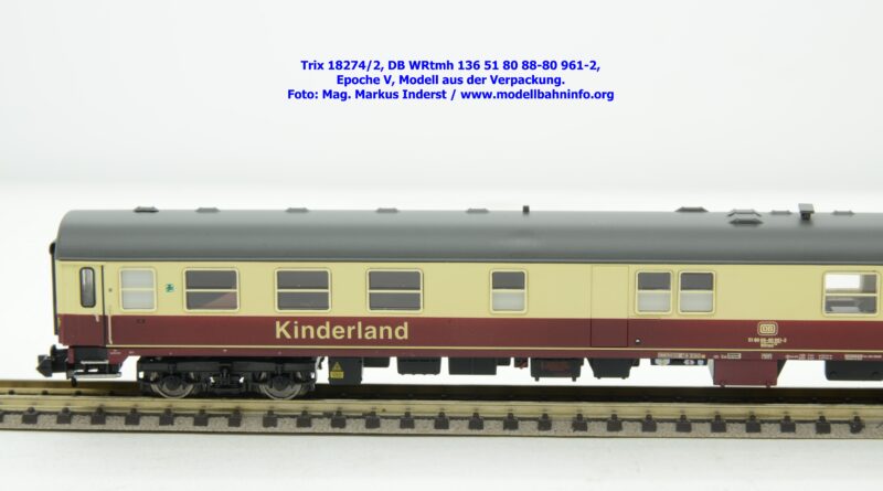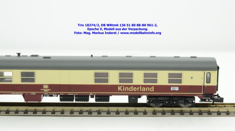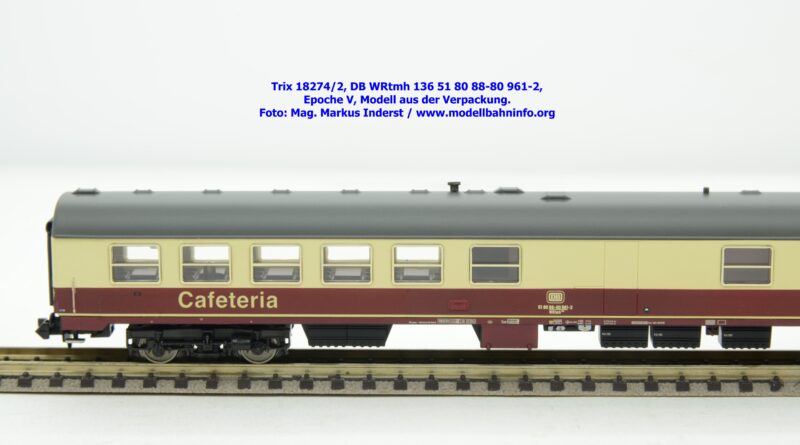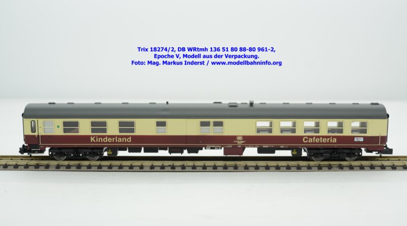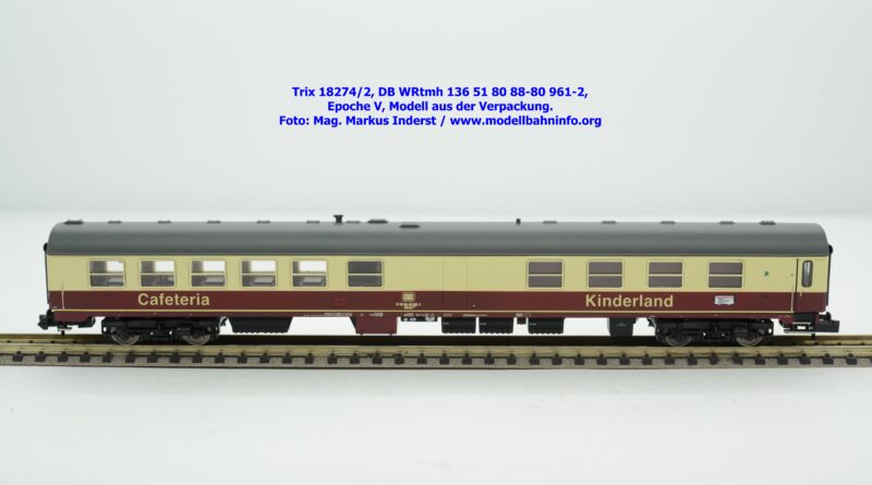 Minitrix hat dieses Wagenset unter dem Credo „100 Jahre Fernschnellzug“ bereits im Neuheitenprogramm 2023 vorgesehen und führt(e) den Artikel als Schnellzugwagen-Set 1 „FD 1922 Berchtesgadener Land“. Drei Jahre nach der Ankündigung, wenngleich der neukonstruierte Speisewagen WRtmh 136 schon seit gut drei Monaten lieferbar ist, wurde das besagte Wagenset an den Fachhandel ausgeliefert. Das Wagenset beinhaltet drei verschiedene Wagentypen, das sind ein 1. Klasse Abteilwagen mit der Gattungsbezeichnung Avmz 111.1 in TEE-Farben, der neukonstruierte Kinderlandwagen Cafeteria mit der Gattungsbezeichnung WRtmh 136 – ebenfalls in TEE-Farben – und der in ozeanblau/beige ausgeführte 2. Klasse Schnellzugwagen mit der Gattungsbezeichnung Bm 234. Alle Modelle sind für eine Innenbeleuchtung vorbereitet und werden in der üblichen Blisterverpackung des Herstellers ausgeliefert. Trix hat das Set vor drei Jahren zum UVP von € 179,– angekündigt und liefert es auch zu diesem Preis aus, obwohl zwischenzeitlich massive Preissteigerungen eingetreten sind!