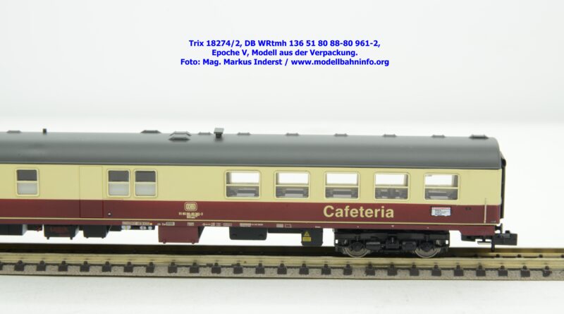Der Speisewagen WRtmh 136 gilt als Neukonstruktion und ist bereits im Farbschema Ozeanblau/beige als Einzelwagen erhältlich. Das Modell in den TEE-Farben ist Bestandteil des Sets und wurde mit der Wagennummer 51 80 88-80 961-2 versehen. Der Wagen hat ebenfalls seinen Heimatbahnhof in Dortmund. Im Revisionsraster stehen die Angaben REV E00 28.03.88 bzw. Unt ANX 29.03.88.
