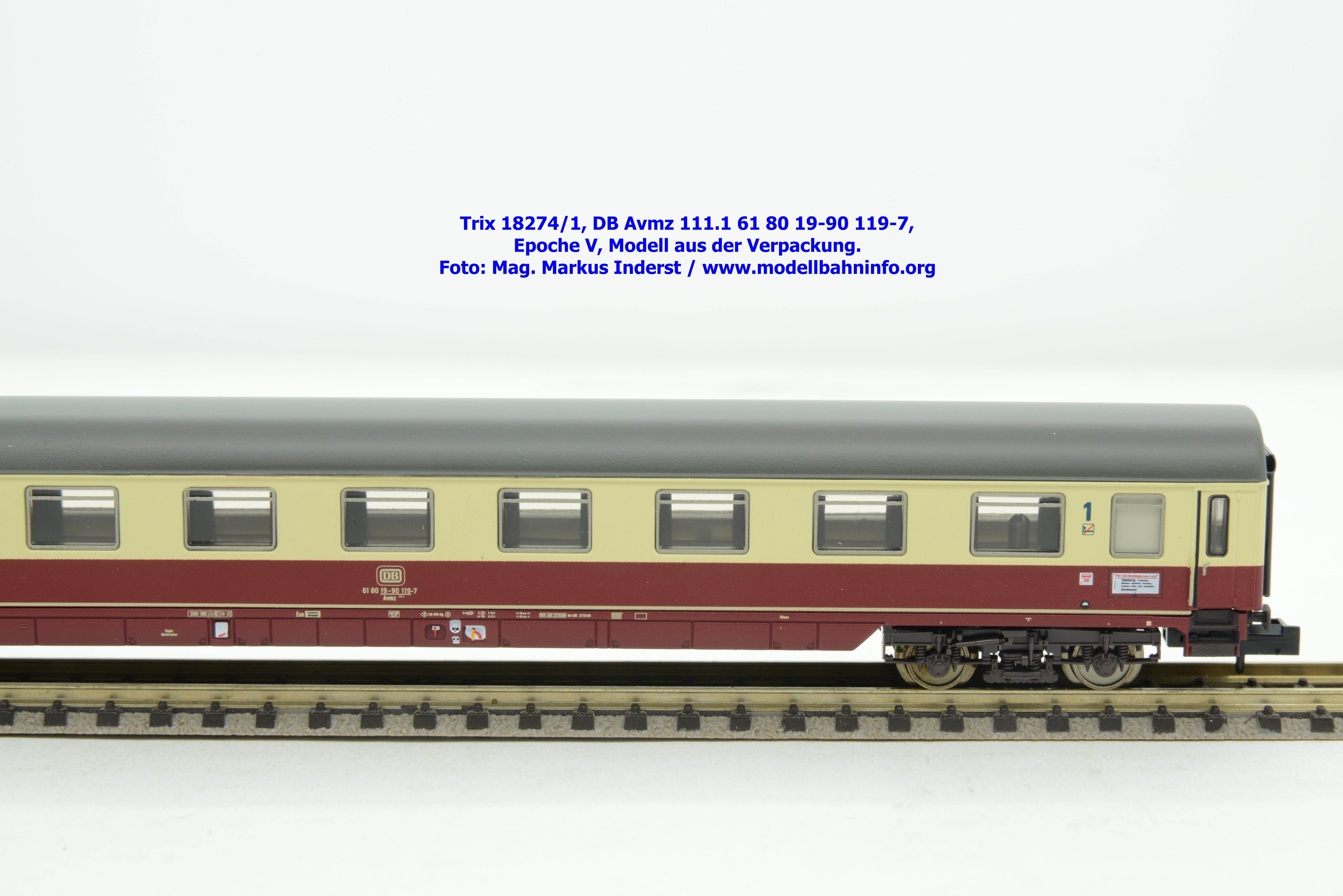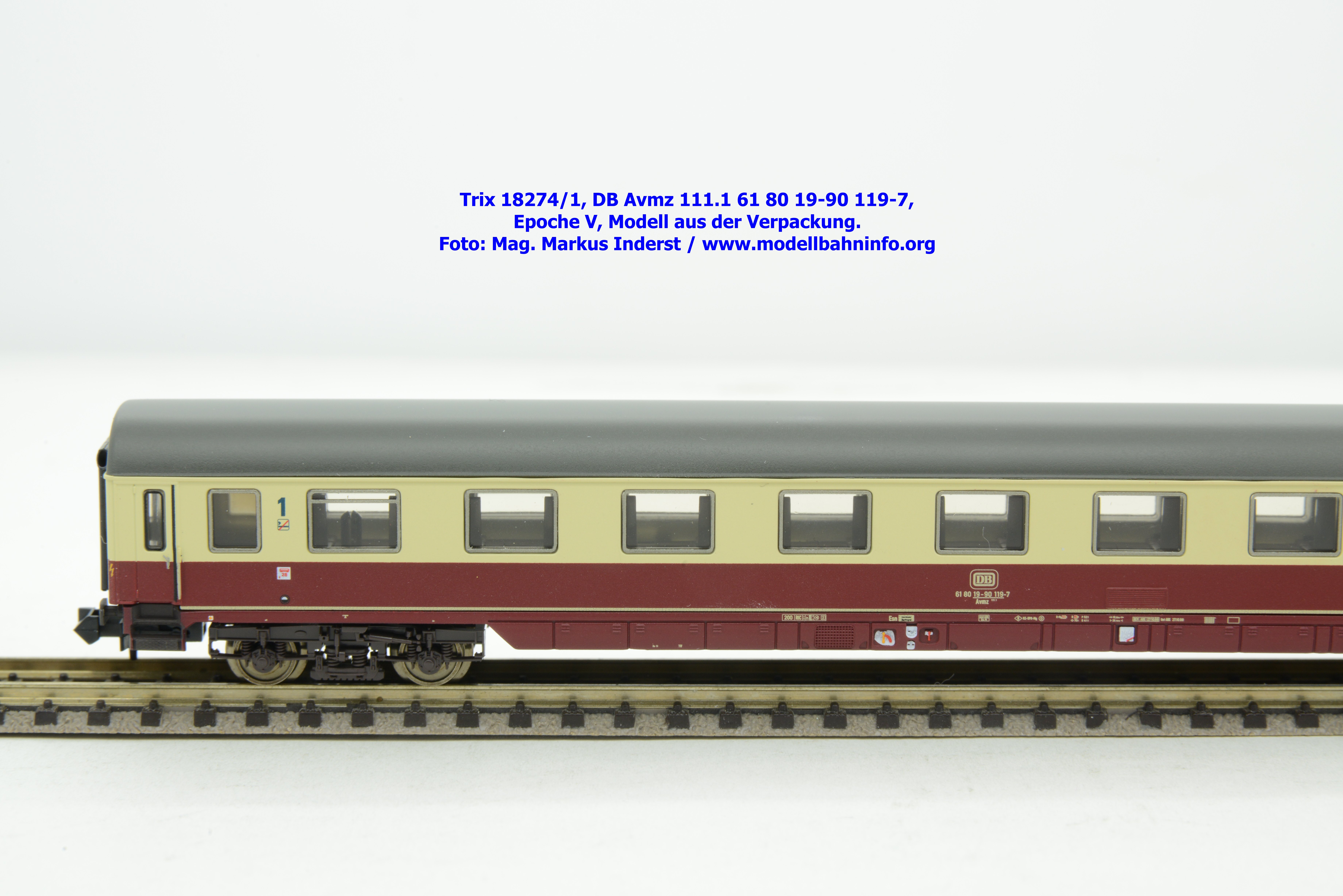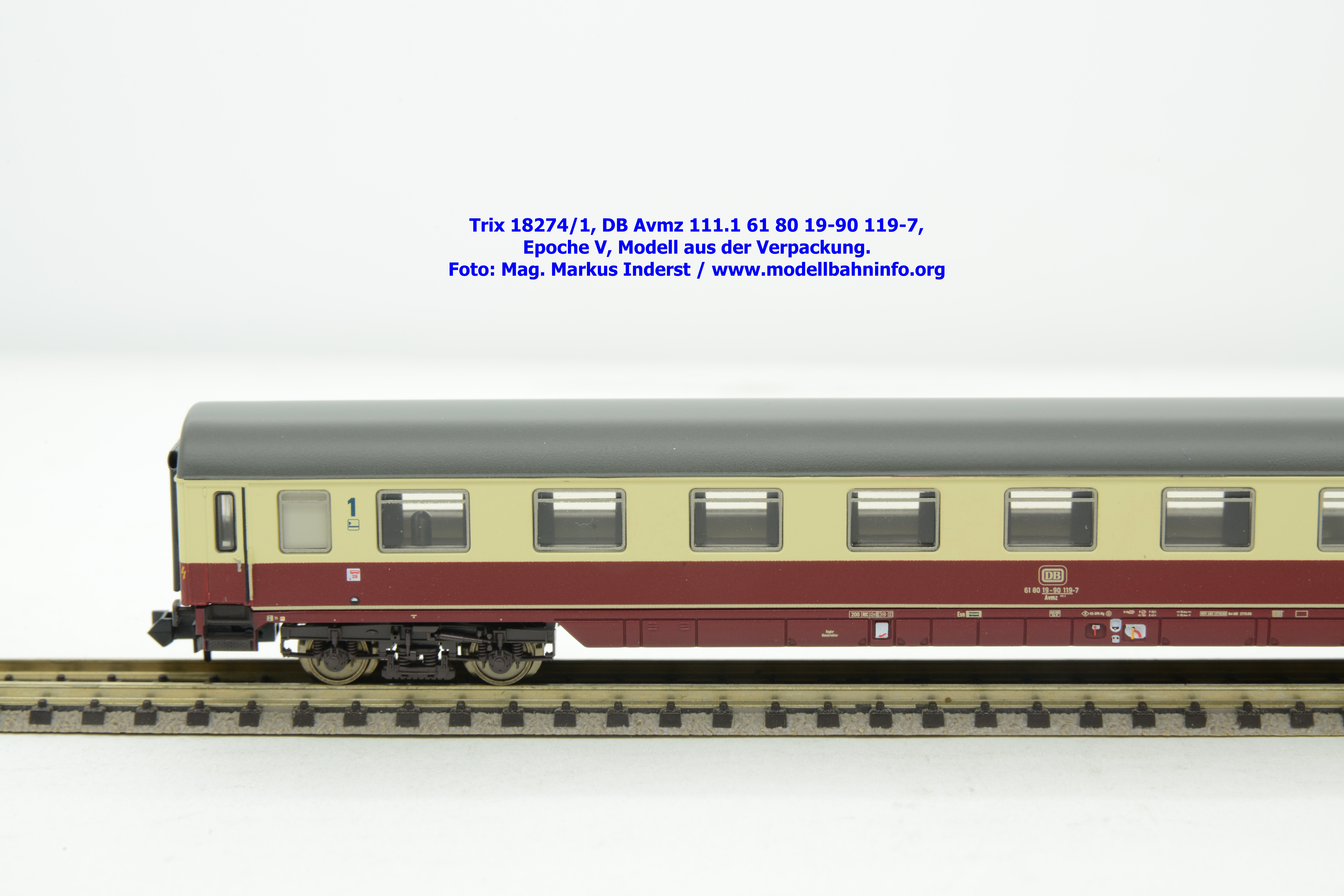 Der 1. Klasse Abteilwagen in den TEE-Farben gehört wie schon vorhin angegeben der Bauart Avmz 111.1 an. Am Modell ist die Ordnungsnummer 28 angeschrieben, die Wagennummer lautet hierbei auf 61 80 19-90 119-7. Der Wagen ist mit dem Heimatbahnhof Dortmund angeschrieben. Die Untersuchungsdaten werden mit REV AN X 27.10.88 bzw. Unt ANX 27.10.88 angegeben.