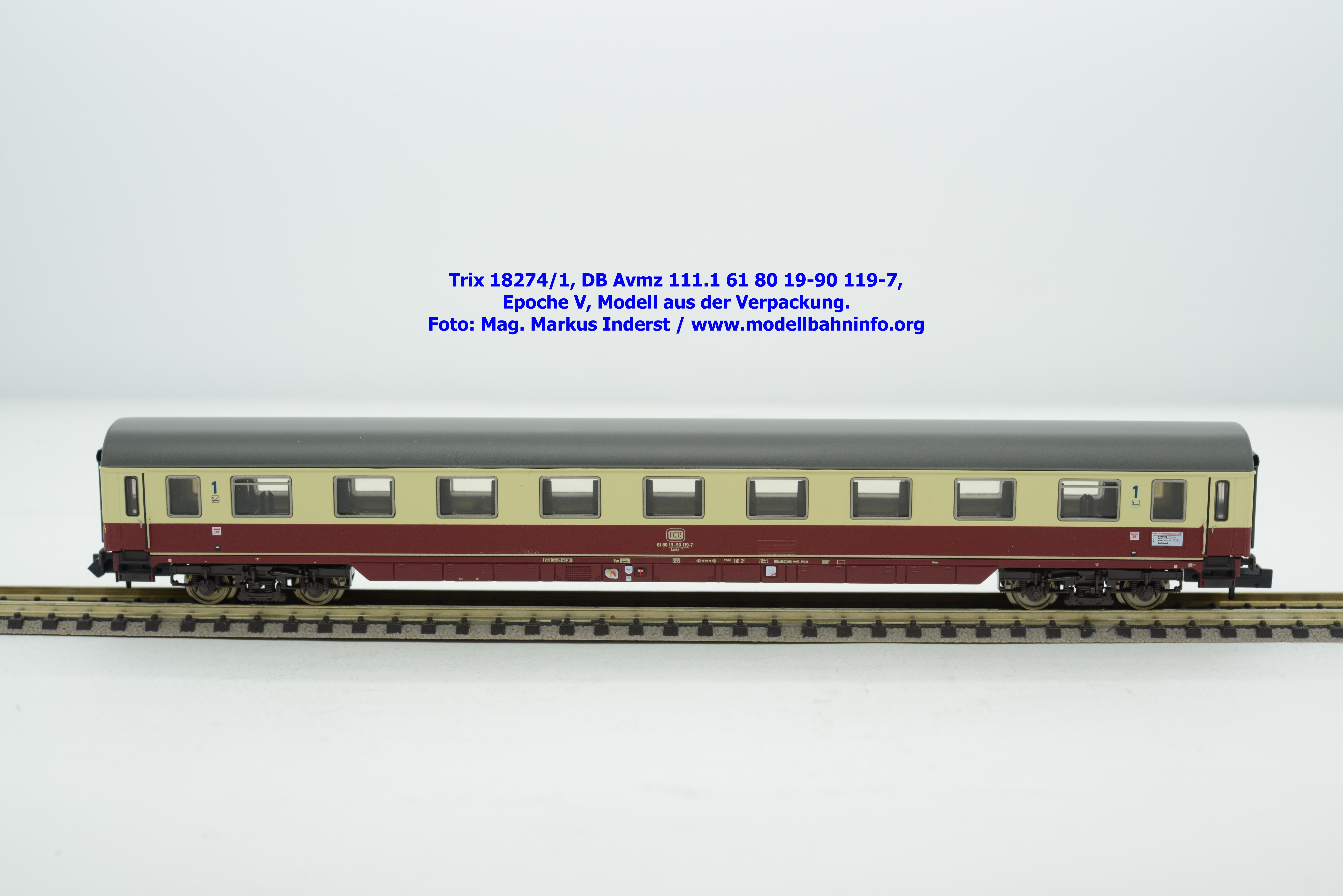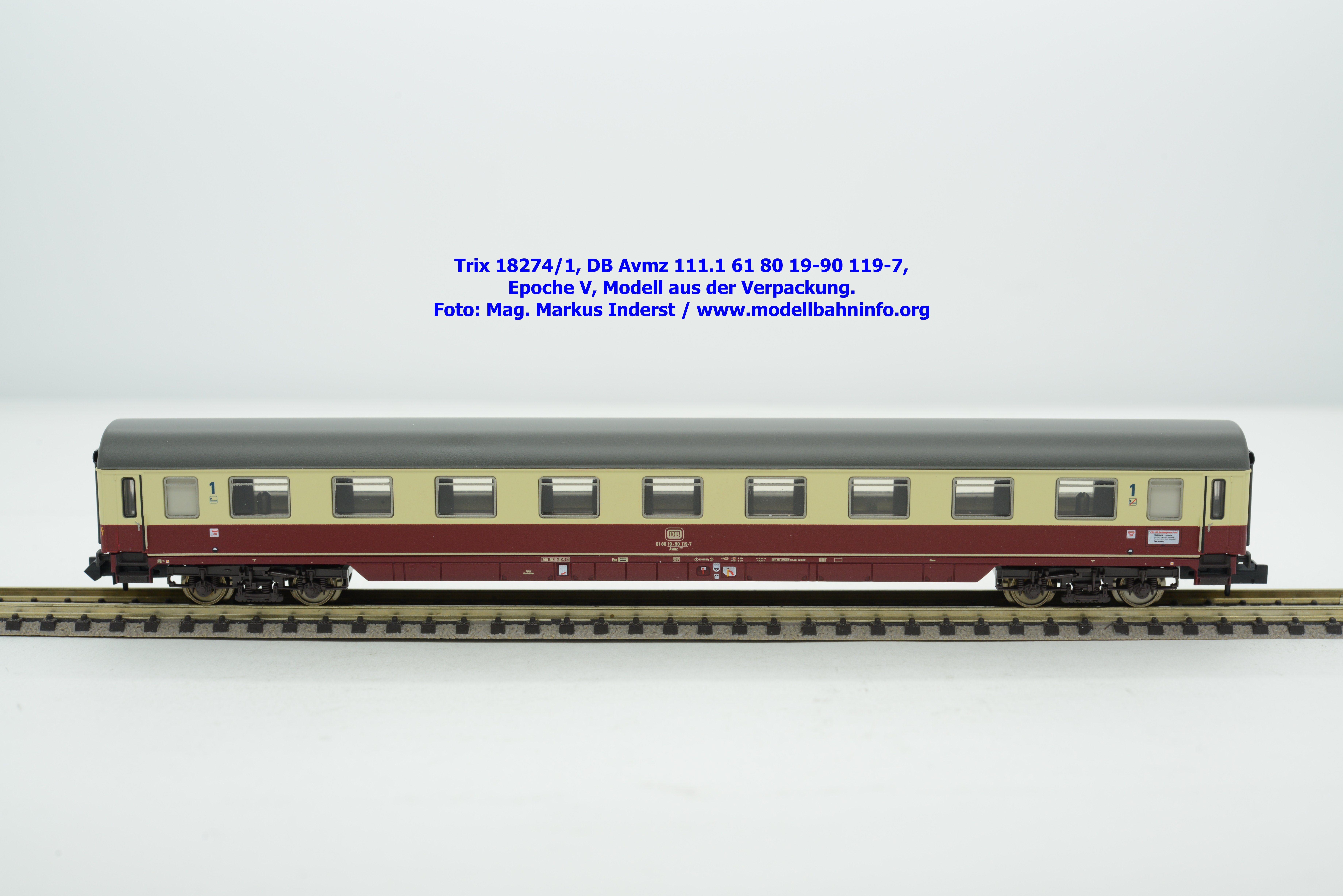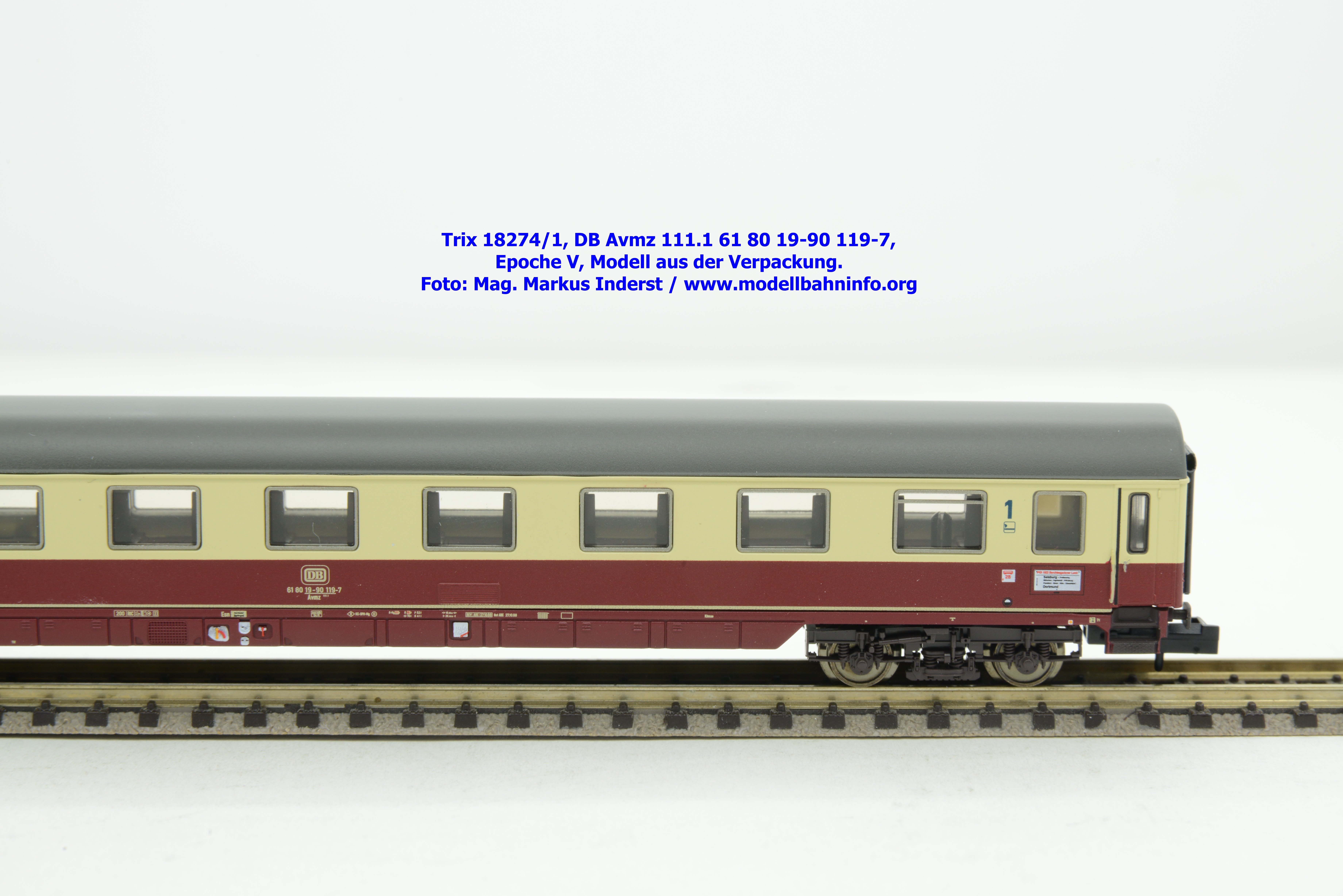 Der 1. Klasse Abteilwagen in den TEE-Farben gehört wie schon vorhin angegeben der Bauart Avmz 111.1 an. Am Modell ist die Ordnungsnummer 28 angeschrieben, die Wagennummer lautet hierbei auf 61 80 19-90 119-7. Der Wagen ist mit dem Heimatbahnhof Dortmund angeschrieben. Die Untersuchungsdaten werden mit REV AN X 27.10.88 bzw. Unt ANX 27.10.88 angegeben.