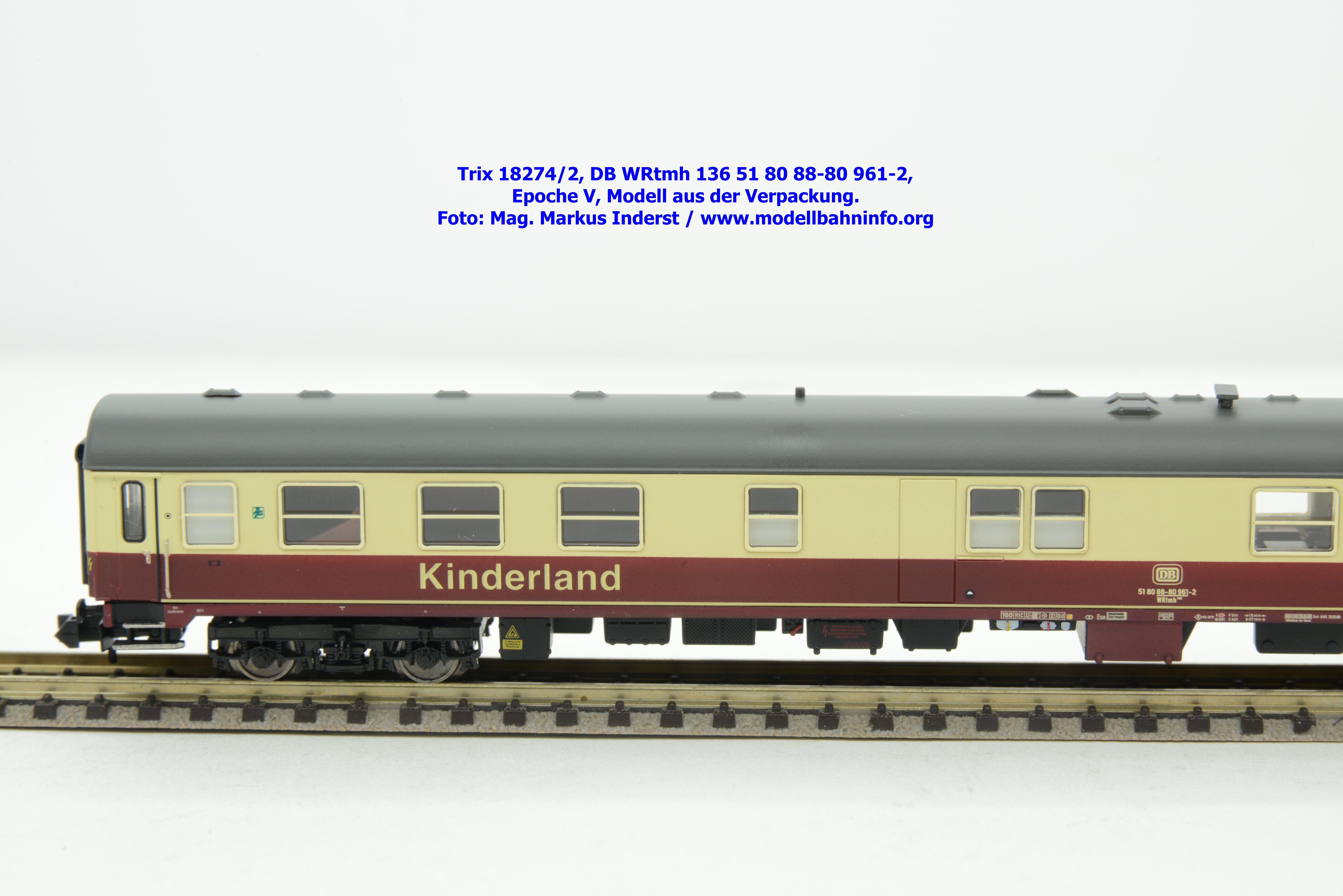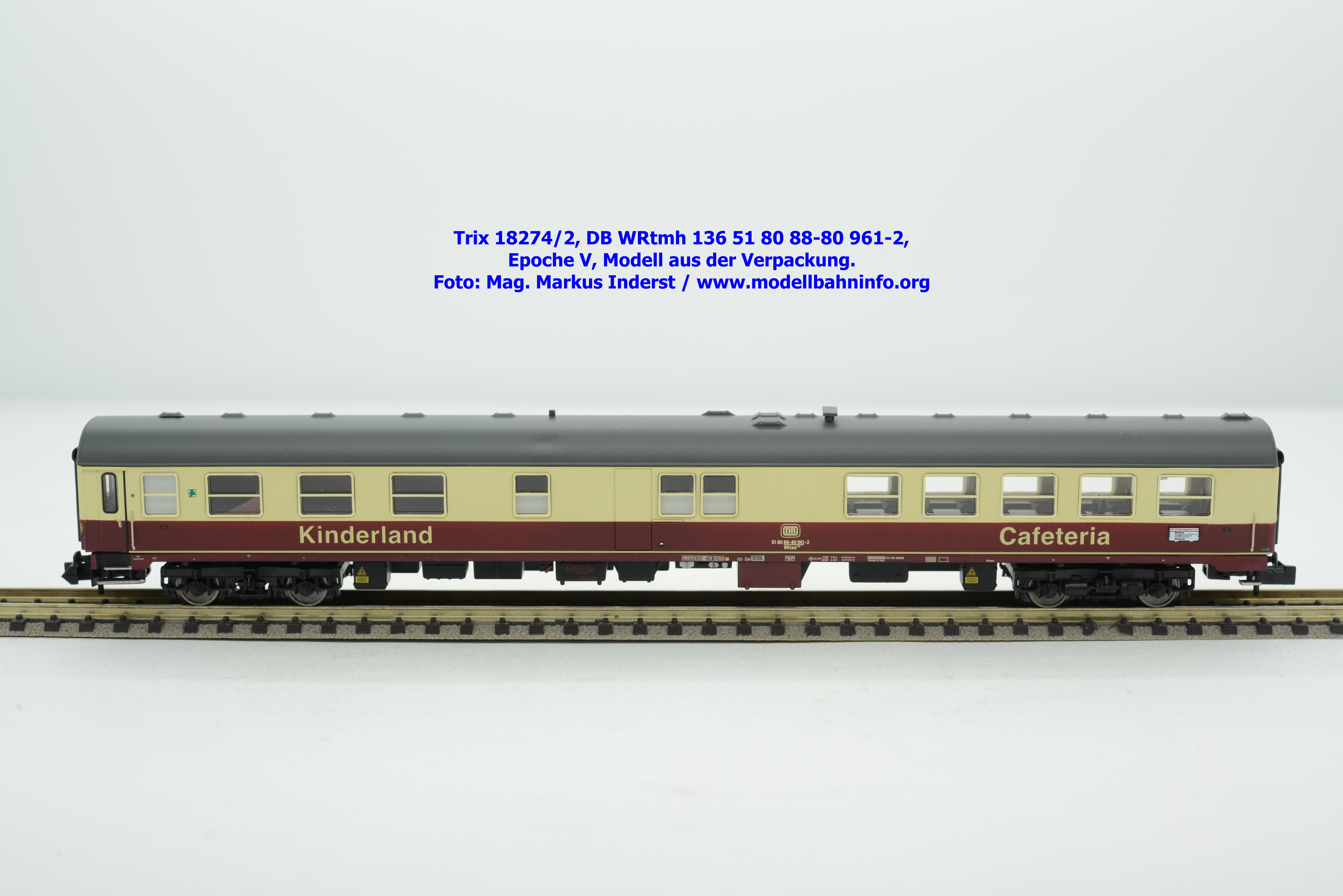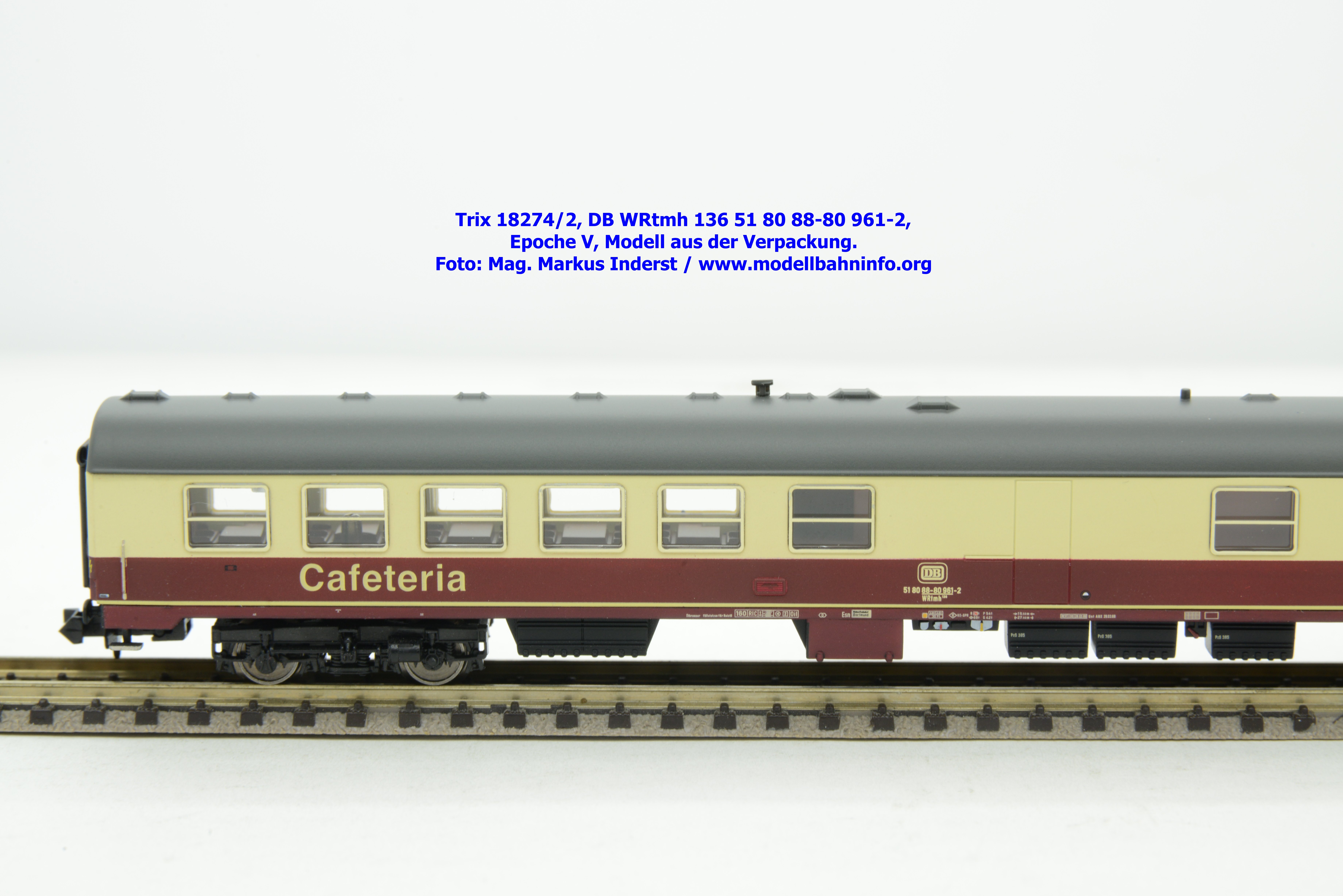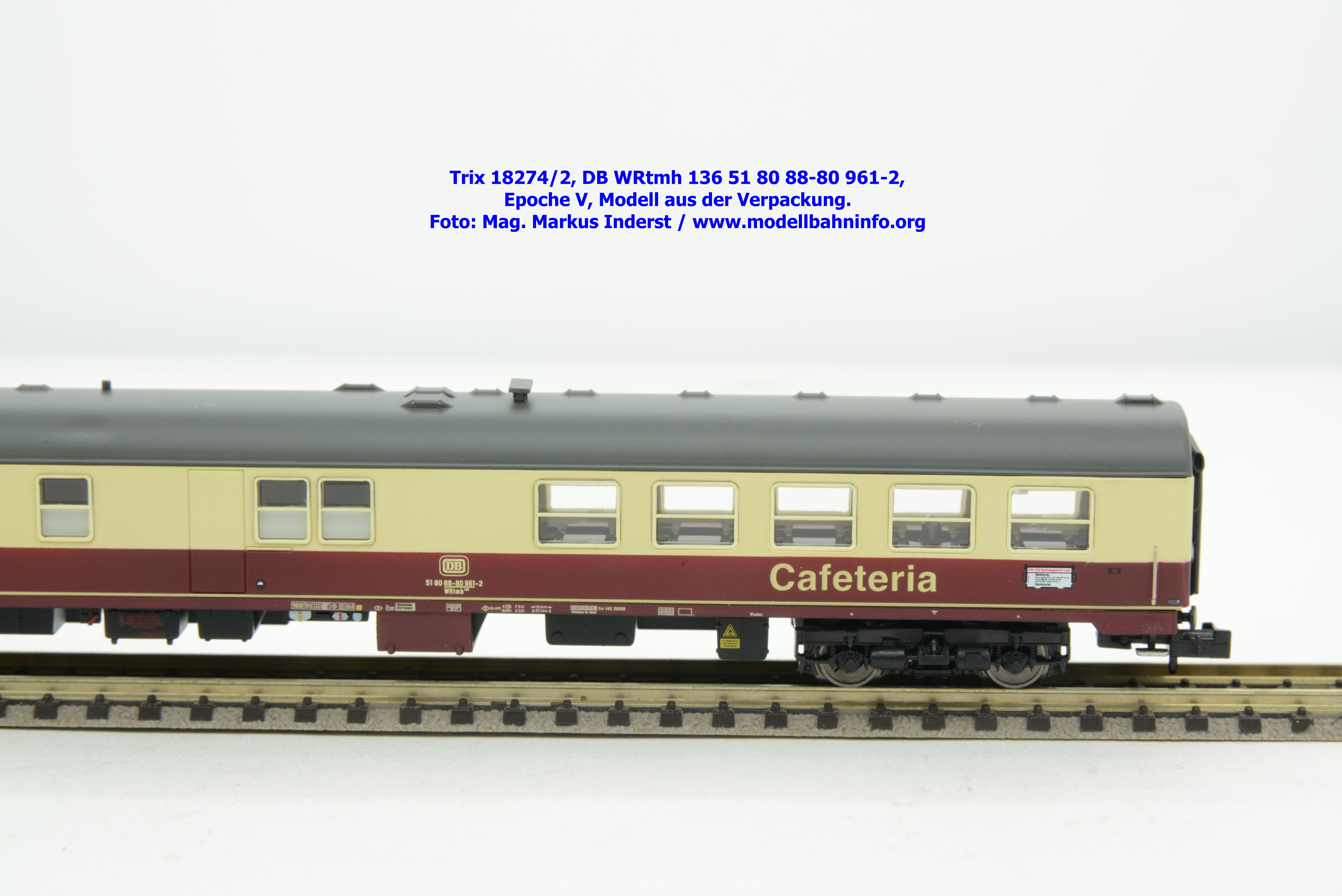 Der Speisewagen WRtmh 136 gilt als Neukonstruktion und ist bereits im Farbschema Ozeanblau/beige als Einzelwagen erhältlich. Das Modell in den TEE-Farben ist Bestandteil des Sets und wurde mit der Wagennummer 51 80 88-80 961-2 versehen. Der Wagen hat ebenfalls seinen Heimatbahnhof in Dortmund. Im Revisionsraster stehen die Angaben REV E00 28.03.88 bzw. Unt ANX 29.03.88.