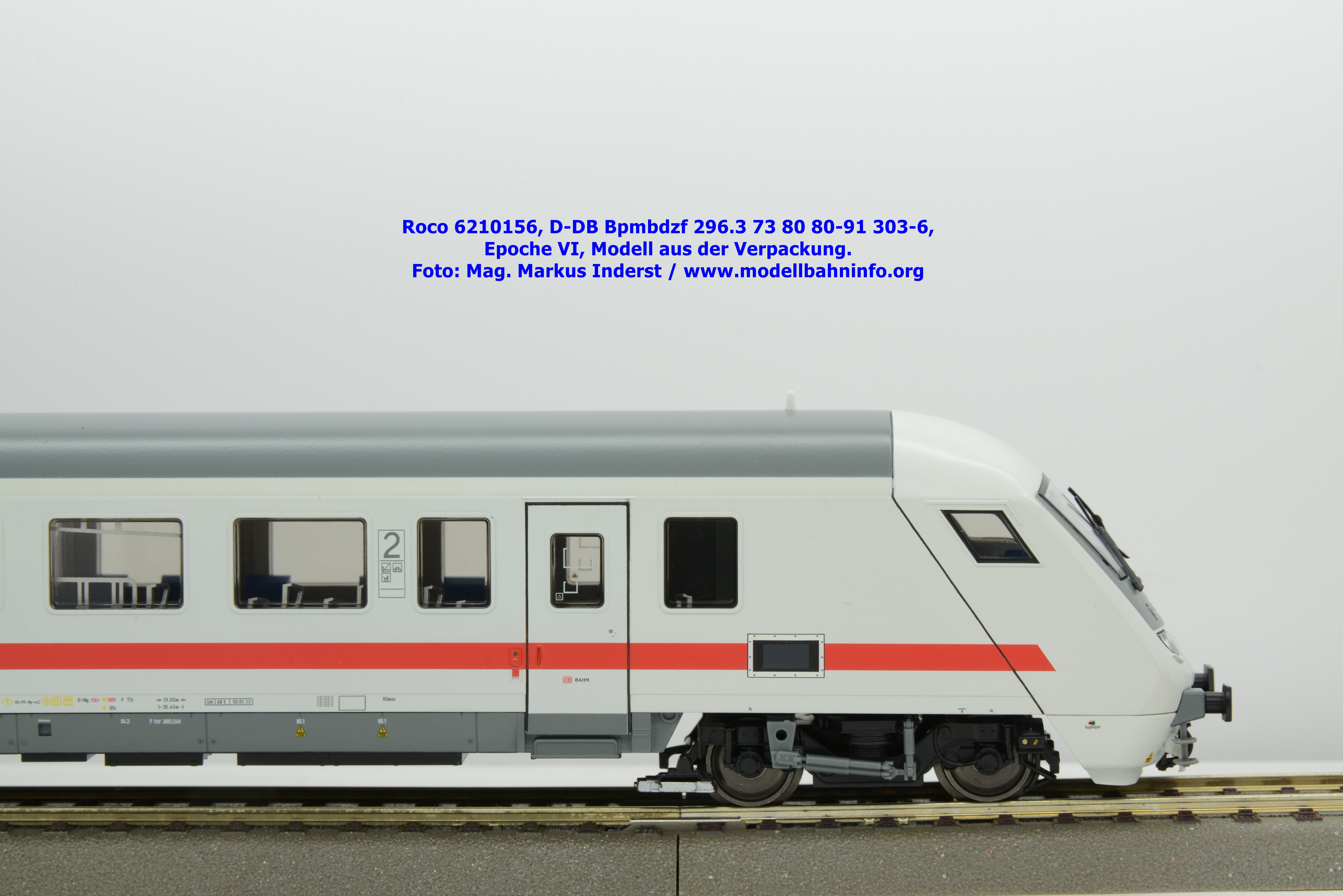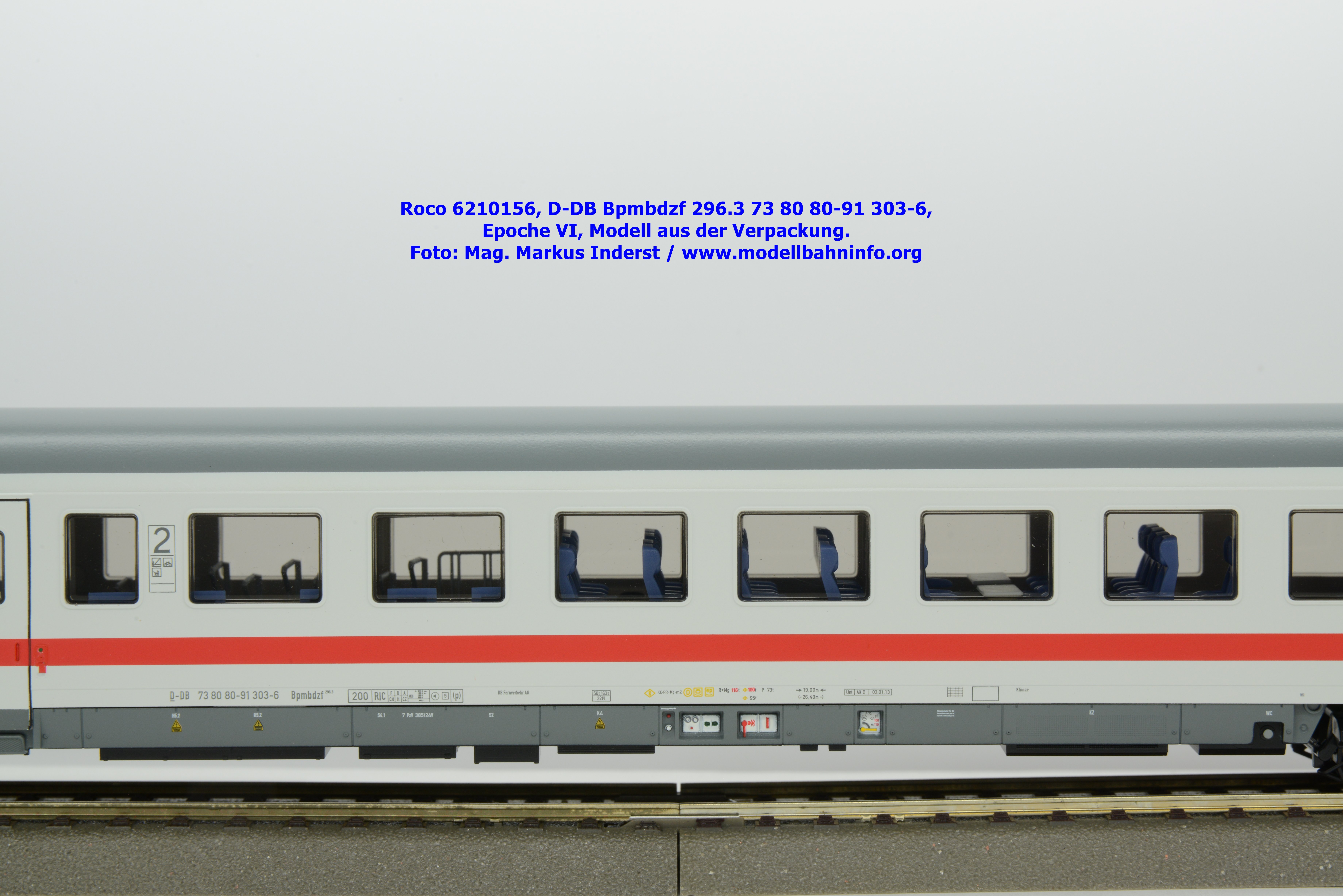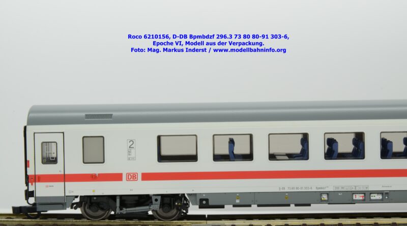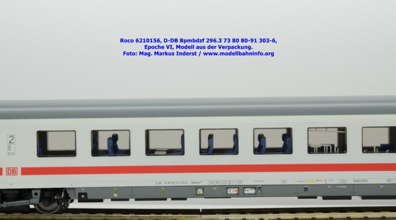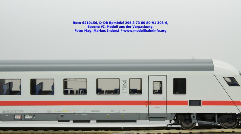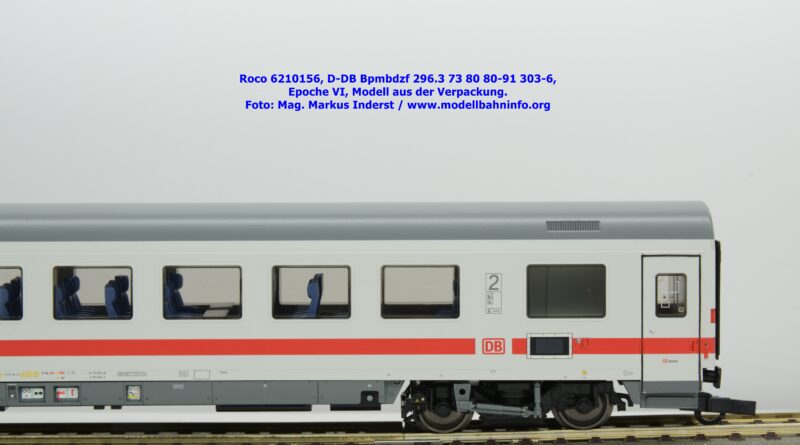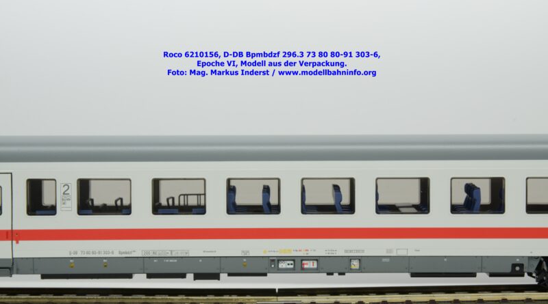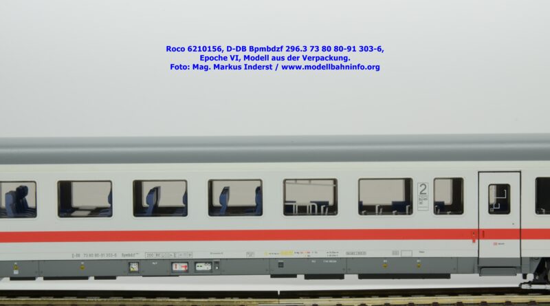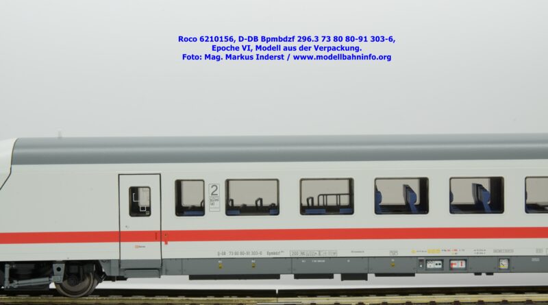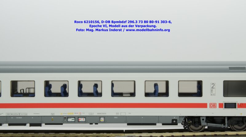 Auf Basis des vorhin vorgestellten IC-Steuerwagens hat Roco auch hierbei eine Formvariante in Erwägung gezogen, die bisher im Sortiment der Modellbahnhersteller gefehlt hat. Die DB AG hat im Zuge des Redesigns ab 2002 die Fahrzeuge mit druckdichten Übergängen ausgestattet, welcher am rückwärtigen Fahrzeugende zu sehen ist. Außerdem fehlt beim vorliegenden Modell die WLAN-Antenne. Dafür wurde bei der Inneneinrichtung eine freistehende Nachbildung der Fahrrad-Stände sowie die aufwendig und mehrfarbig ausgeführte Inneneinrichtung umgesetzt. Der im „Lazarett“-Design befindliche IC-Steuerwagen gehört der Gattungsbezeichnung Bpmbdzf 296.3 an und ist mit der Wagennummer 73 80 80-91 303-6 bedruckt worden. Der Wagen gehört zum DB Fernverkehr und weist die Untersuchungsanschriften Unt AN X 03.01.13 auf. Roco fertigt das Modell des druckdichten IC-Steuerwagens in zwei Ausführungen, und zwar als analoge Gleichstrom-Ausführung, welche unter der Artikelnummer 6210156 zum UVP von € 169,90 vertrieben wird. Das Dreileiter-Wechselstrom-Pandent weist die Artikelnummer 6220156 und den UVP von € 174,90 auf.