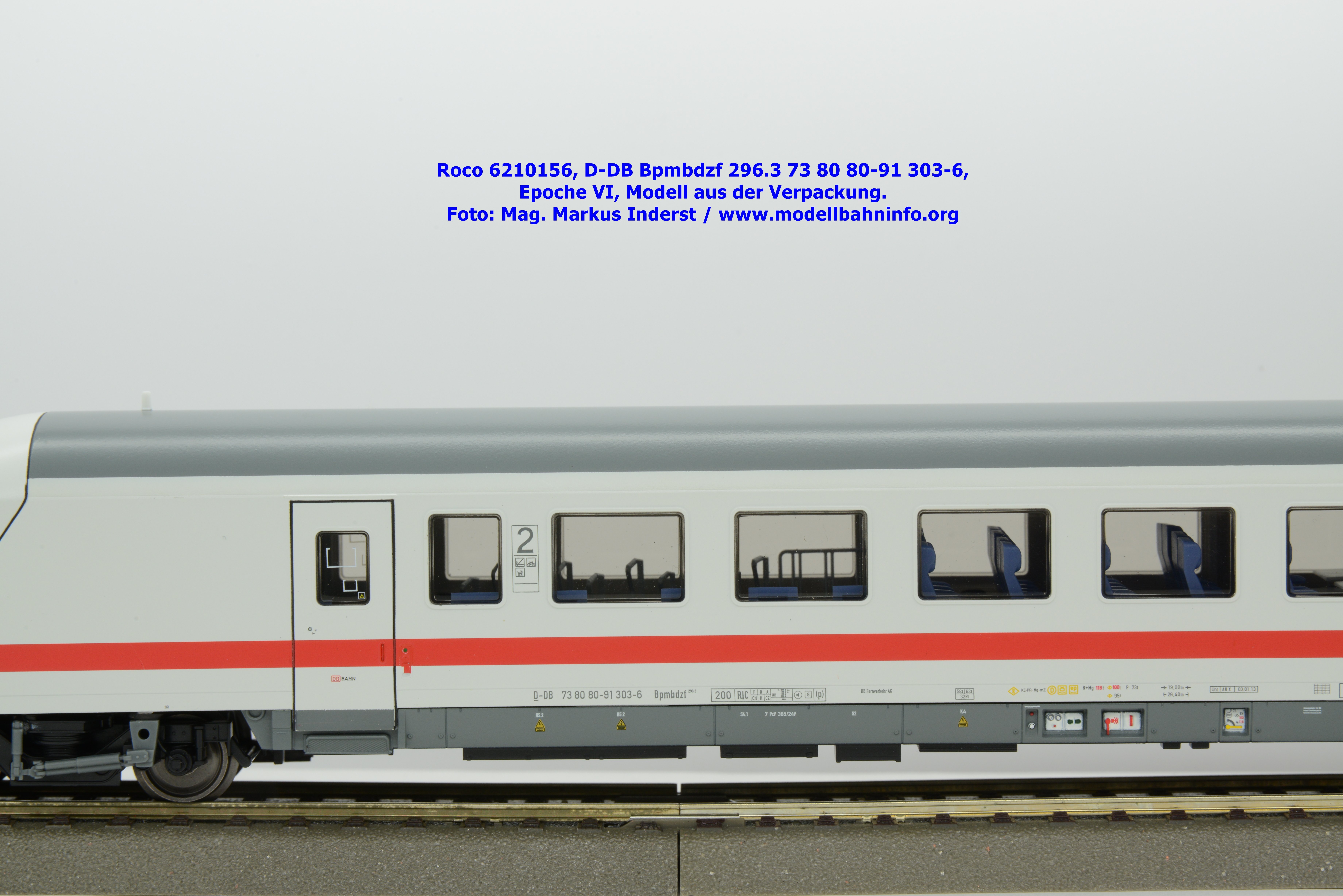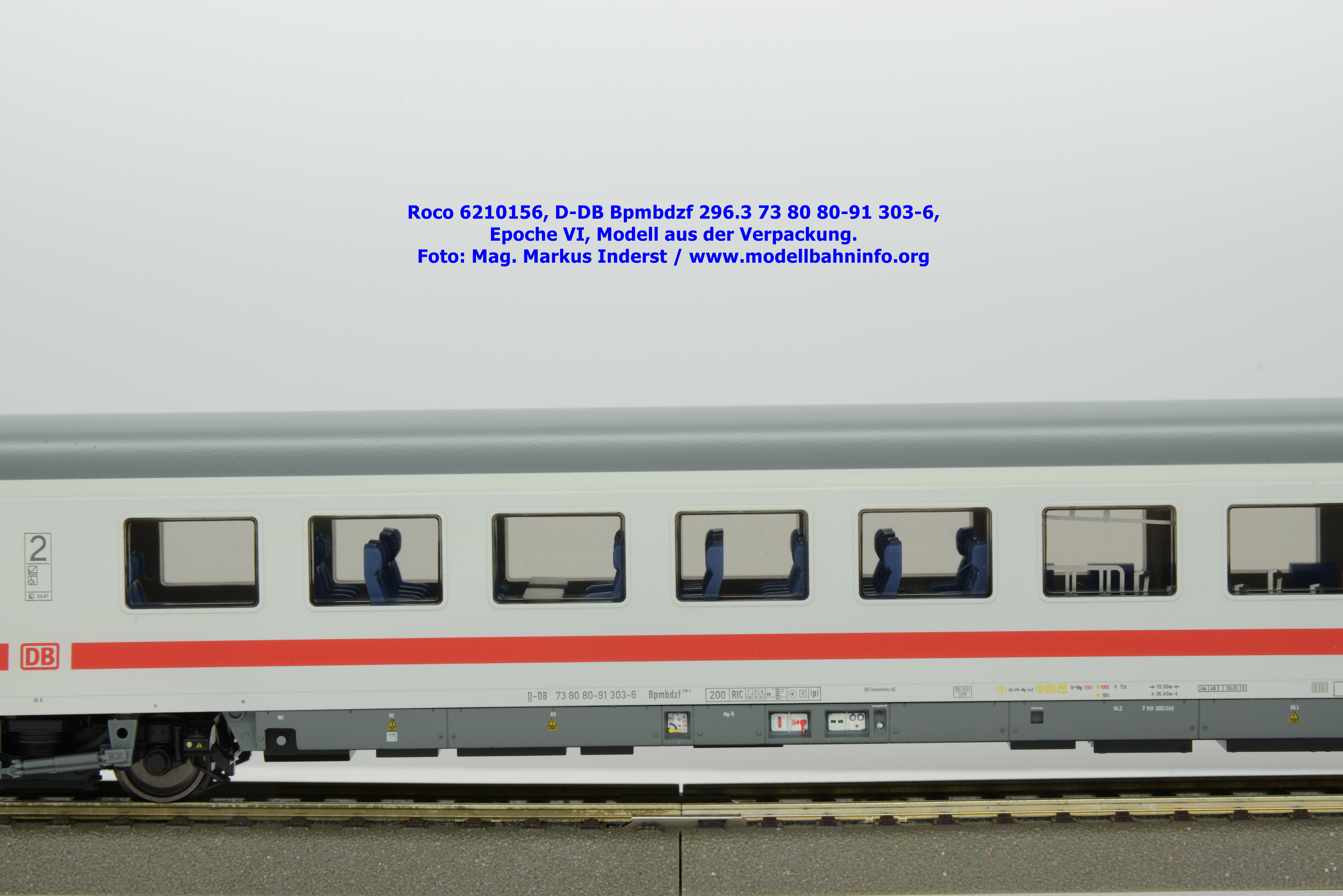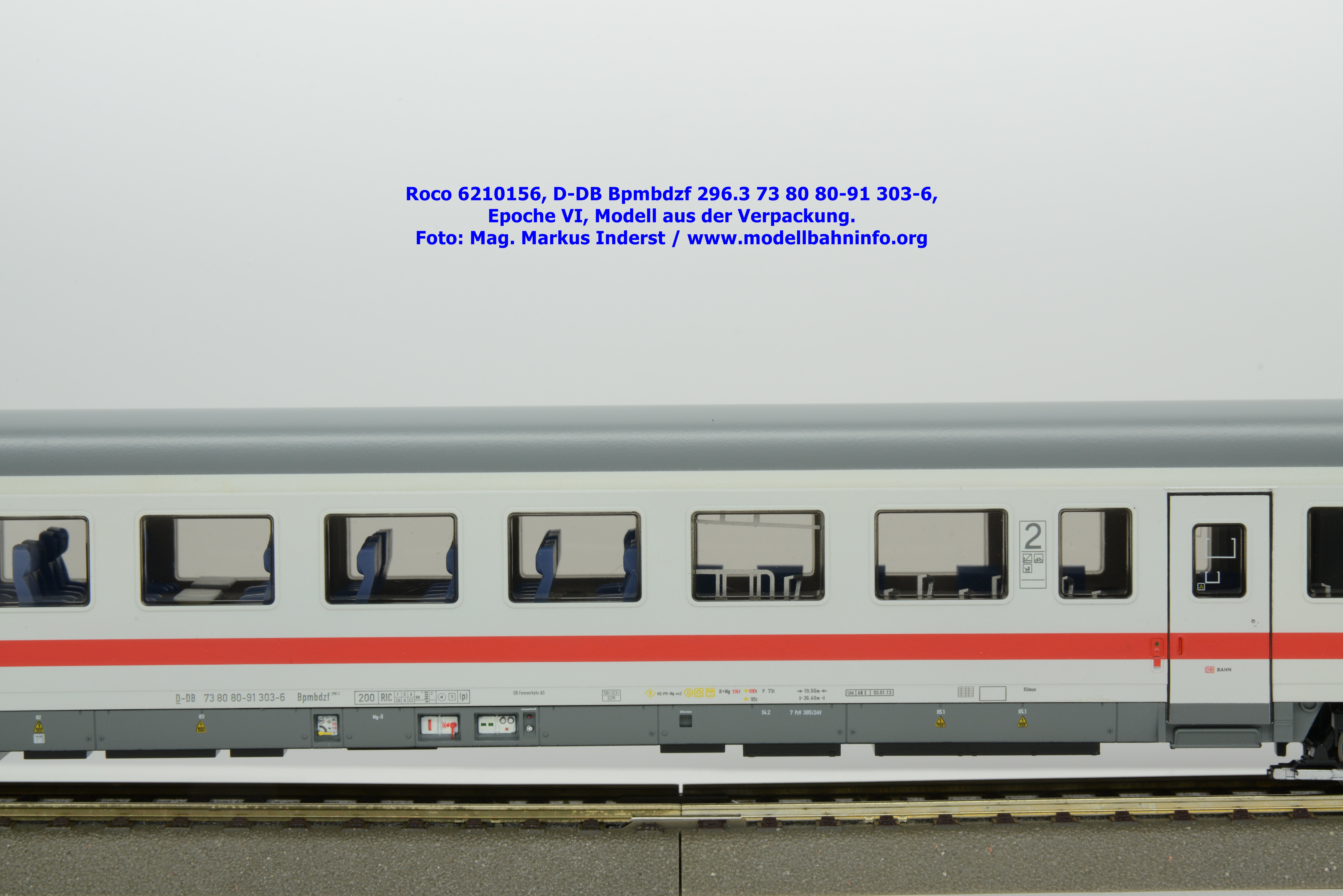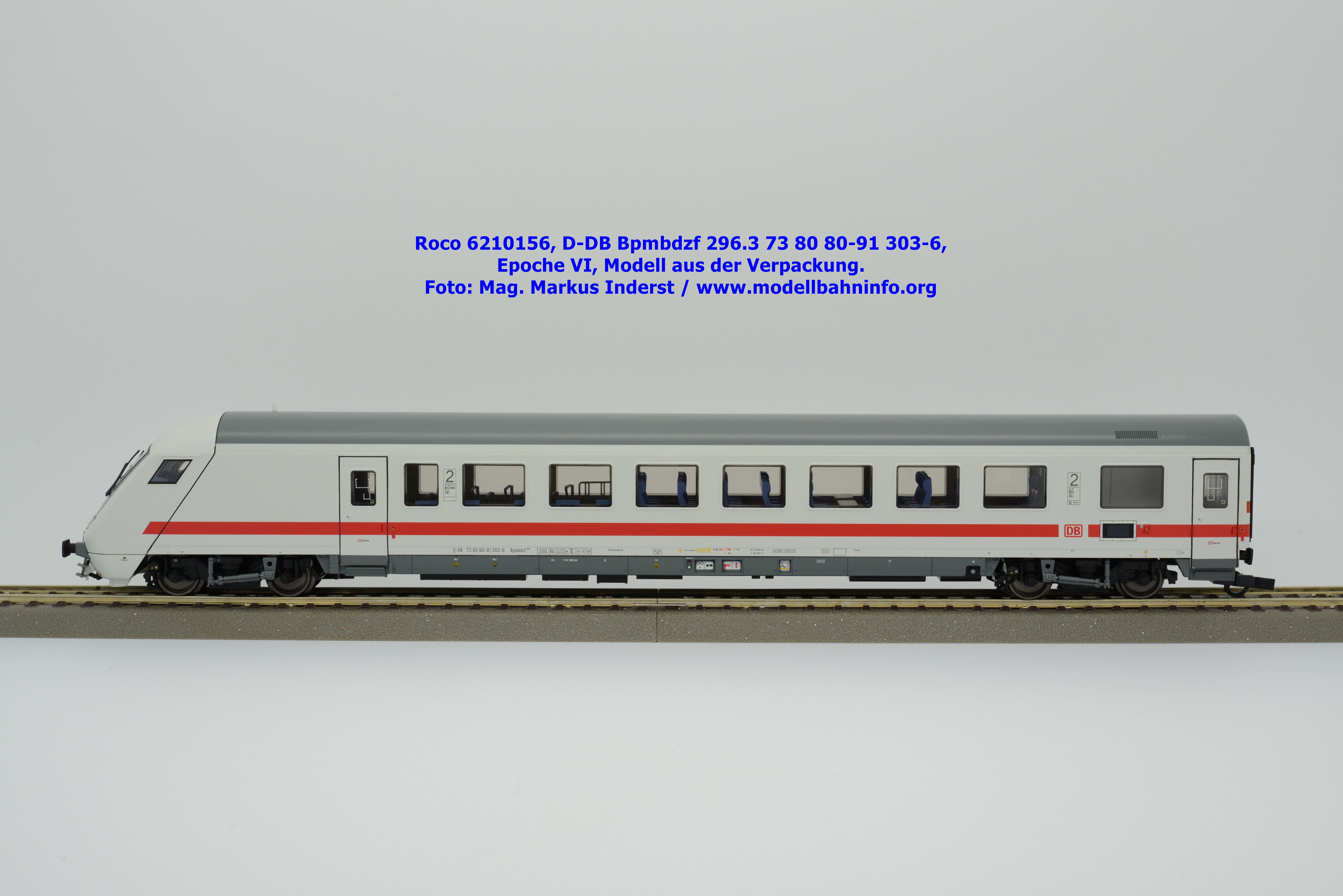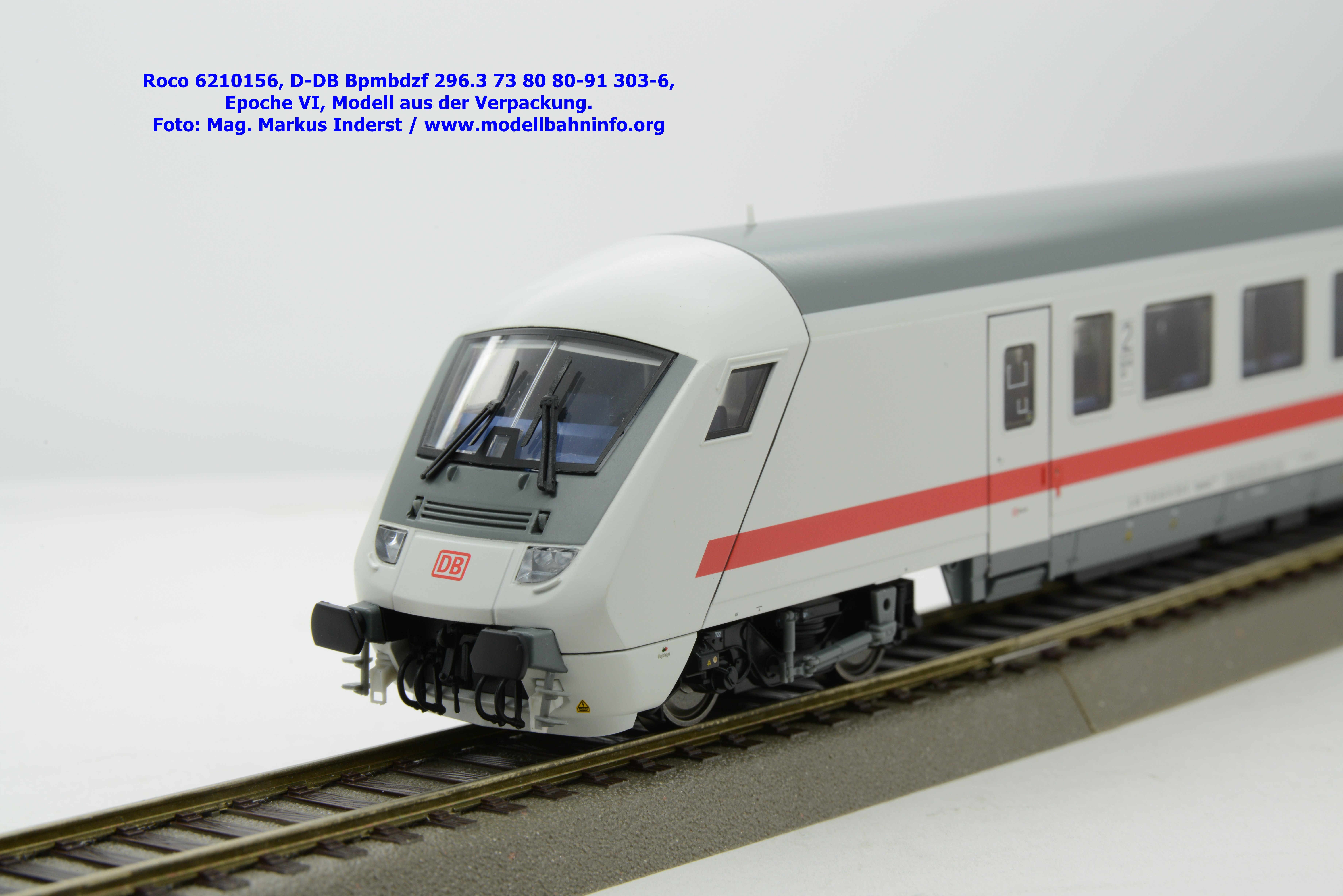 Auf Basis des vorhin vorgestellten IC-Steuerwagens hat Roco auch hierbei eine Formvariante in Erwägung gezogen, die bisher im Sortiment der Modellbahnhersteller gefehlt hat. Die DB AG hat im Zuge des Redesigns ab 2002 die Fahrzeuge mit druckdichten Übergängen ausgestattet, welcher am rückwärtigen Fahrzeugende zu sehen ist. Außerdem fehlt beim vorliegenden Modell die WLAN-Antenne. Dafür wurde bei der Inneneinrichtung eine freistehende Nachbildung der Fahrrad-Stände sowie die aufwendig und mehrfarbig ausgeführte Inneneinrichtung umgesetzt. Der im „Lazarett“-Design befindliche IC-Steuerwagen gehört der Gattungsbezeichnung Bpmbdzf 296.3 an und ist mit der Wagennummer 73 80 80-91 303-6 bedruckt worden. Der Wagen gehört zum DB Fernverkehr und weist die Untersuchungsanschriften Unt AN X 03.01.13 auf. Roco fertigt das Modell des druckdichten IC-Steuerwagens in zwei Ausführungen, und zwar als analoge Gleichstrom-Ausführung, welche unter der Artikelnummer 6210156 zum UVP von € 169,90 vertrieben wird. Das Dreileiter-Wechselstrom-Pandent weist die Artikelnummer 6220156 und den UVP von € 174,90 auf.