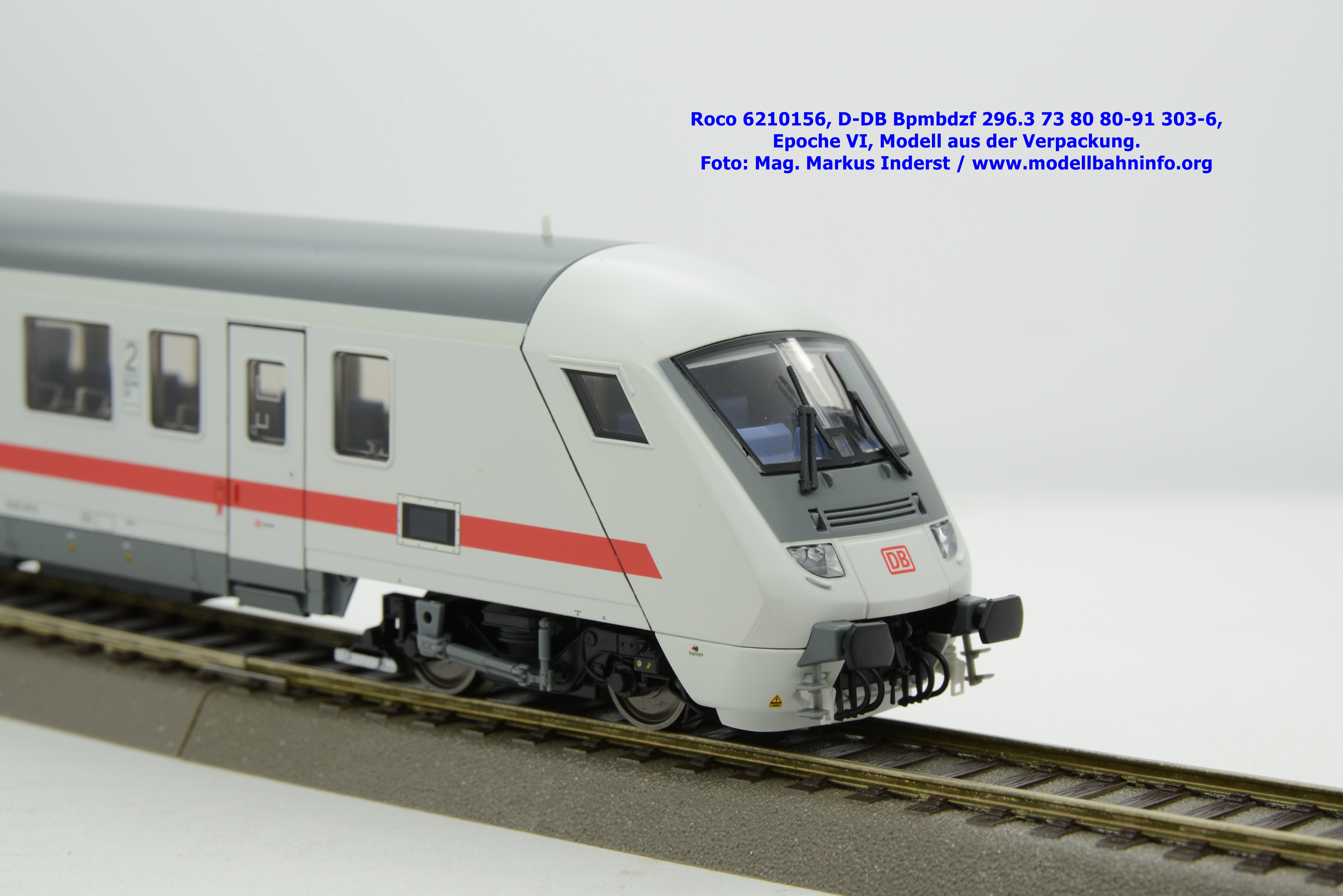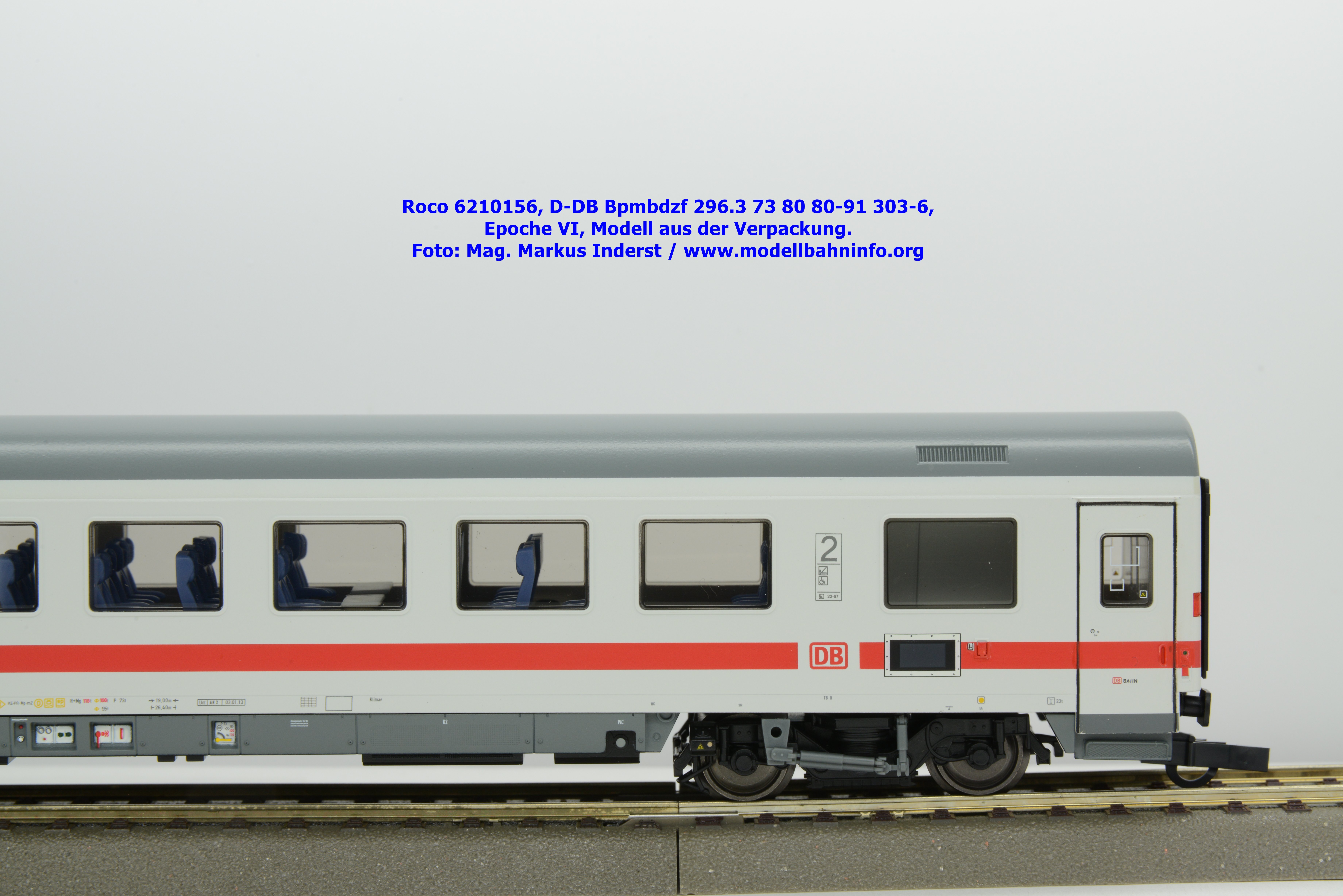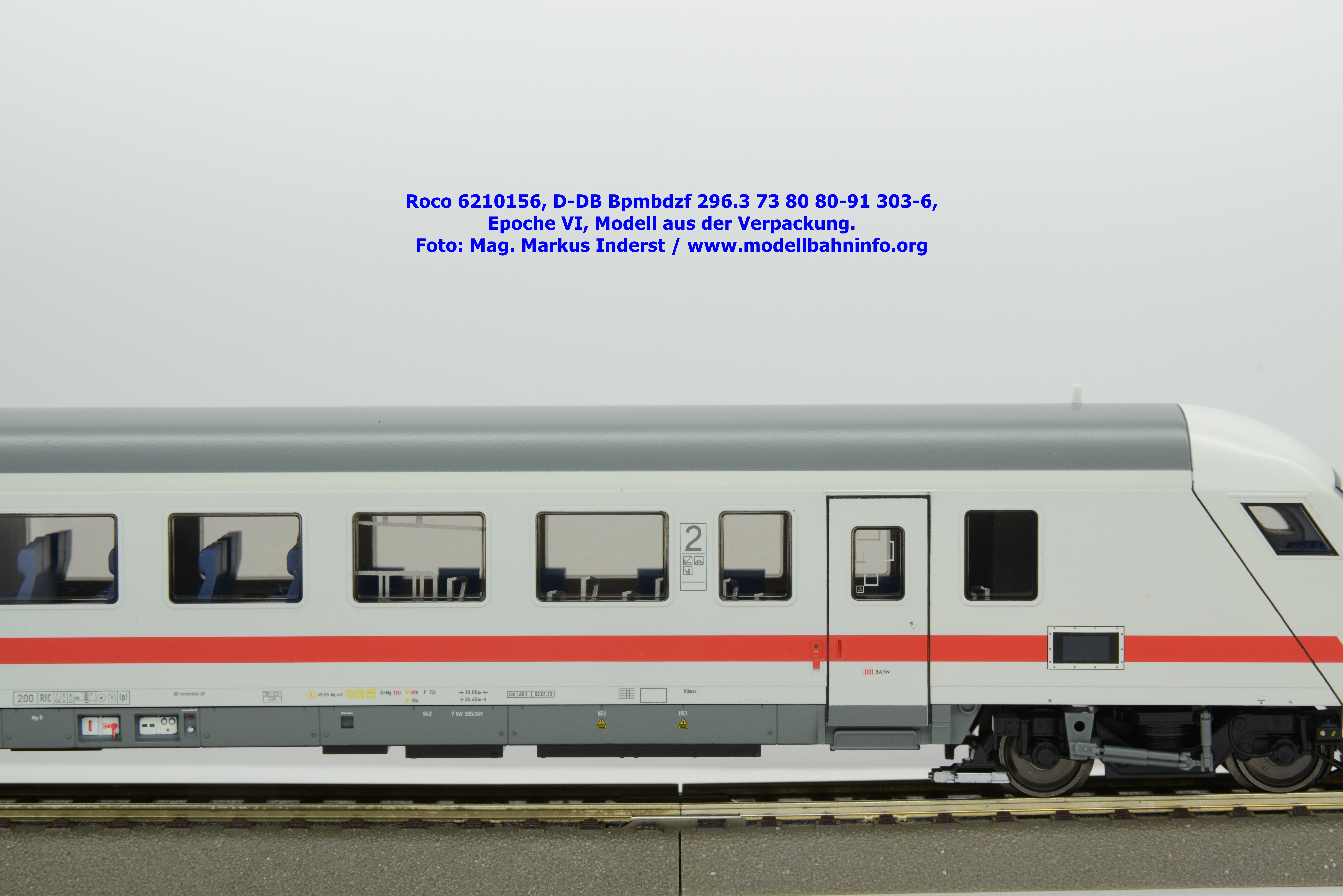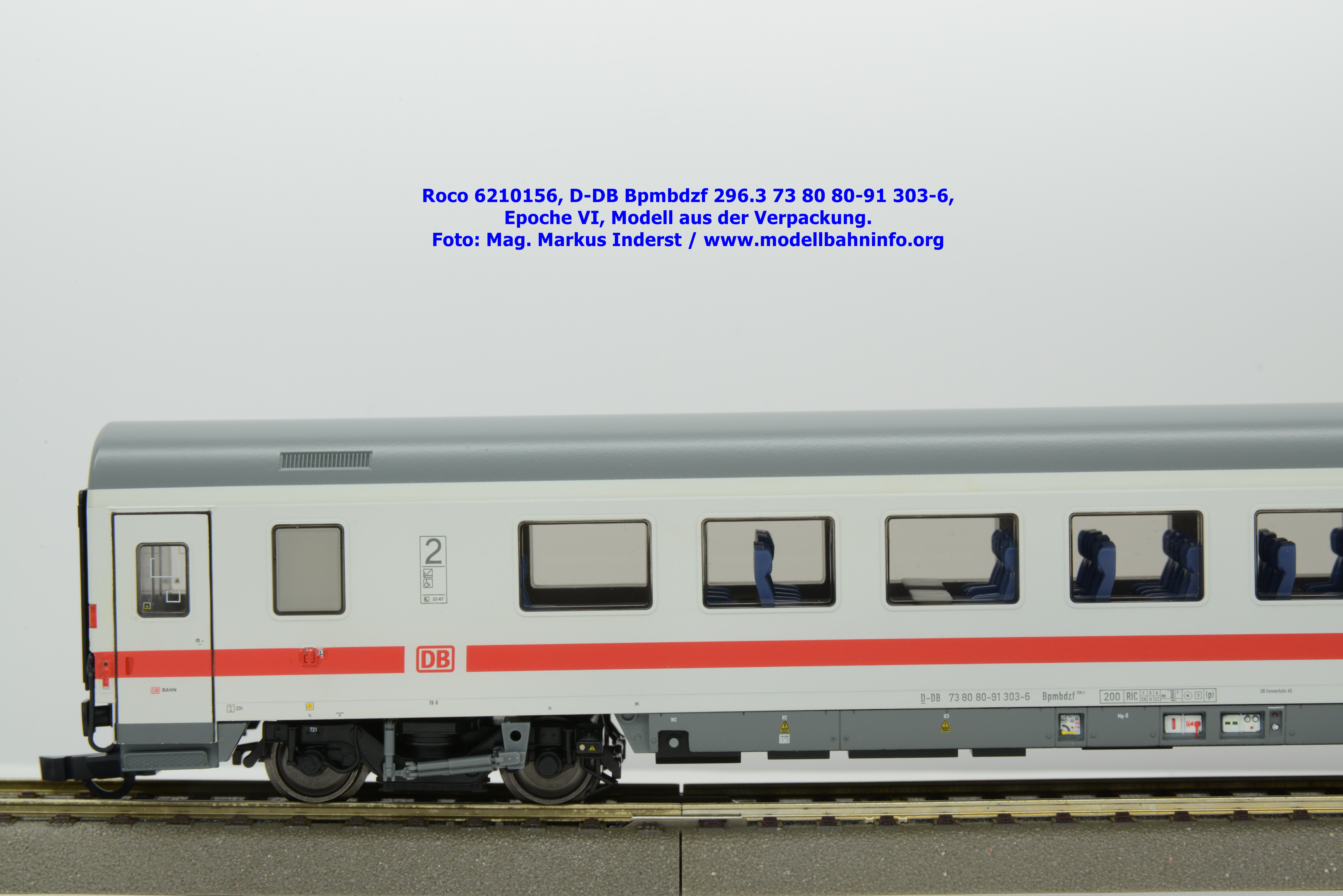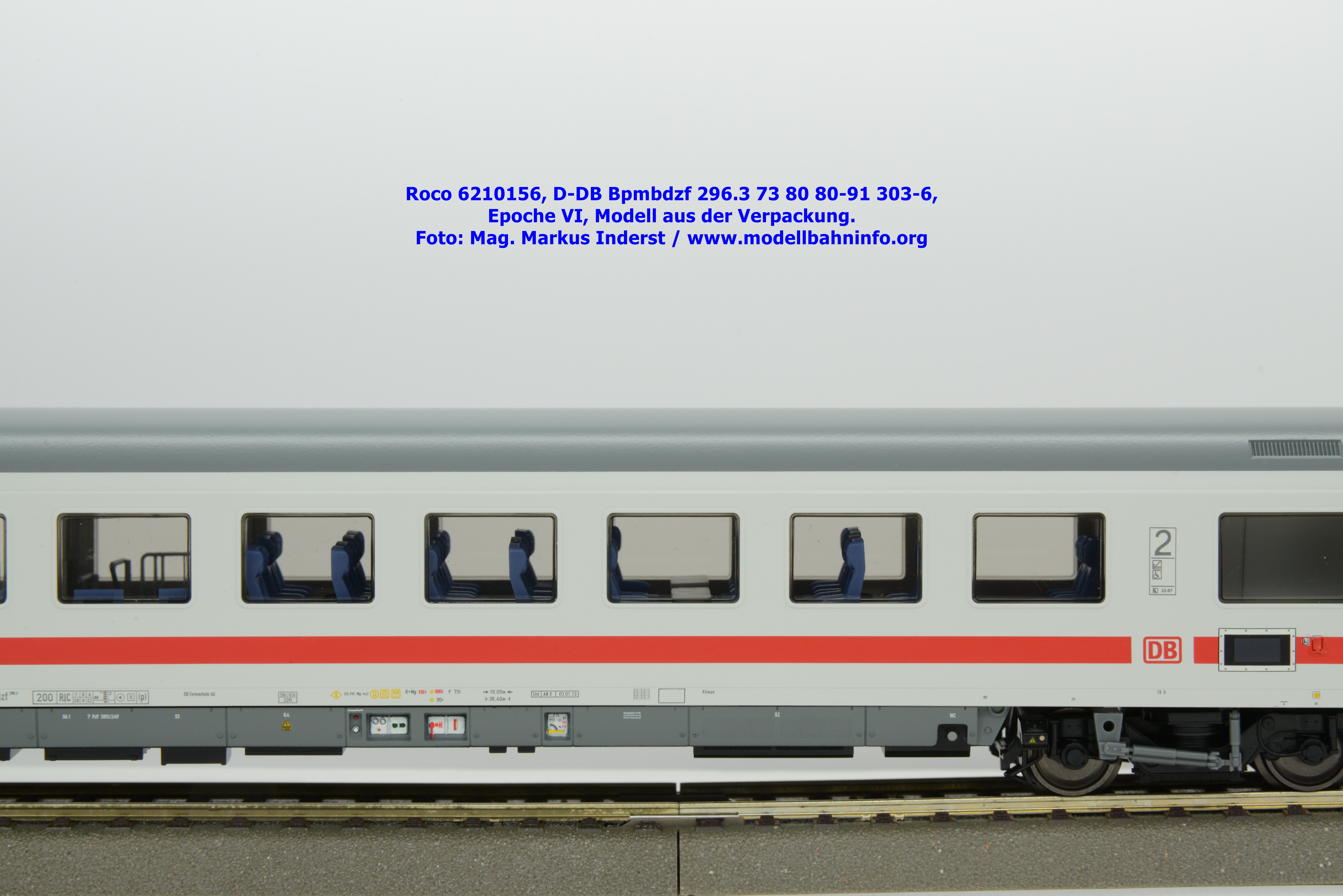 Auf Basis des vorhin vorgestellten IC-Steuerwagens hat Roco auch hierbei eine Formvariante in Erwägung gezogen, die bisher im Sortiment der Modellbahnhersteller gefehlt hat. Die DB AG hat im Zuge des Redesigns ab 2002 die Fahrzeuge mit druckdichten Übergängen ausgestattet, welcher am rückwärtigen Fahrzeugende zu sehen ist. Außerdem fehlt beim vorliegenden Modell die WLAN-Antenne. Dafür wurde bei der Inneneinrichtung eine freistehende Nachbildung der Fahrrad-Stände sowie die aufwendig und mehrfarbig ausgeführte Inneneinrichtung umgesetzt. Der im „Lazarett“-Design befindliche IC-Steuerwagen gehört der Gattungsbezeichnung Bpmbdzf 296.3 an und ist mit der Wagennummer 73 80 80-91 303-6 bedruckt worden. Der Wagen gehört zum DB Fernverkehr und weist die Untersuchungsanschriften Unt AN X 03.01.13 auf. Roco fertigt das Modell des druckdichten IC-Steuerwagens in zwei Ausführungen, und zwar als analoge Gleichstrom-Ausführung, welche unter der Artikelnummer 6210156 zum UVP von € 169,90 vertrieben wird. Das Dreileiter-Wechselstrom-Pandent weist die Artikelnummer 6220156 und den UVP von € 174,90 auf.