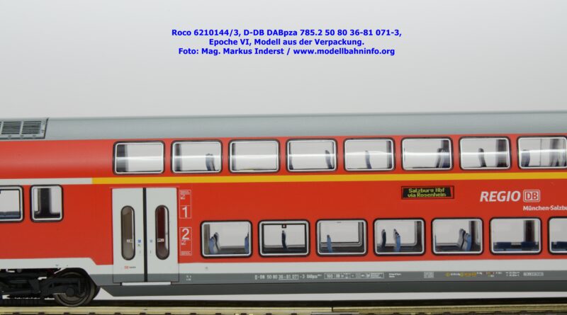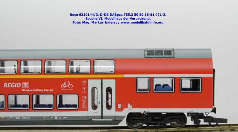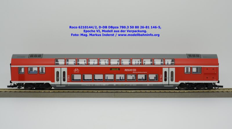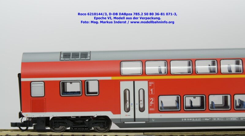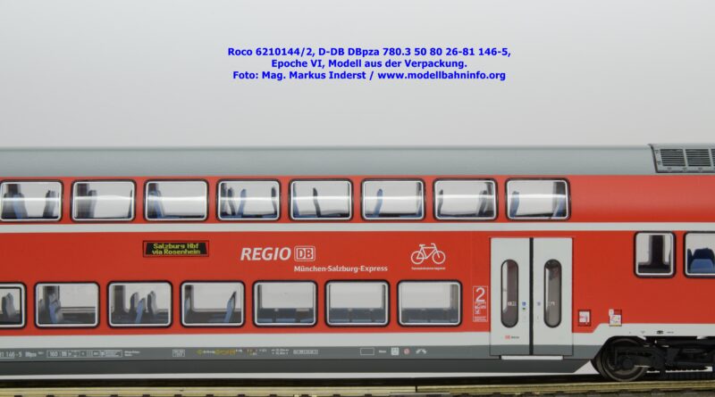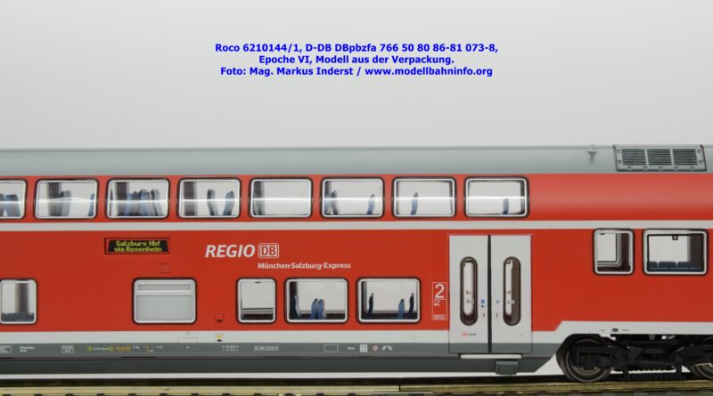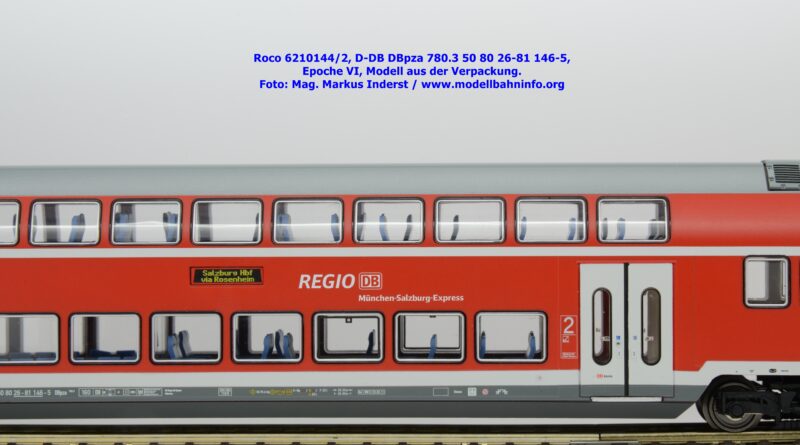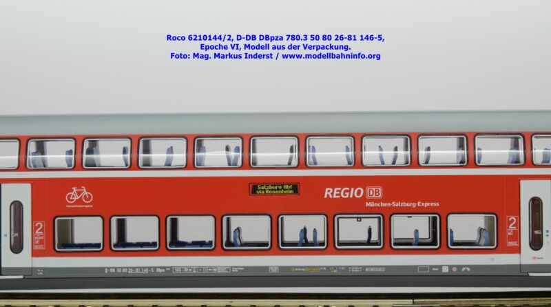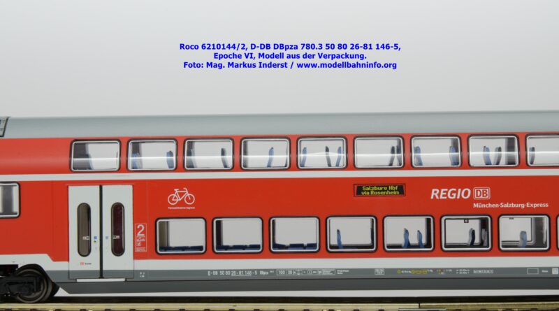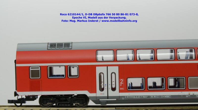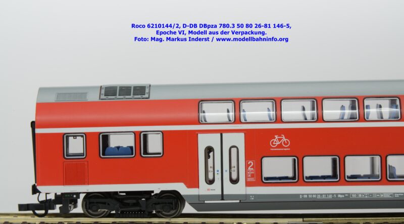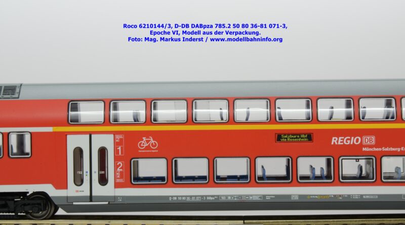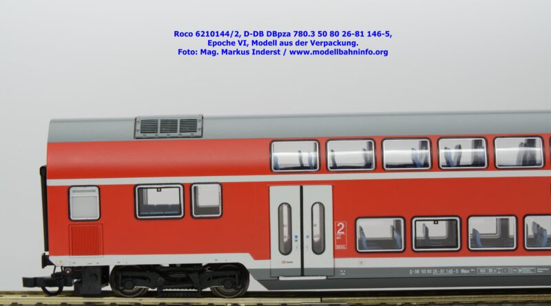 Roco hat zur Verlängerung des Dreiersets 6210105 – siehe oben – des weiteren ein Zweierset angekündigt. Es handelt sich hierbei um zwei gleiche Zwischenwagen mit Hochflureinstieg der Gattung DBpza. Die analoge Modellausführung ist unter dieser Artikelnummer und zum UVP von € 227,90 erhältlich. Die Dreileiter-Wechselstrom-Ausführung trägt die Artikelnummer 6220106. Der UVP beträgt € 237,90.