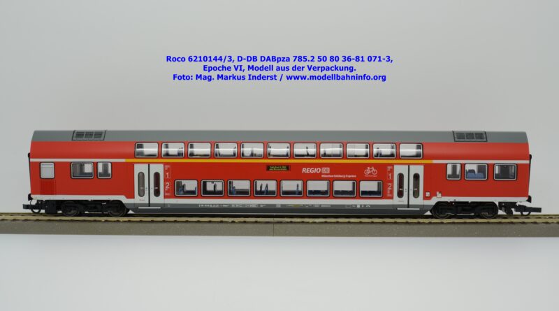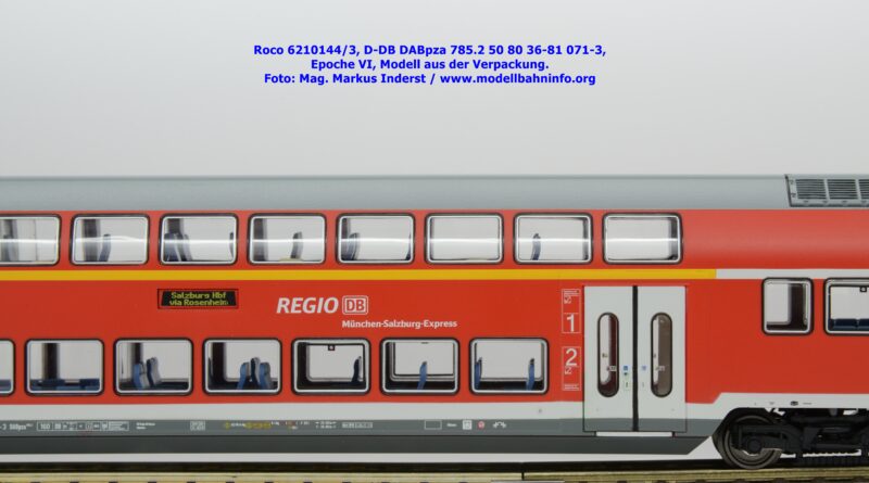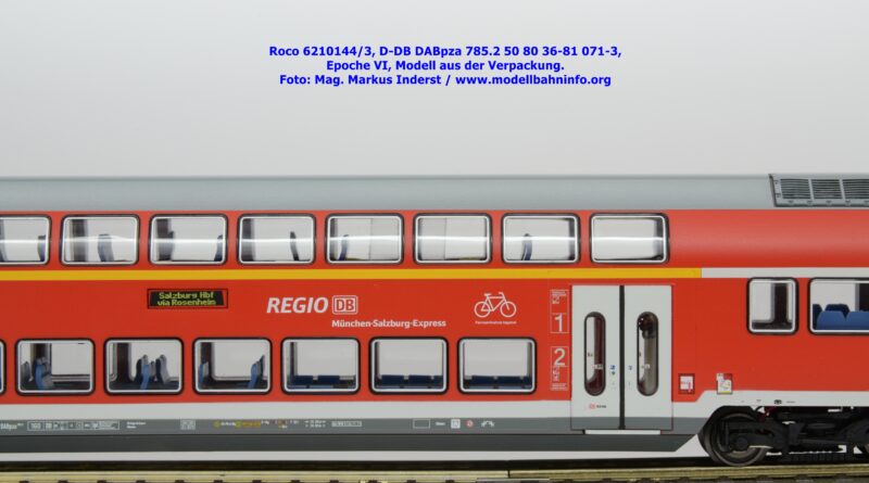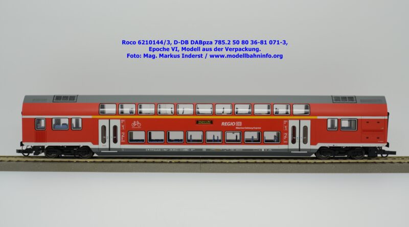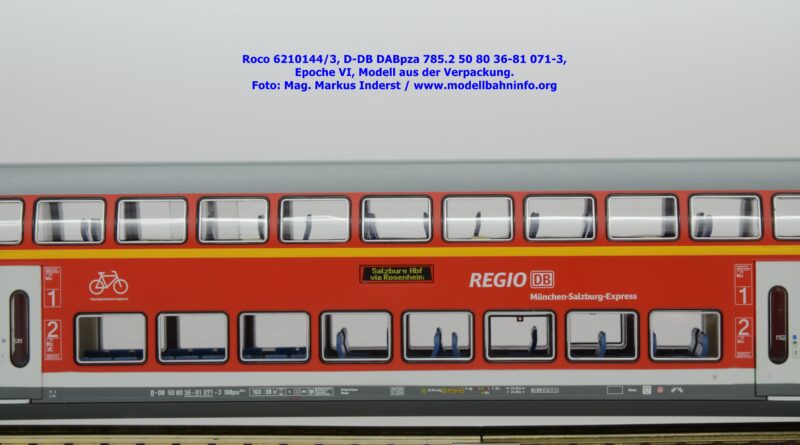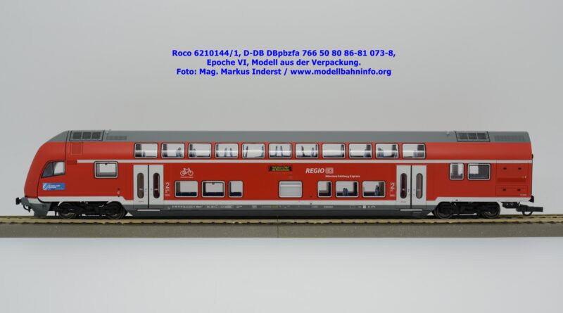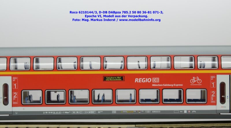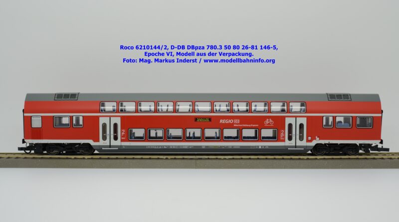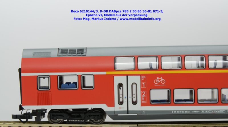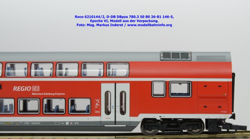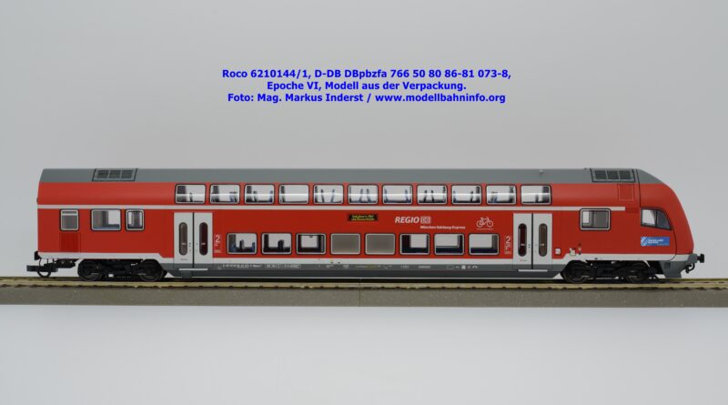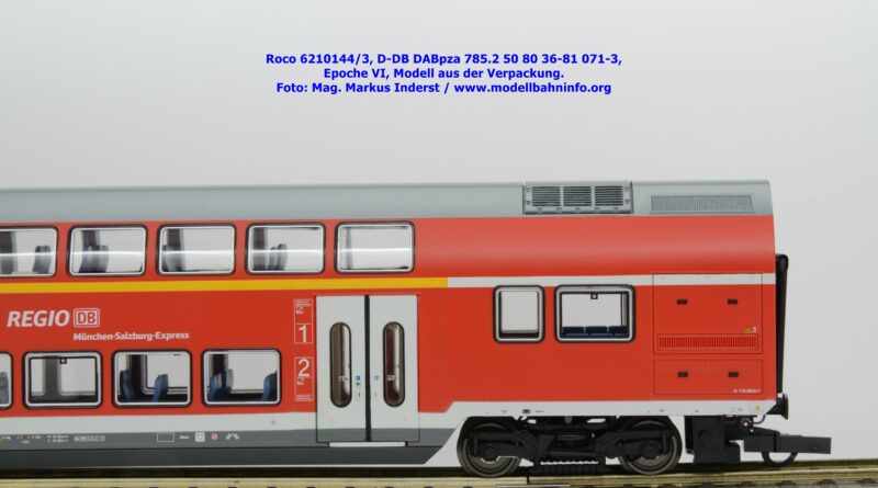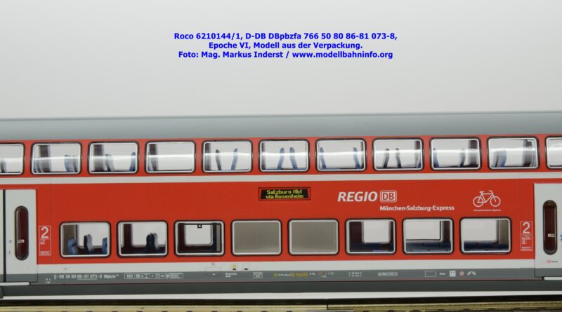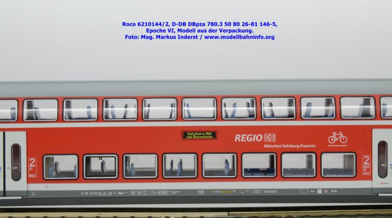 Roco hat zur Verlängerung des Dreiersets 6210105 – siehe oben – des weiteren ein Zweierset angekündigt. Es handelt sich hierbei um zwei gleiche Zwischenwagen mit Hochflureinstieg der Gattung DBpza. Die analoge Modellausführung ist unter dieser Artikelnummer und zum UVP von € 227,90 erhältlich. Die Dreileiter-Wechselstrom-Ausführung trägt die Artikelnummer 6220106. Der UVP beträgt € 237,90.
