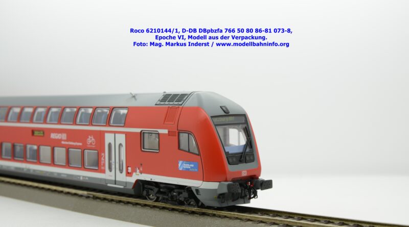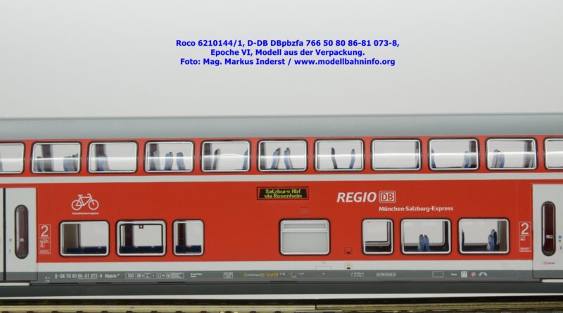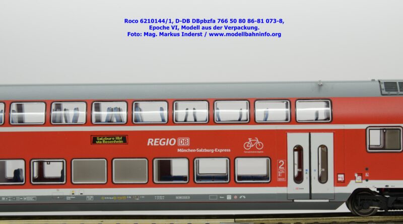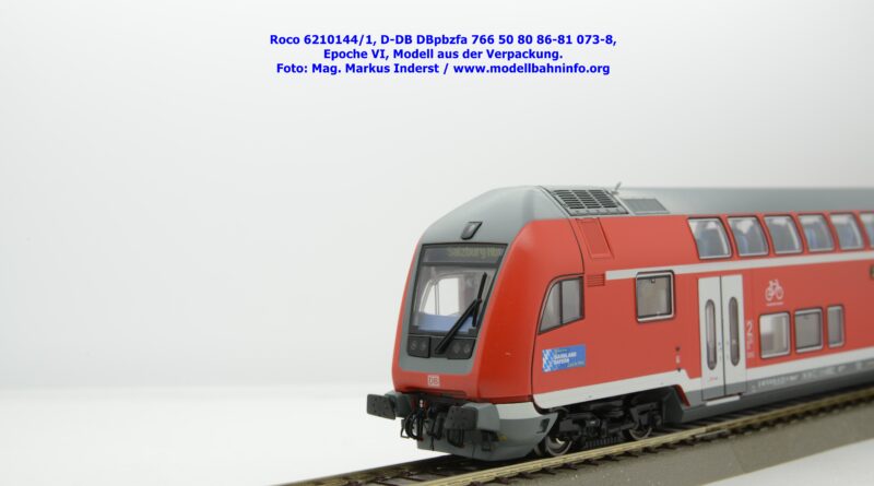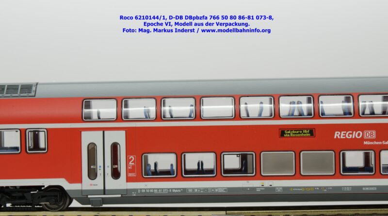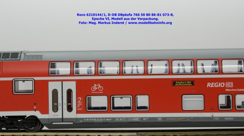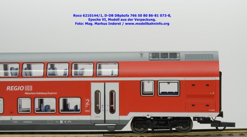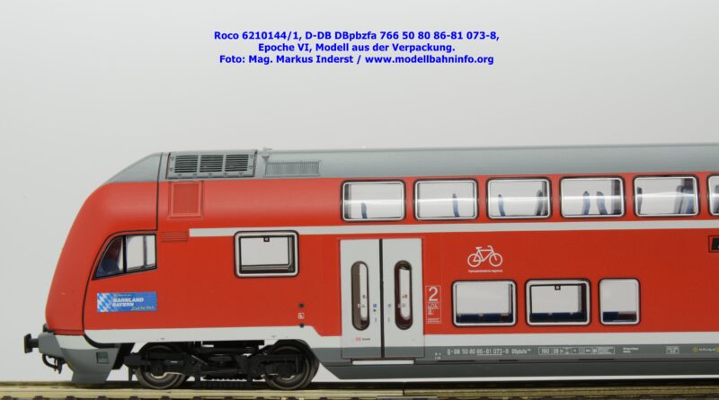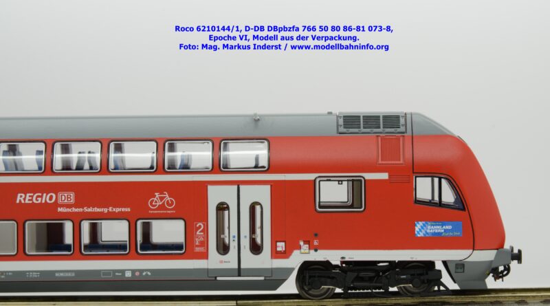 Das erste Modell im Set ist der 2. Klasse Steuerwagen mit der Gattungsbezeichnung DBpbzfa 766. Das Modell trägt die Wagennummer 50 80 86-81 073-8 und die Halterkennung D-DB. Im Revisionsraster stehen die Angaben Ung WW X 29.05.12. Unter dem Führerhausfenster befindet sich der „Bahnland Bayern“-Aufkleber.