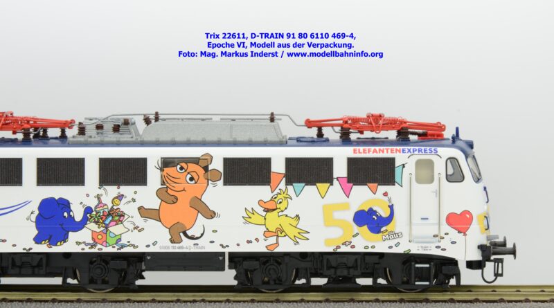Das Modell weist großflächig weiß lackierte Flächen am Lokkasten auf, auf denen die verschiedenen Symbole aus der Sendung sowie die Geburtstagsglückwünsche zum 50. Geburtstag zu sehen sind. Das Modell ist mit der Halterkennung D-TRAIN, der Loknummer 91 80 6110 469-4 und den einseitig aufgedruckten Untersuchungsdaten Unt. GfF 13.12.24 versehen. Das vorliegende Modell wird zum UVP von € 449,– gehandelt. Für die Märklin-Modellbahner wurde die Dreileiter-Wechselstrom-Ausführung mit der Artikelnummer 39111 produziert.