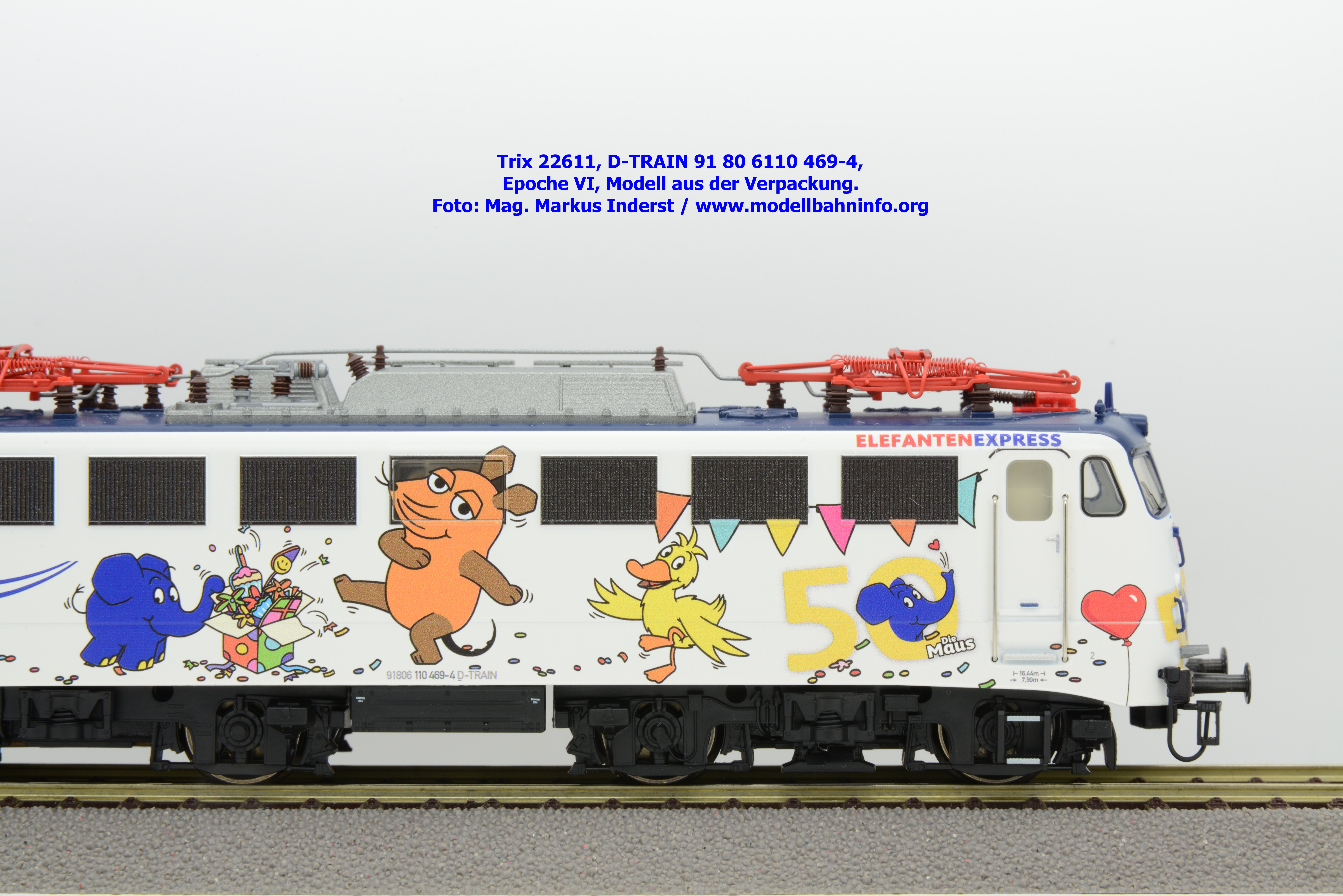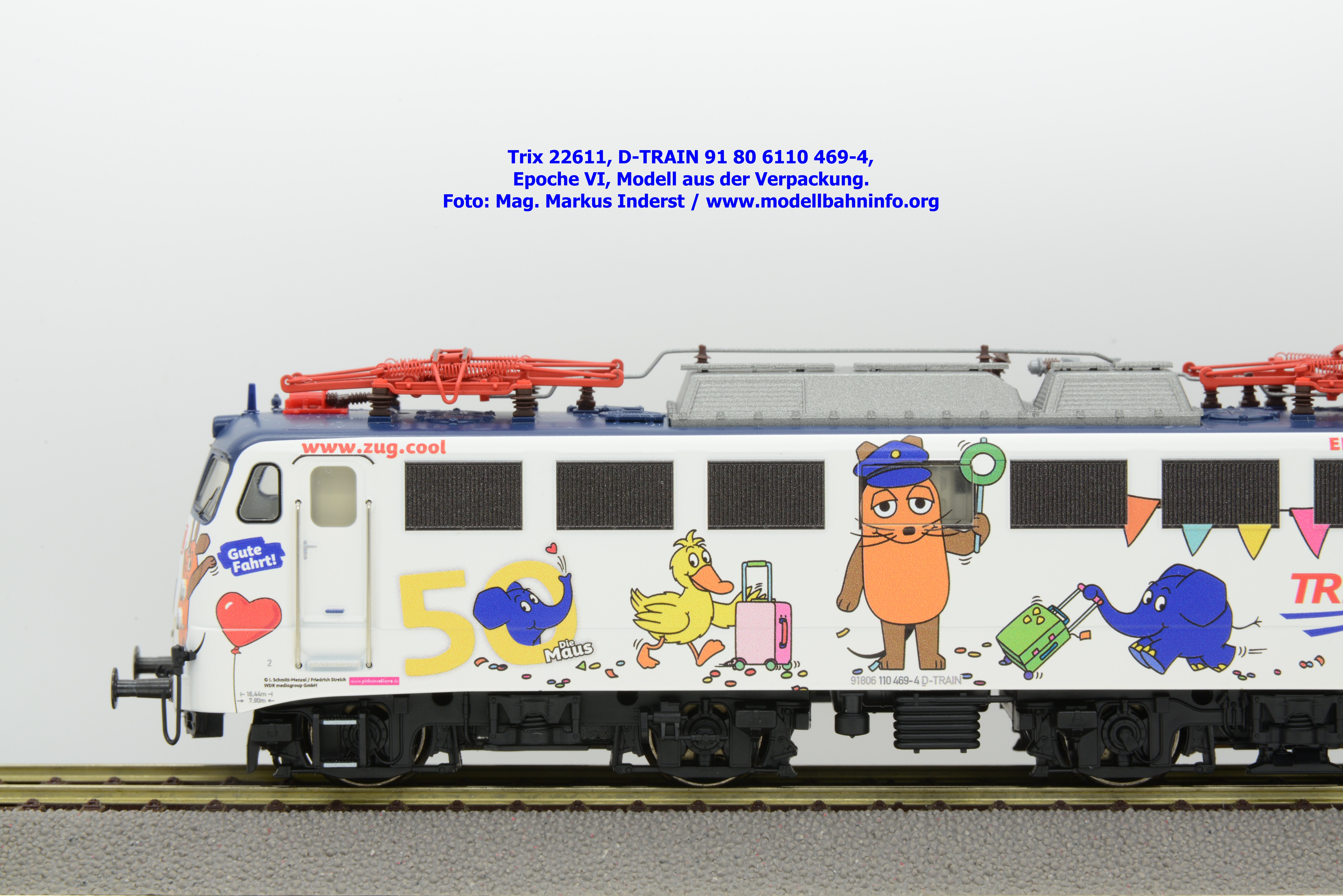 Das Modell weist großflächig weiß lackierte Flächen am Lokkasten auf, auf denen die verschiedenen Symbole aus der Sendung sowie die Geburtstagsglückwünsche zum 50. Geburtstag zu sehen sind. Das Modell ist mit der Halterkennung D-TRAIN, der Loknummer 91 80 6110 469-4 und den einseitig aufgedruckten Untersuchungsdaten Unt. GfF 13.12.24 versehen. Das vorliegende Modell wird zum UVP von € 449,– gehandelt. Für die Märklin-Modellbahner wurde die Dreileiter-Wechselstrom-Ausführung mit der Artikelnummer 39111 produziert.