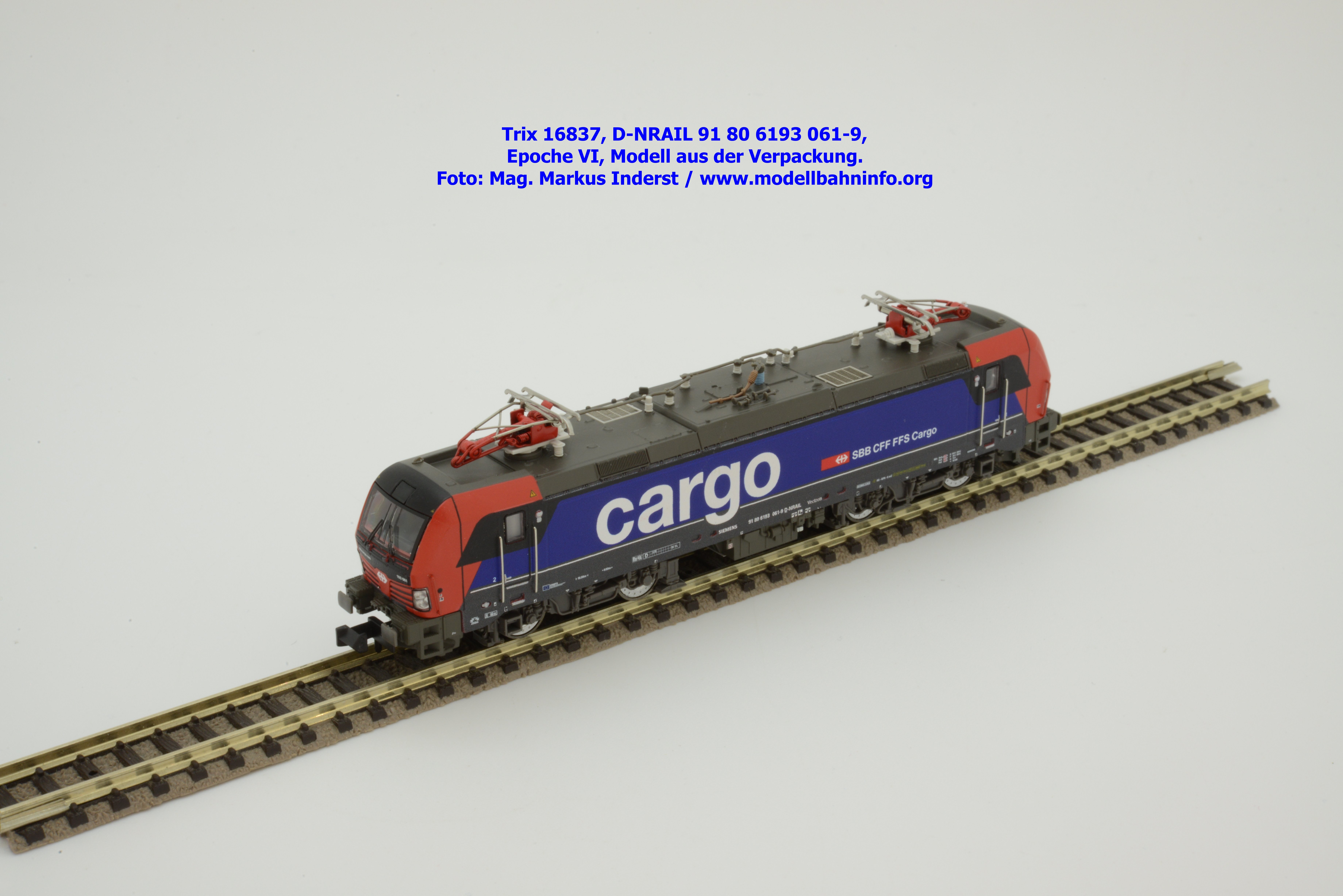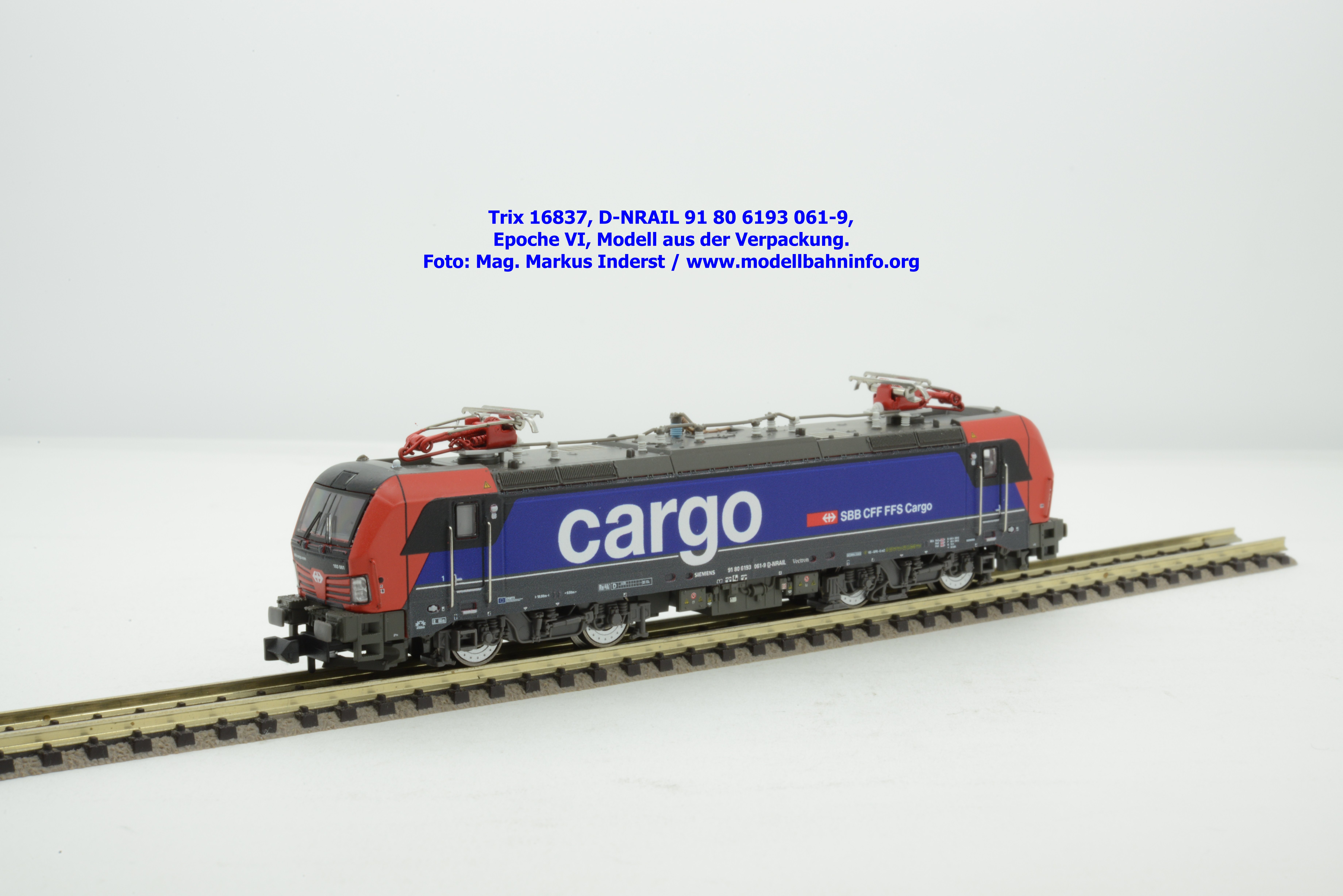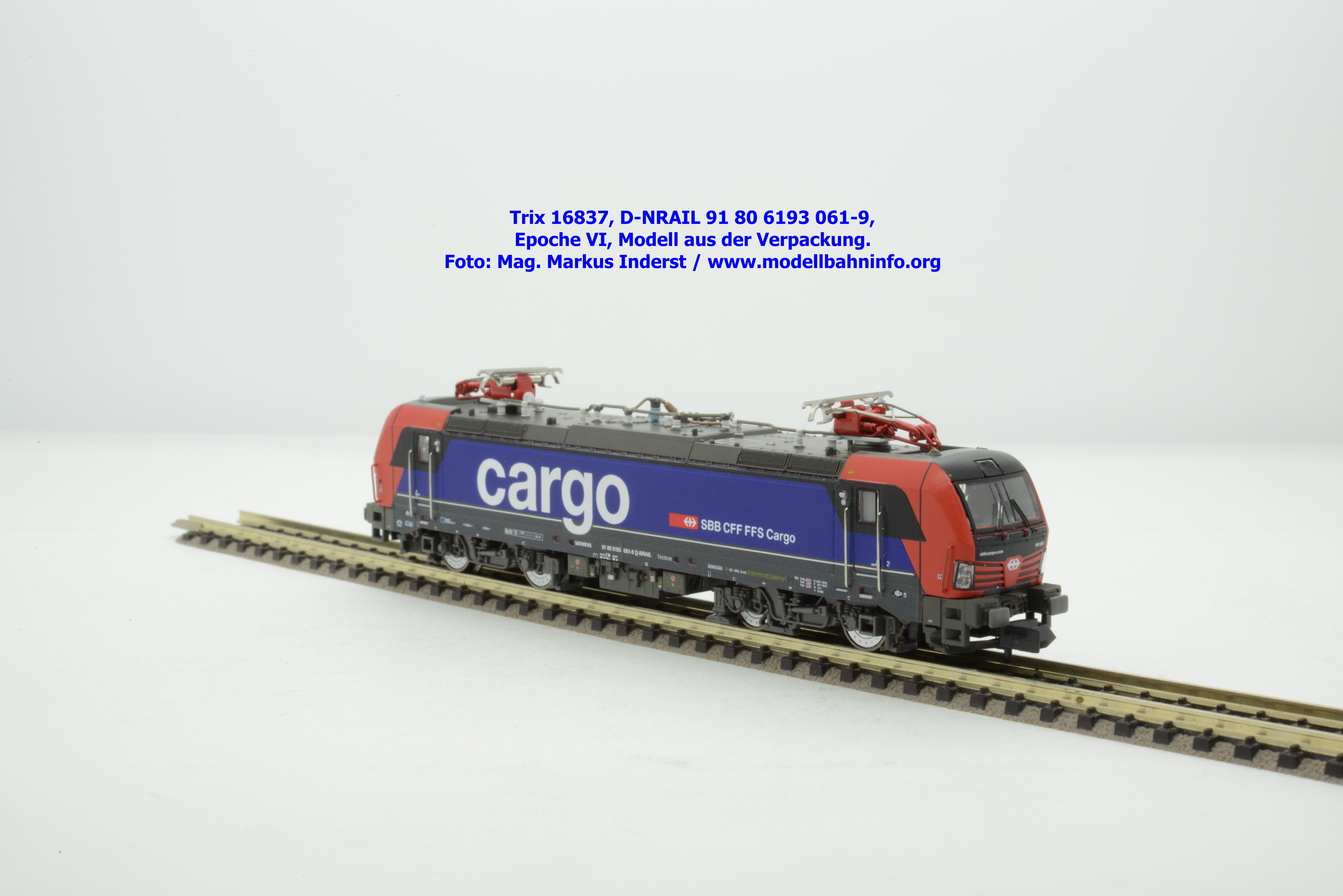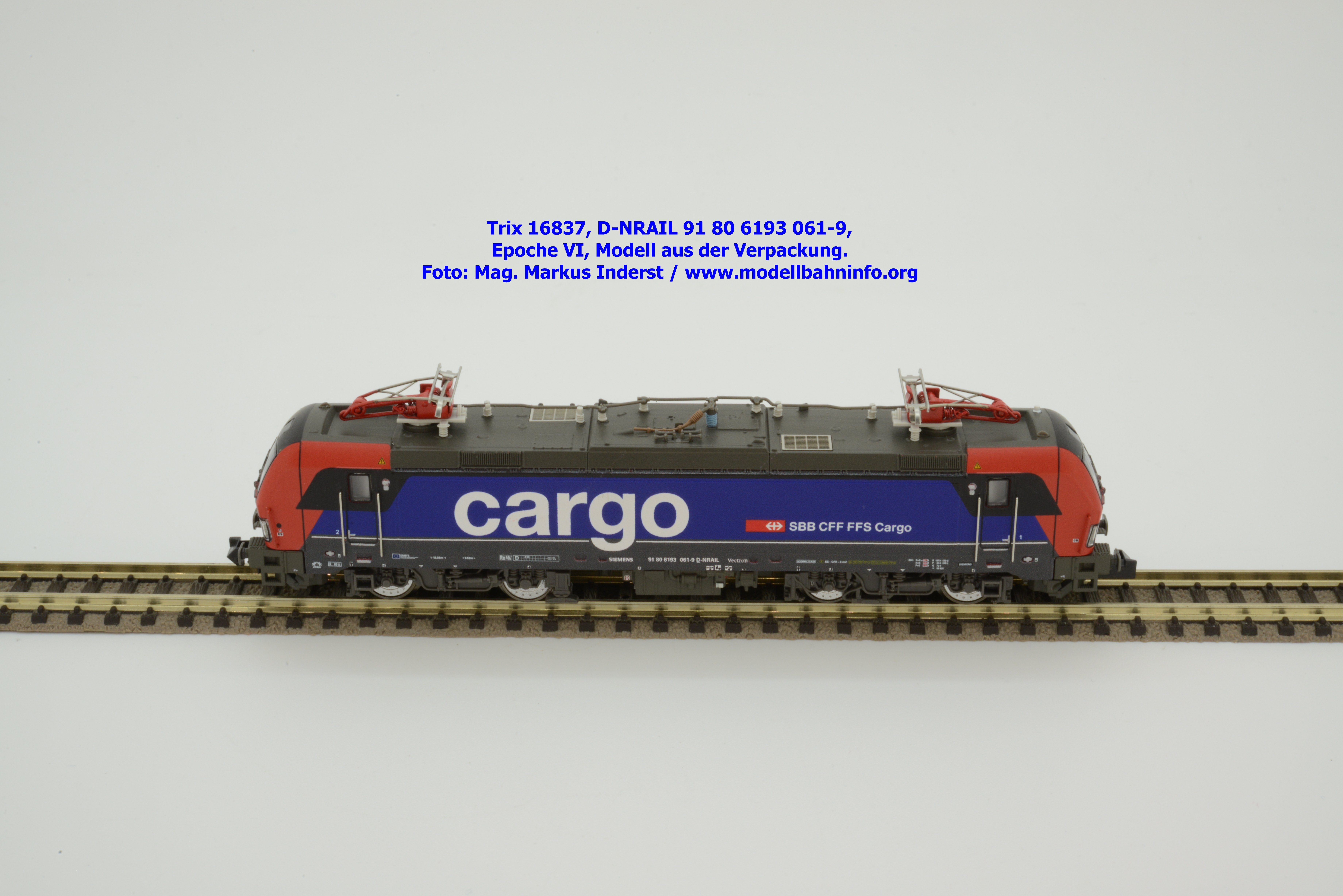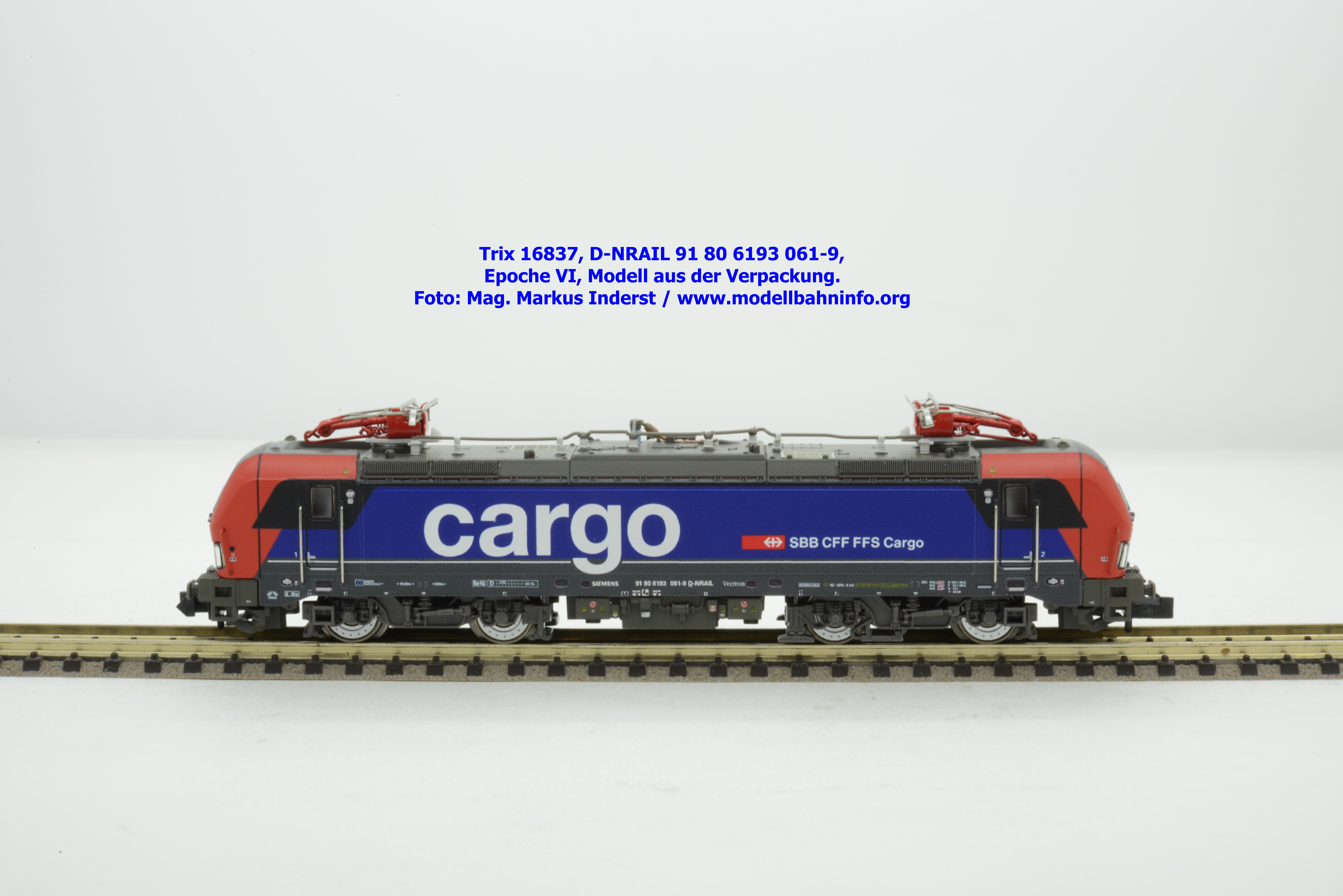 Minitrix hat im Rahmen seiner Herbstneuheiten des Jahres 2024 das Vorbild der neuen Vectron-Lokomotiven für SBB Cargo entdeckt. Das neuen Modell ist in derselben Aufmachung erschienen wie das zuvor ausgelieferte H0-Modell aus gleichem Hause. Das Modell ist mit den Lokanschriften 91 80 6193 061-9 D-NRAIL bedruckt. Im Revisionsraster ist das Abnahmedatum mit REV MMAL 12.09.24 zu lesen. Gegenüber dem H0-Modell wurden aber keine Formänderungen vollzogen, die die geschwungenen Türgriffe betroffen hätten. Das Modell mit den beiden Stromabnehmern wird als voll digitalisiertes Modell zum UVP von € 339,– angeboten. Der eingebaute Digitaldecoder ist RailCom-fähig und verarbeitet die Datenformate DCC und mfx.