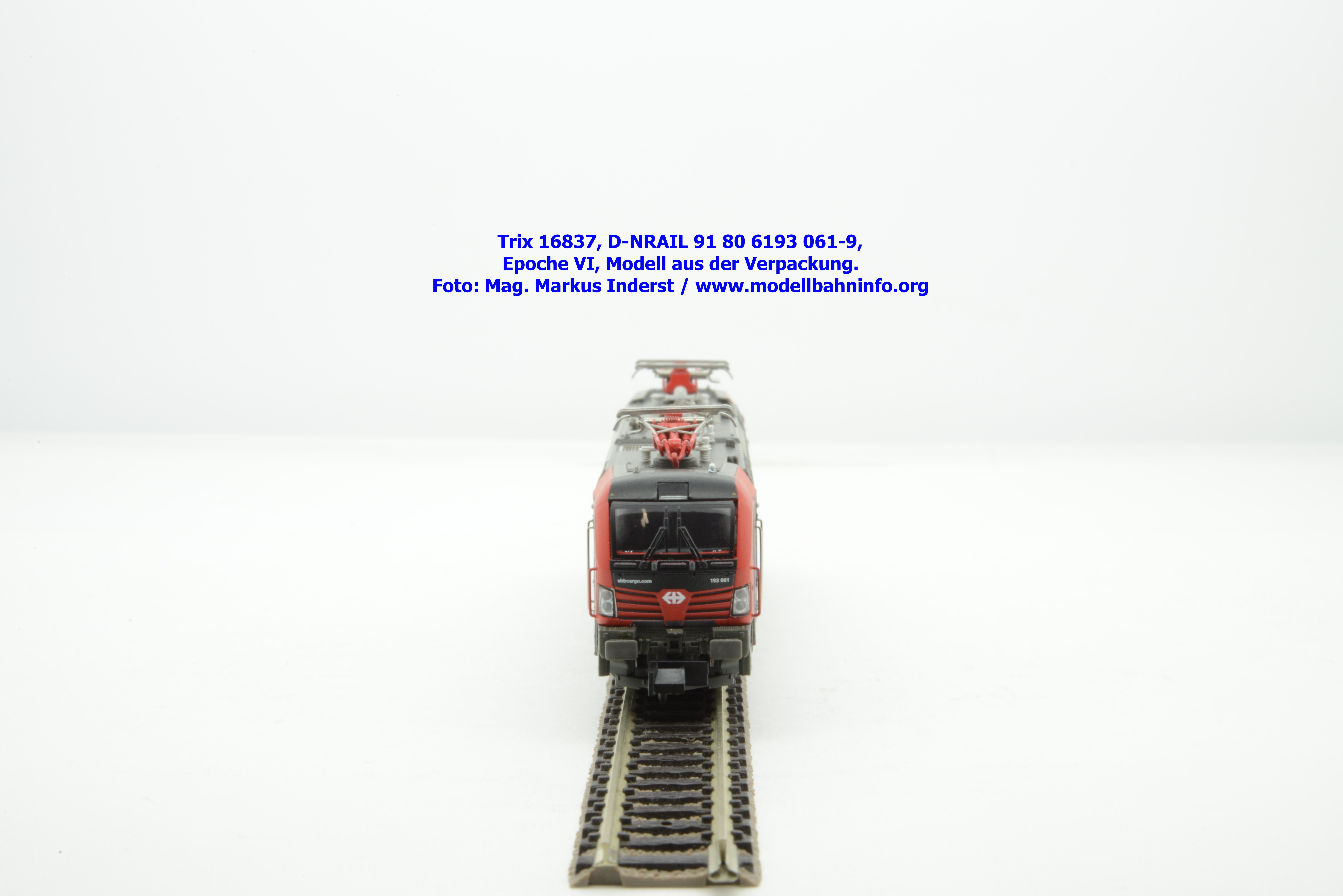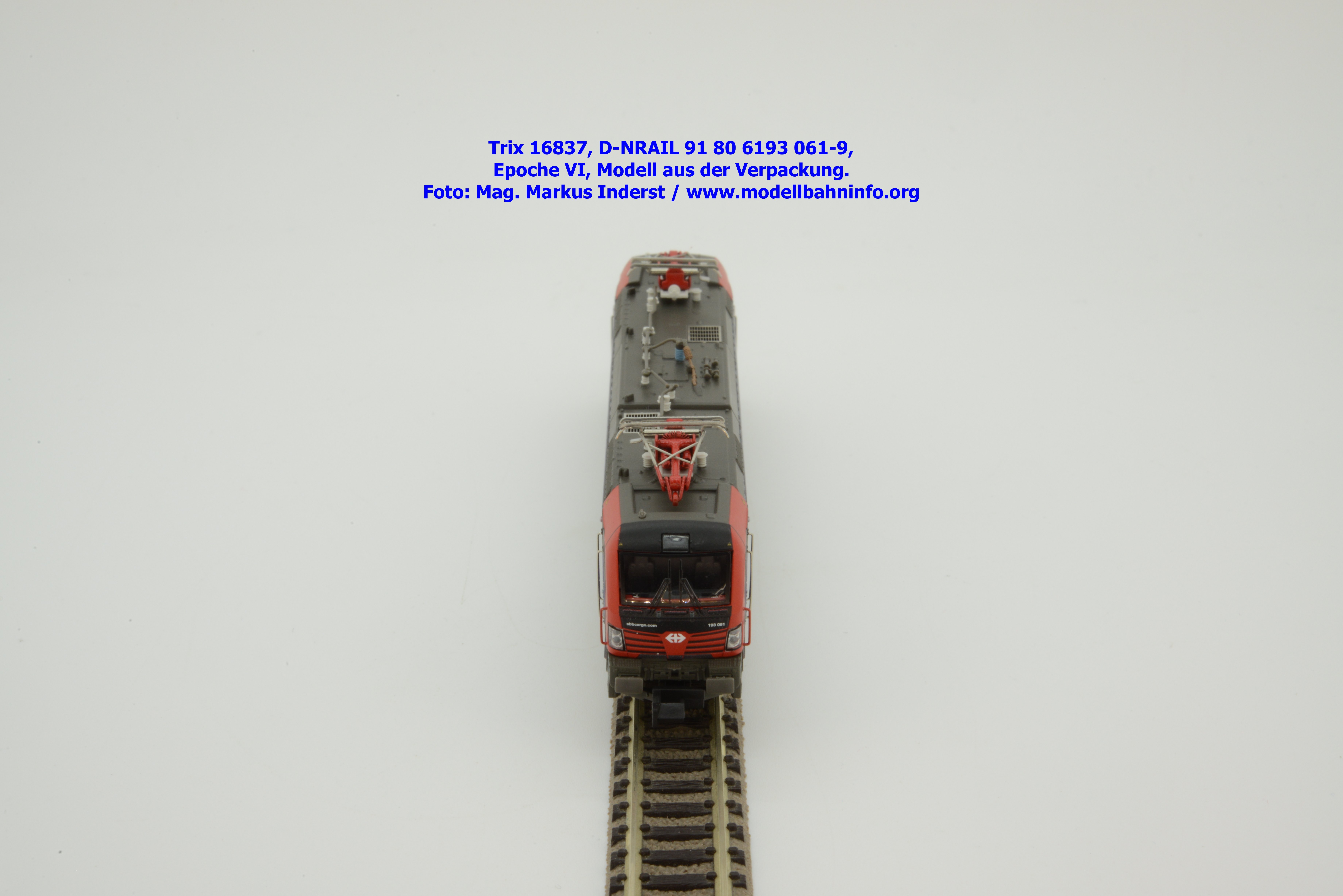 Das Modell weißt eine verkehrsrote Lackierung am Lokkasten mit Frontbalken auf. Das Dach, der Rahmen und die beiden Drehgestelle sind umbragrau lackiert. Die tadellos Lackierung wird noch um die gut deckend aufgetragene und lupenreine Bedruckung ergänzt. Trix hat sein Modell mit der Loknummer 90 80 6193 304-4 und der Halterkennung D-DB bedruckt. Hierbei ist es jedoch mit dem Vectron Dual Mode zu einer Verwechslung bei den ersten beiden Stellen gekommen, denn diese müßte auf „91“ lauten. Am Revisionsraster stehen die Daten REV MMAL 11.12.17. Derselbe Fehler ist schon beim H0-Modell passiert und wurde trotz entsprechenden Hinweis dann nicht weiter berücksichtigt.