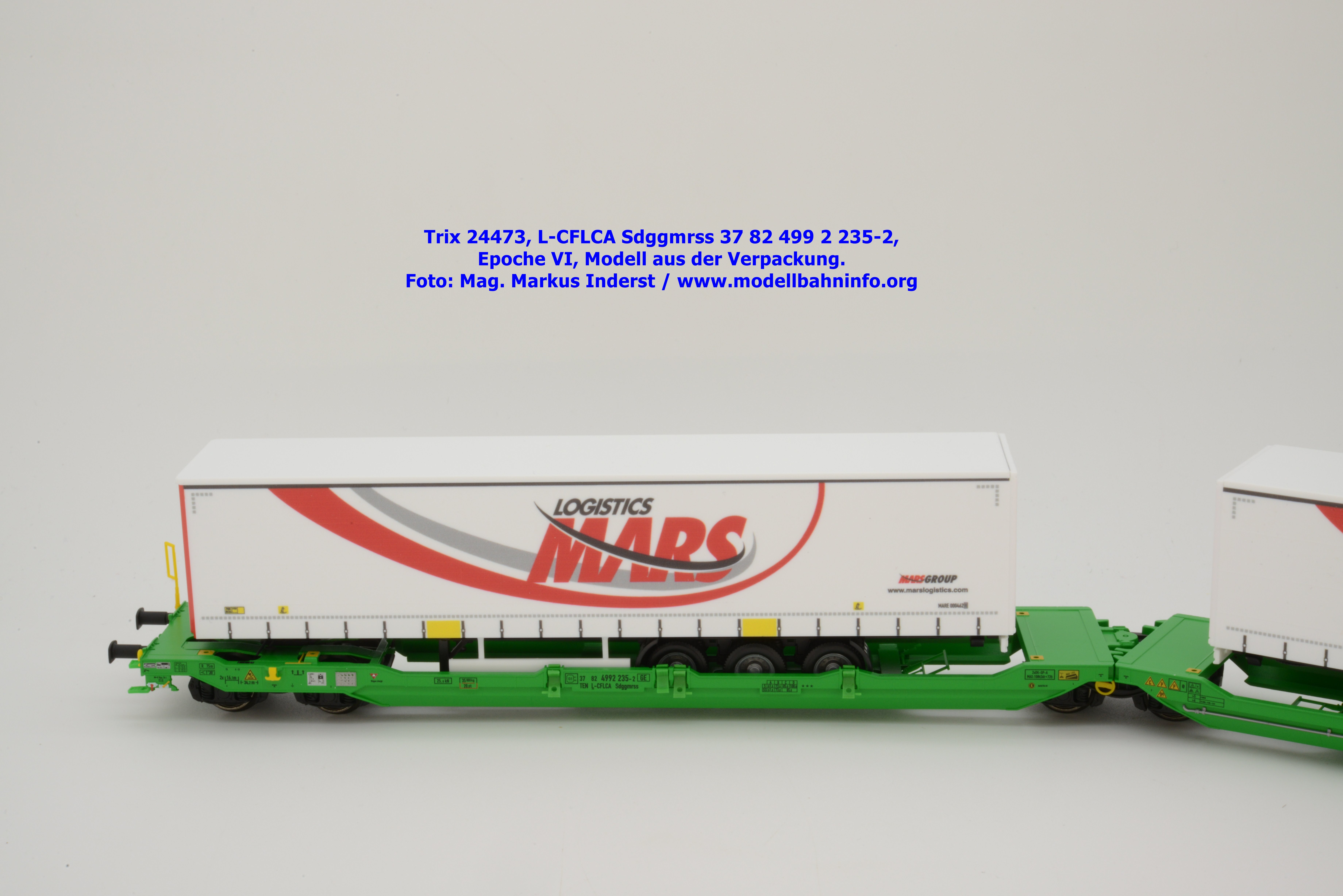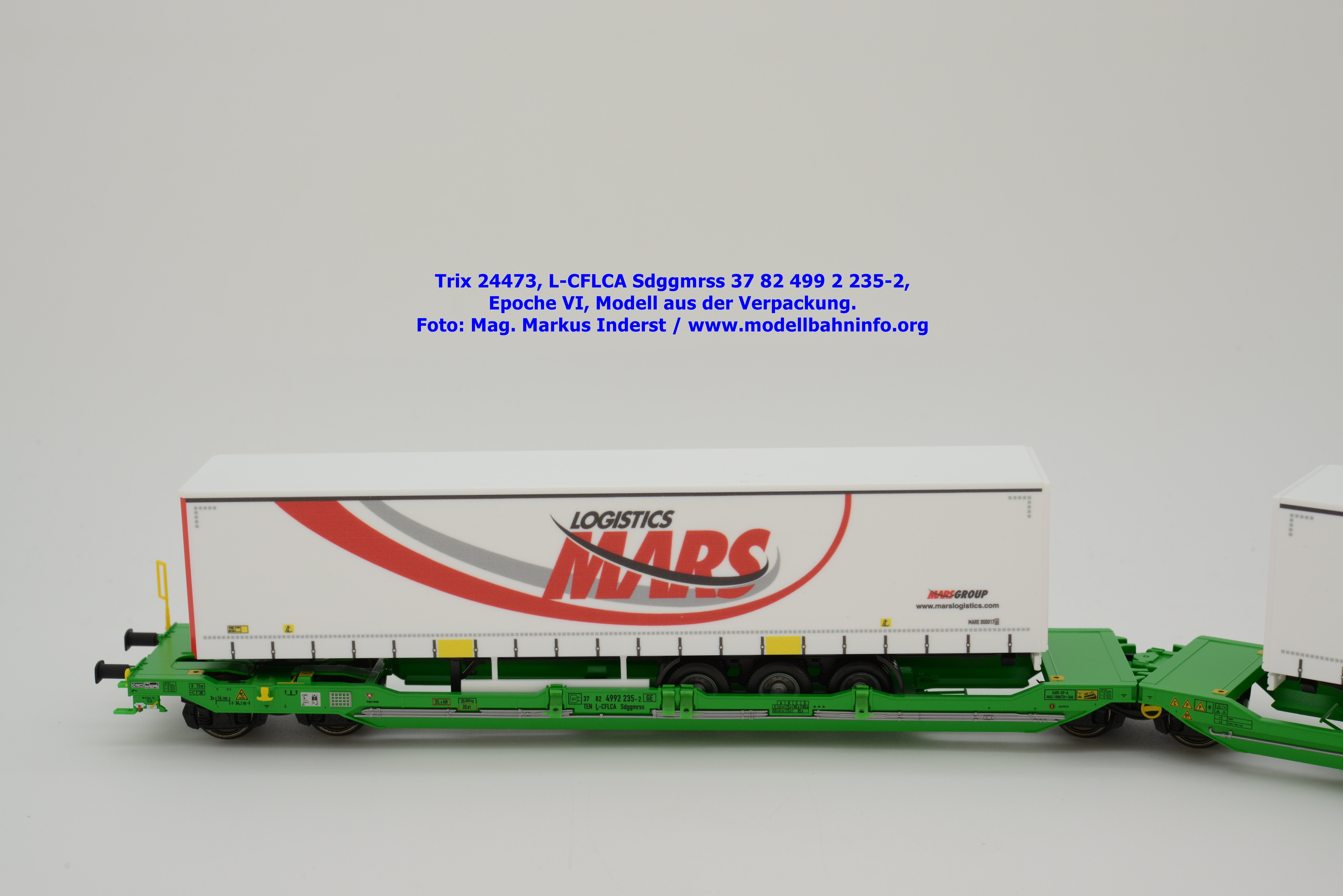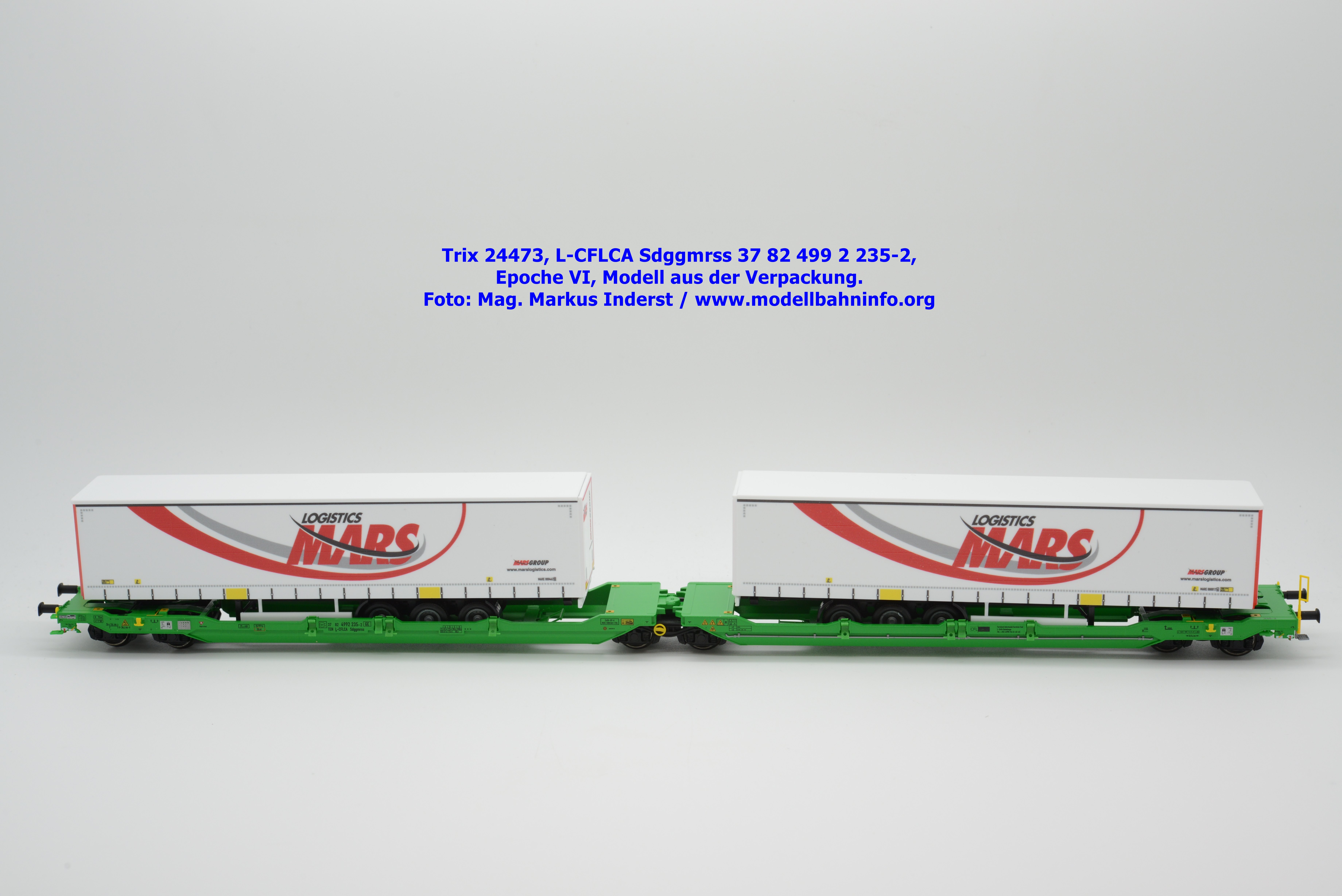 Vom CFL-Wagen mit MARS-Auflieger wurde auch ein Modell von Trix aufgelegt. Das serienmäßig für Gleichstrom-Anlagen ausgelegte Güterwagenmodell unterscheidet sich nur in den Fahrzeuganschriften. Dieser Containertragwagen T3000e wurde mit den Fahrzeuganschriften L-CFLCA Sdggmrss 37 82 499 2 235-2 bedruckt. Im Revisionsraster stehen die Abnahmedaten 6 REV TVP 11.11.21 + 3M.