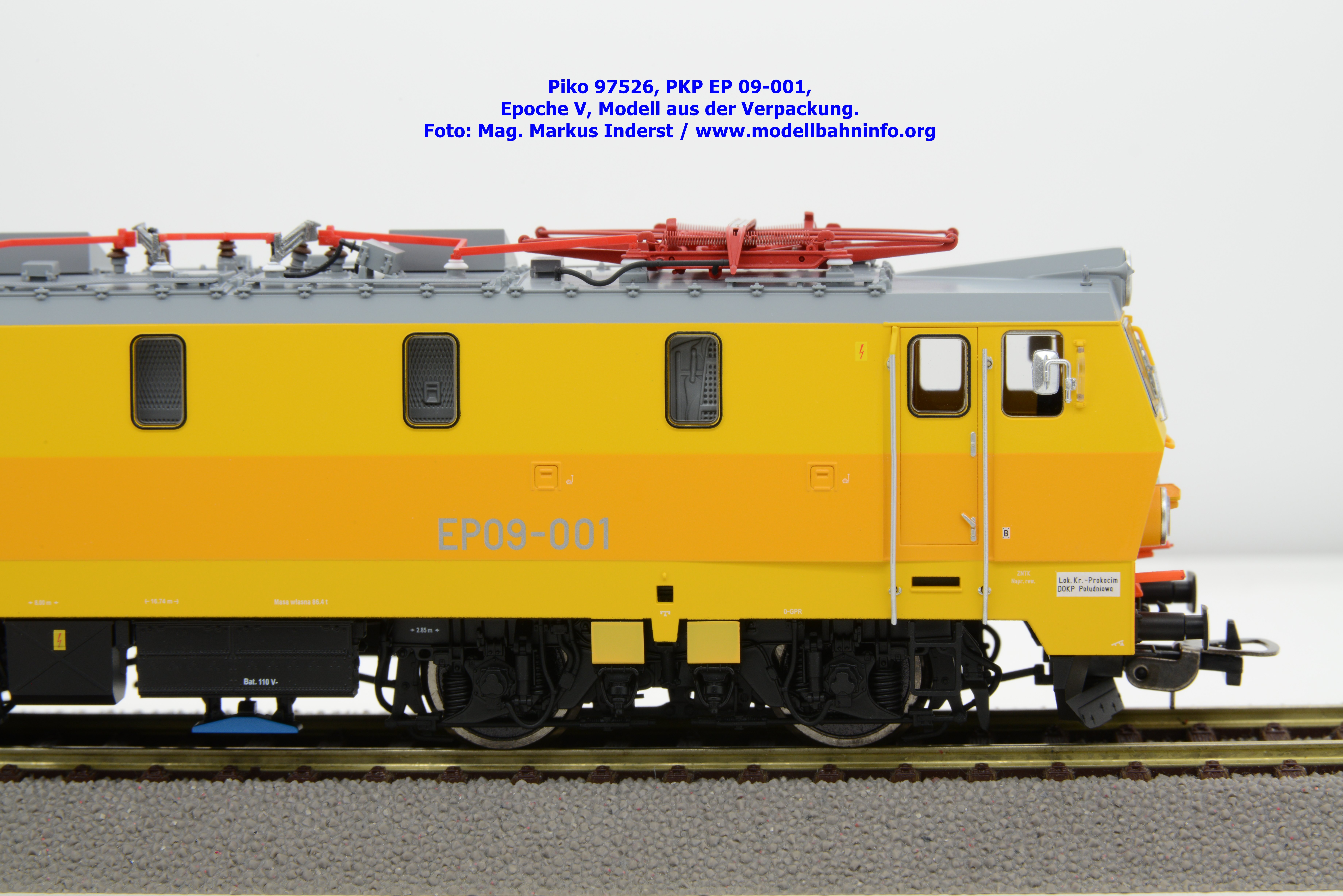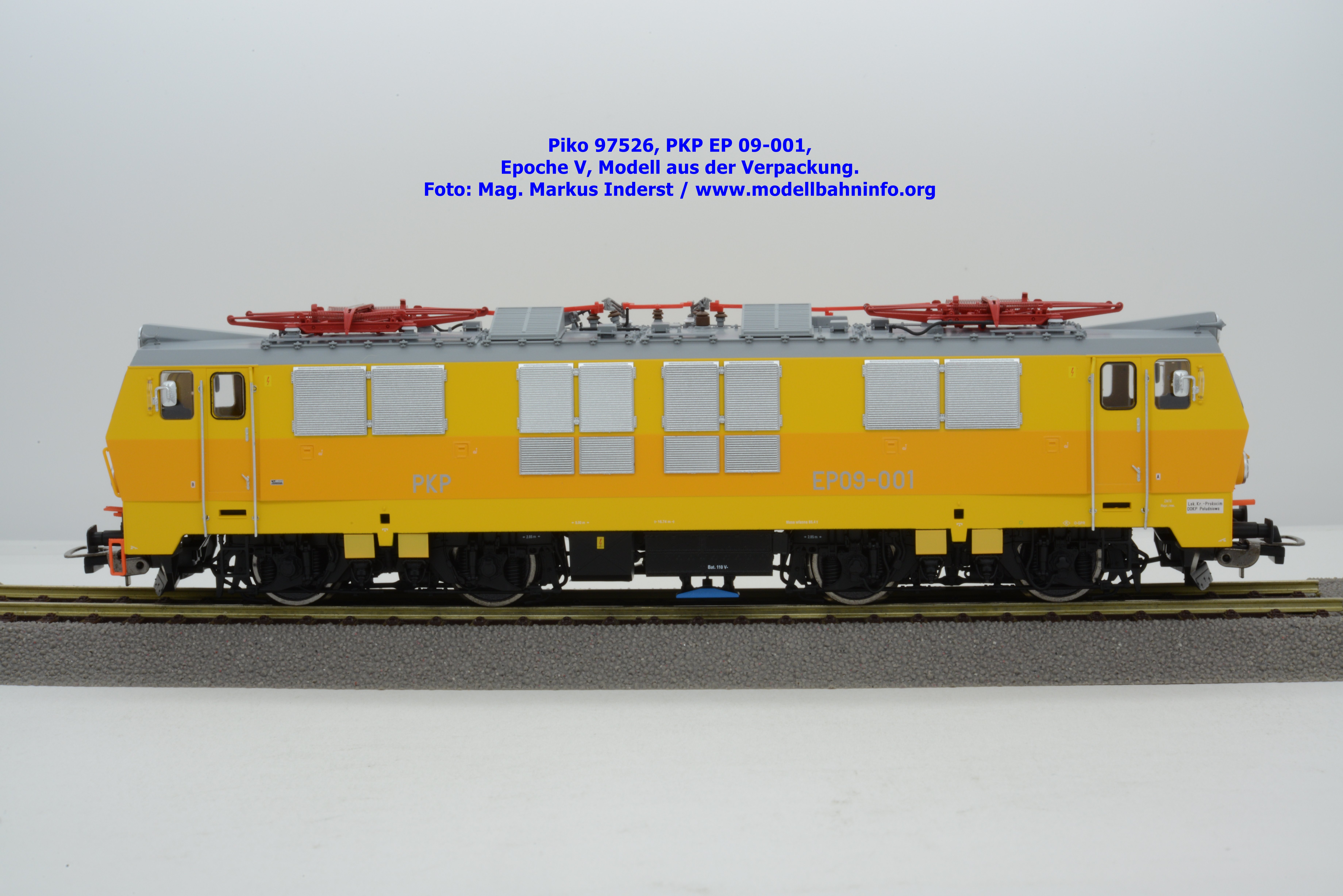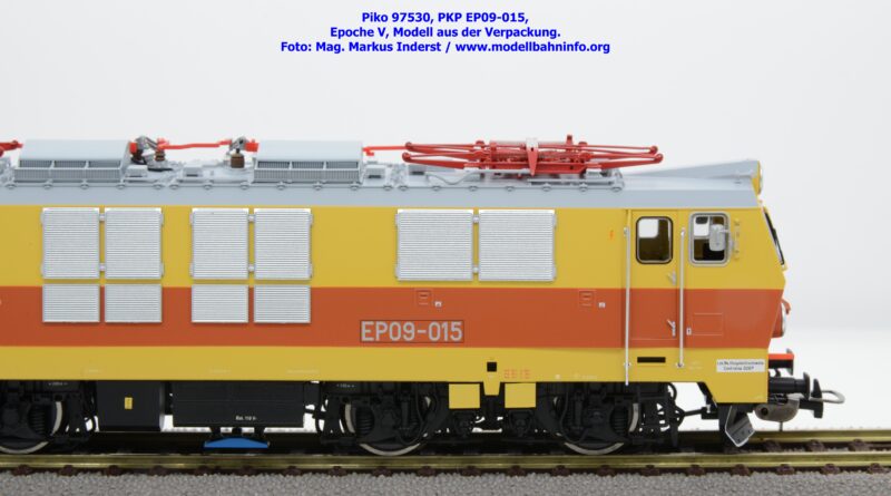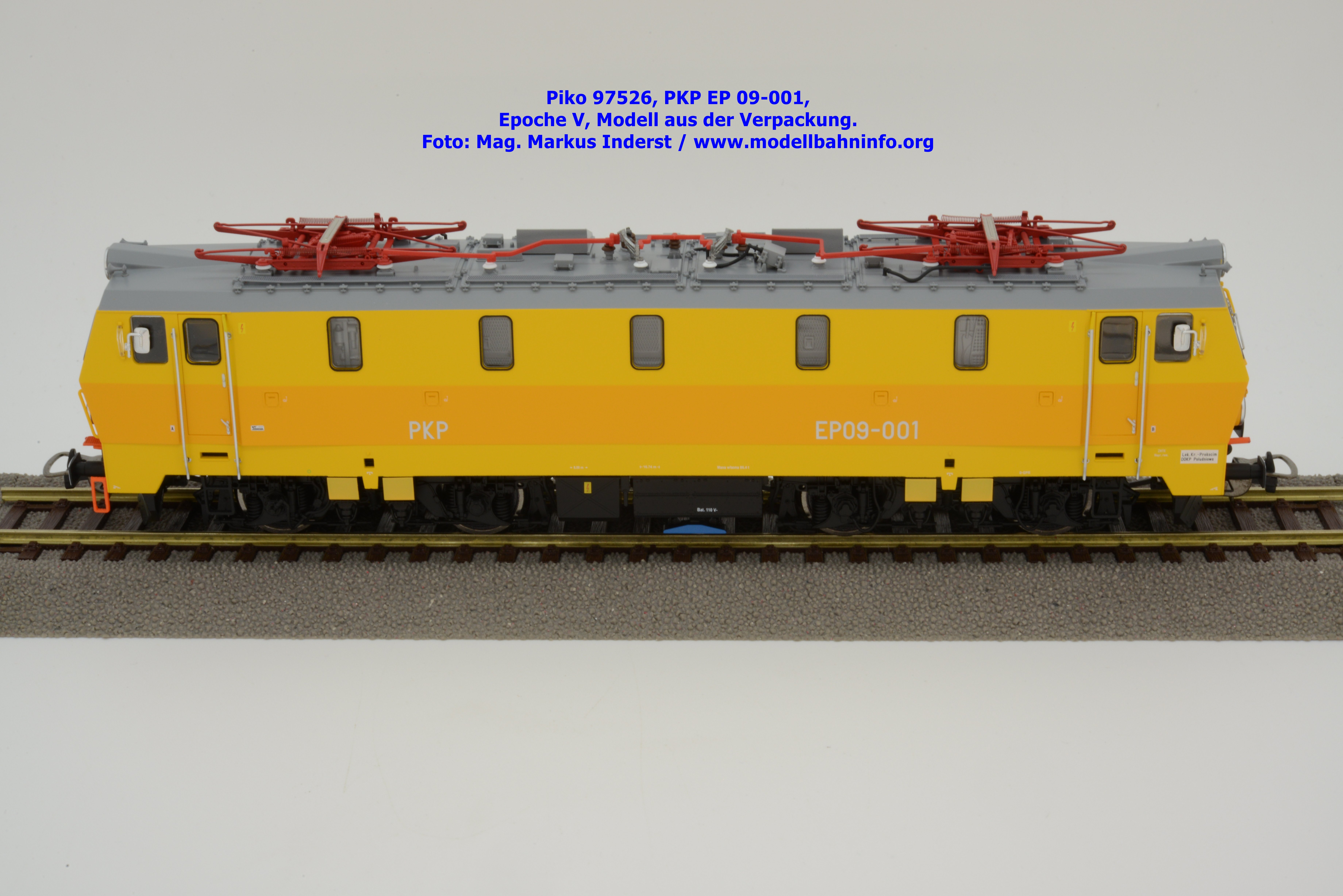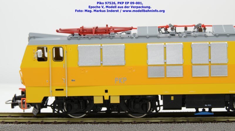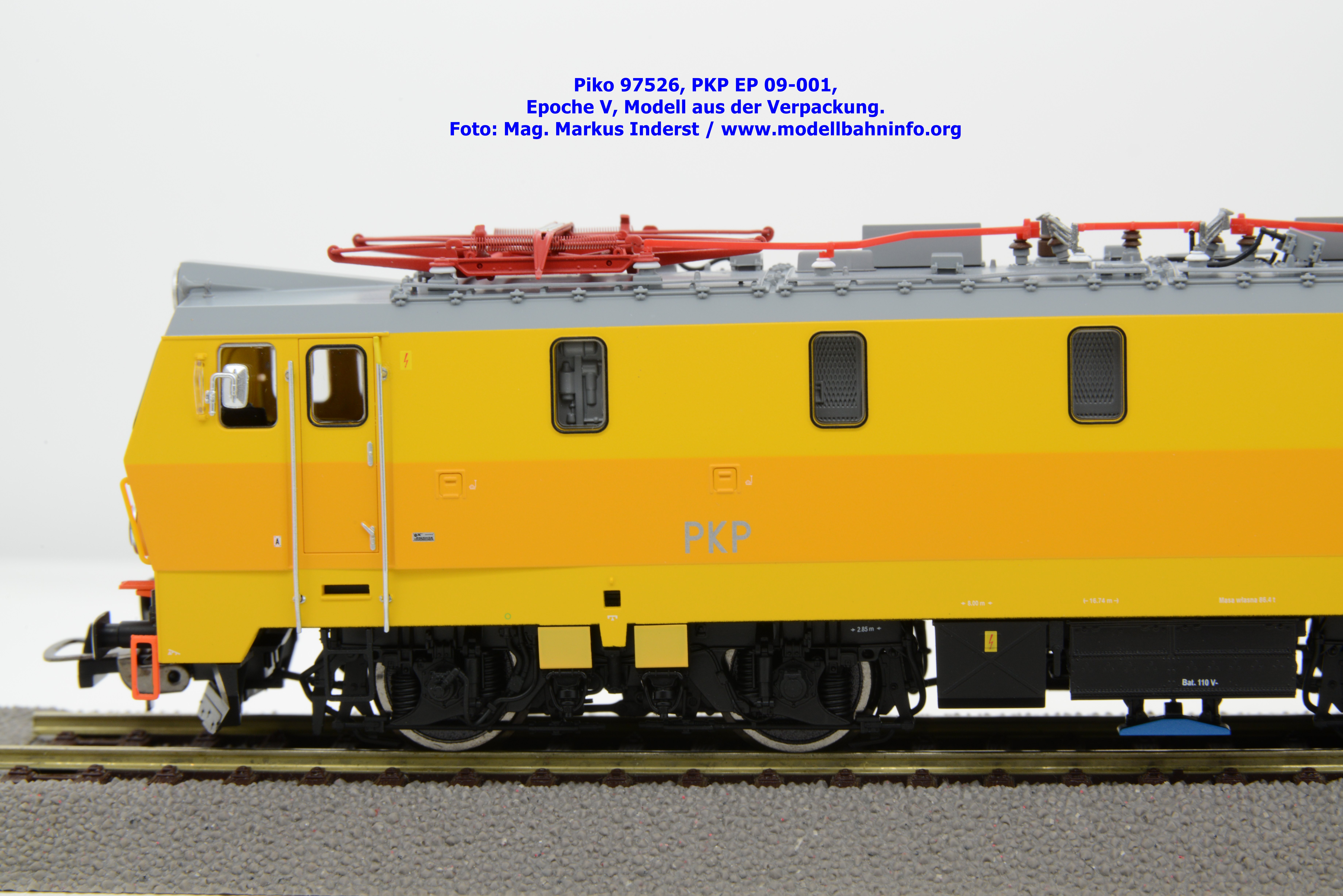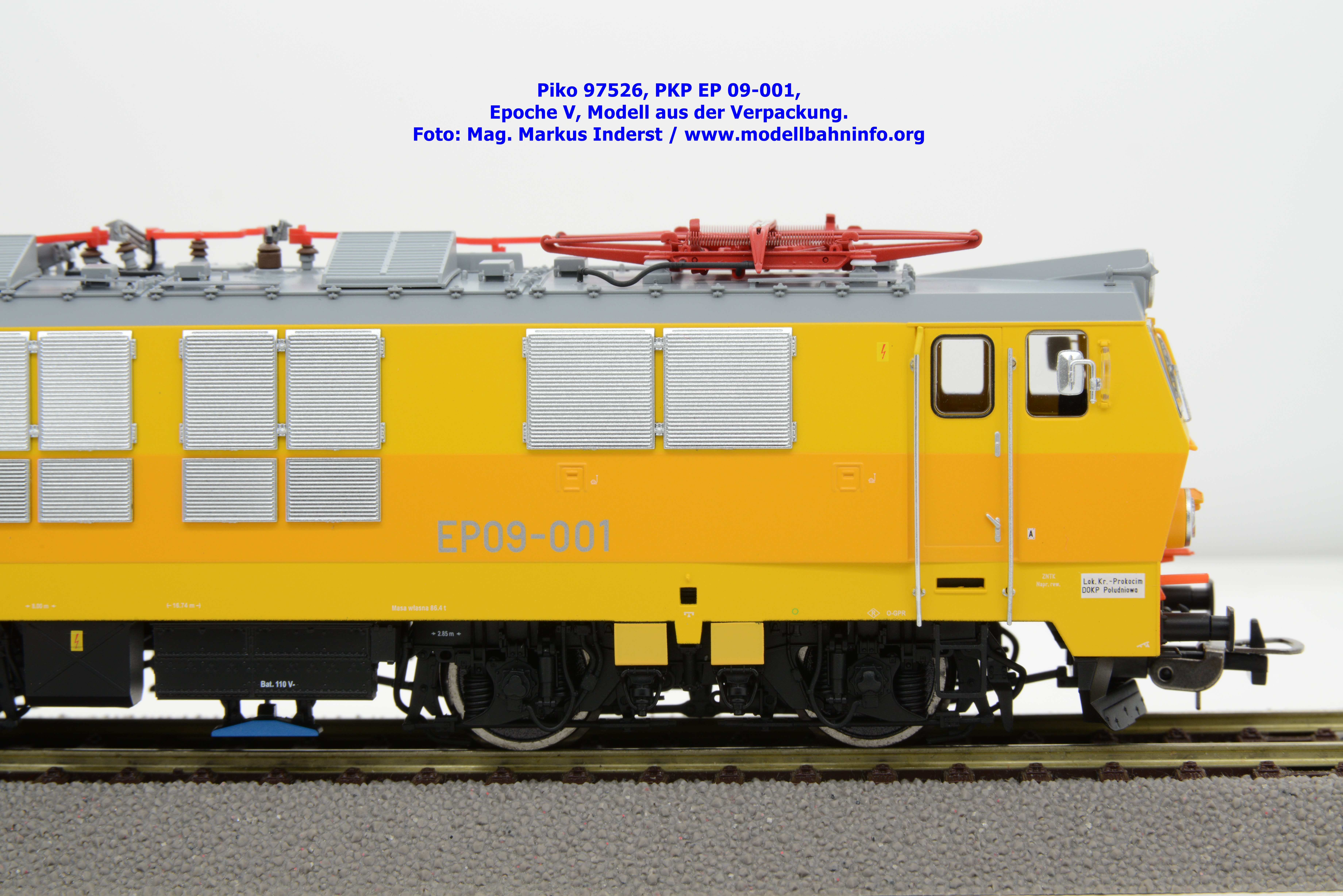 Das vierte Modell der EP 09 sieht eine weitere Farb- und Beschriftungsvariante dar, die diesmal auf den ersten Blick fast gänzlich in gelber Farbe lackiert ist. Doch der Schein trügt, denn das Modell verfügt über eine hellorange Bauchbinde. Das vorliegende Modell wurde mit der Loknummer EP 09-001 beschriftet. Allerdings sind am Modell keine Revisionsdaten zu finden. Im weißen Quader unterhalb des rechten Führerstandes ist die Beheimatungsangaben Lok. Kr. – Prokocim, DOKP Poludniowa. Gegenüber den früheren Ausführungen kommen hierbei vor allem die silbern ausgeführten Rückspiegel sehr gut zur Geltung. Das Modell wird von Piko in zwei Ausführung des Zweileiter-Gleichstromsystems offeriert. Die analoge Modellausführung weist den UVP von € 249,– auf, währenddessen die digitale Modellausführung mit dem Piko Digital-Decoder unter der Artikelnummer zum UVP von € 359,– erhältlich ist.