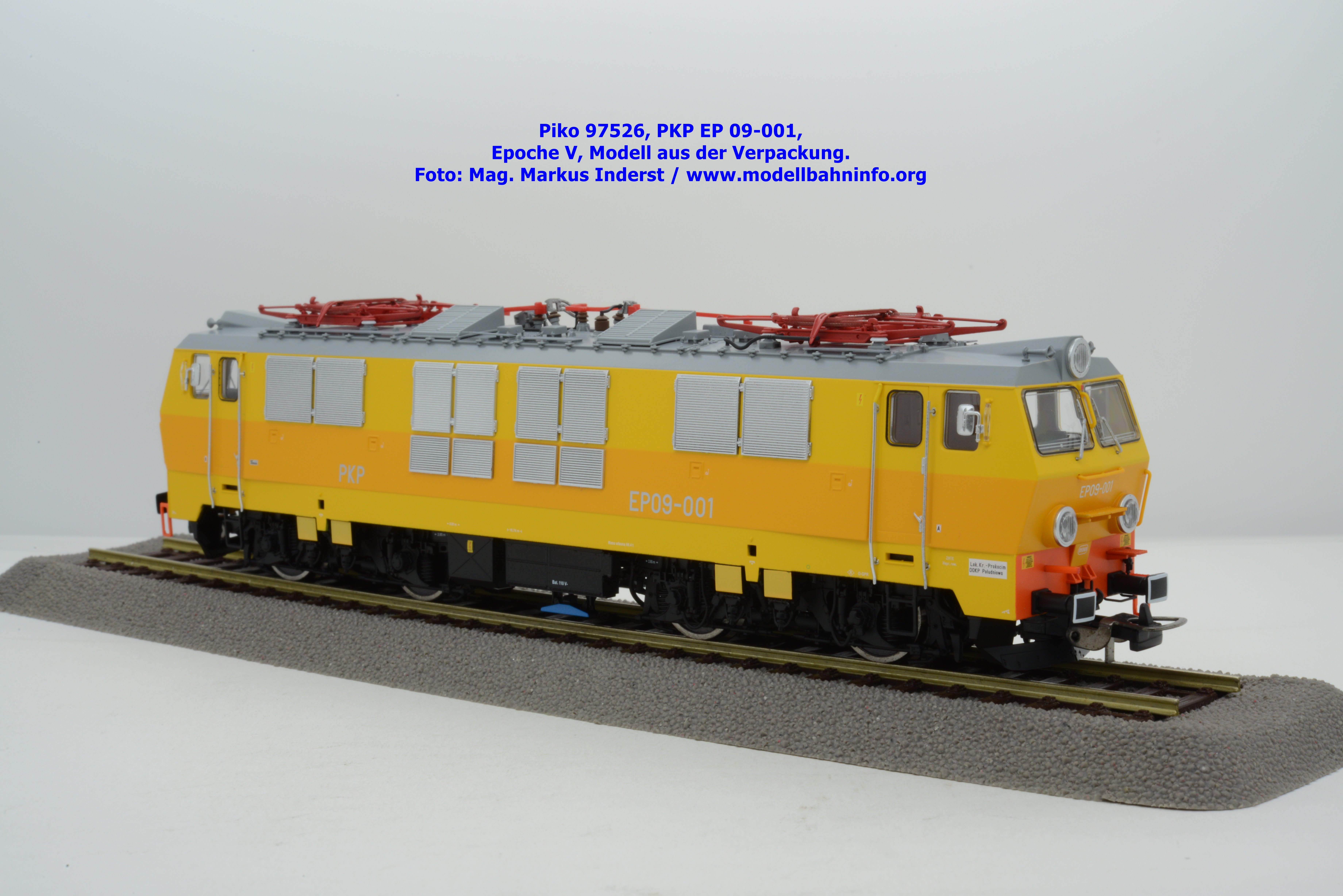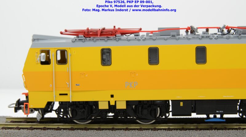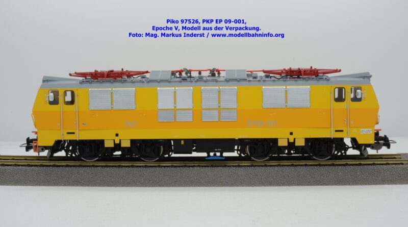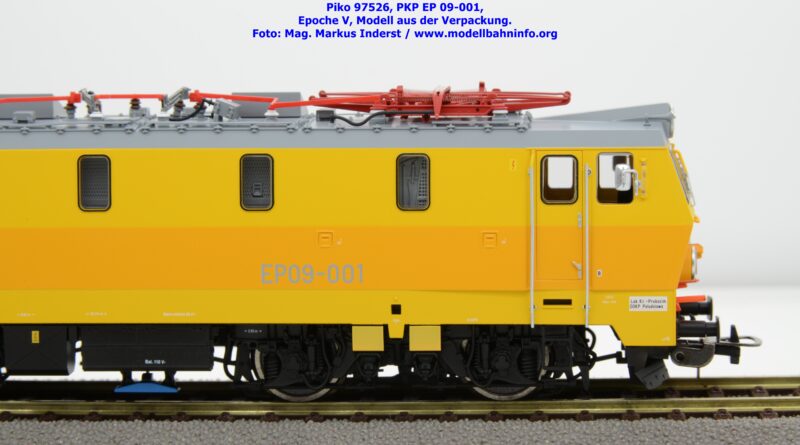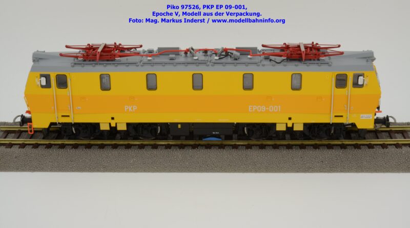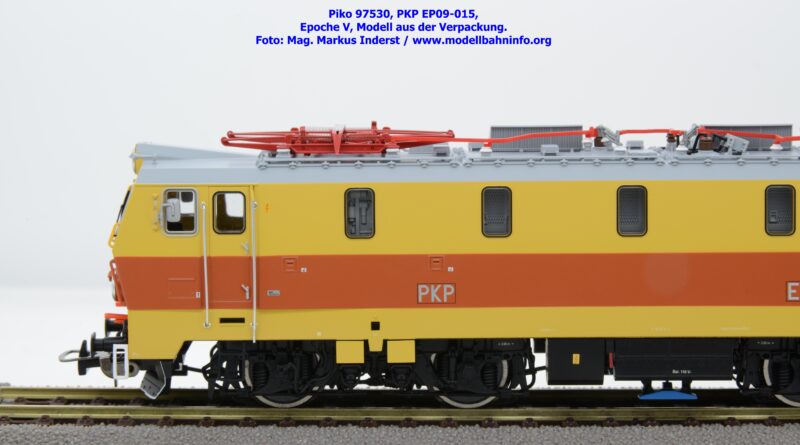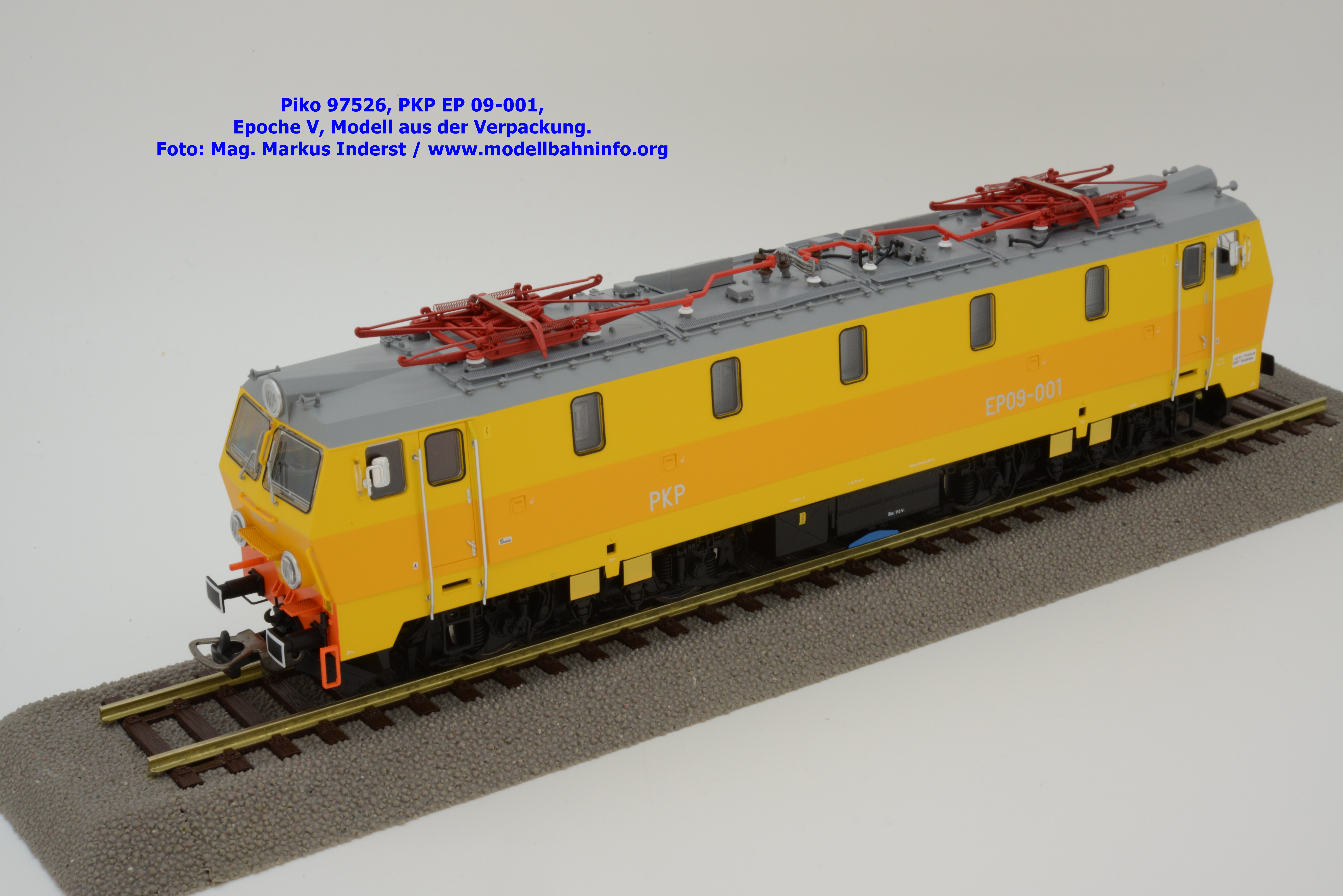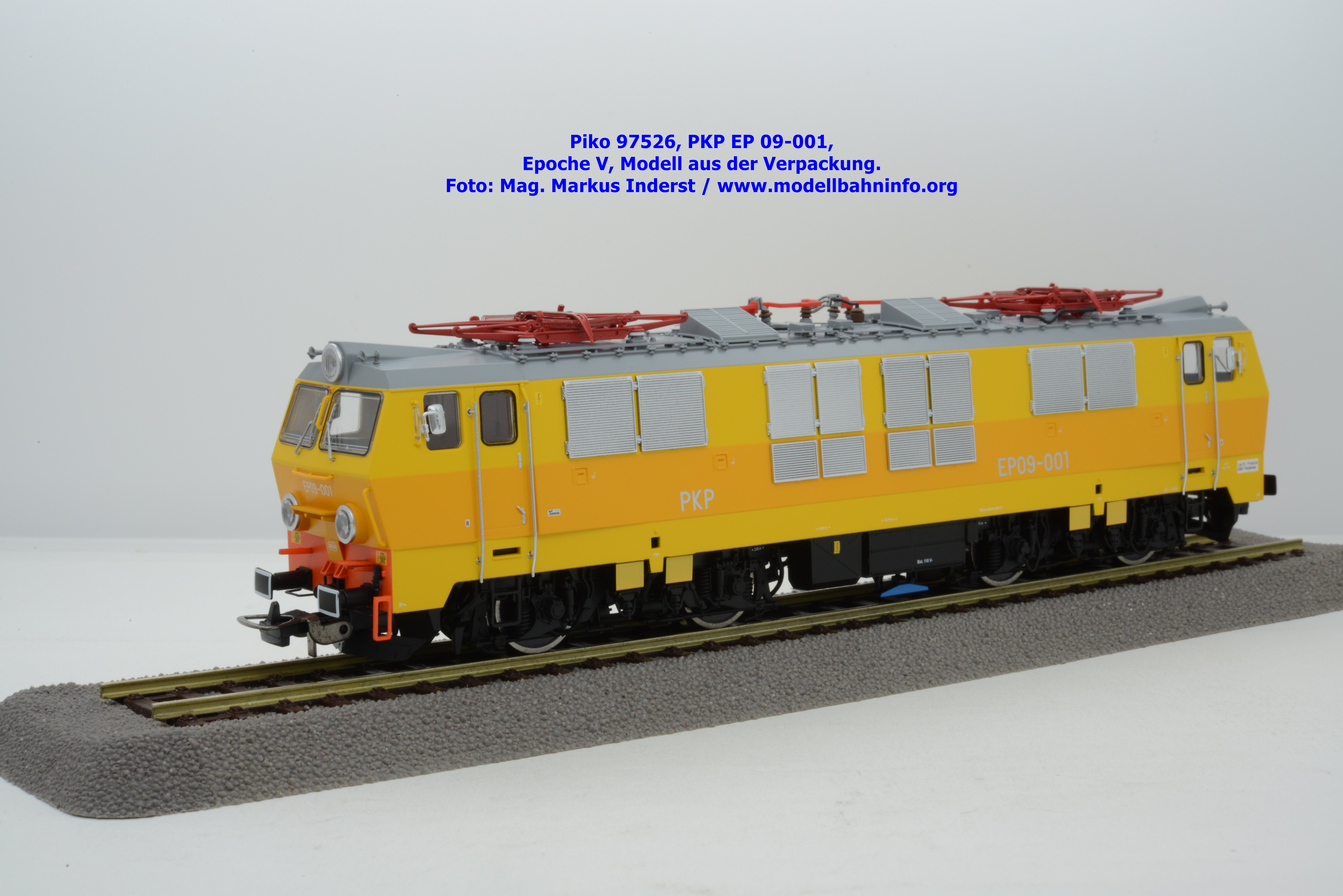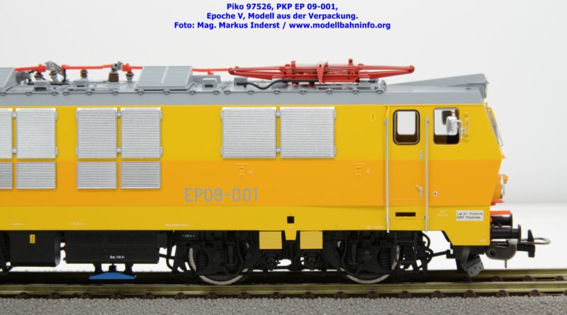 Das vierte Modell der EP 09 sieht eine weitere Farb- und Beschriftungsvariante dar, die diesmal auf den ersten Blick fast gänzlich in gelber Farbe lackiert ist. Doch der Schein trügt, denn das Modell verfügt über eine hellorange Bauchbinde. Das vorliegende Modell wurde mit der Loknummer EP 09-001 beschriftet. Allerdings sind am Modell keine Revisionsdaten zu finden. Im weißen Quader unterhalb des rechten Führerstandes ist die Beheimatungsangaben Lok. Kr. – Prokocim, DOKP Poludniowa. Gegenüber den früheren Ausführungen kommen hierbei vor allem die silbern ausgeführten Rückspiegel sehr gut zur Geltung. Das Modell wird von Piko in zwei Ausführung des Zweileiter-Gleichstromsystems offeriert. Die analoge Modellausführung weist den UVP von € 249,– auf, währenddessen die digitale Modellausführung mit dem Piko Digital-Decoder unter der Artikelnummer zum UVP von € 359,– erhältlich ist.