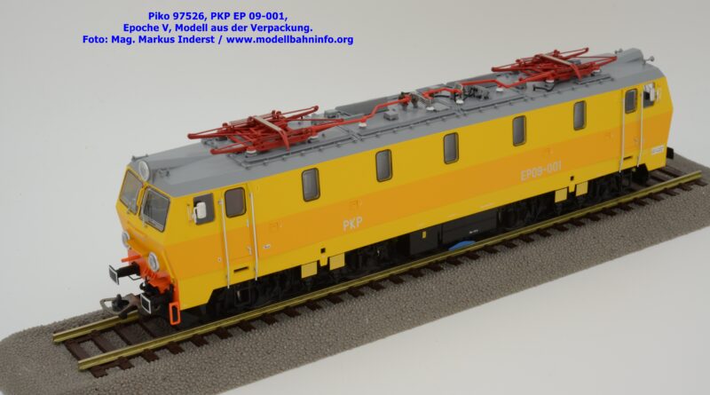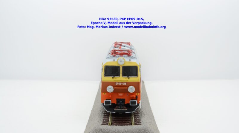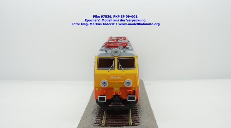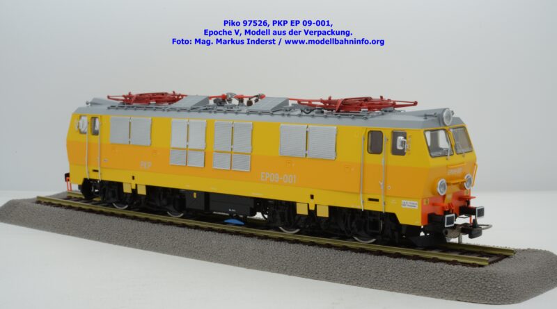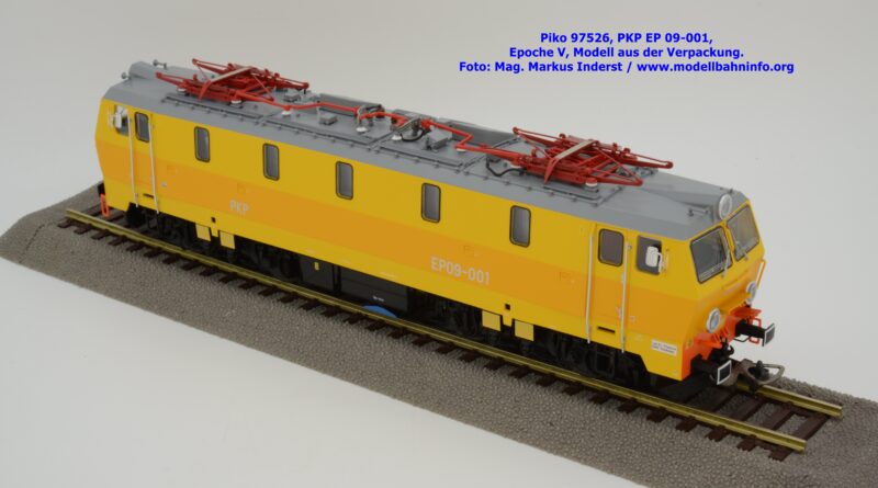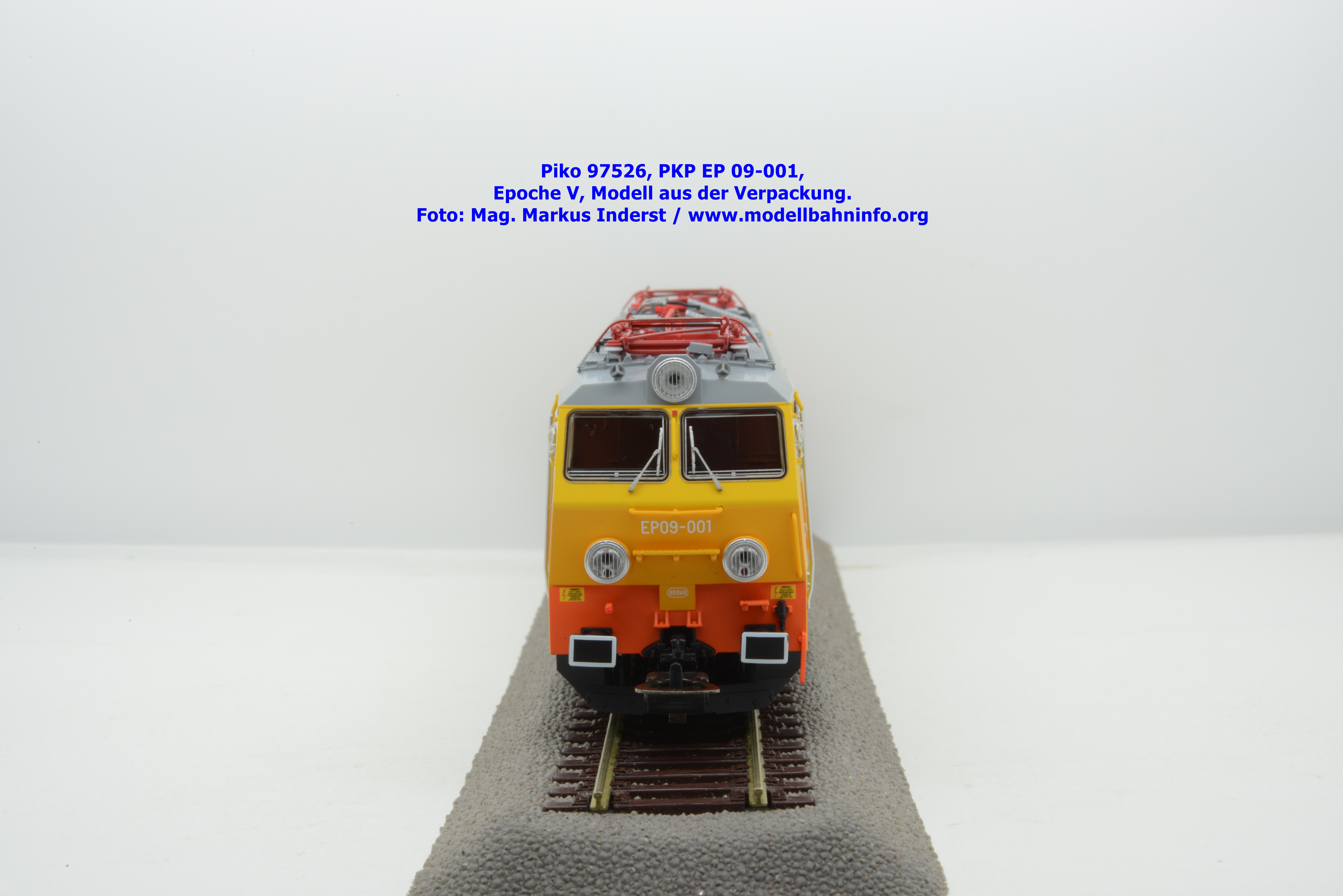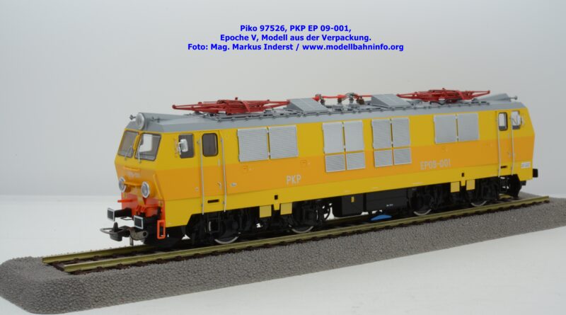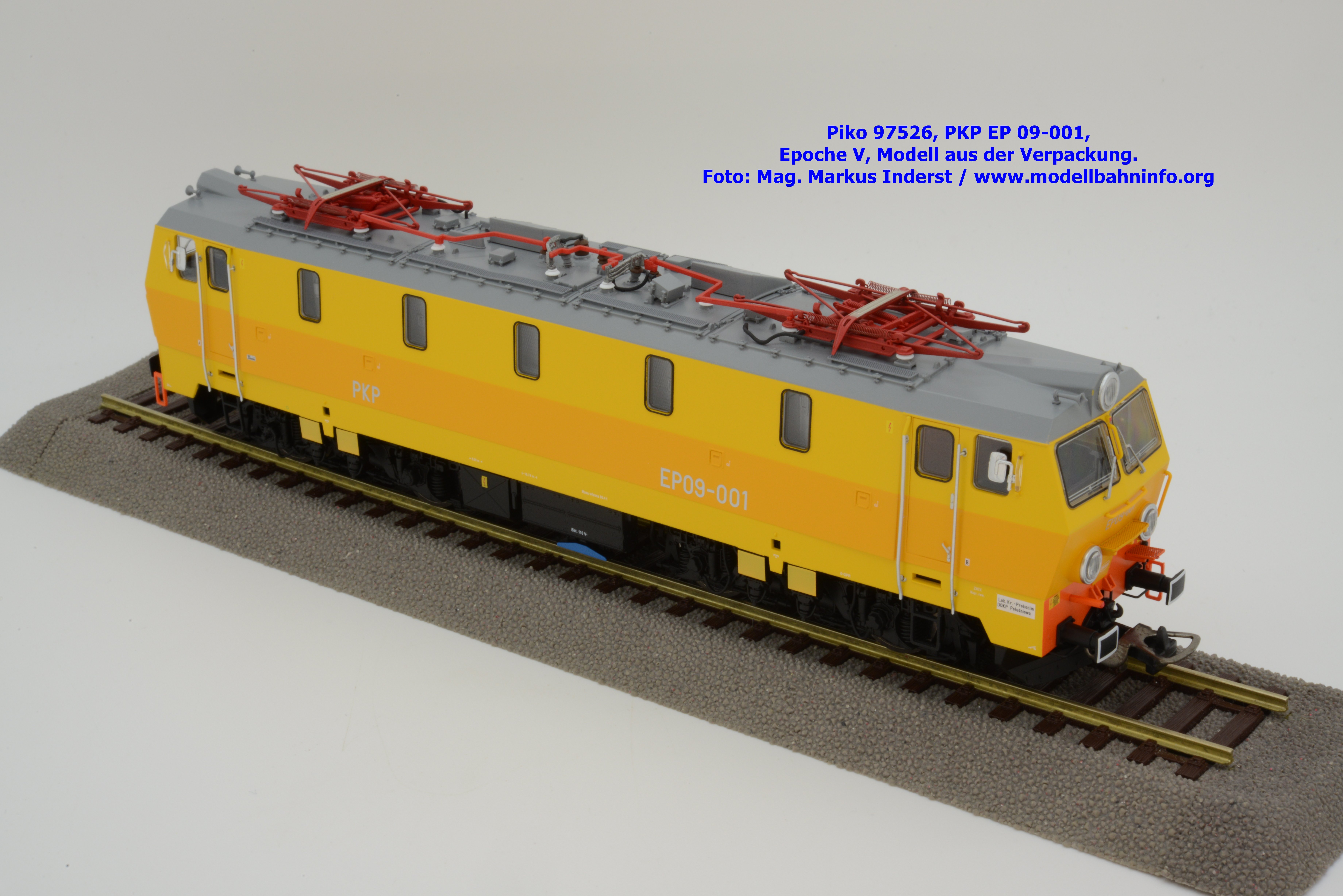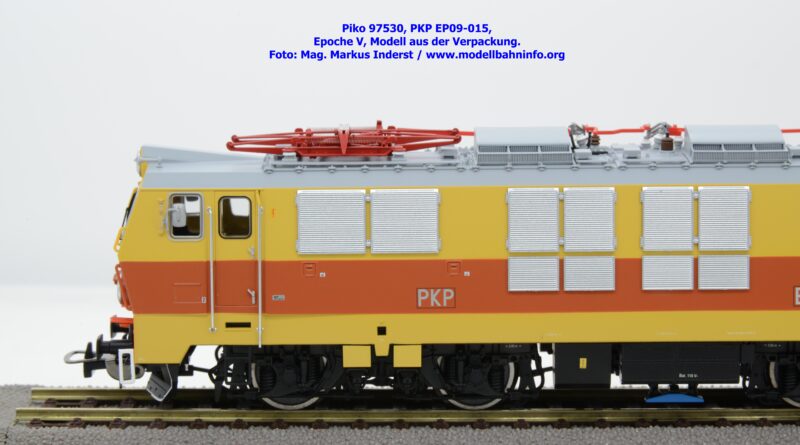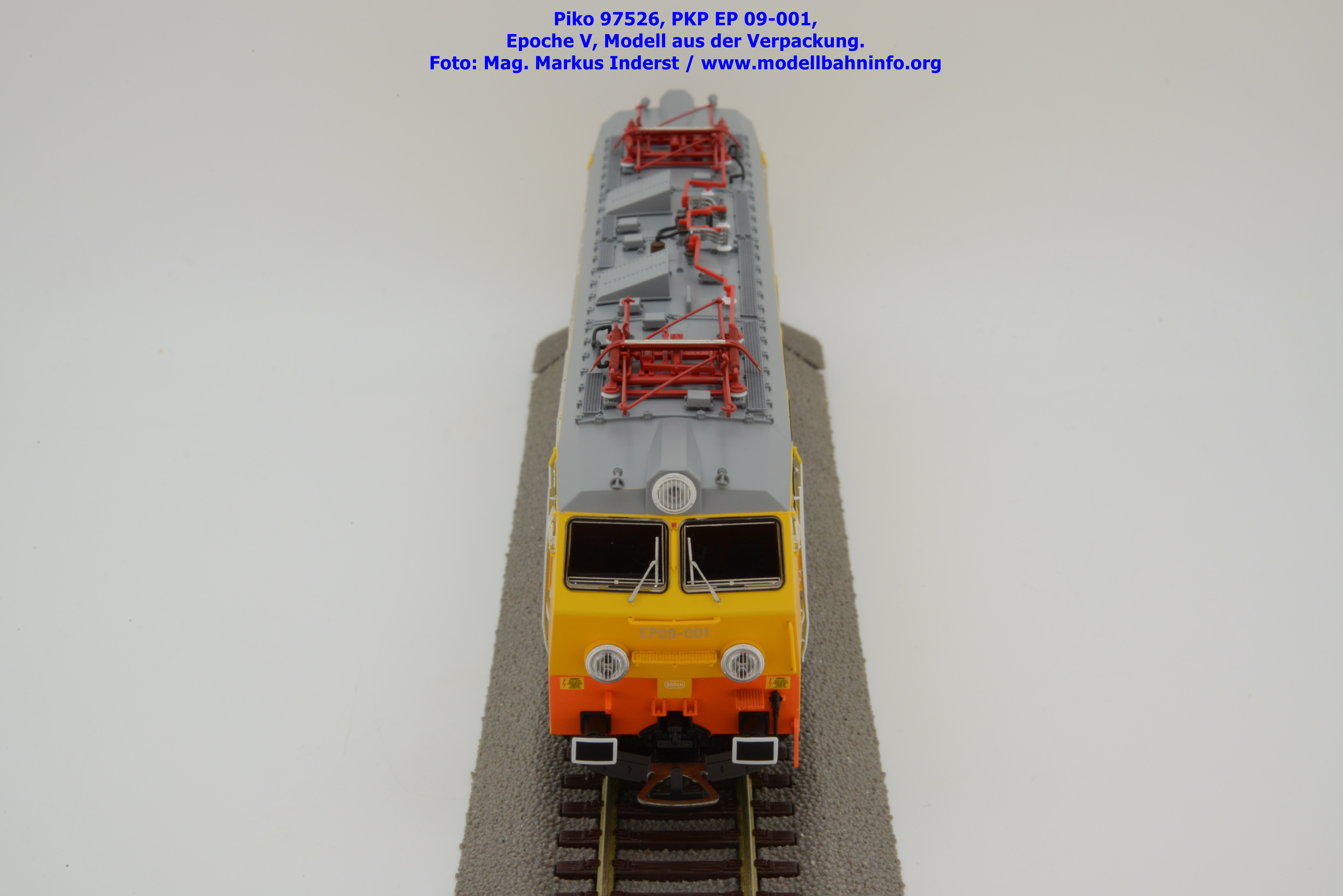 Das vierte Modell der EP 09 sieht eine weitere Farb- und Beschriftungsvariante dar, die diesmal auf den ersten Blick fast gänzlich in gelber Farbe lackiert ist. Doch der Schein trügt, denn das Modell verfügt über eine hellorange Bauchbinde. Das vorliegende Modell wurde mit der Loknummer EP 09-001 beschriftet. Allerdings sind am Modell keine Revisionsdaten zu finden. Im weißen Quader unterhalb des rechten Führerstandes ist die Beheimatungsangaben Lok. Kr. – Prokocim, DOKP Poludniowa. Gegenüber den früheren Ausführungen kommen hierbei vor allem die silbern ausgeführten Rückspiegel sehr gut zur Geltung. Das Modell wird von Piko in zwei Ausführung des Zweileiter-Gleichstromsystems offeriert. Die analoge Modellausführung weist den UVP von € 249,– auf, währenddessen die digitale Modellausführung mit dem Piko Digital-Decoder unter der Artikelnummer zum UVP von € 359,– erhältlich ist.
