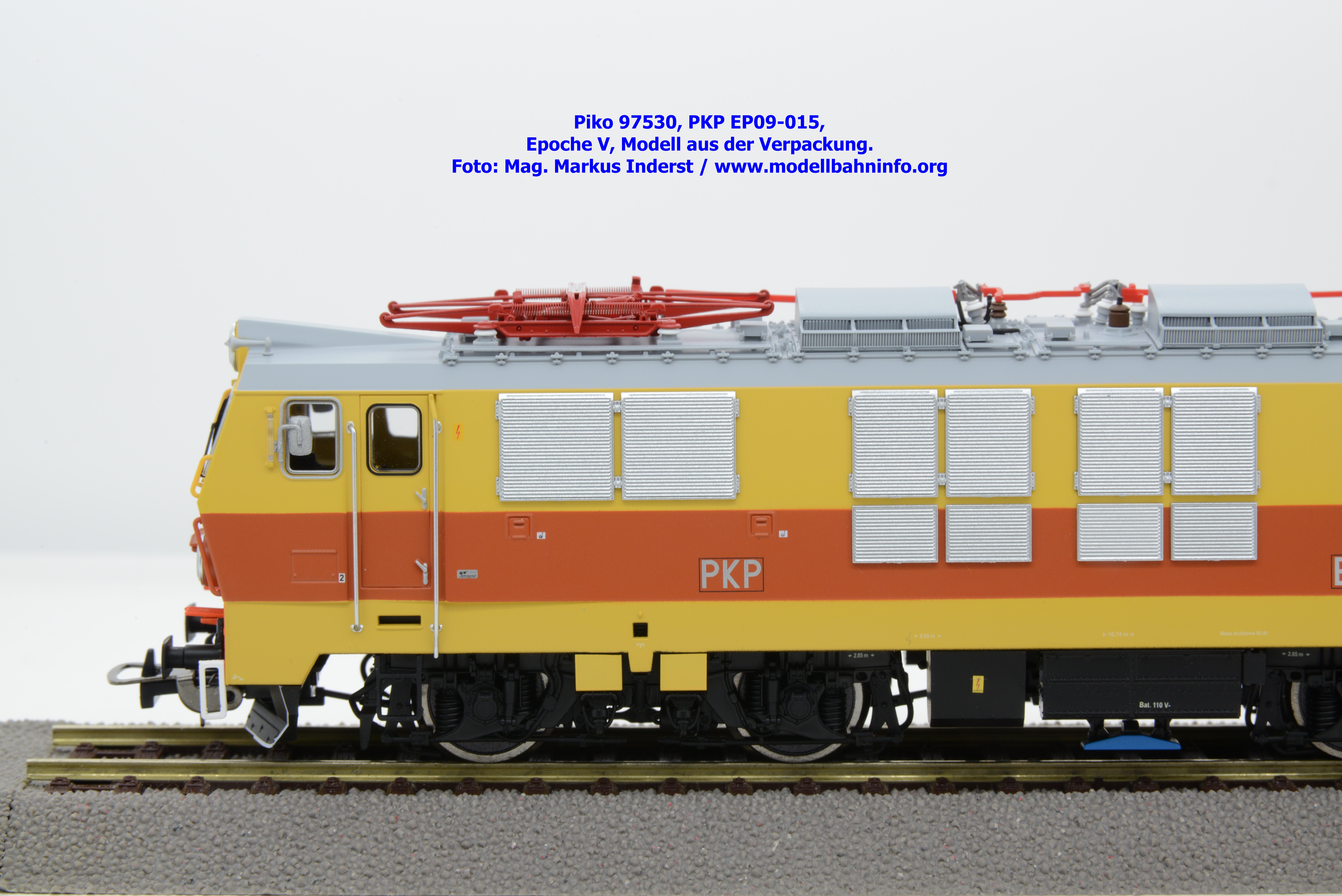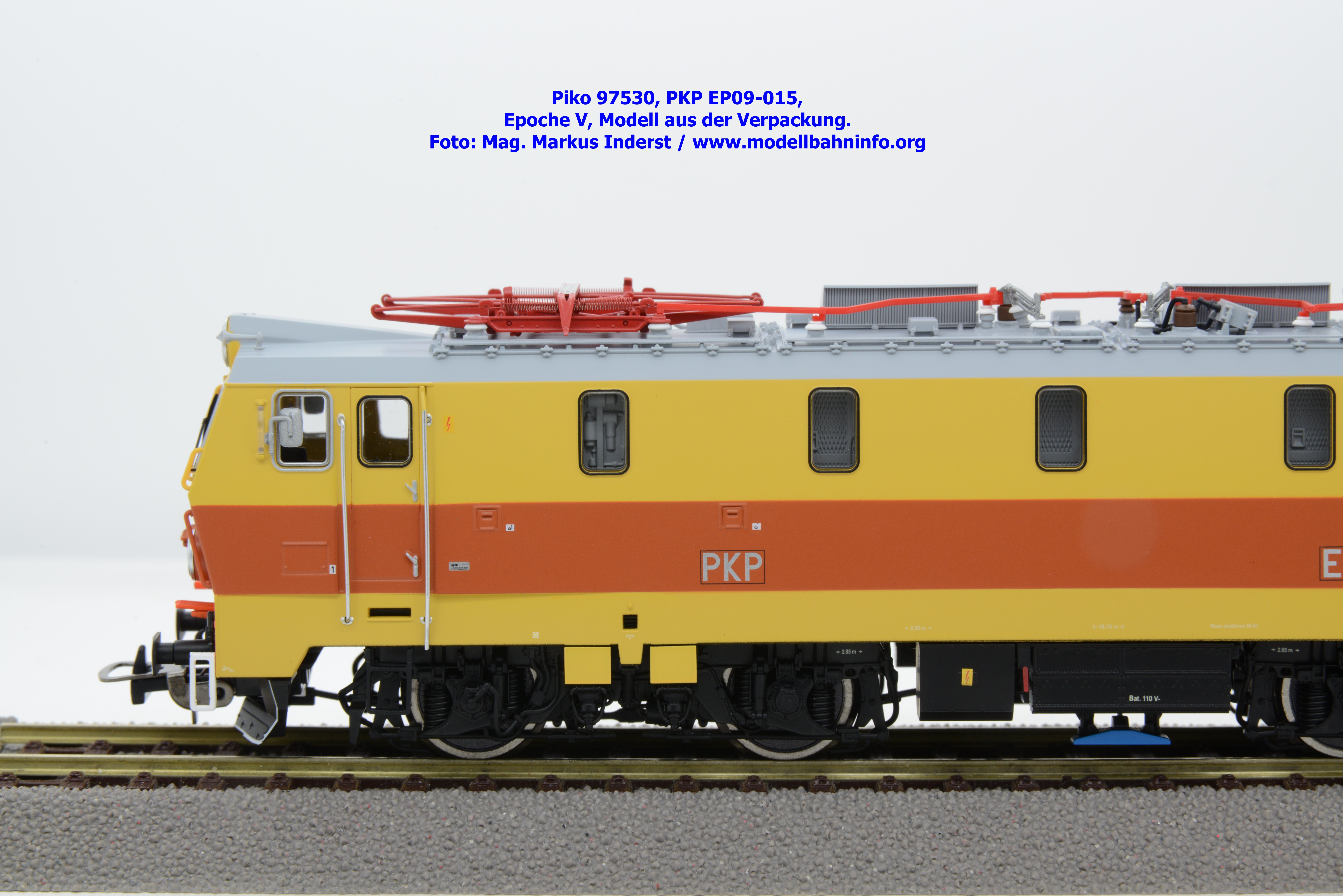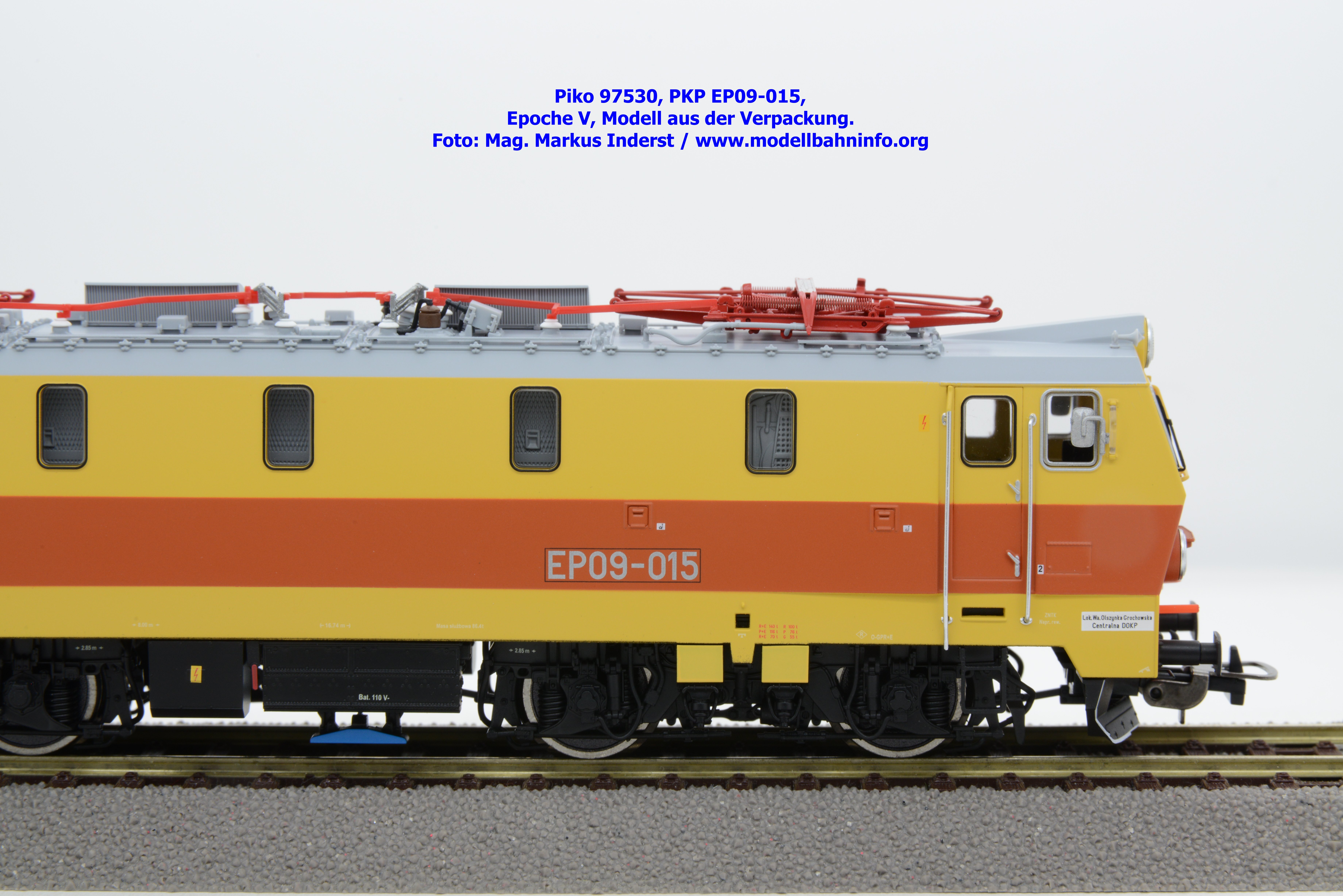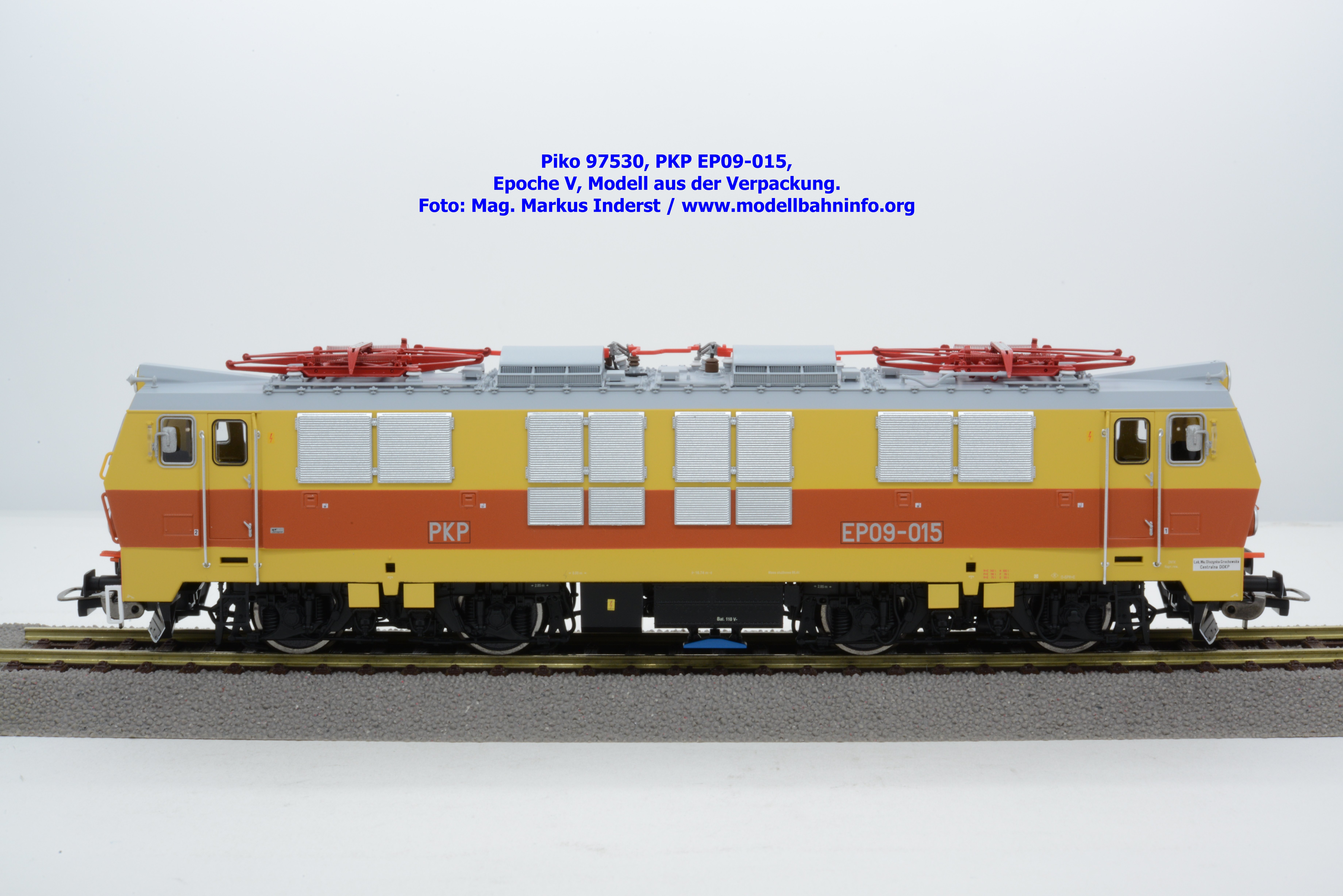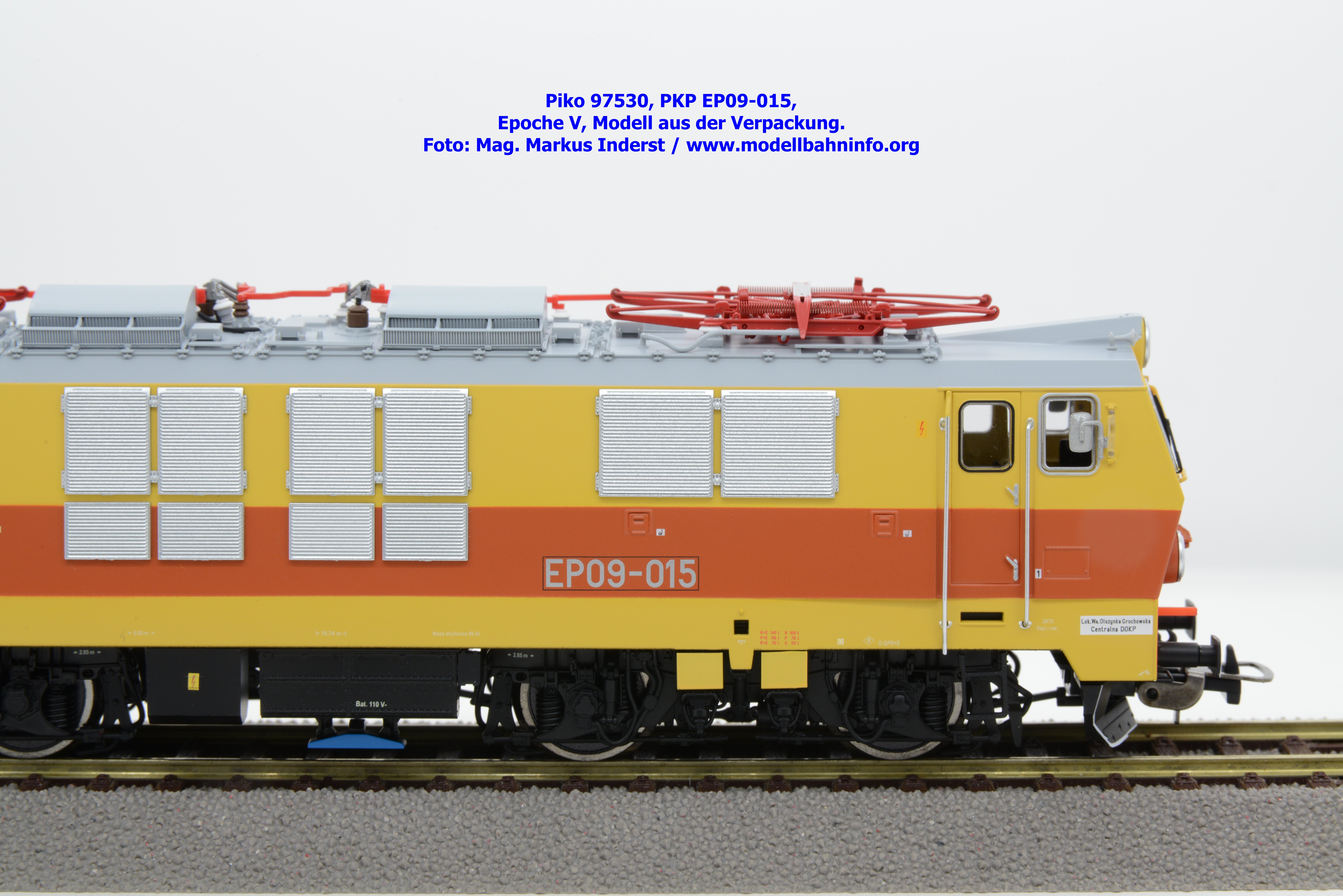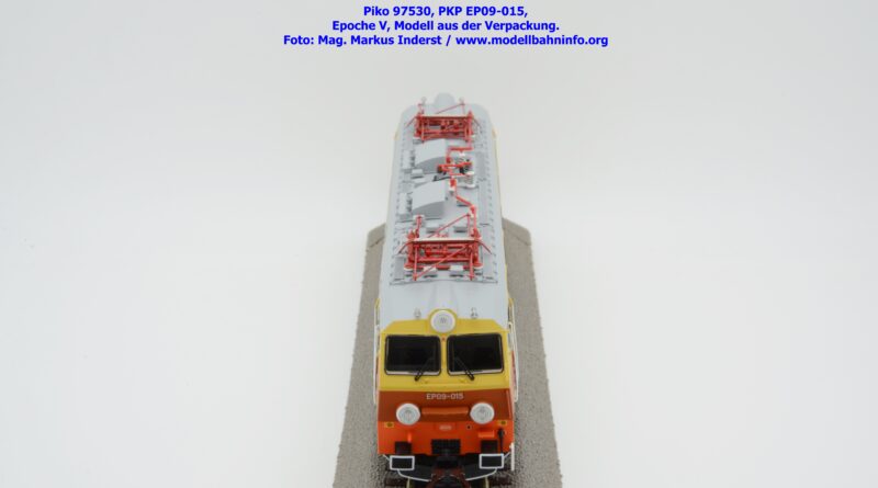 Das vierte Modell der EP 09 sieht eine weitere Farb- und Beschriftungsvariante dar, die diesmal auf den ersten Blick fast gänzlich in gelber Farbe lackiert ist. Doch der Schein trügt, denn das Modell verfügt über eine hellorange Bauchbinde. Das vorliegende Modell wurde mit der Loknummer EP 09-001 beschriftet. Allerdings sind am Modell keine Revisionsdaten zu finden. Im weißen Quader unterhalb des rechten Führerstandes ist die Beheimatungsangaben Lok. Kr. – Prokocim, DOKP Poludniowa. Gegenüber den früheren Ausführungen kommen hierbei vor allem die silbern ausgeführten Rückspiegel sehr gut zur Geltung. Das Modell wird von Piko in zwei Ausführung des Zweileiter-Gleichstromsystems offeriert. Die analoge Modellausführung weist den UVP von € 249,– auf, währenddessen die digitale Modellausführung mit dem Piko Digital-Decoder unter der Artikelnummer zum UVP von € 359,– erhältlich ist.